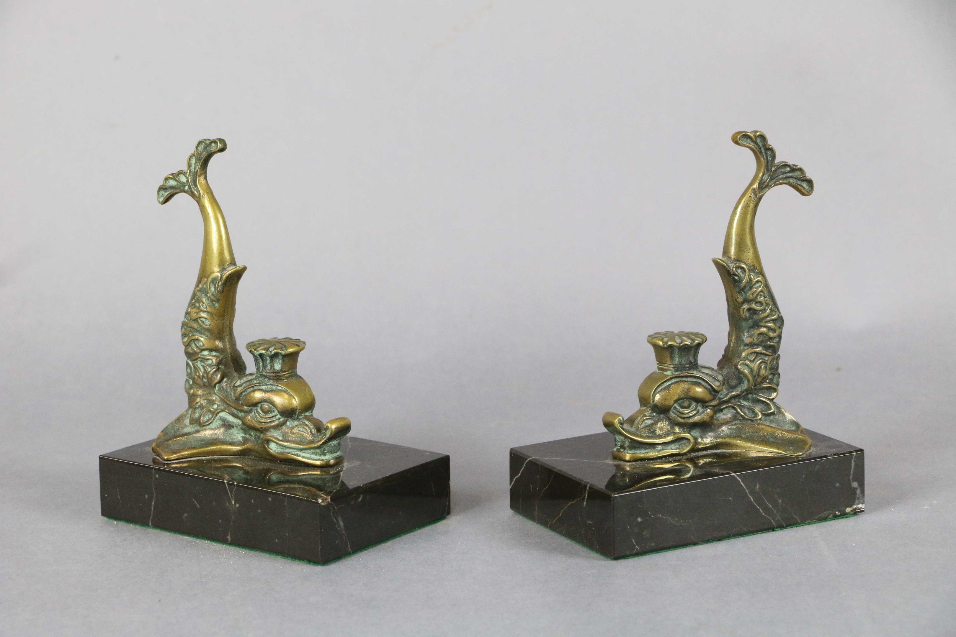 Pair of bronze BOOK-SETS decorated with dolphins on marble bases.