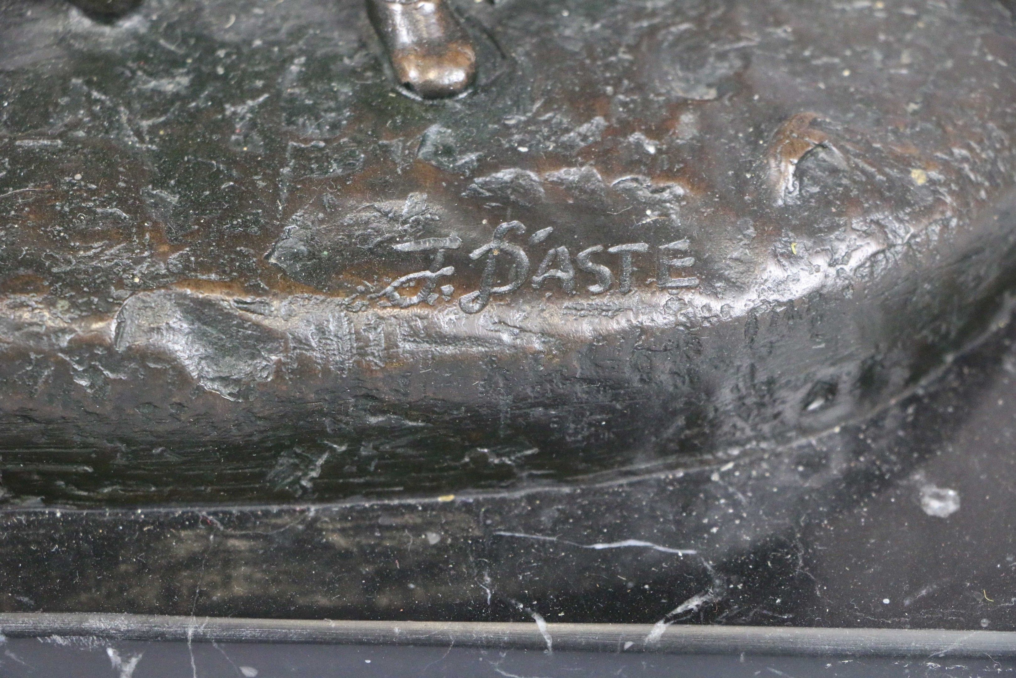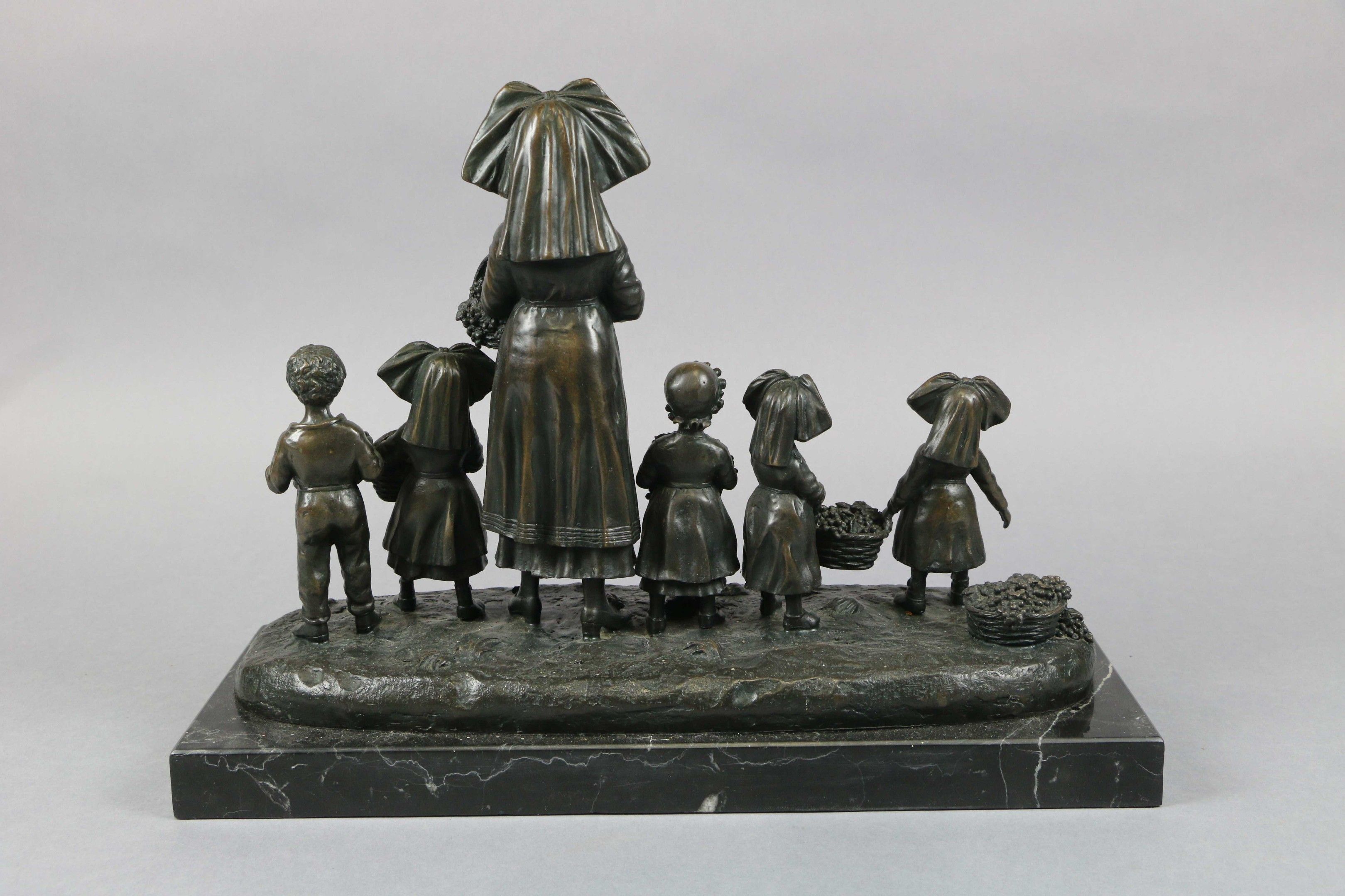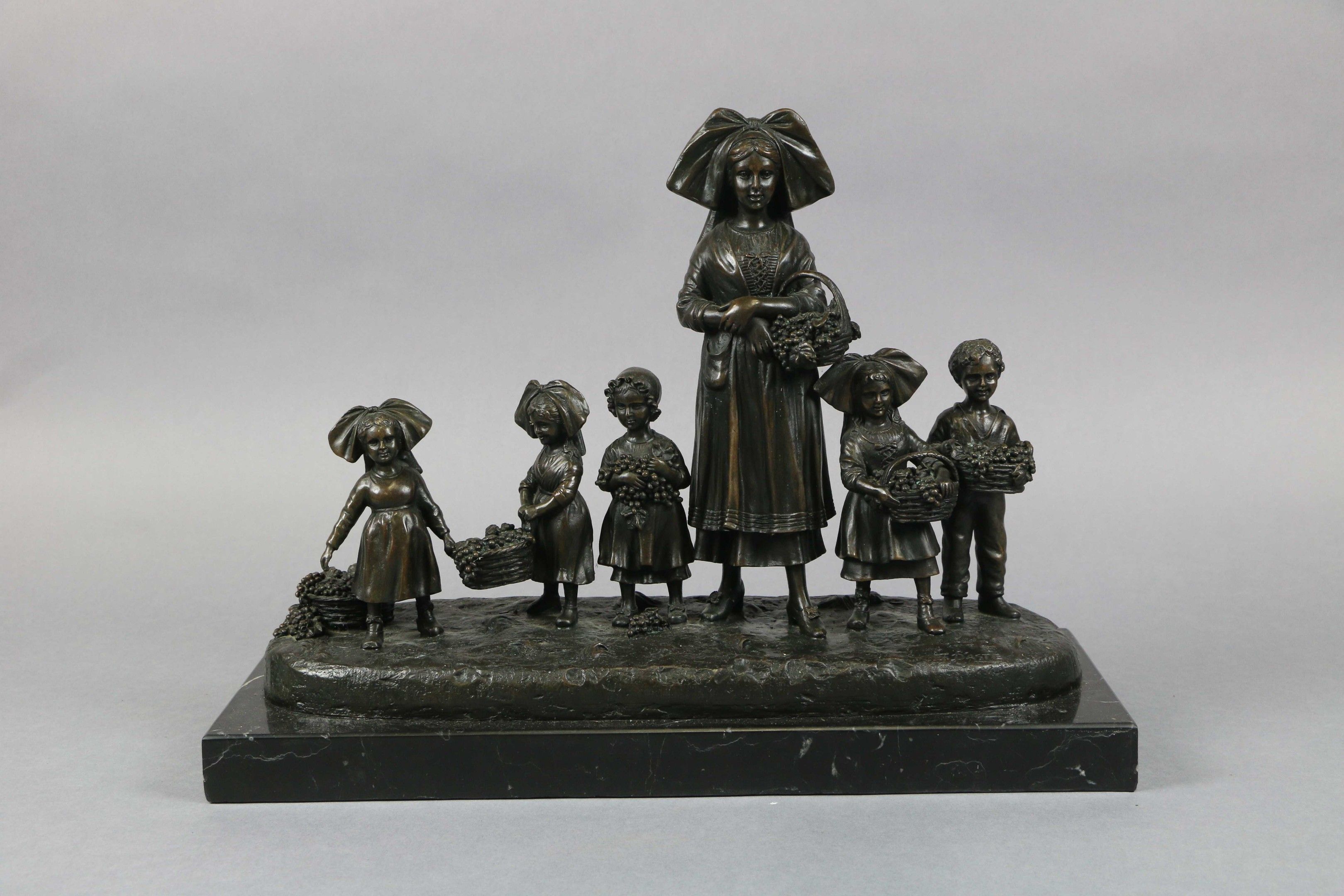 Bronze group with brown patina on marble base. Signed on the terrace.