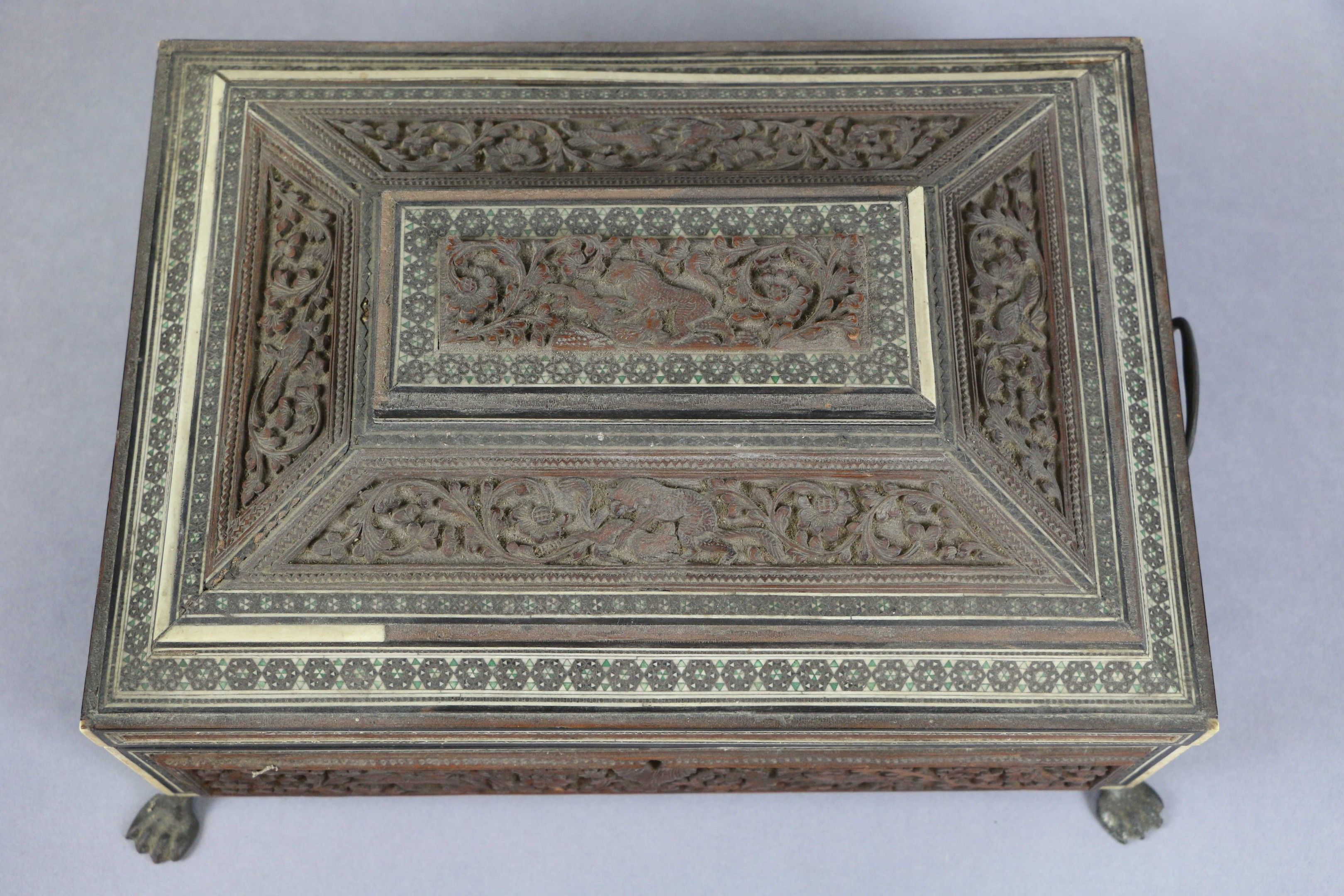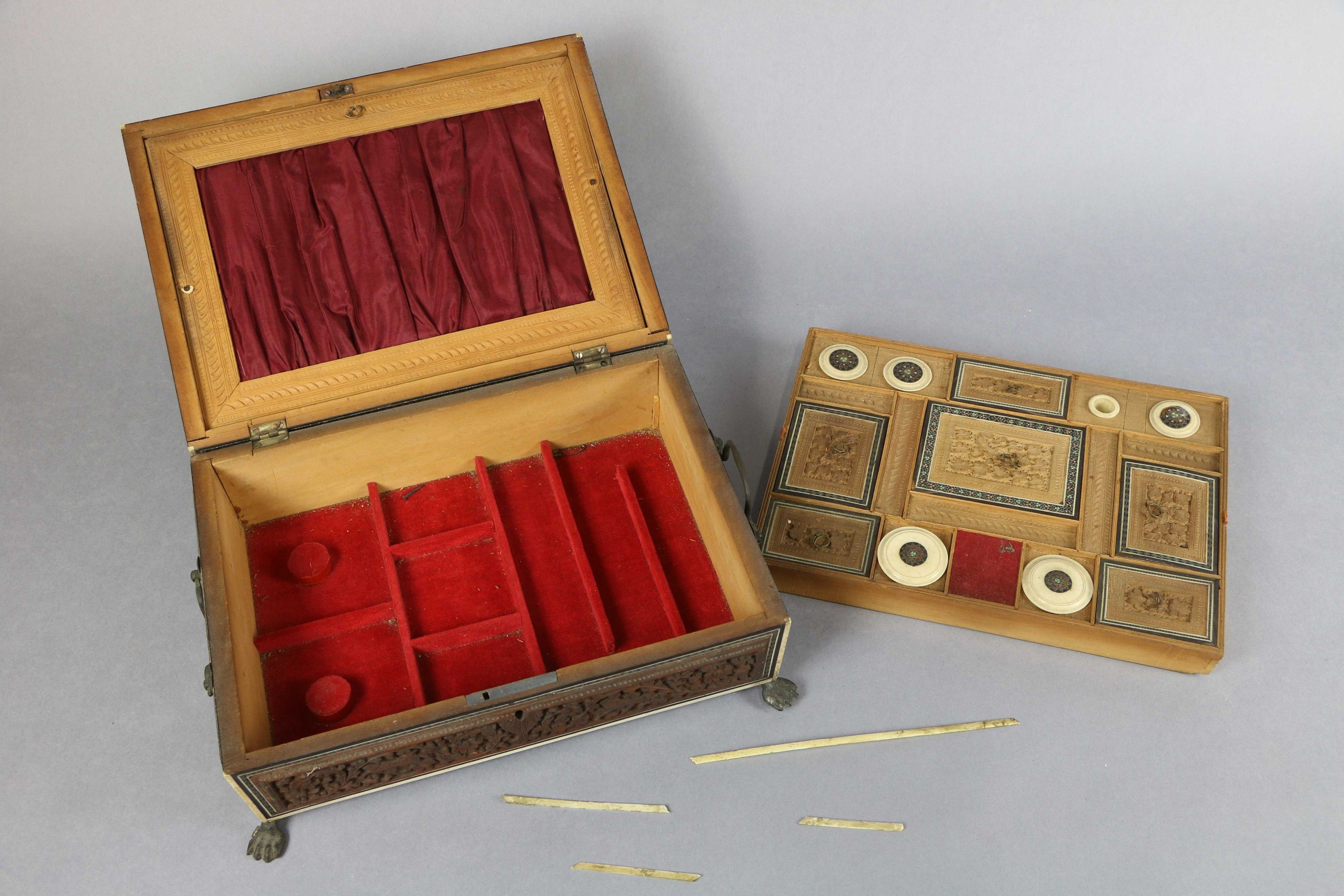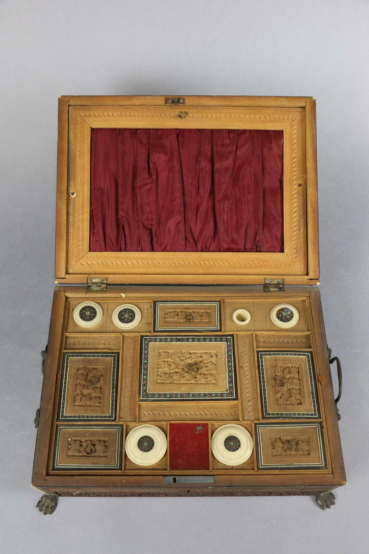 Rectangular wooden box carved with foliage and animals and decorated with geometric marquetry and bone fillets with two side handles and standing on four claw feet. It reveals a set of compartments carved with plant motifs, bone cups on two levels.