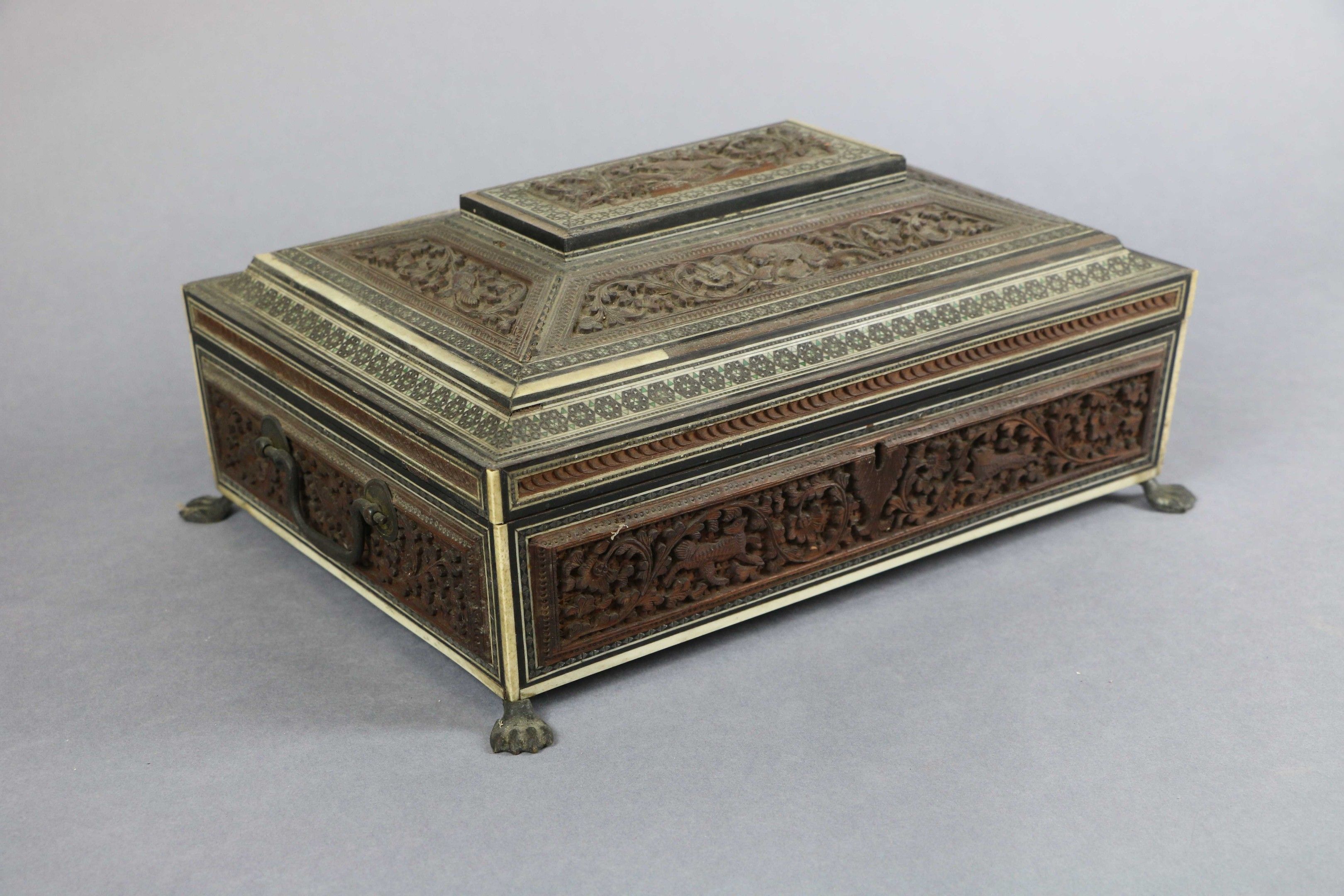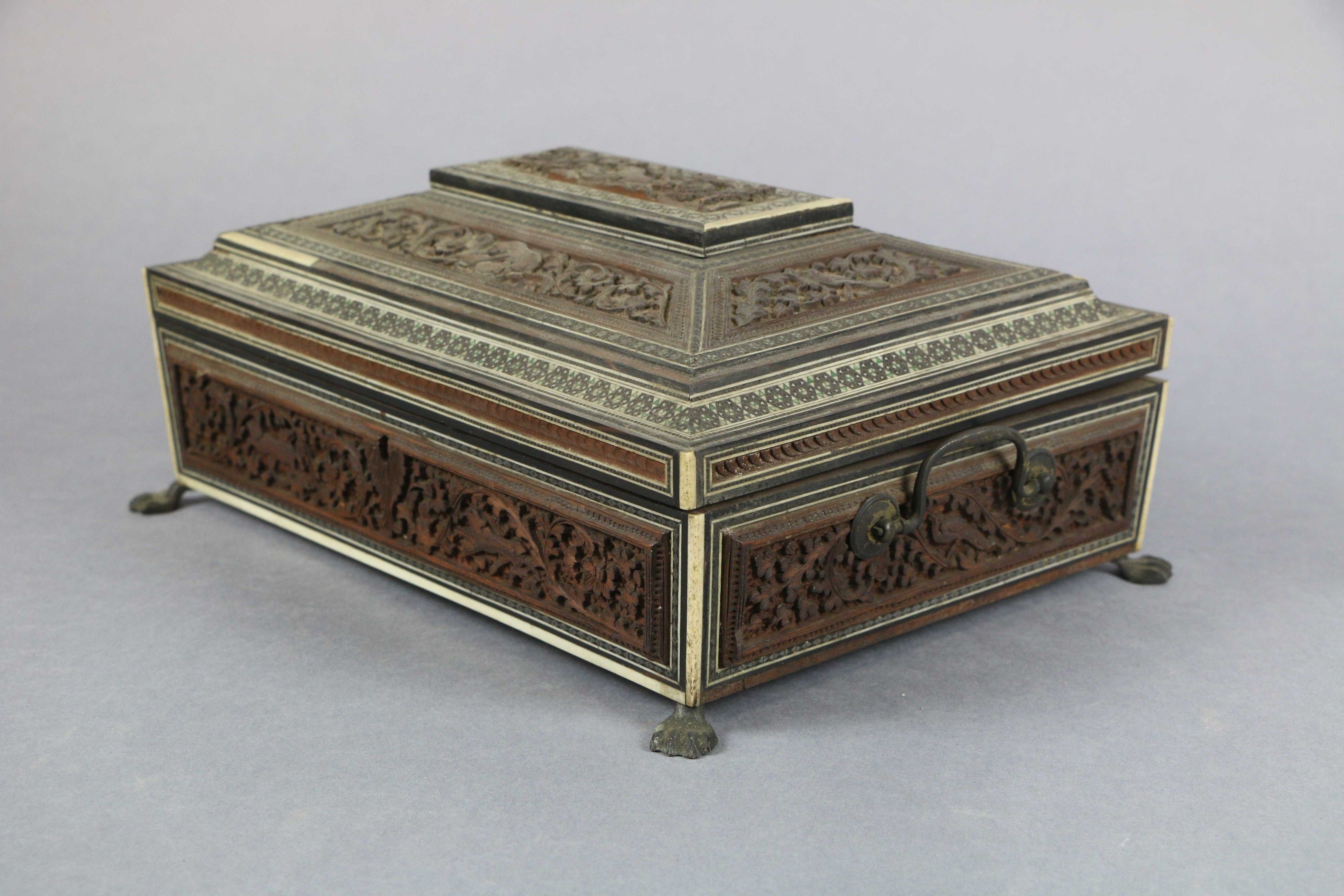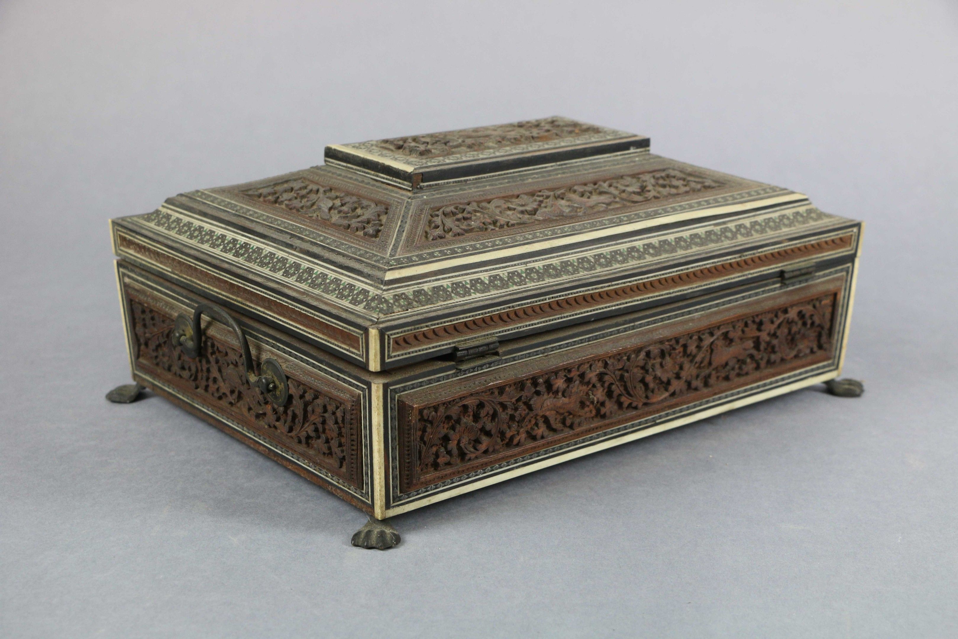 Rectangular wooden box carved with foliage and animals and decorated with geometric marquetry and bone fillets with two side handles and standing on four claw feet. It reveals a set of compartments carved with plant motifs, bone cups on two levels.