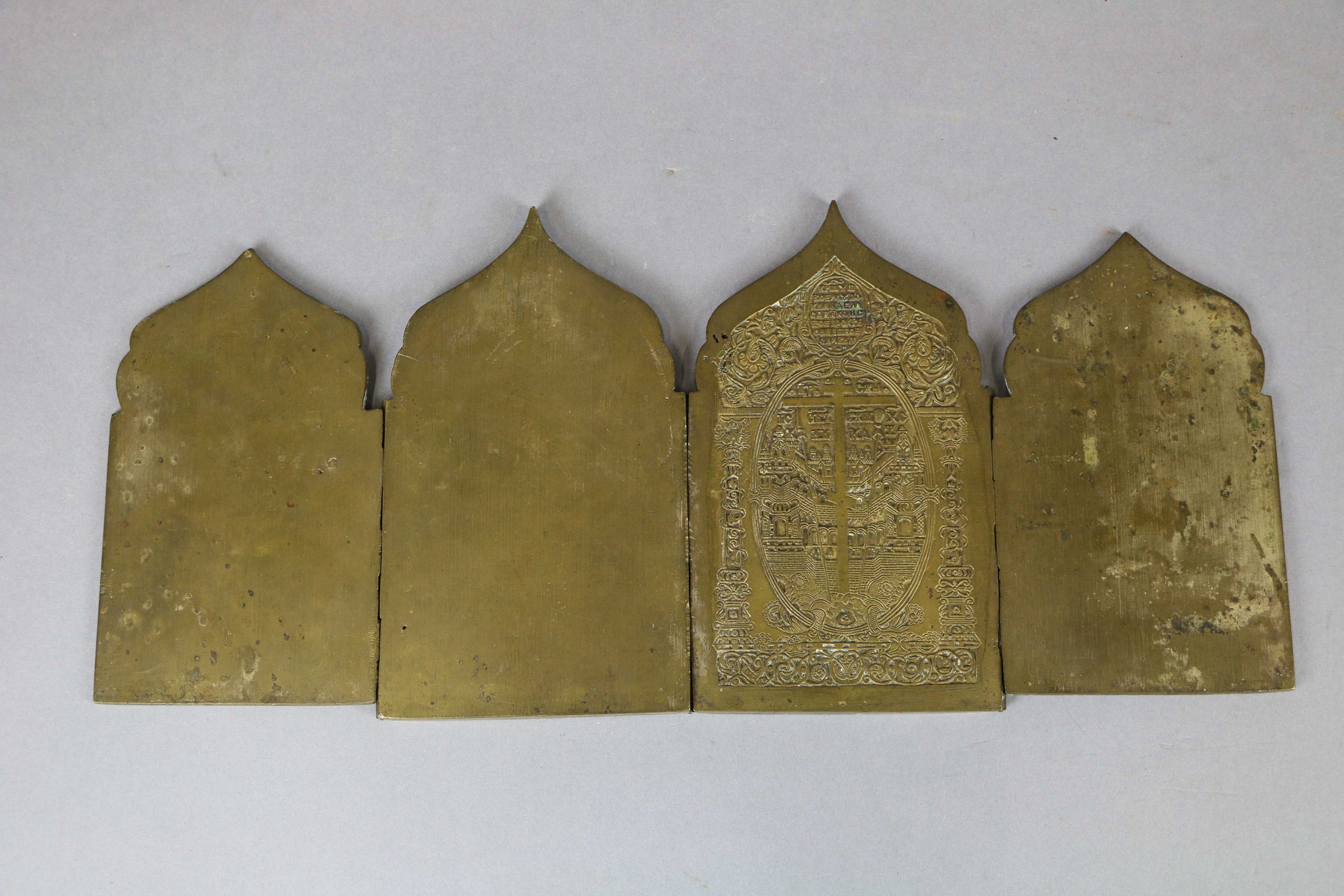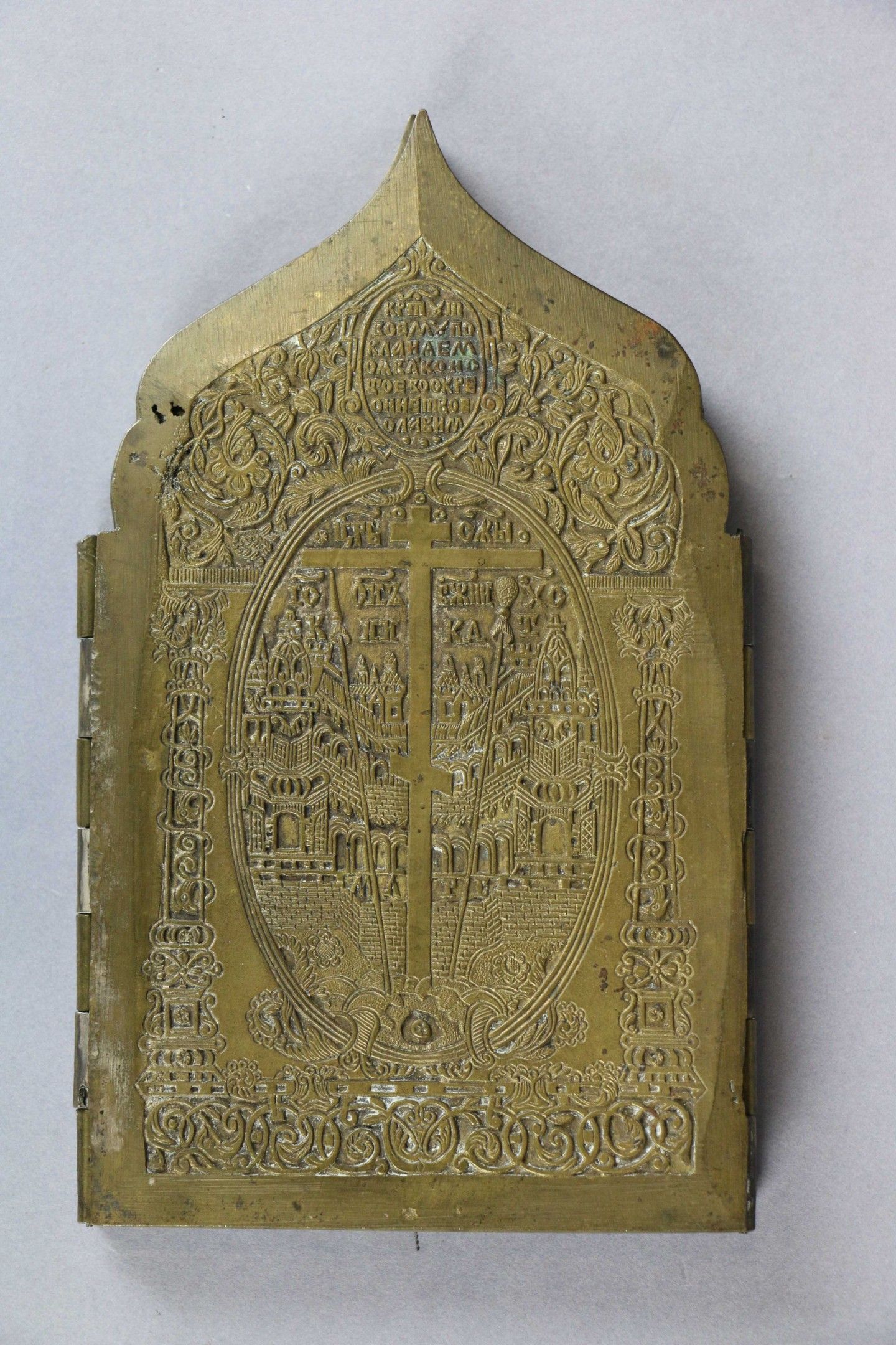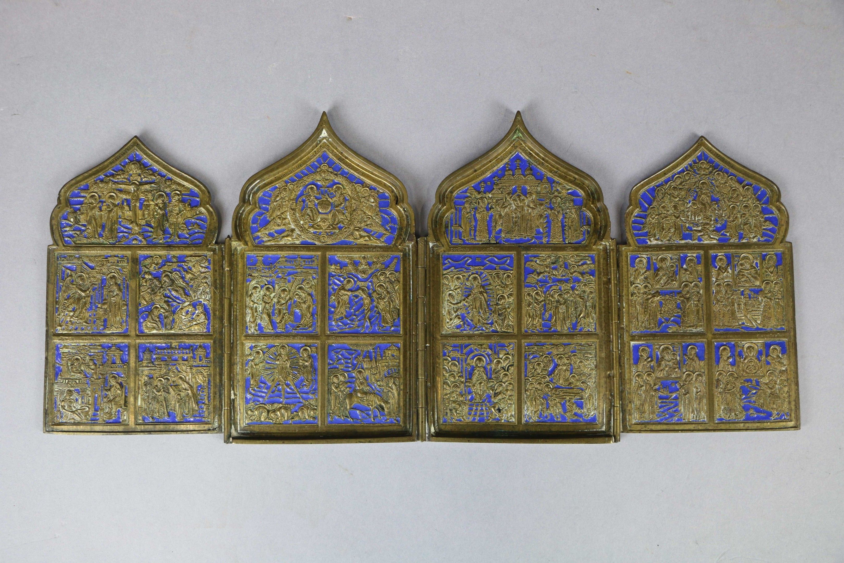 A QUADRIPTYQUE travel icon in enamelled bronze decorated with numerous religious scenes in reserves.