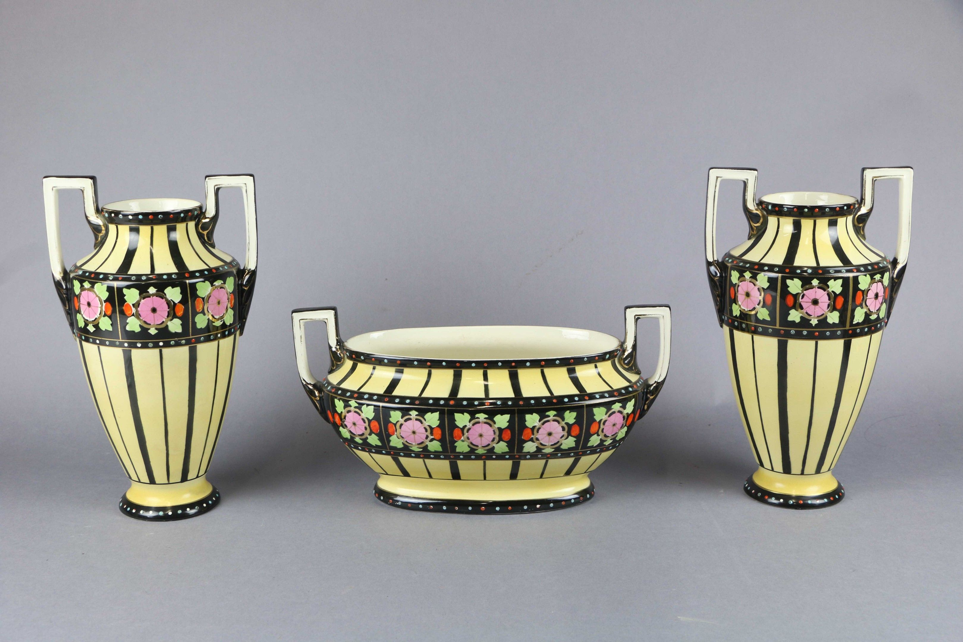 BOCH la Louvière: earthenware mantelpiece decorated with stripes and polychrome plant motifs including a jardinière and two vases.