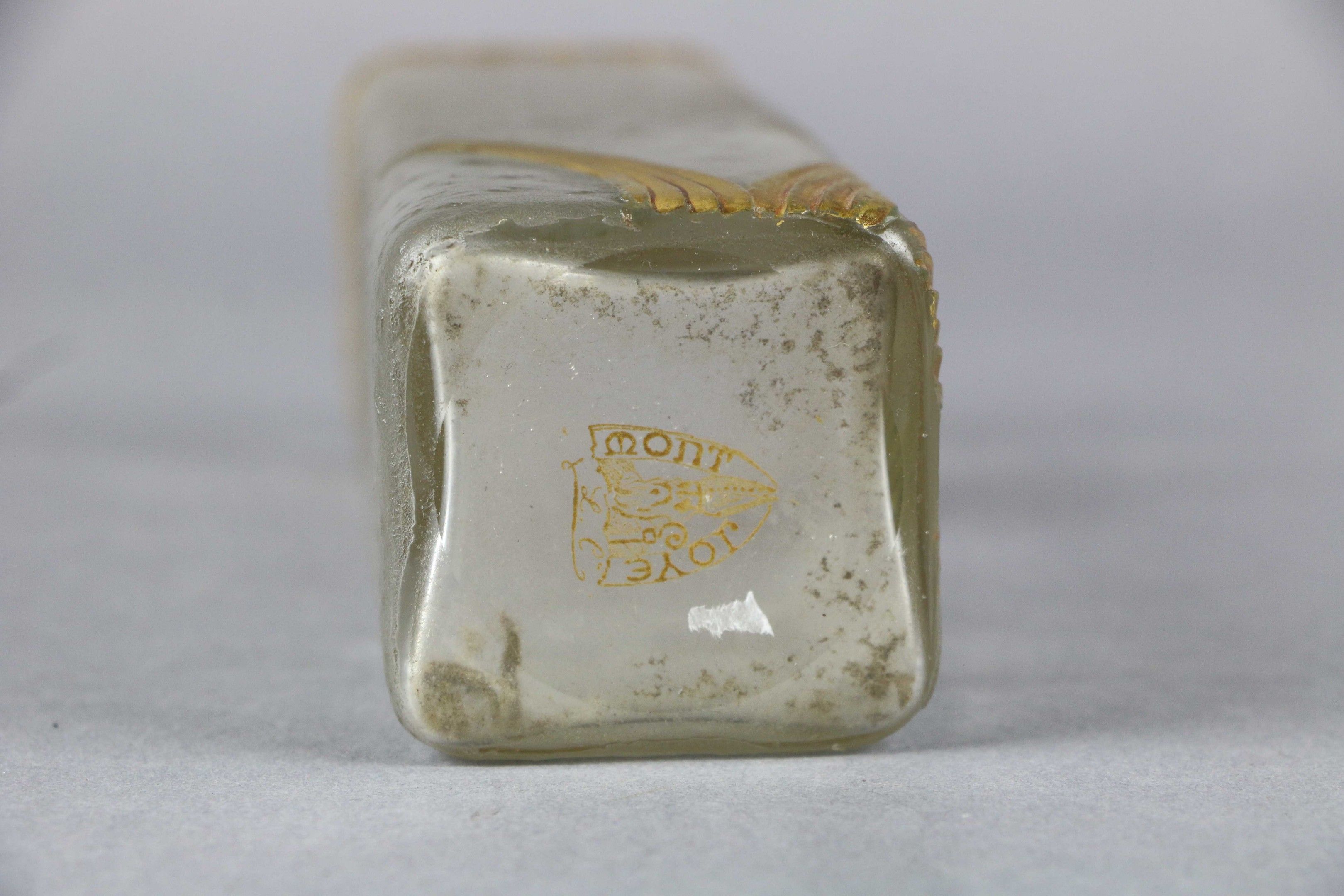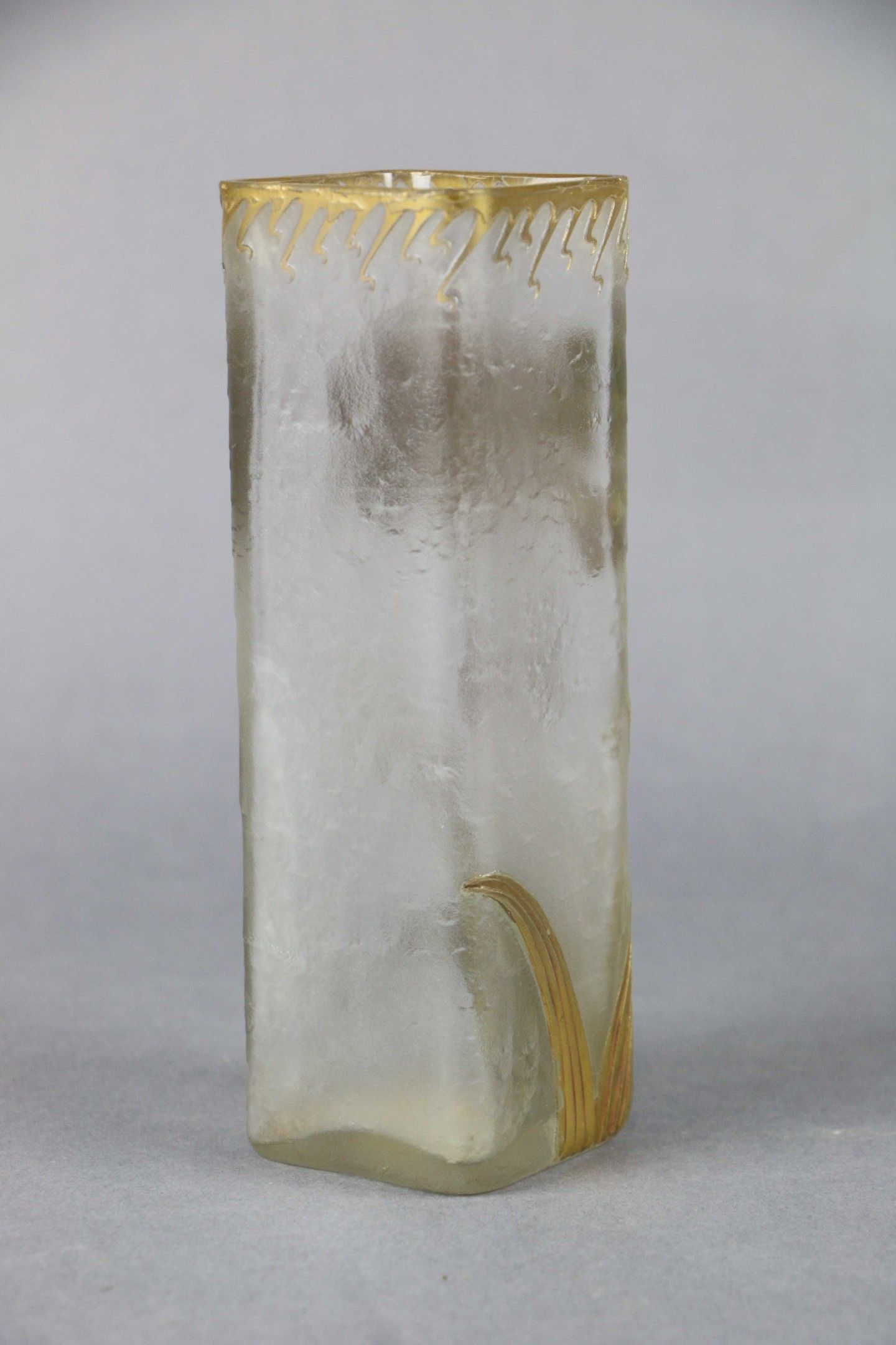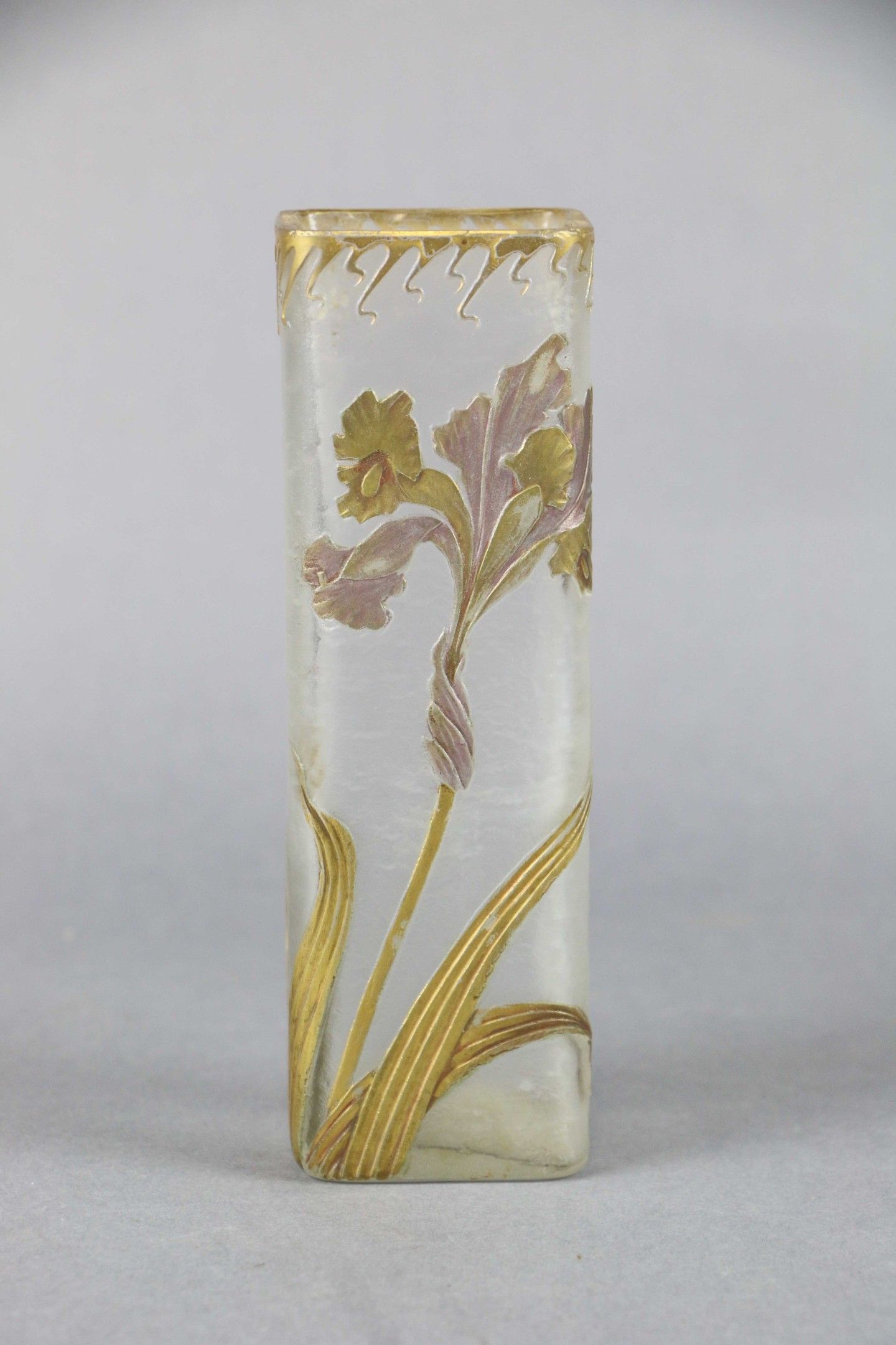 MONTJOYE: Square glass VASE with iris decoration. Signed und…