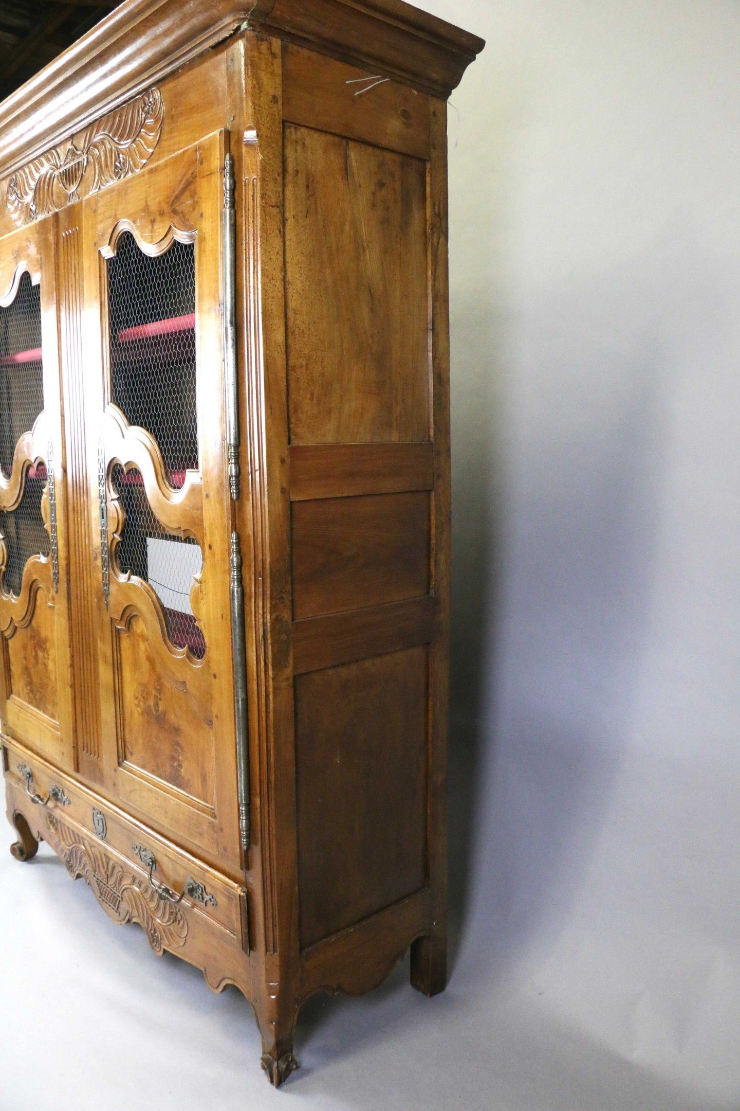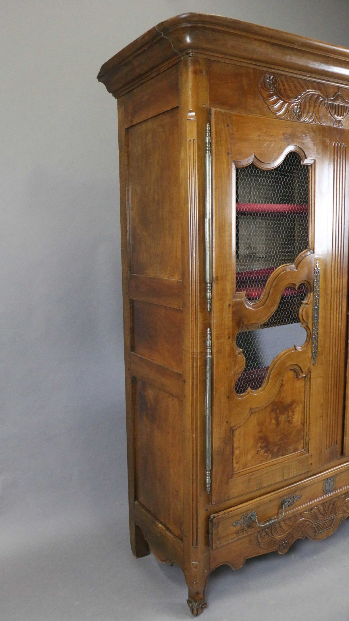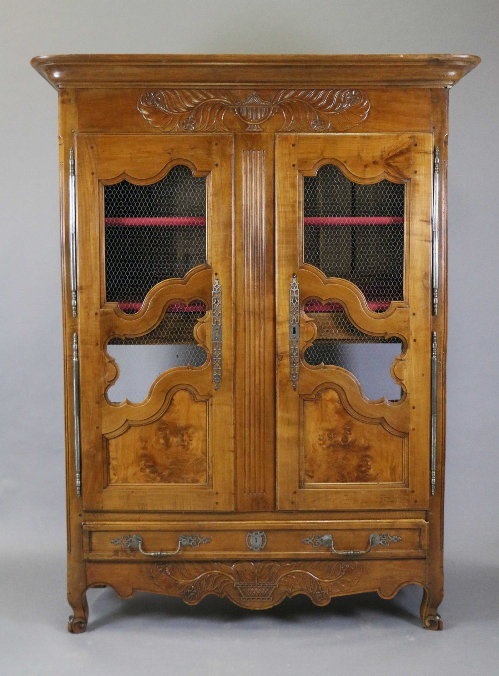 A pretty walnut ARMOIRE opening on to two moulded doors with openwork latticework and a pediment carved with an urn and flowering stems and fluted jambs.