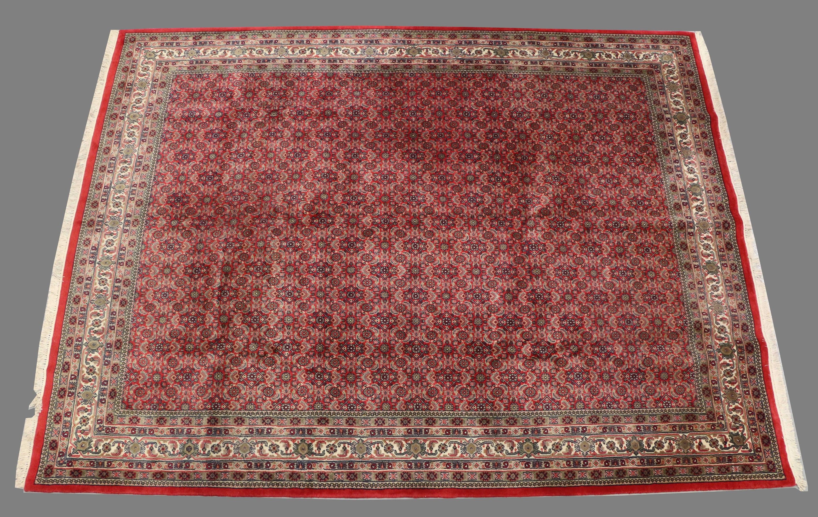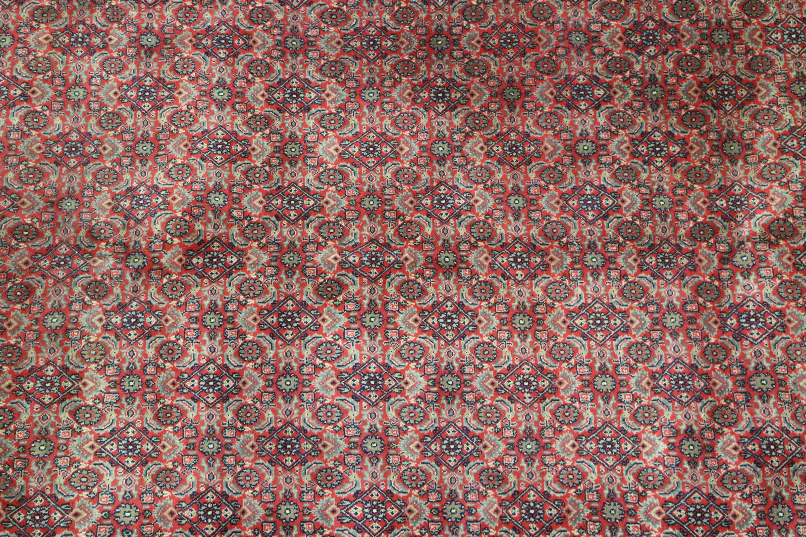 KACHEMIRE-INDE: large woollen RUG with a "Herati" design consisting of a stylised floral design on a red background.