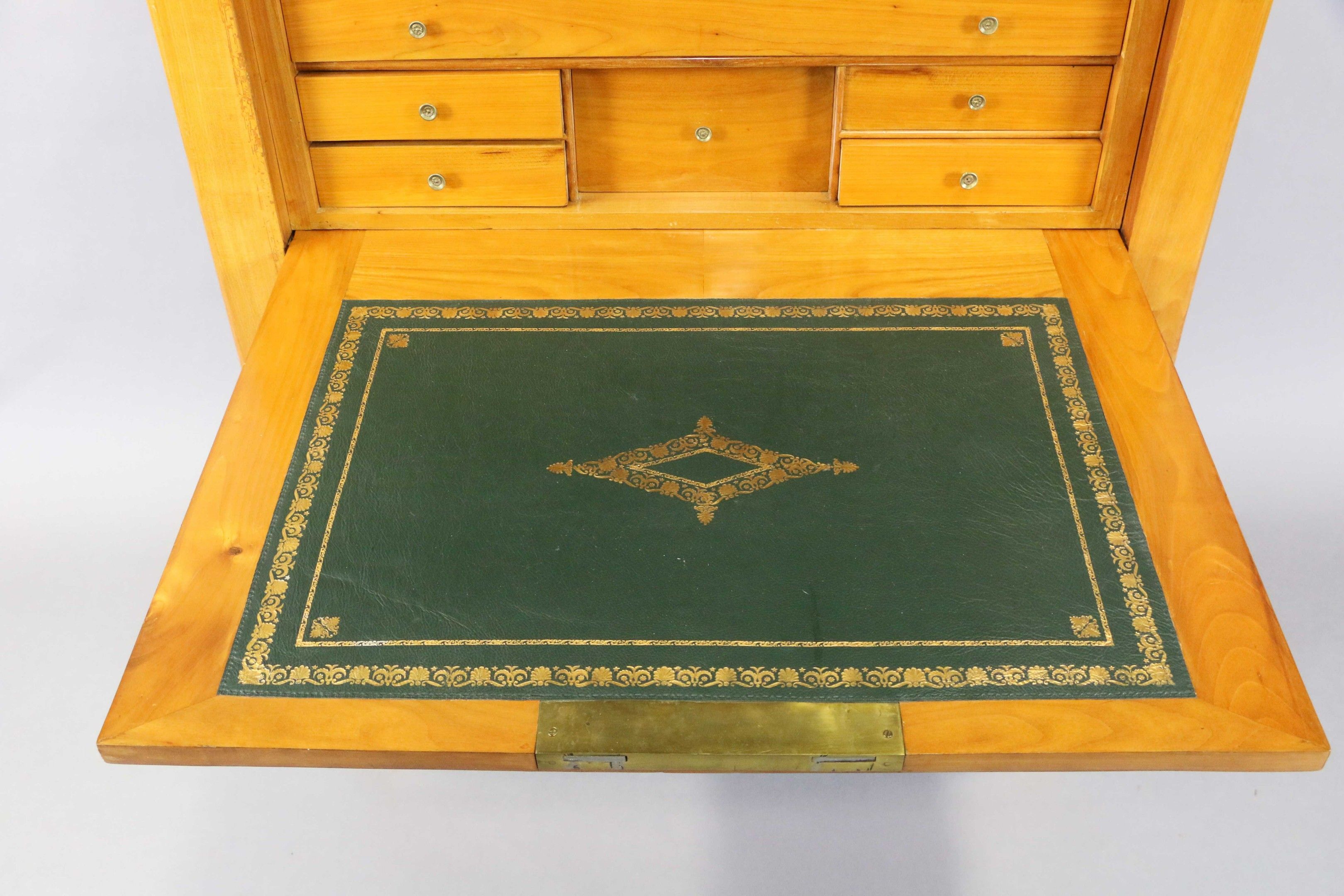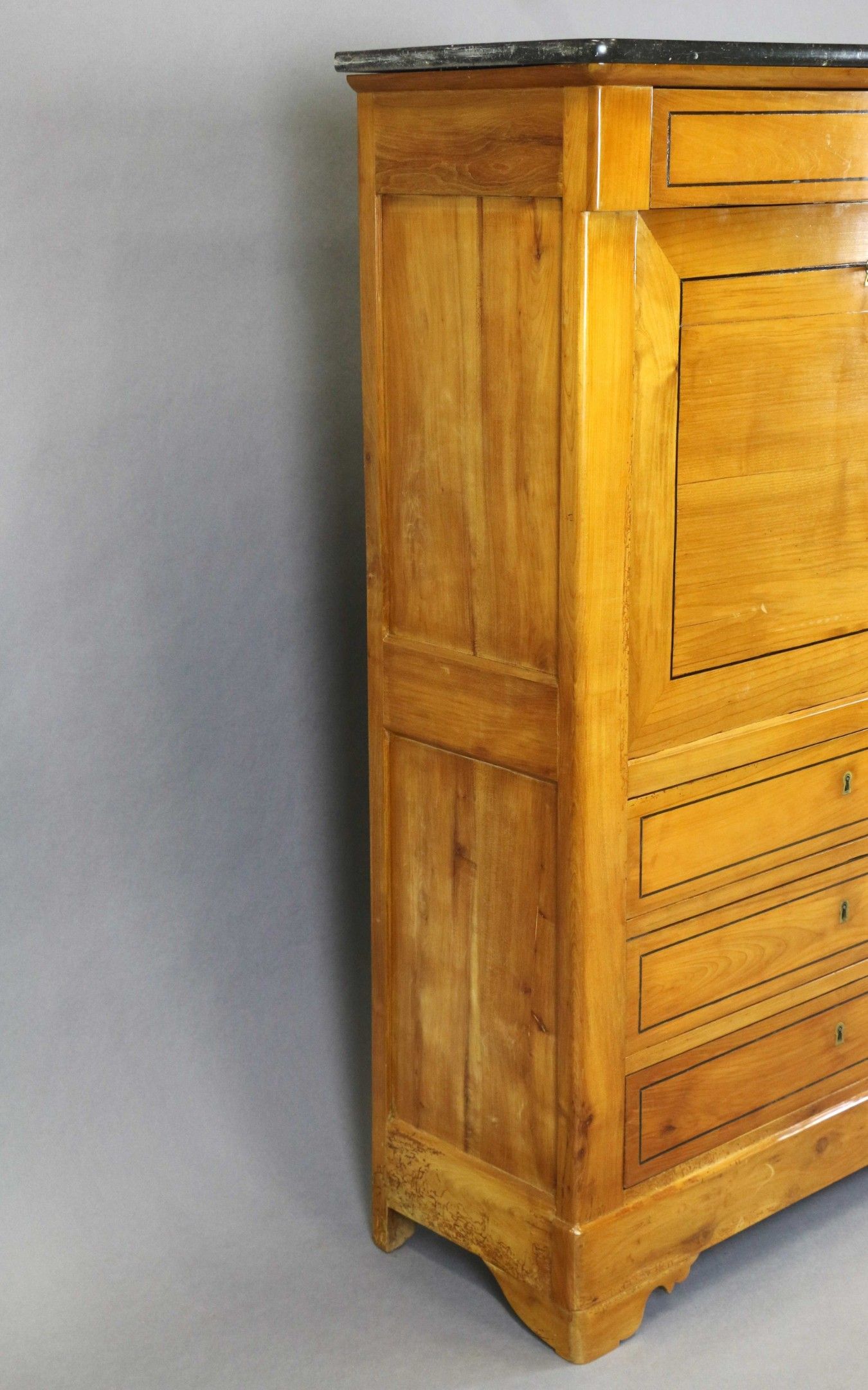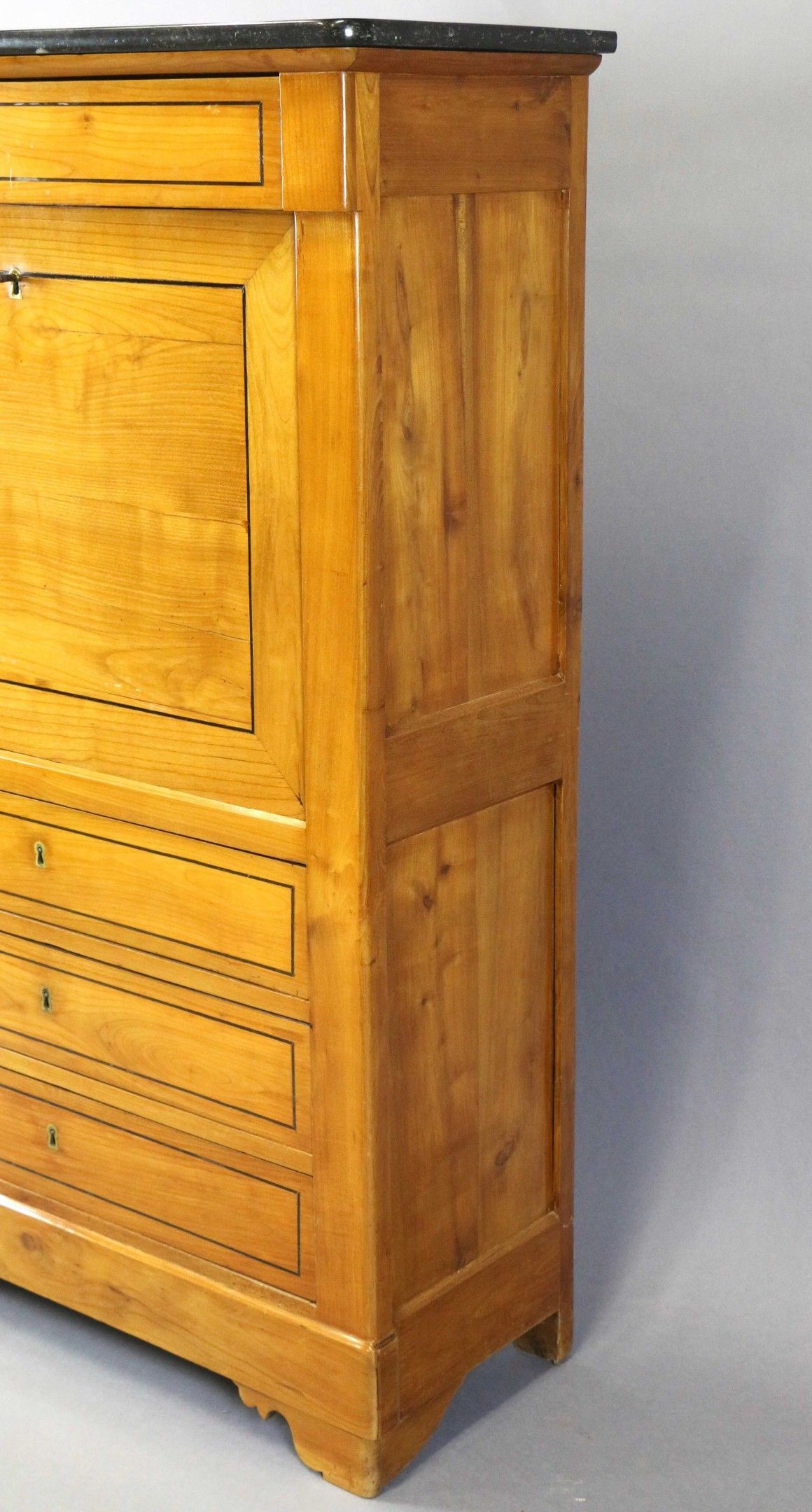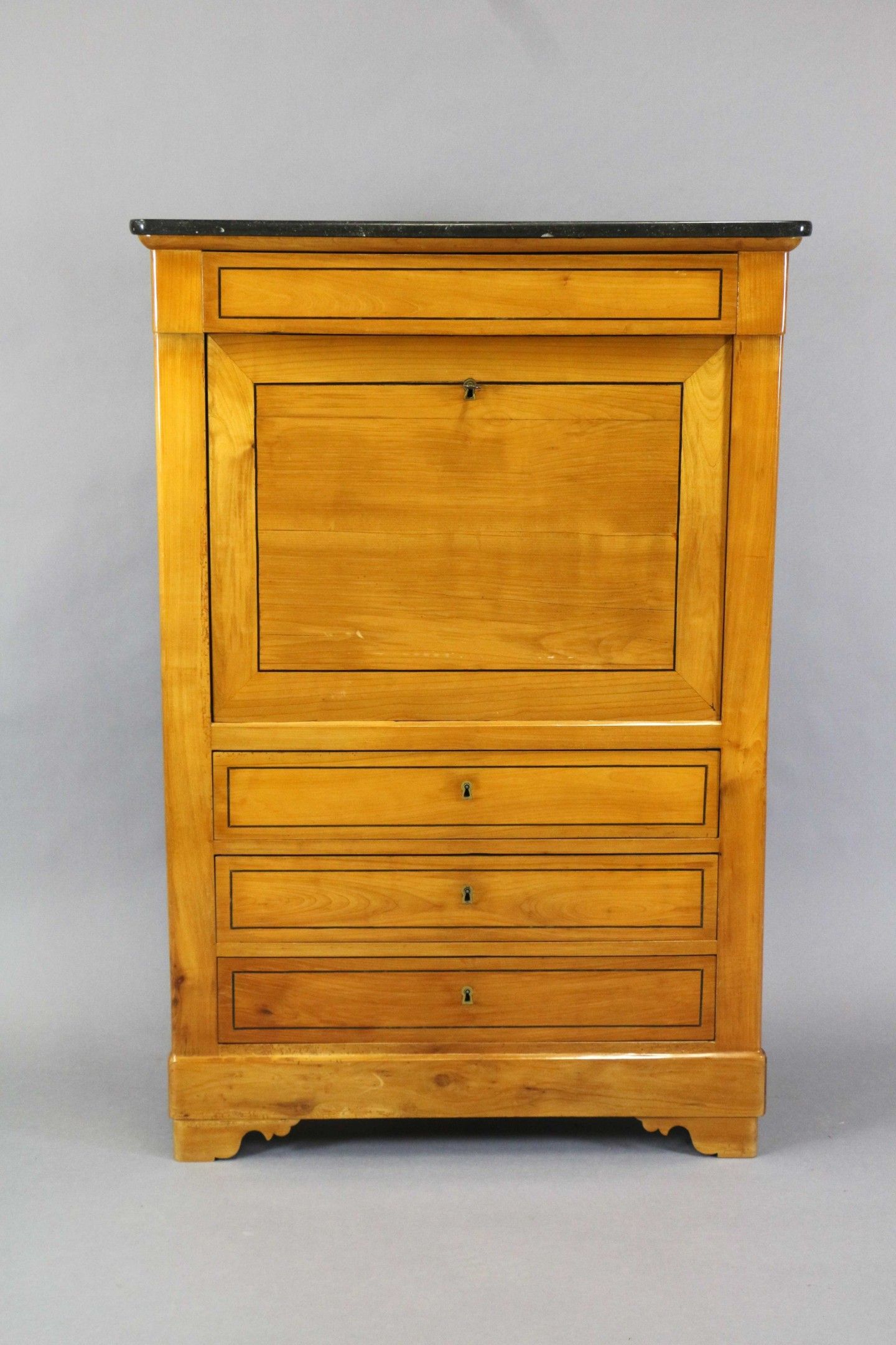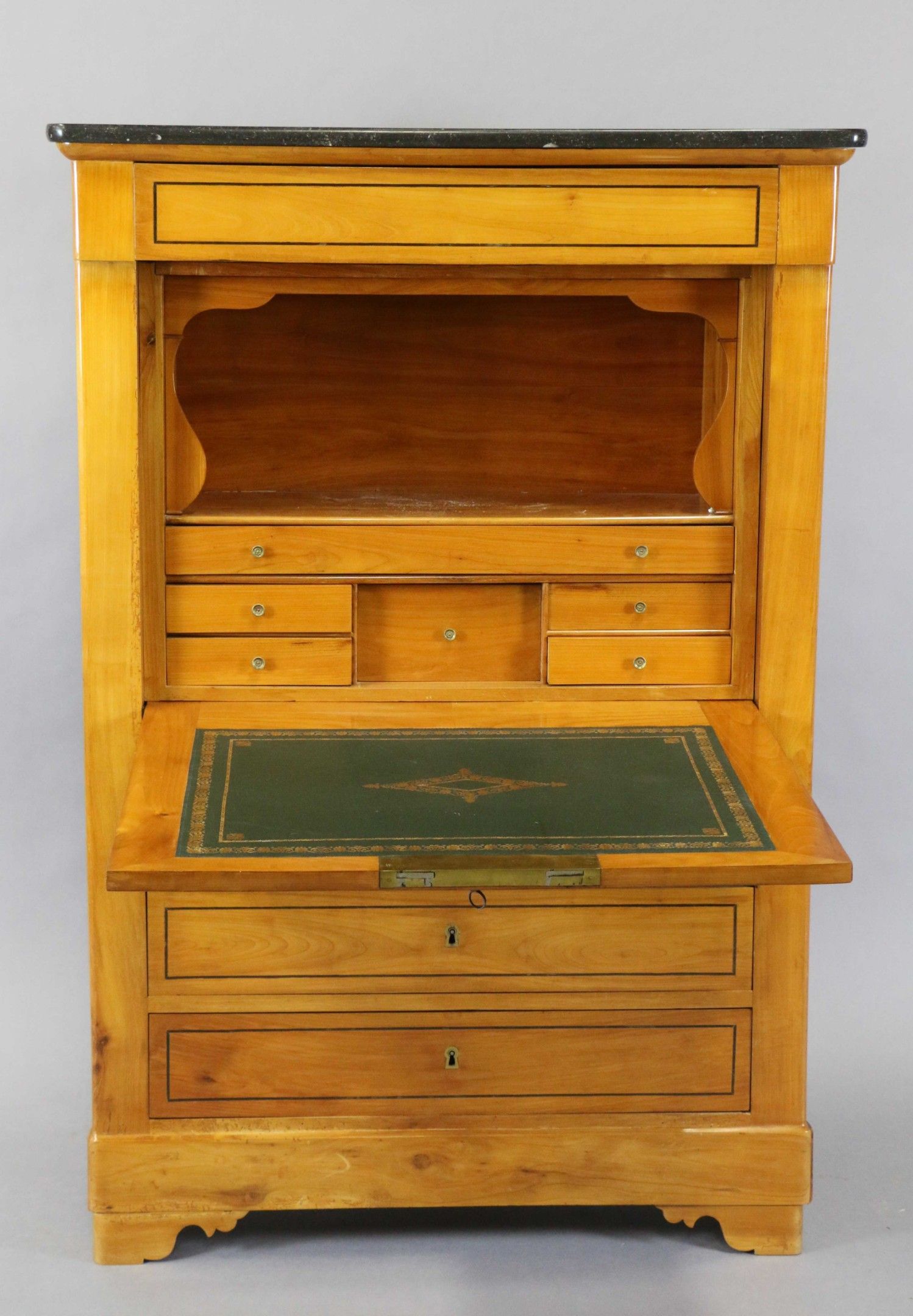 Wood veneer and dark wood fillets SECRETARY opening with a flap trimmed with gilded leather and four drawers. Marble top.