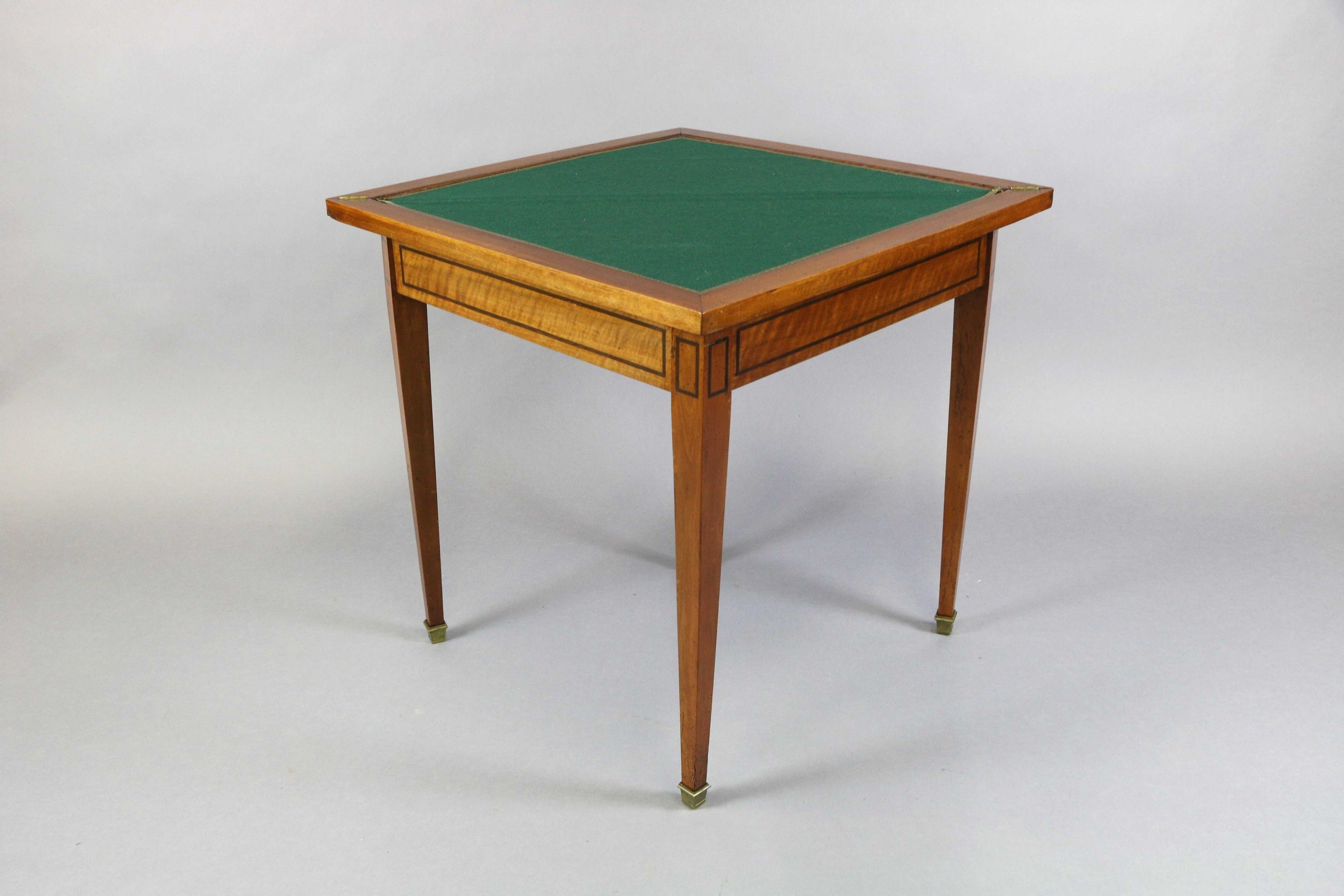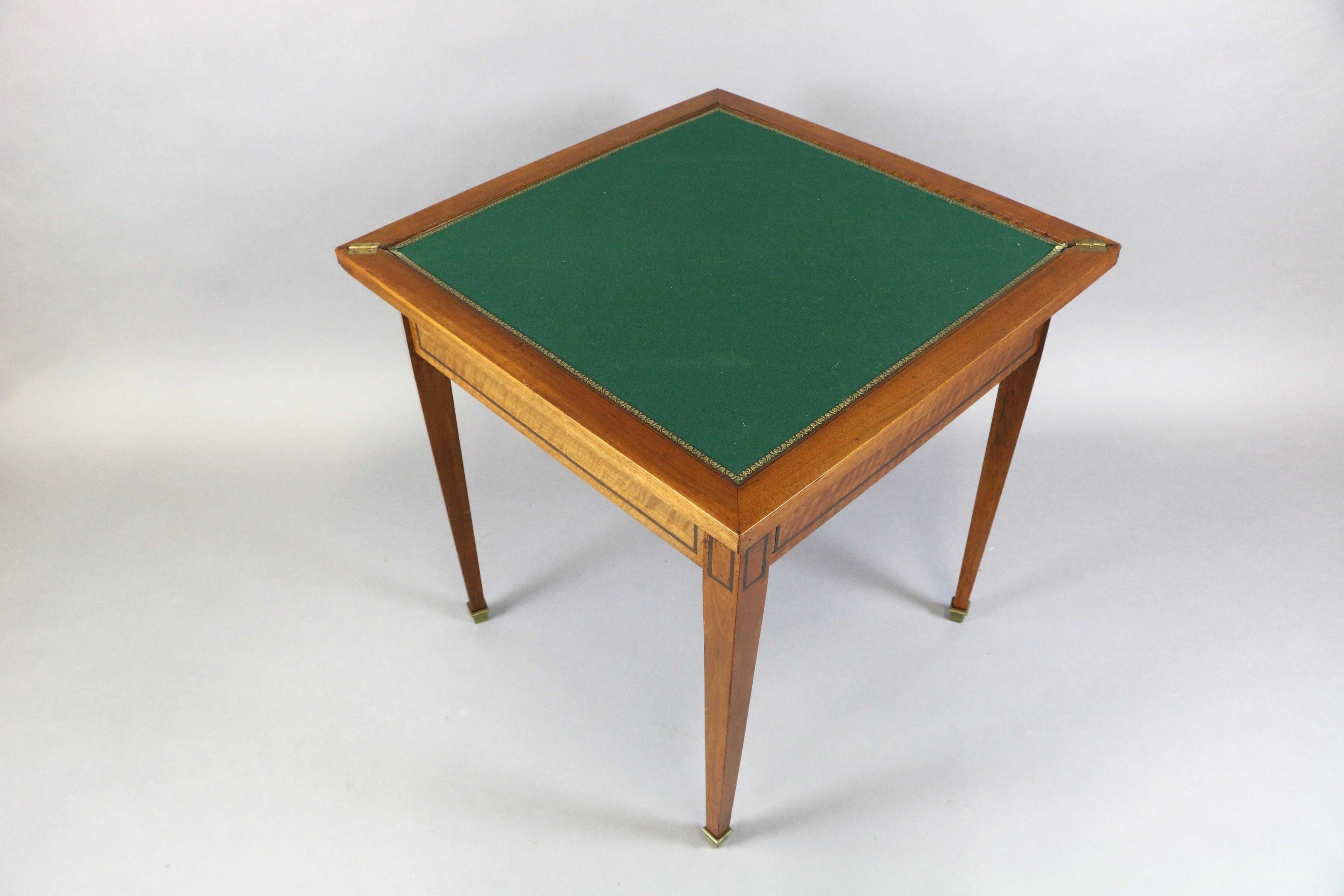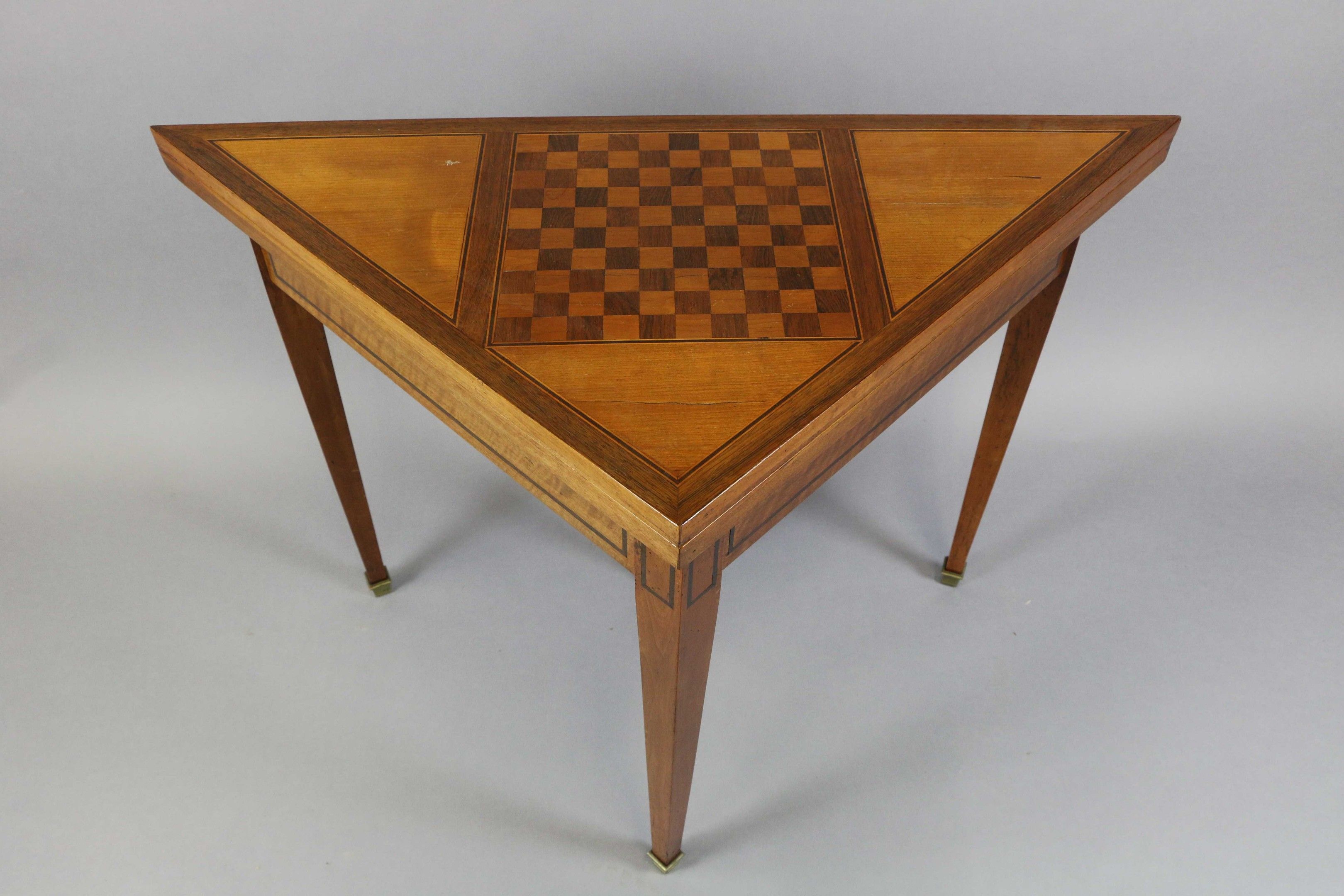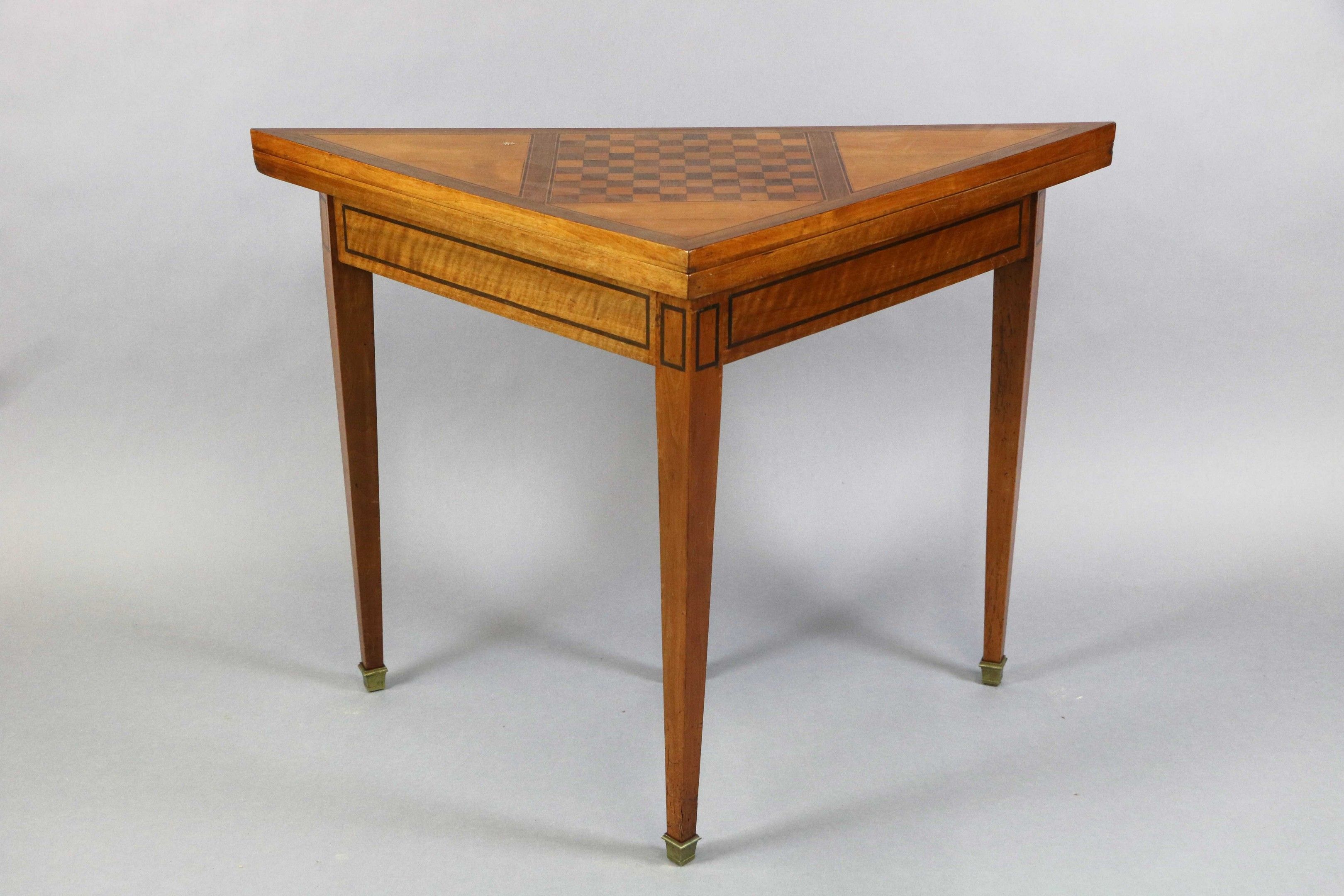 Triangular game table in veneer with a folding top inlaid with a checkerboard revealing green felt. The belt is decorated with dark wood fillets. It stands on four tapered legs finished with bronze sabots.