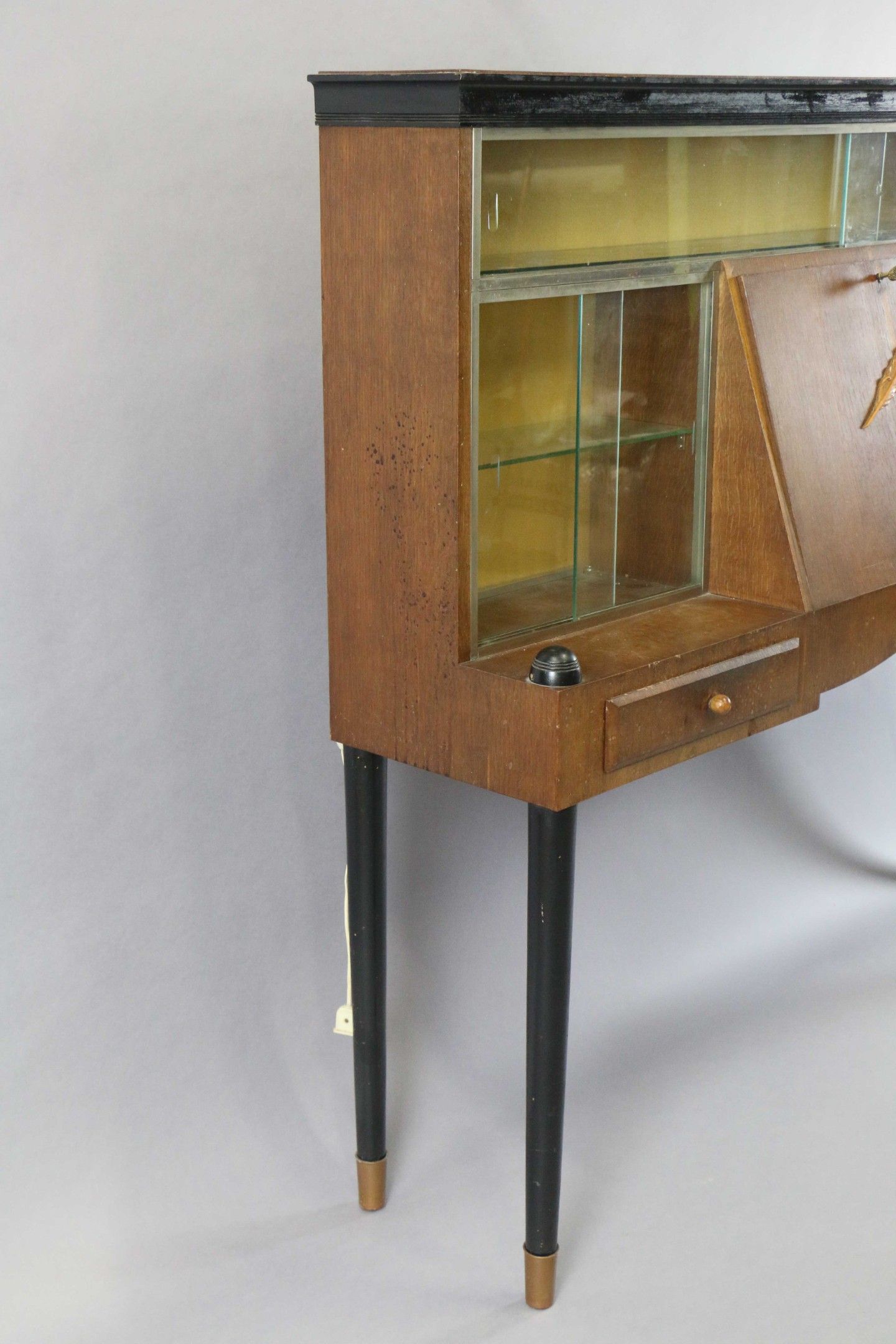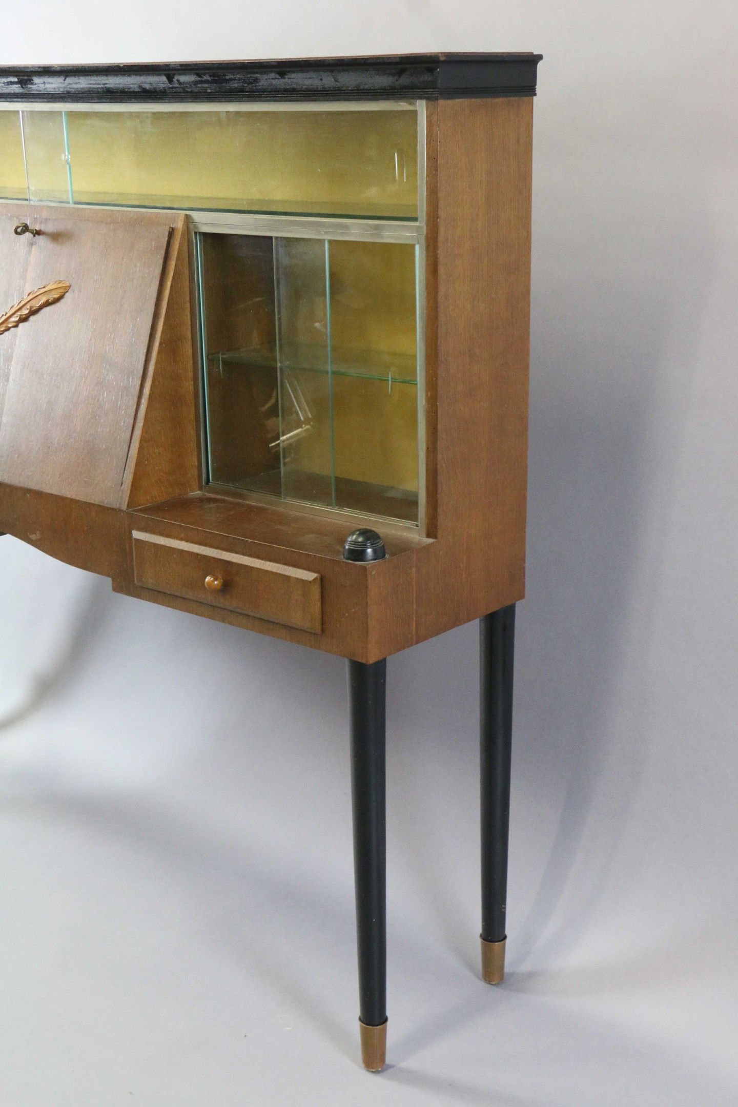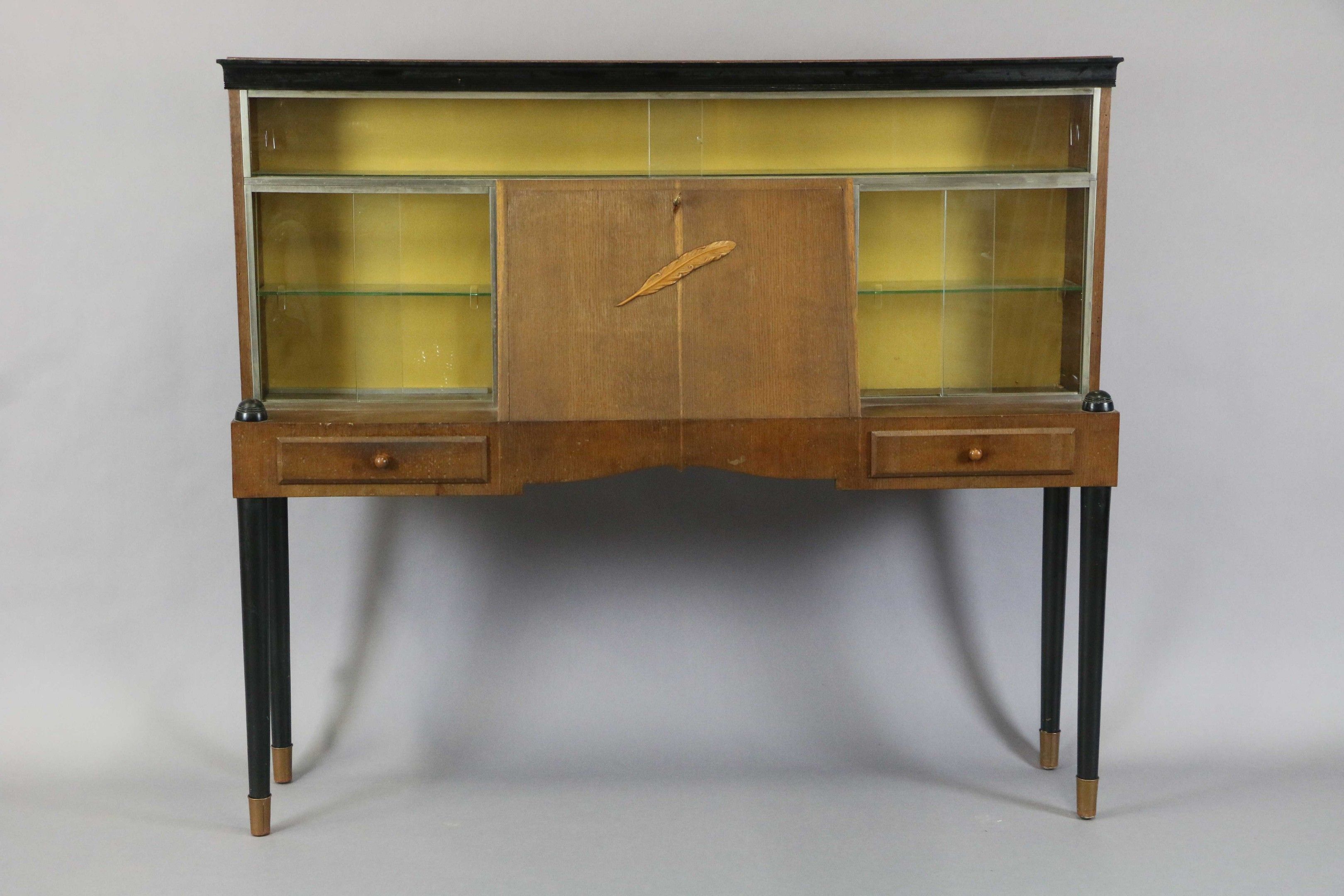 A scriban display cabinet in veneered and blackened wood opening with a flap decorated with a carved light wood feather, two drawers and three side and top display cabinets. It stands on four turned legs.
