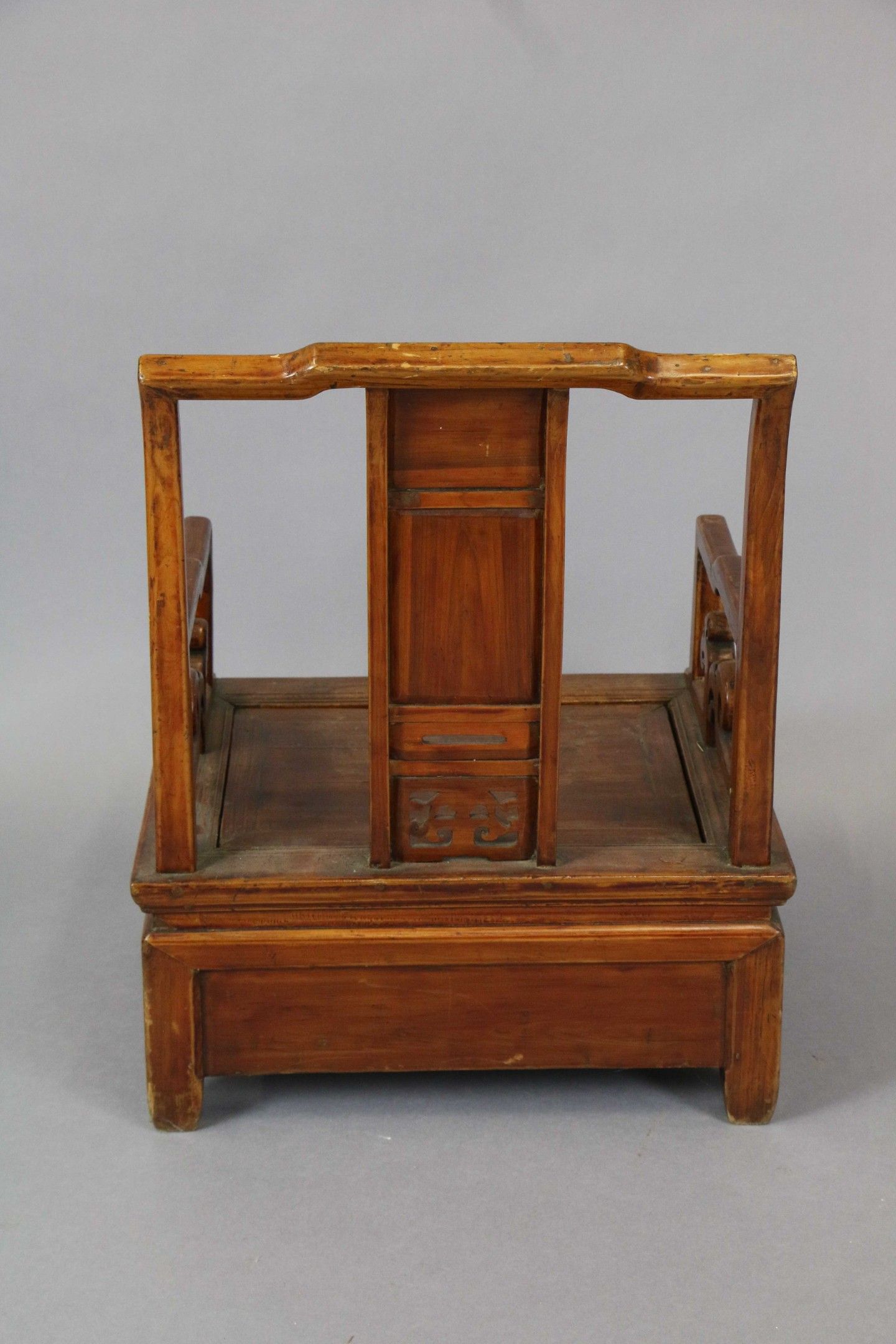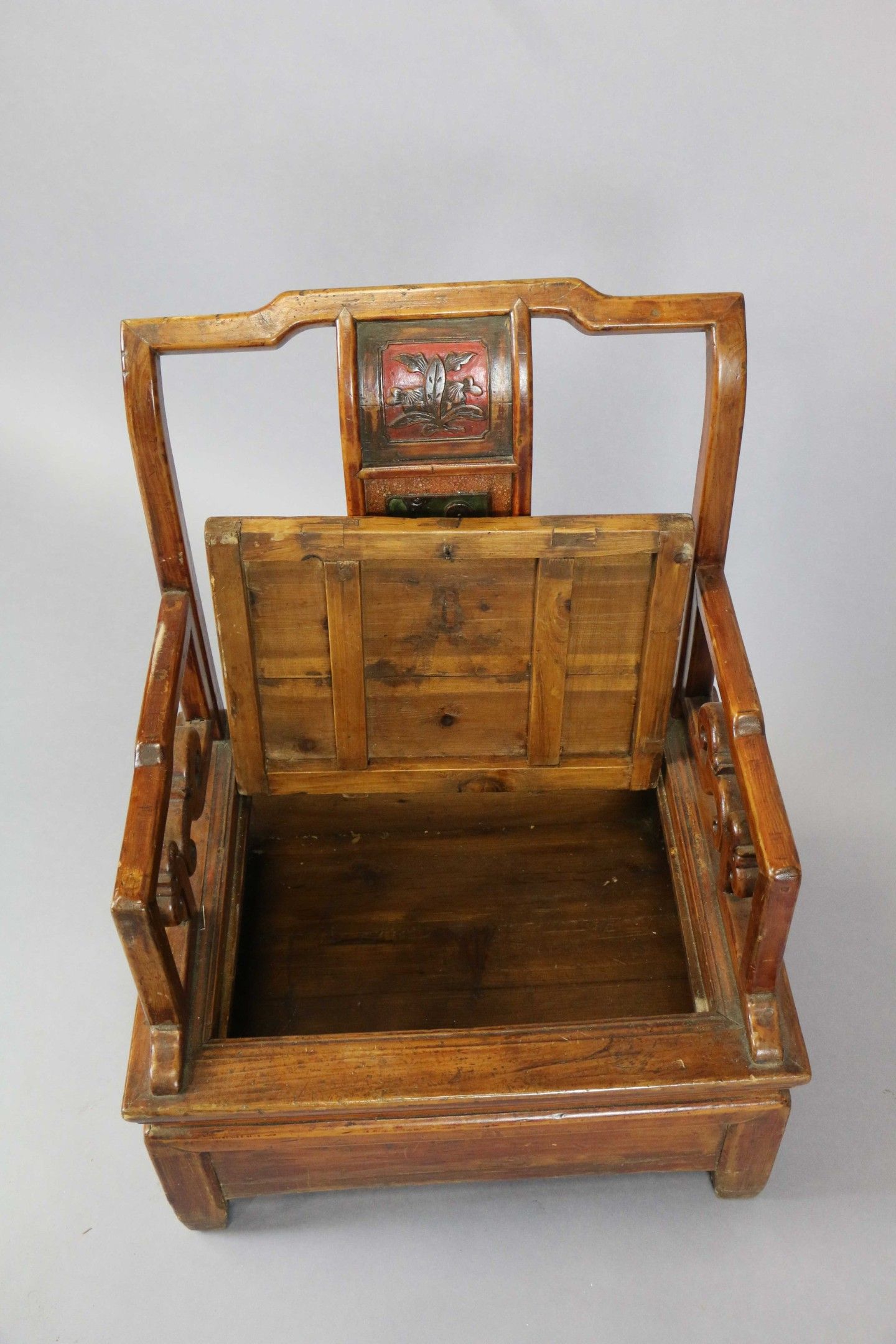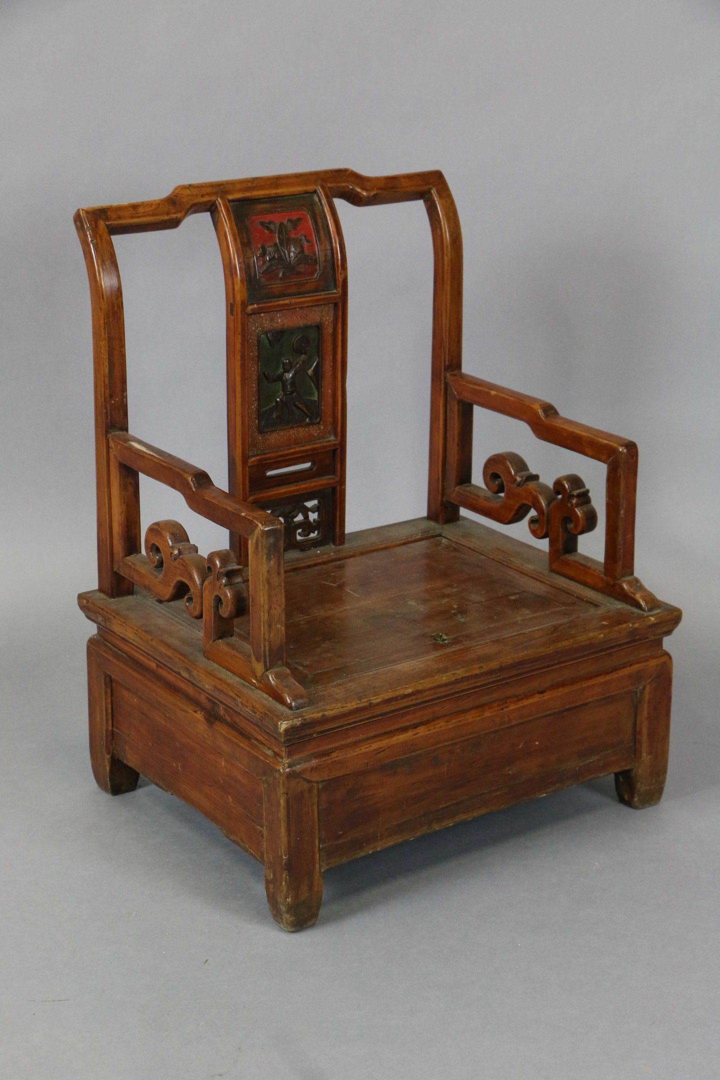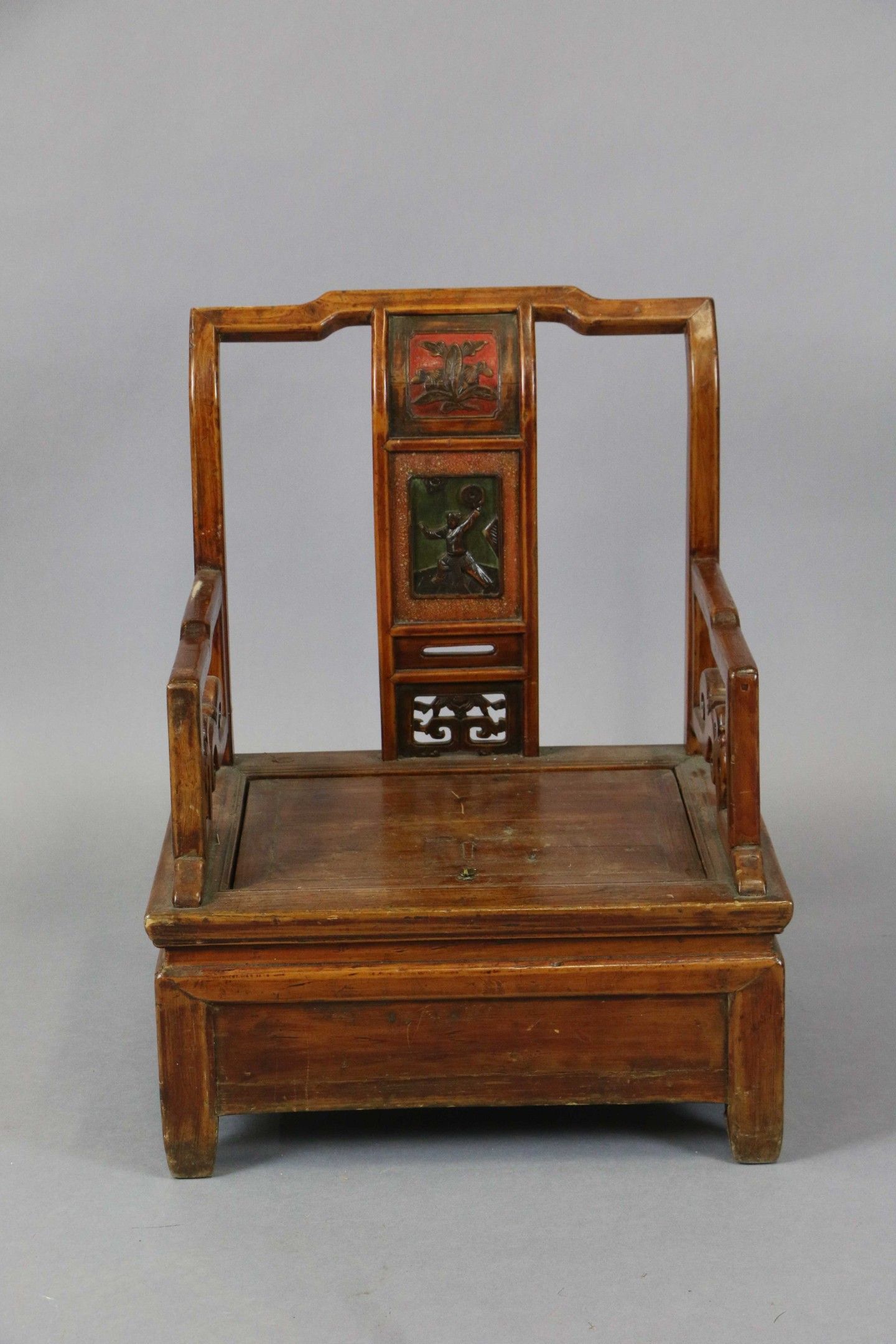 An exotic wood child's CHAIR with a back carved with a playing figure and plant motifs, two armrests with plant scrolls. The seat reveals a storage compartment.
