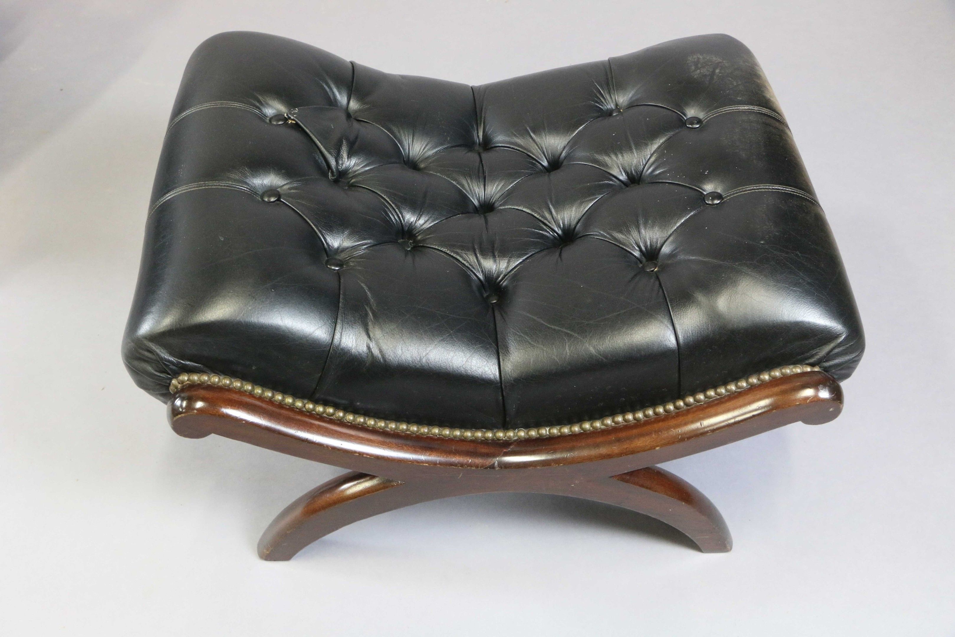 Green leather upholstered Chesterfield type LONG CHAIR with ears and its ottoman.