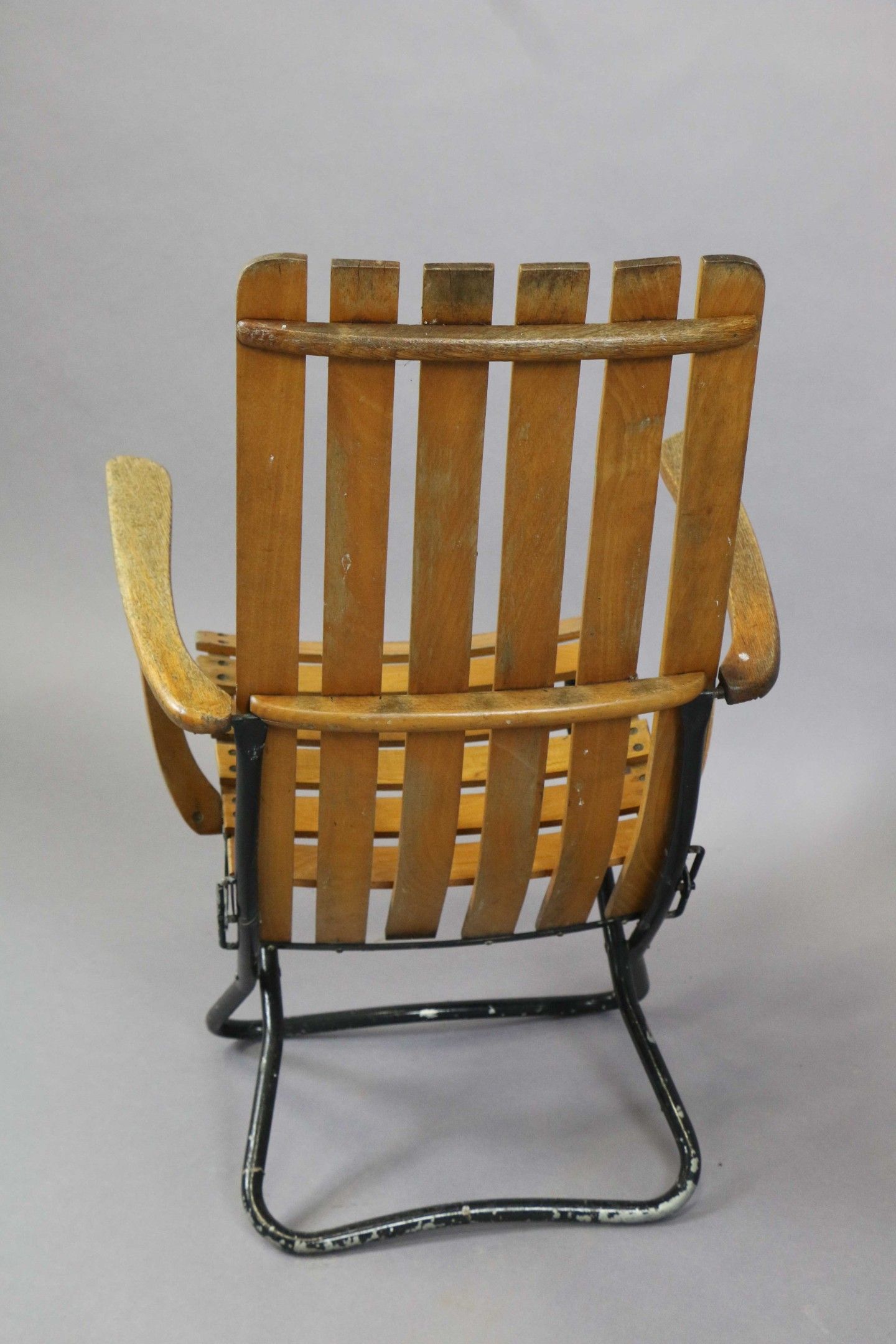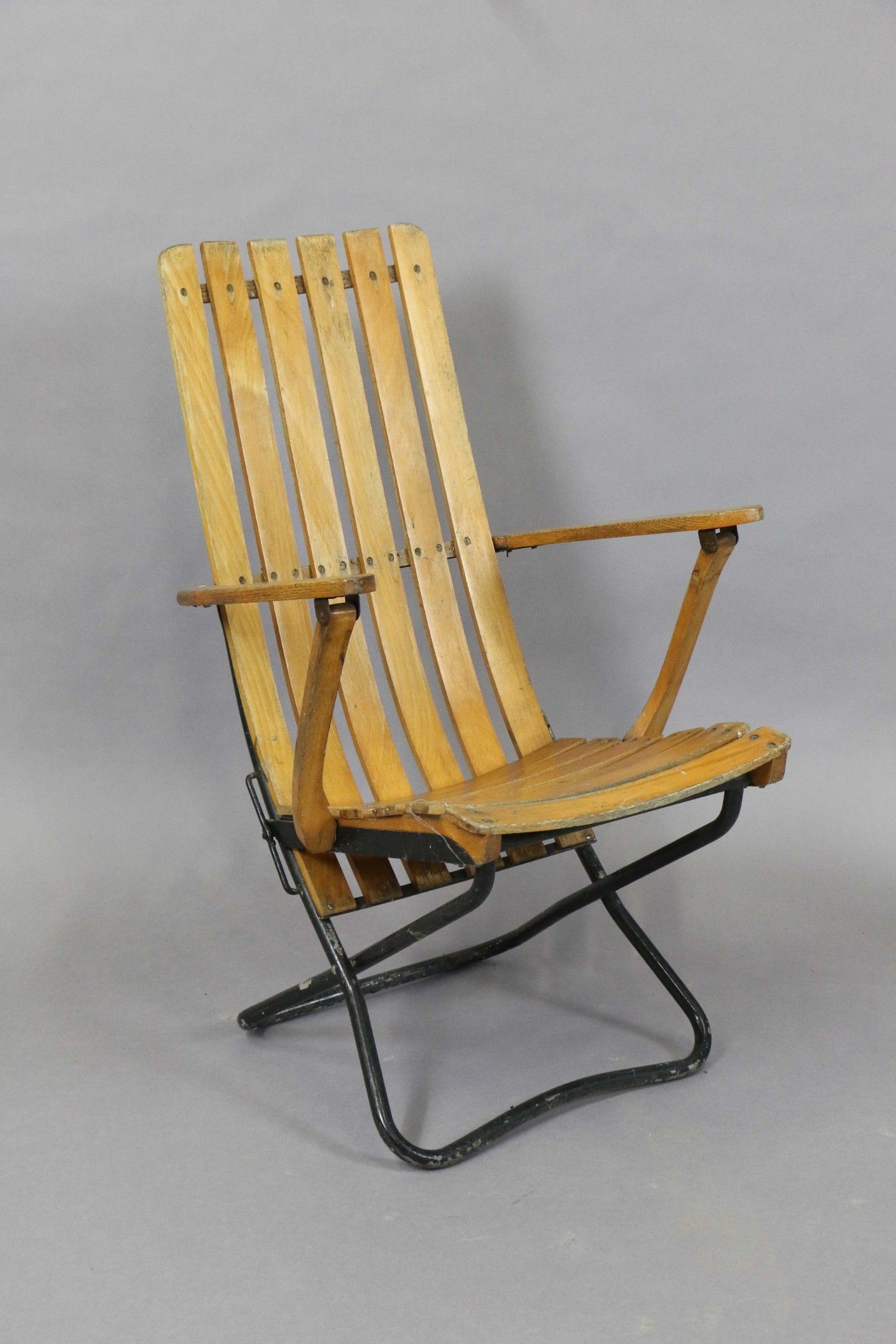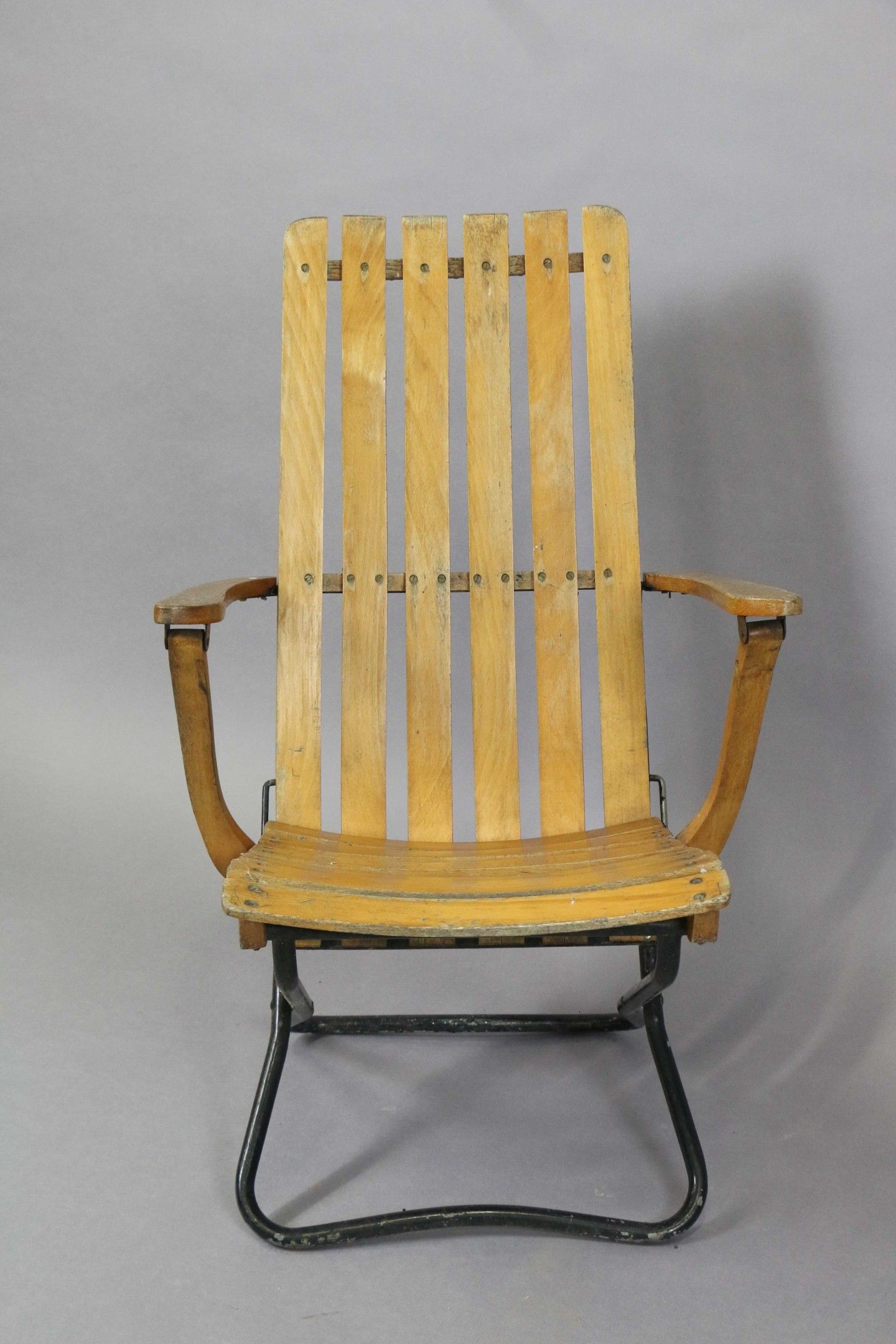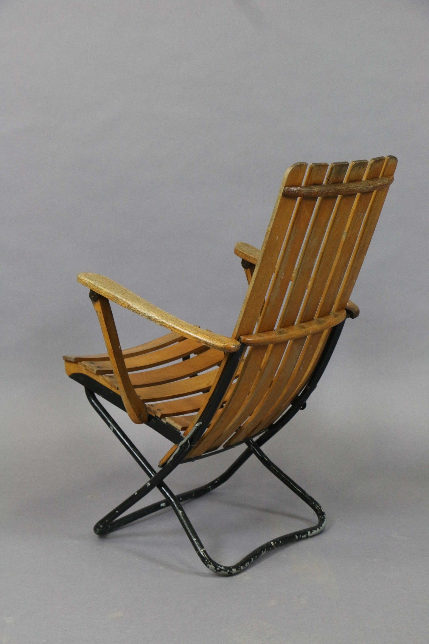 Liner style folding armchair with wooden slats and painted tubular steel frame.