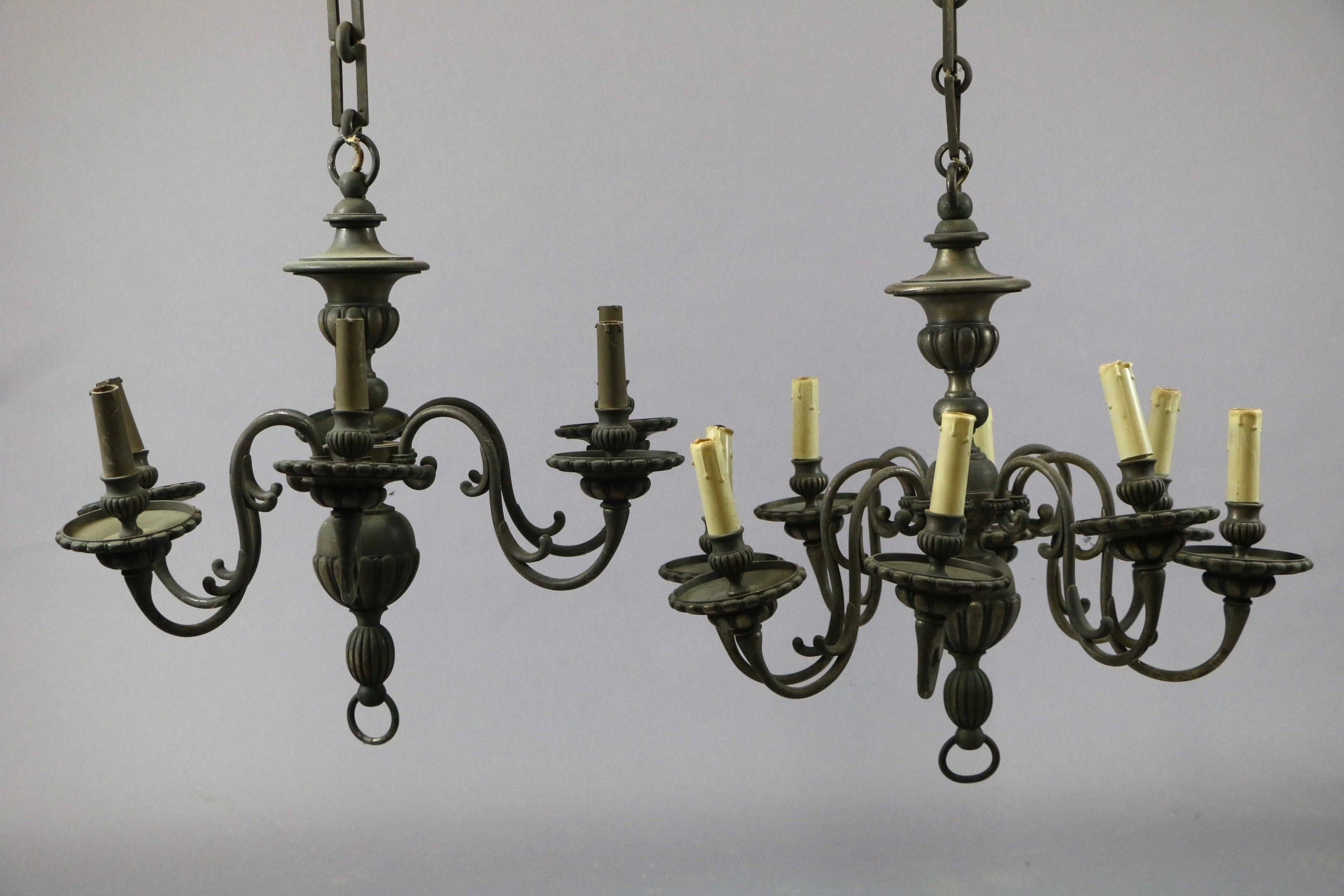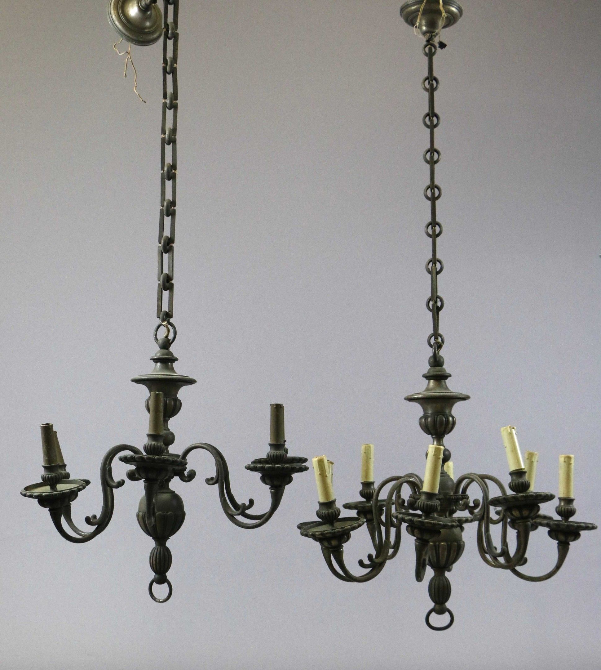 A pair of large bronze LUSTERS with eight scrolled arms and …