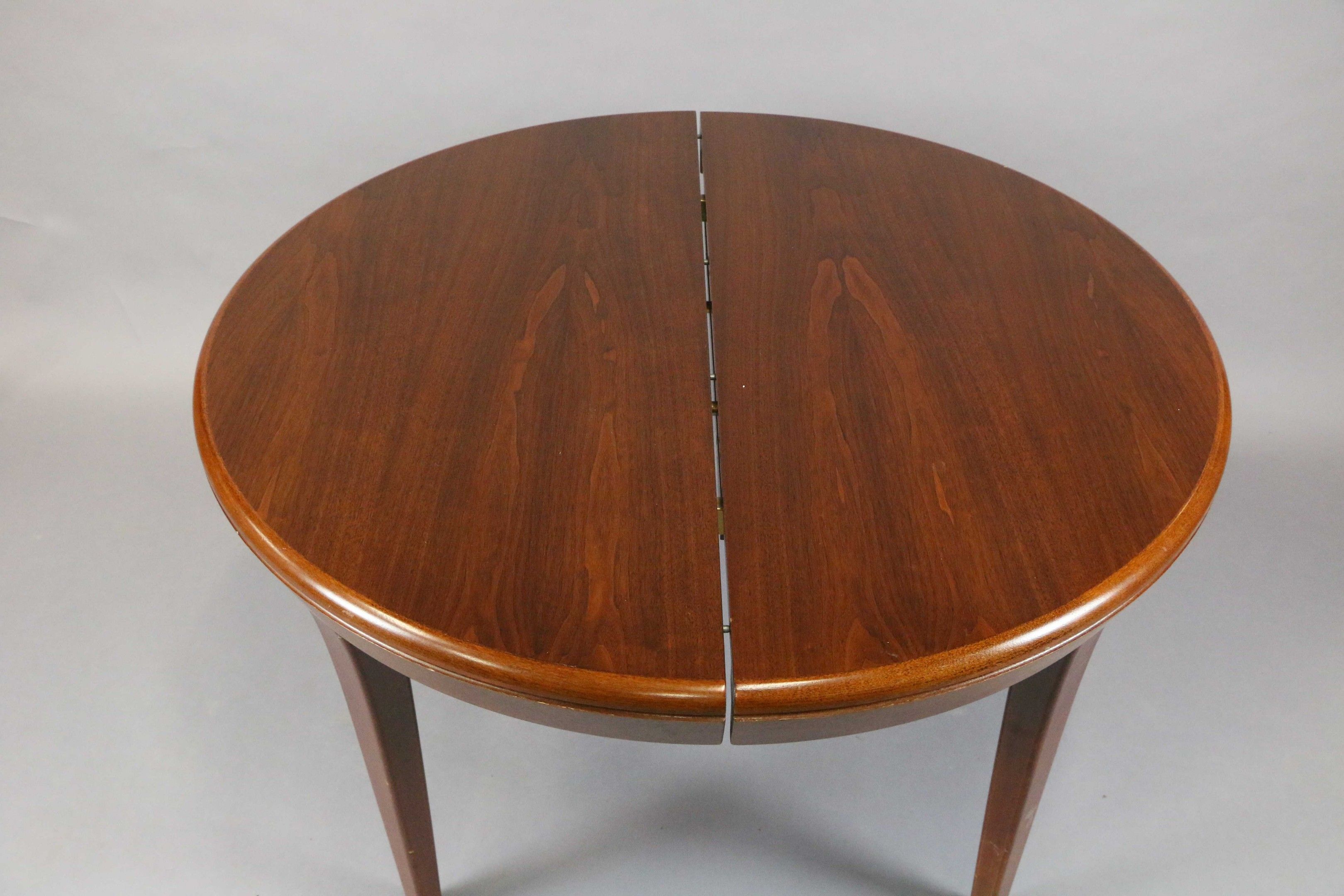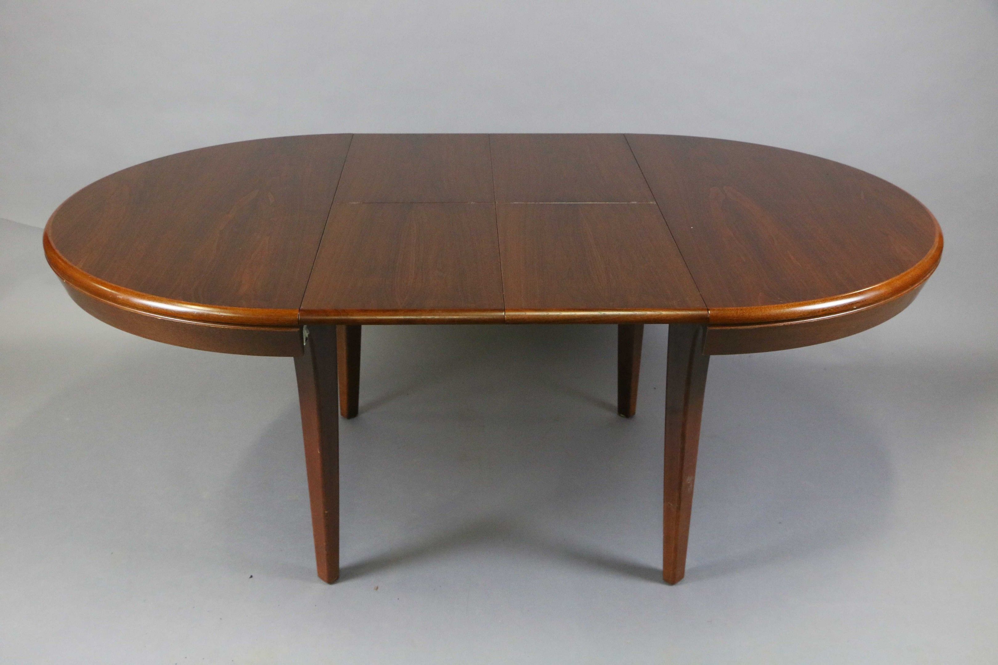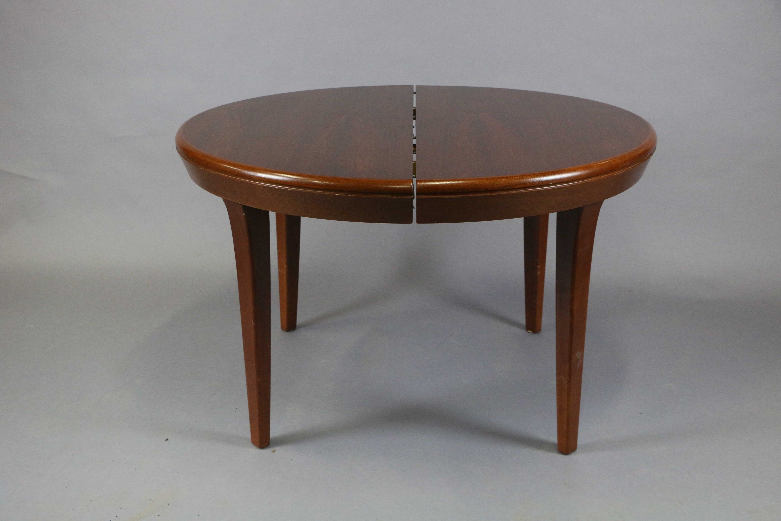 Round dining table in natural wood with mechanism and integrated extensions resting on four legs.