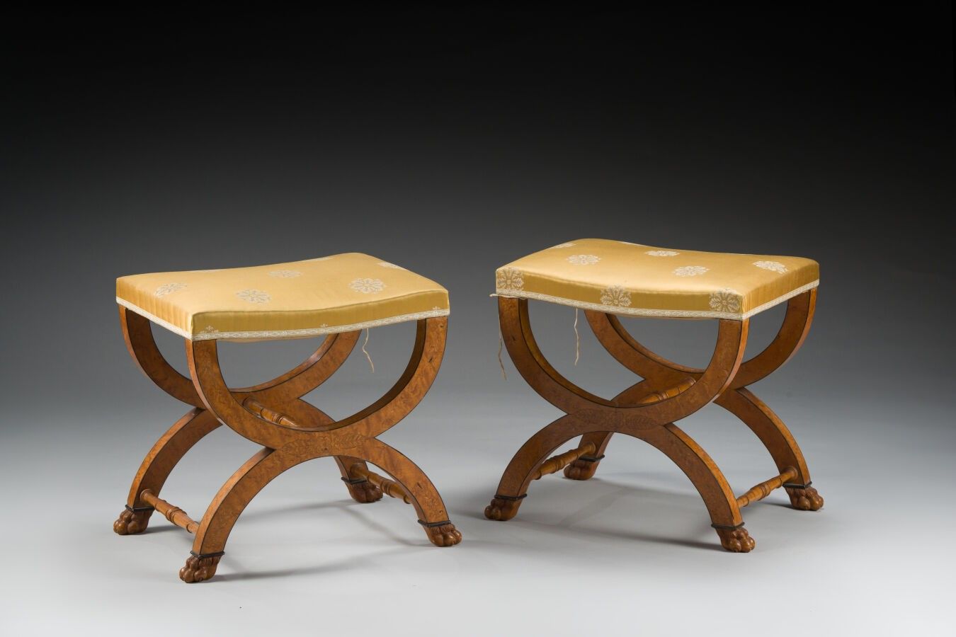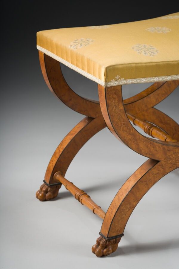 220 A pair of curved stools with inlaid decoration in light wood on a bird's eye maple base.