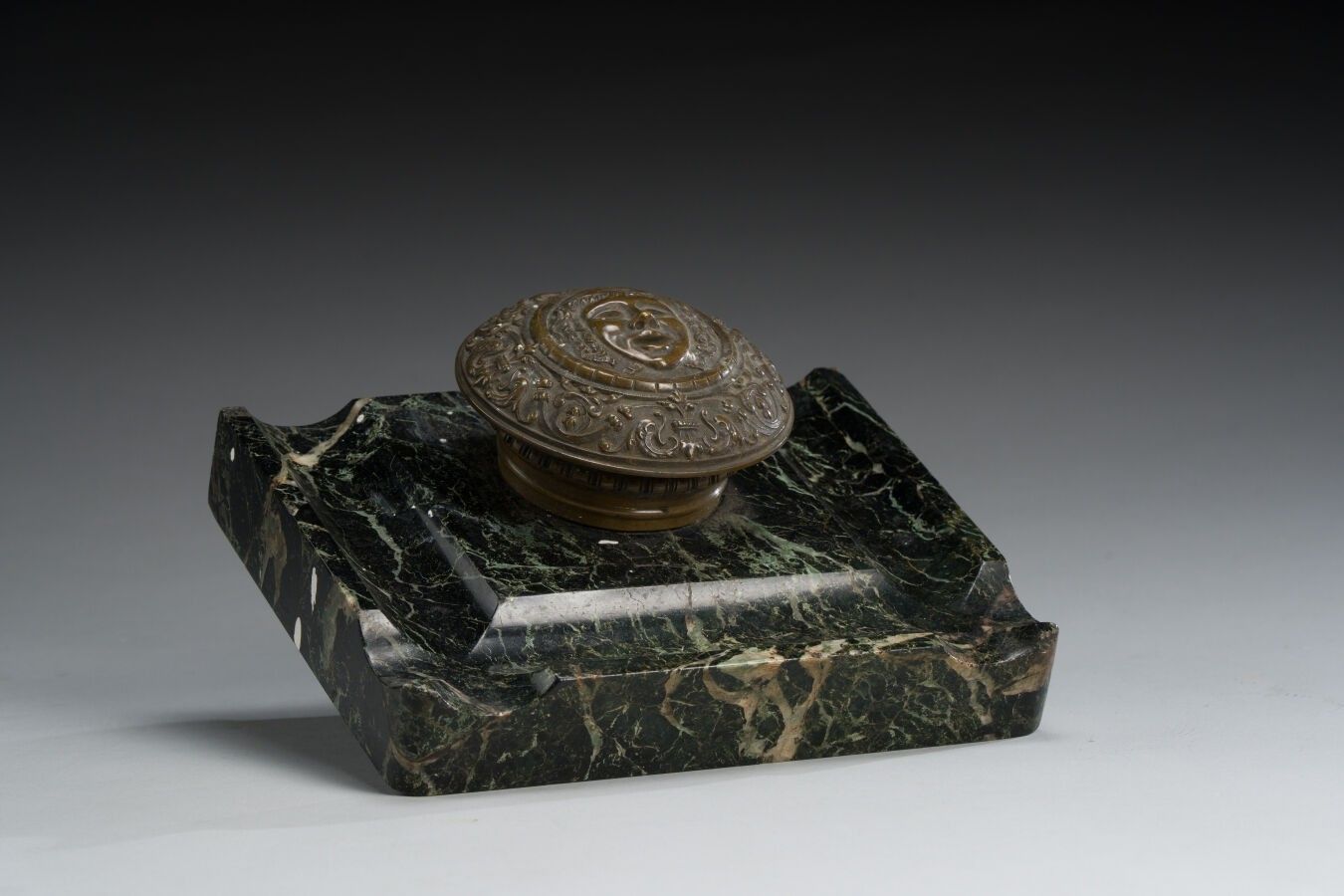233. Bronze and green marble inkwell decorated with a head and arabesque.