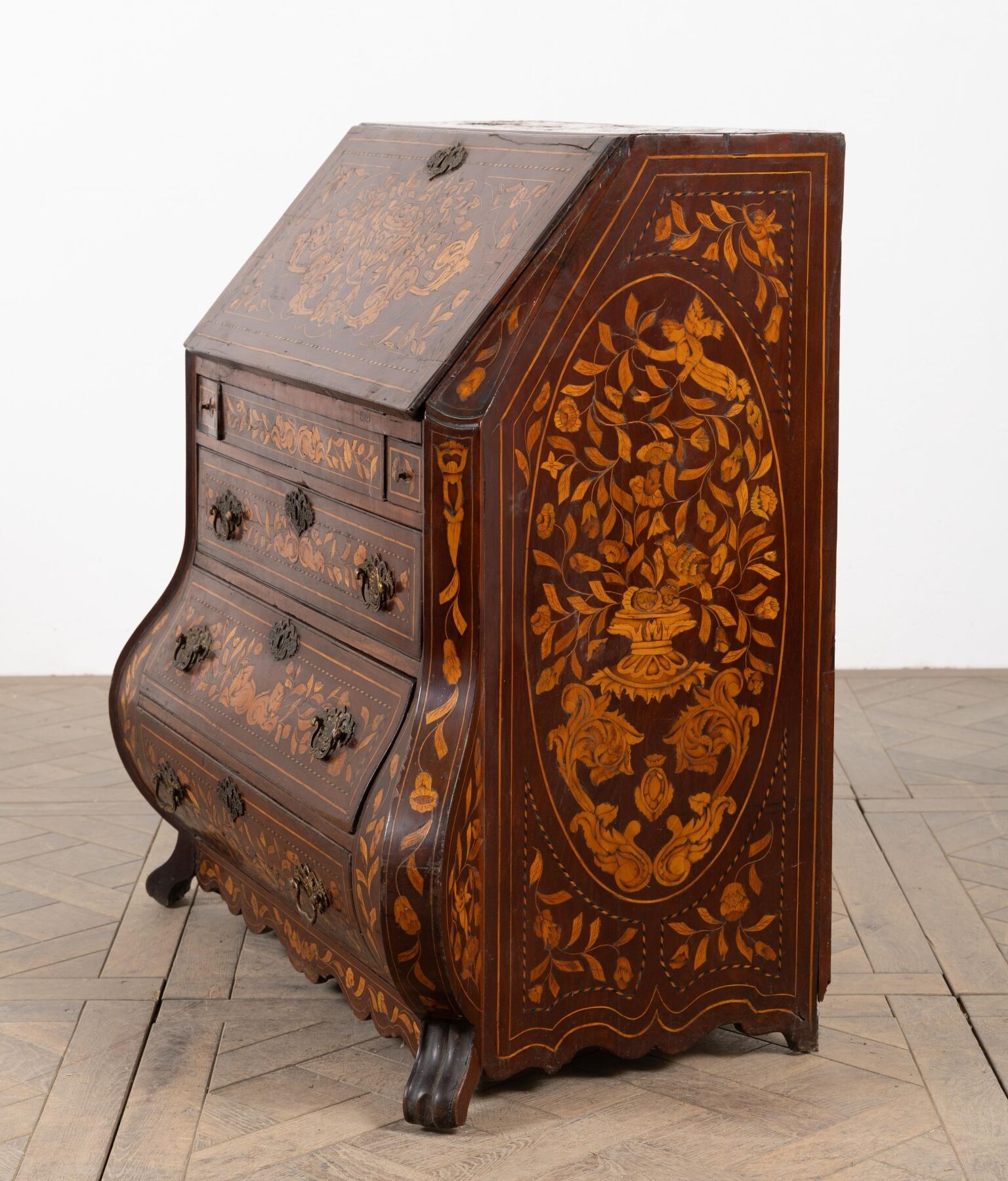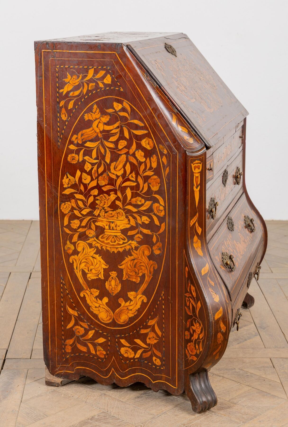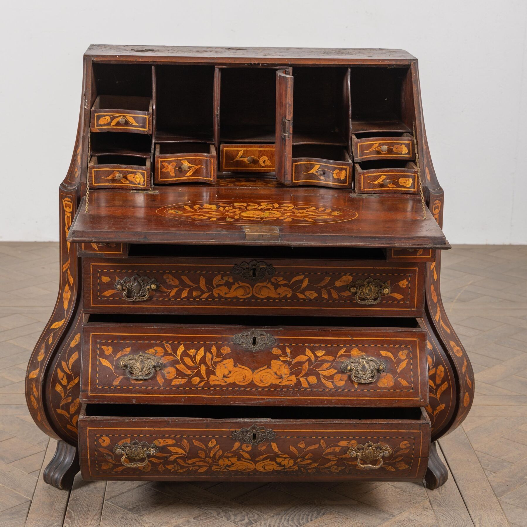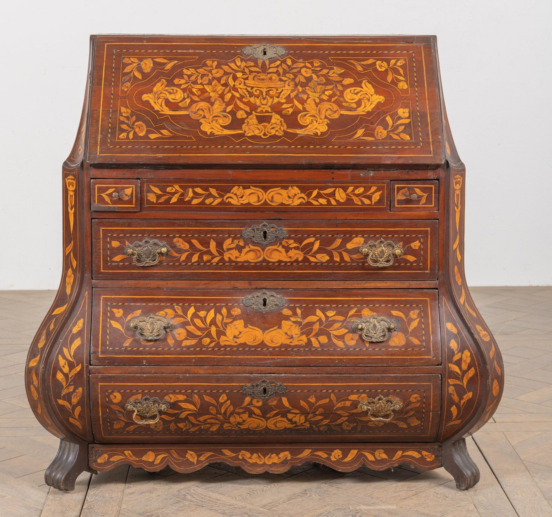 It opens with a flap revealing compartments and drawers and three lower drawers.
