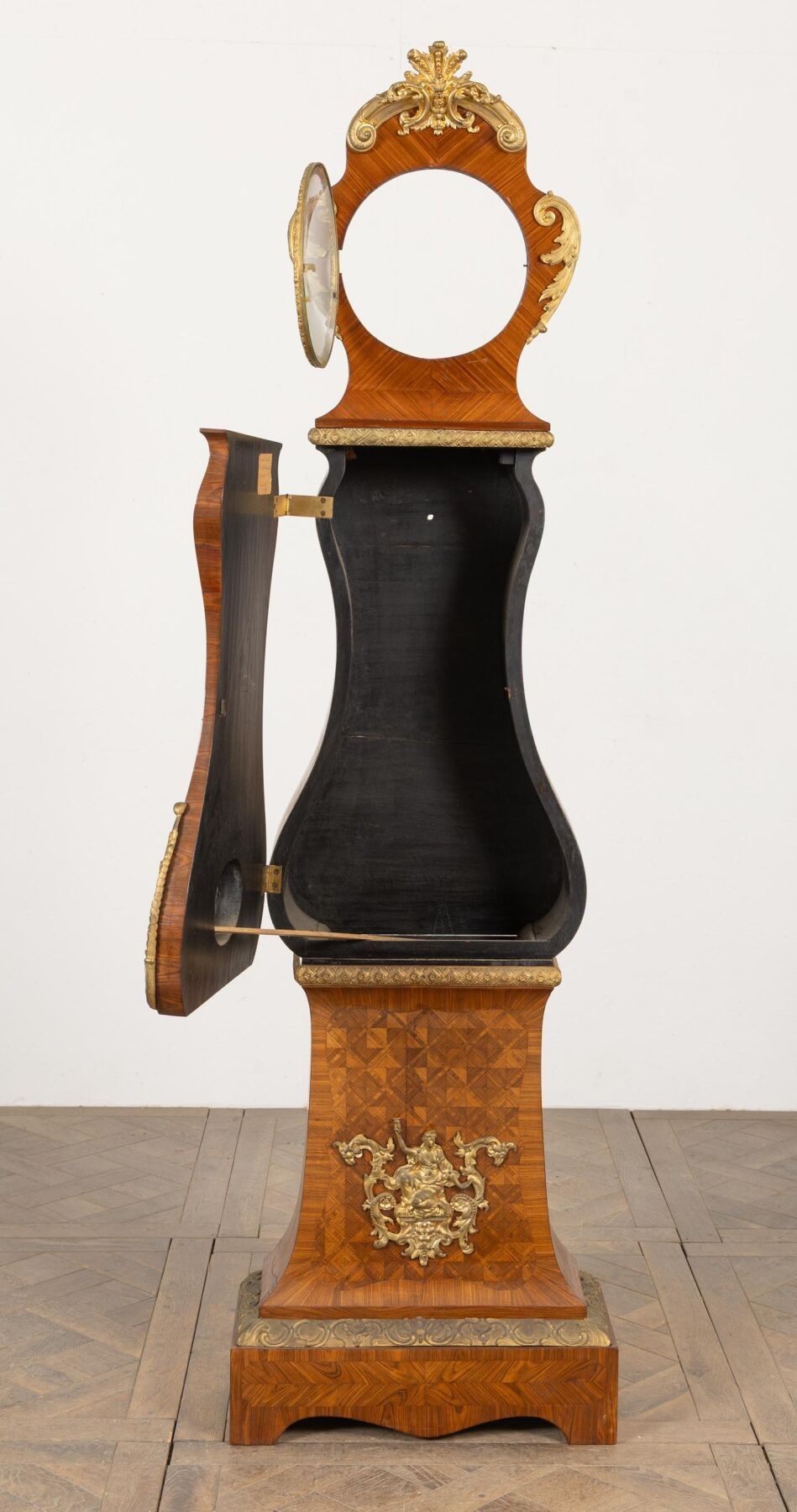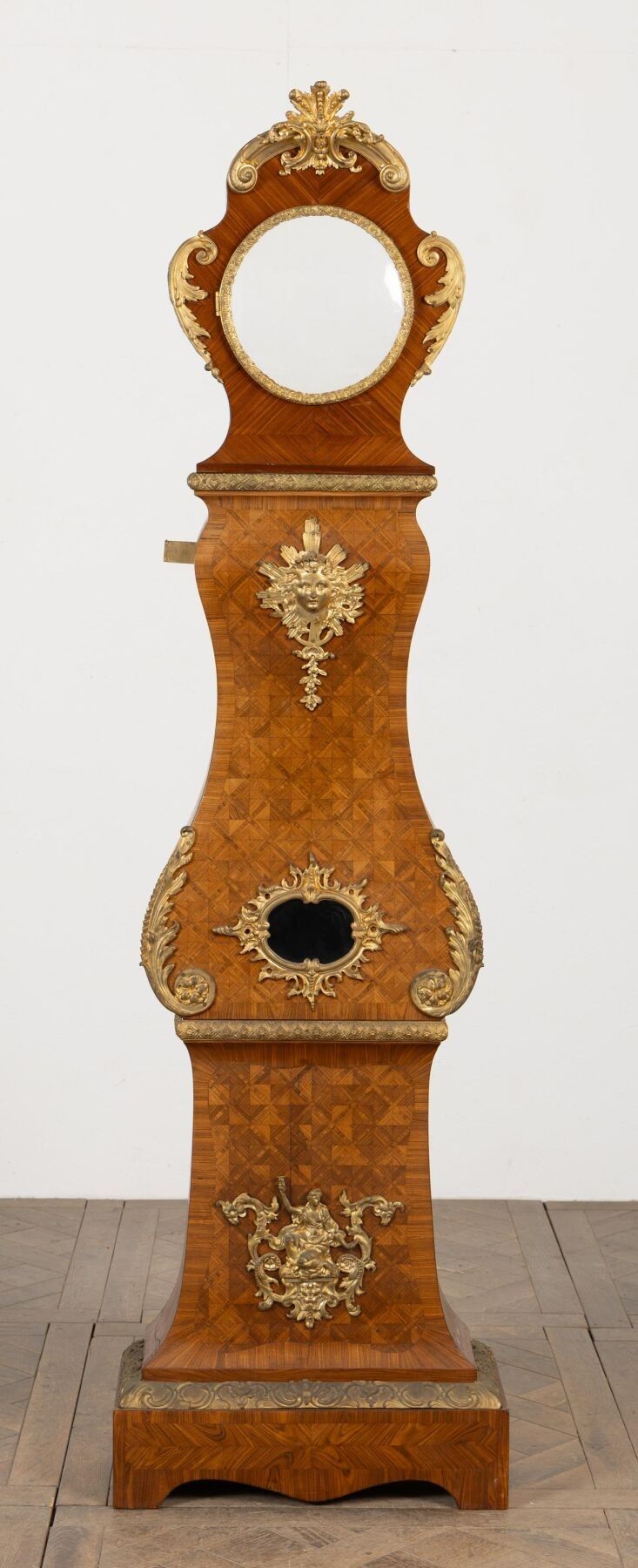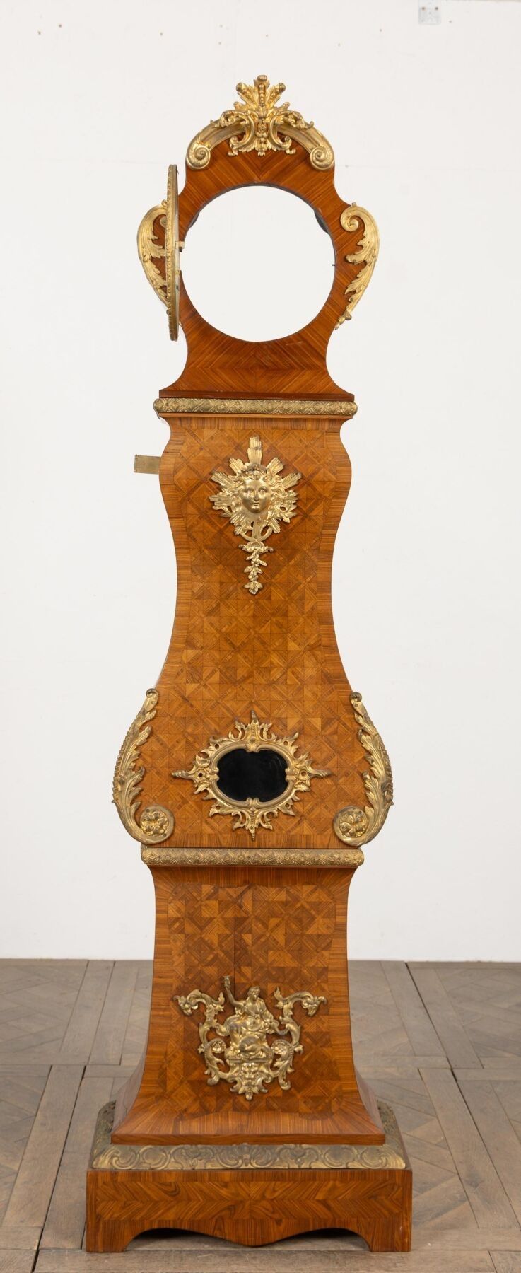 Rosewood marquetry and ormolu regulator case decorated with a radiating mascaron and acanthus leaves.