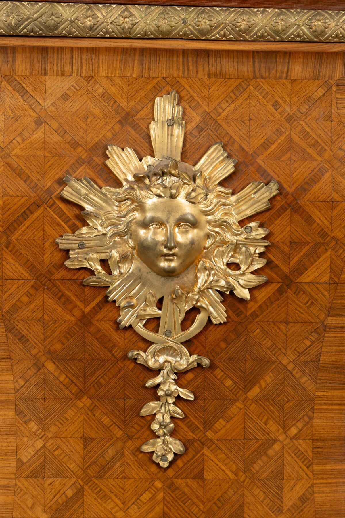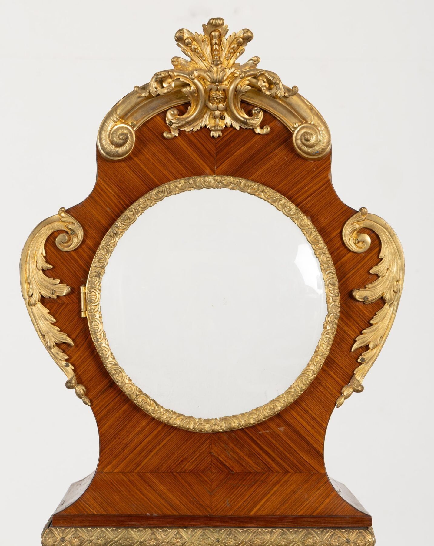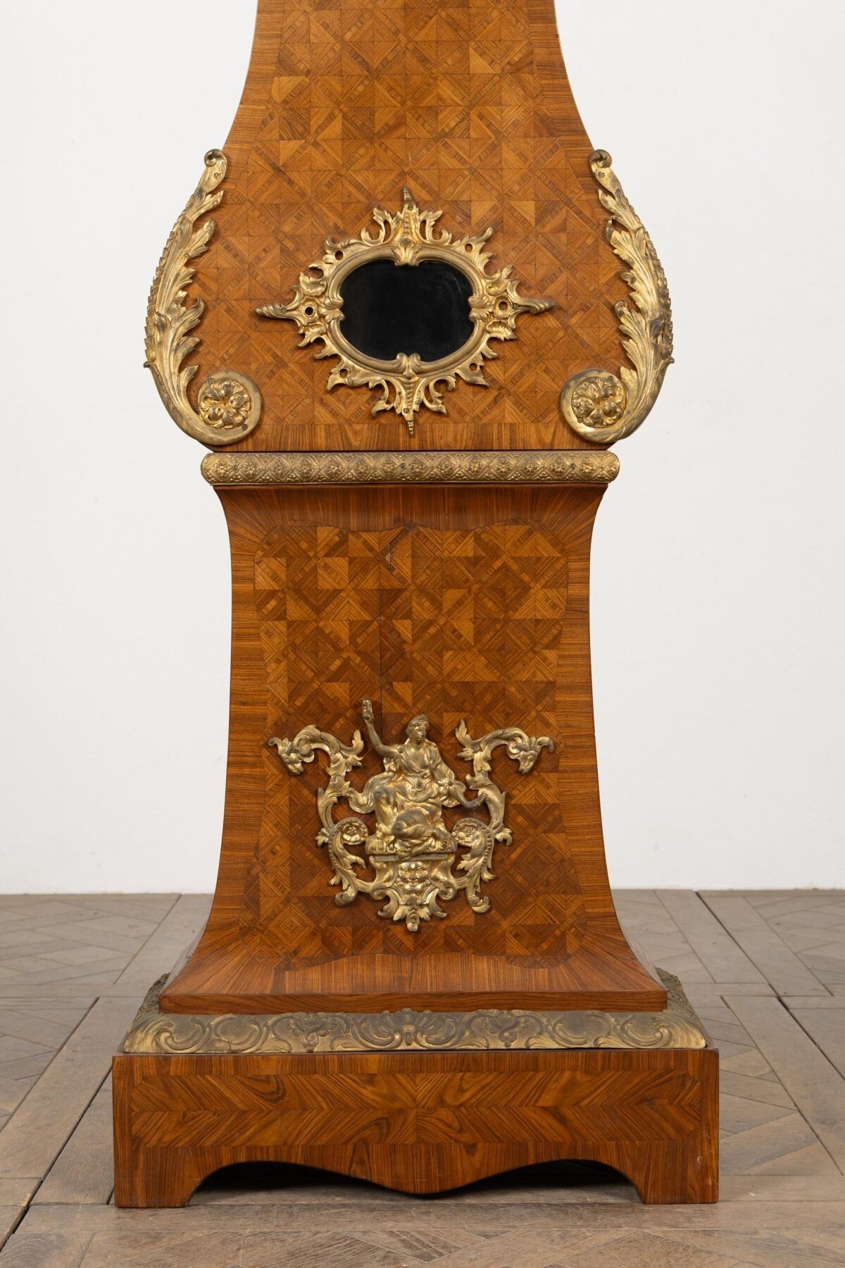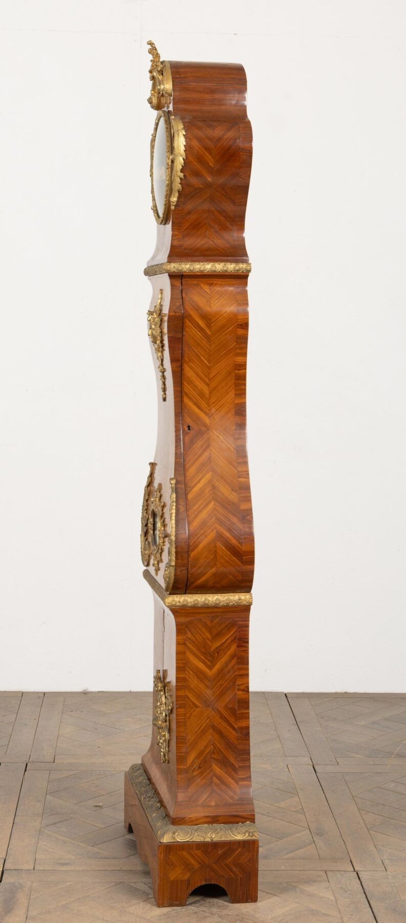 Rosewood marquetry and ormolu regulator case decorated with a radiating mascaron and acanthus leaves.