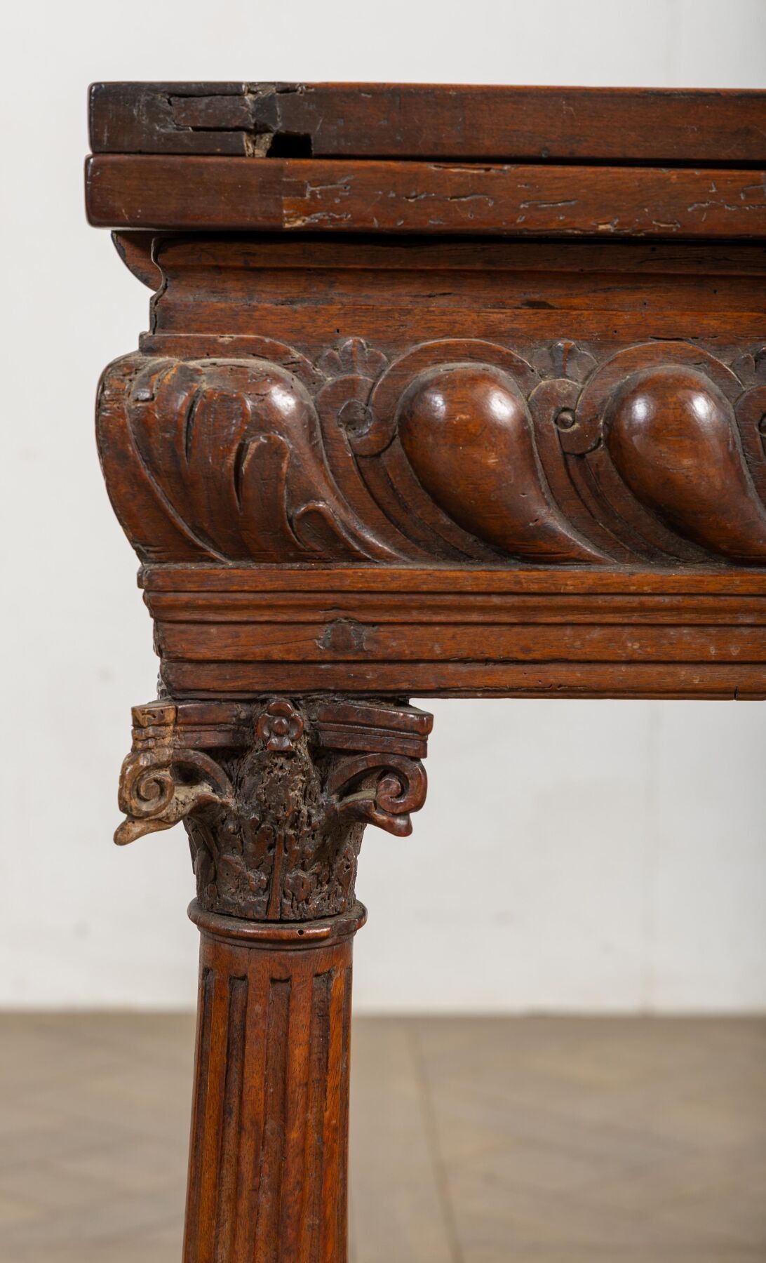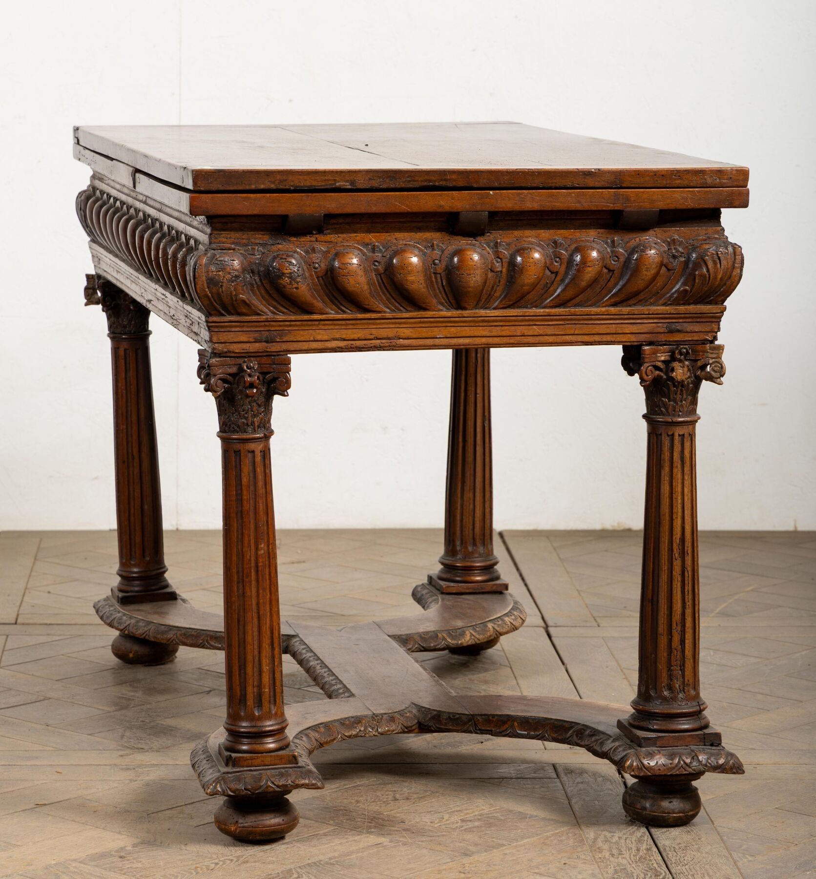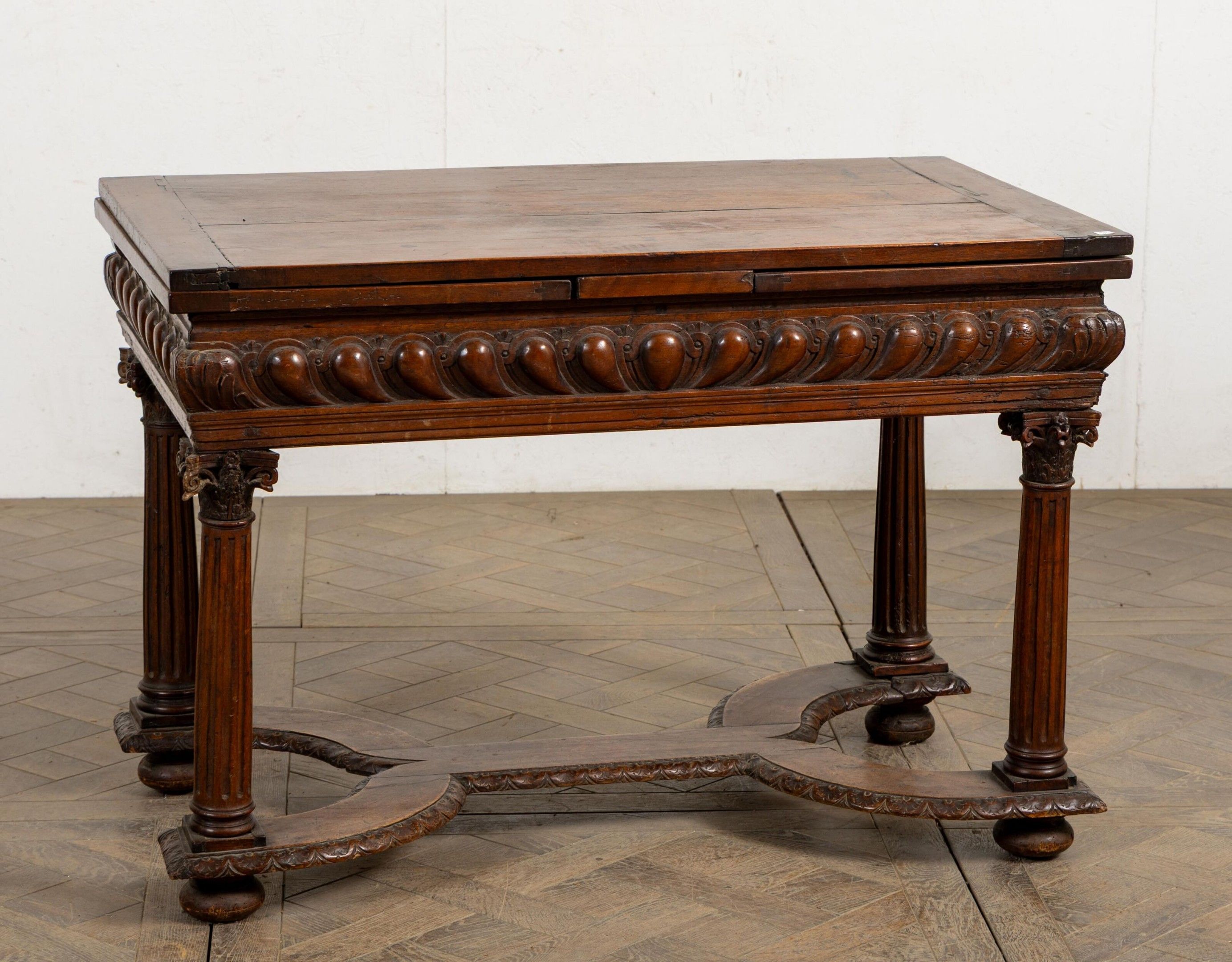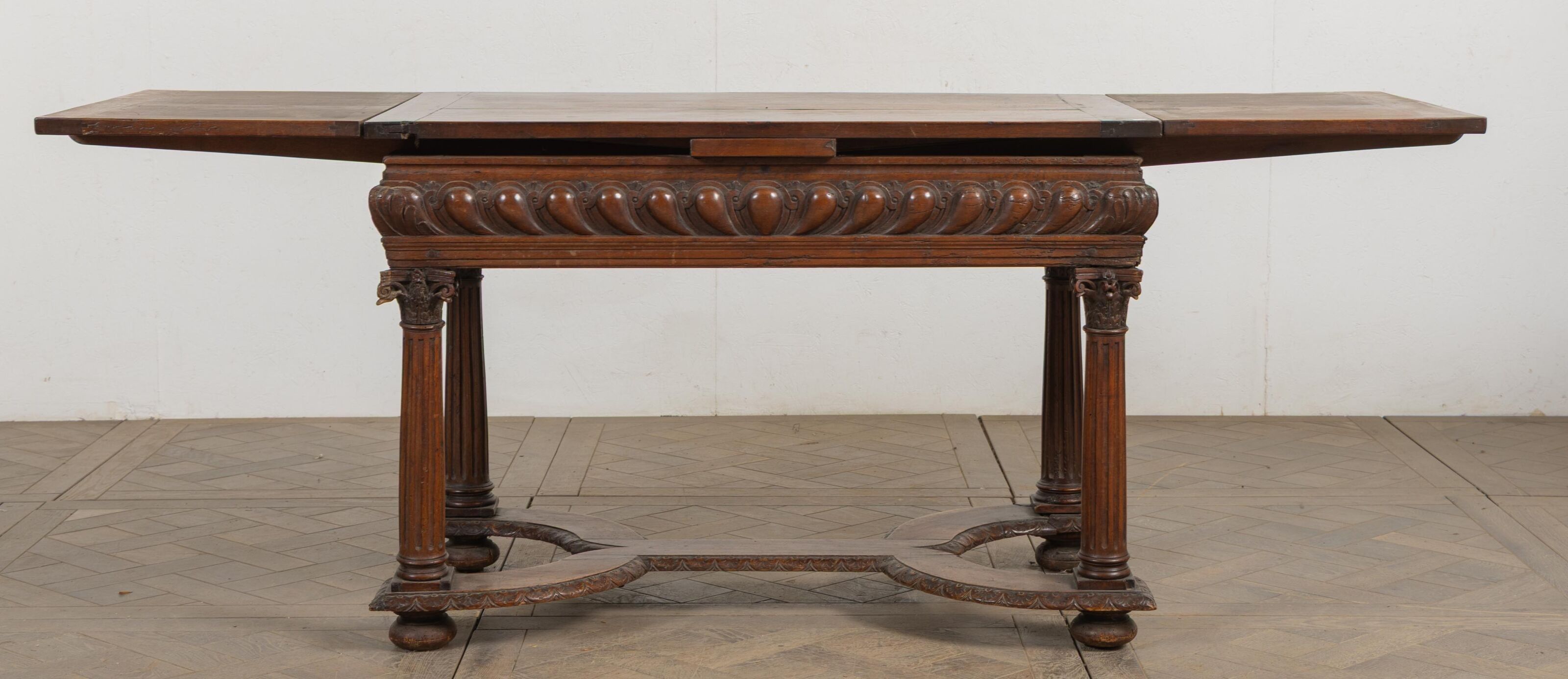 A moulded and carved walnut Italian-style extending table with colonnaded uprights linked by a brace.