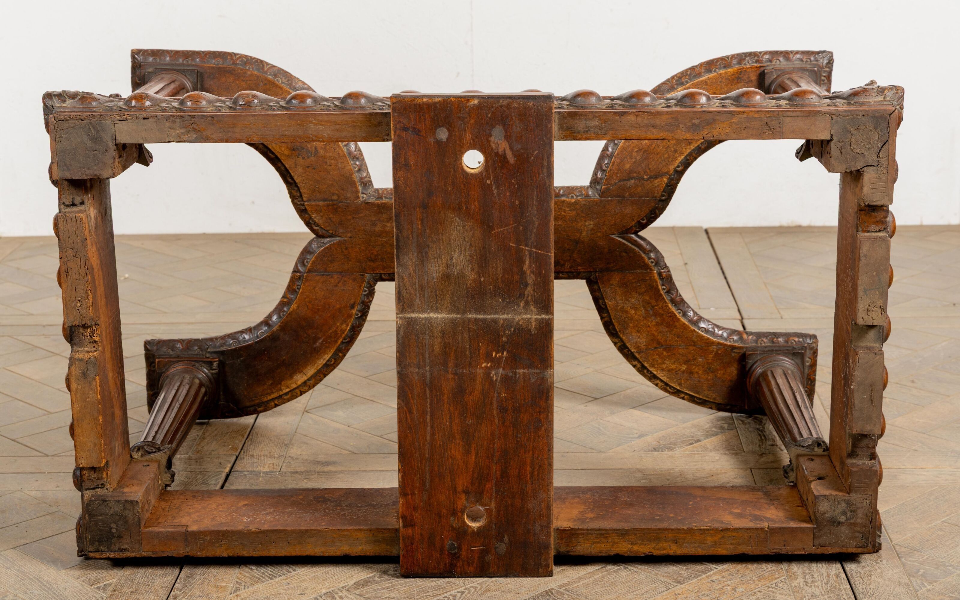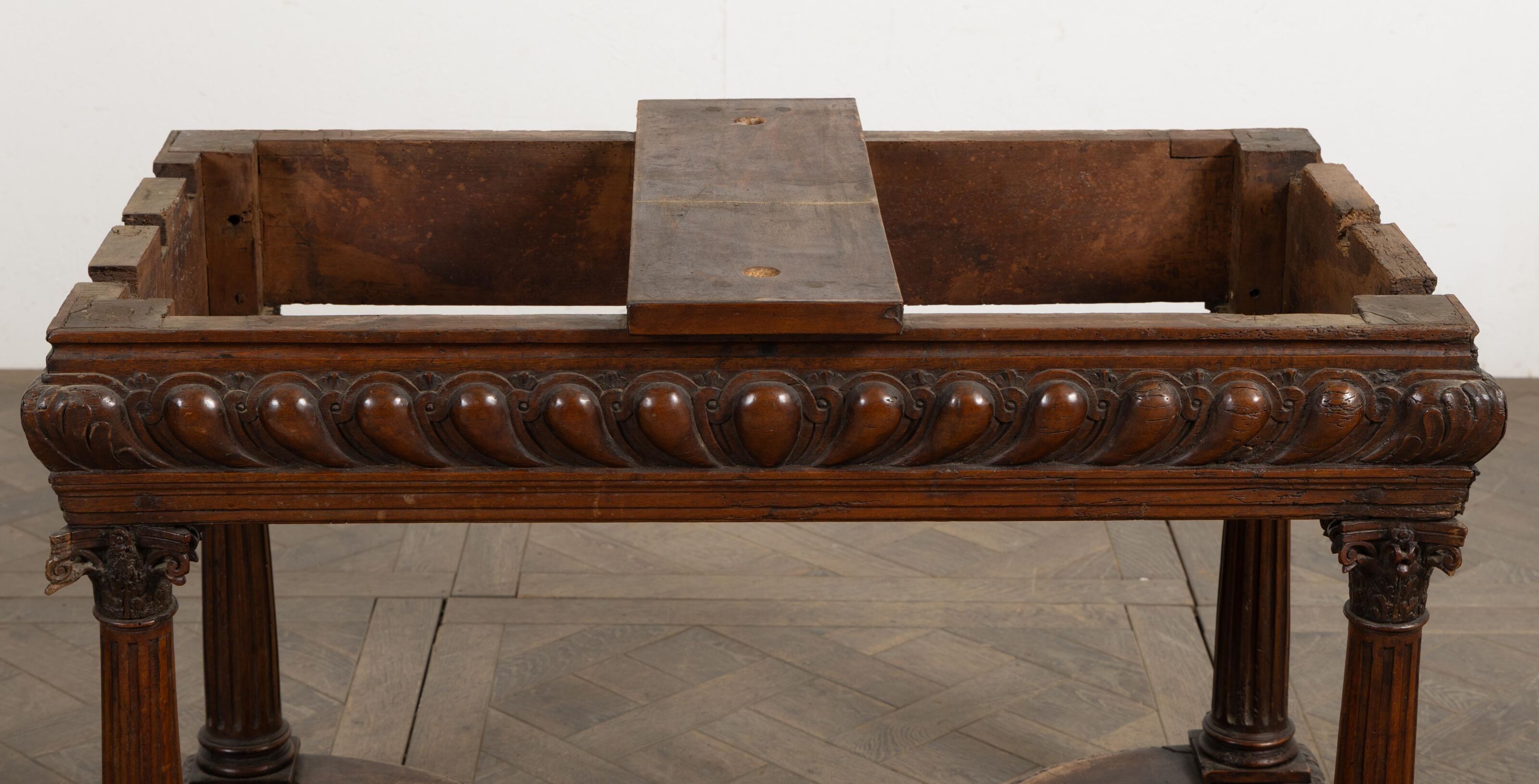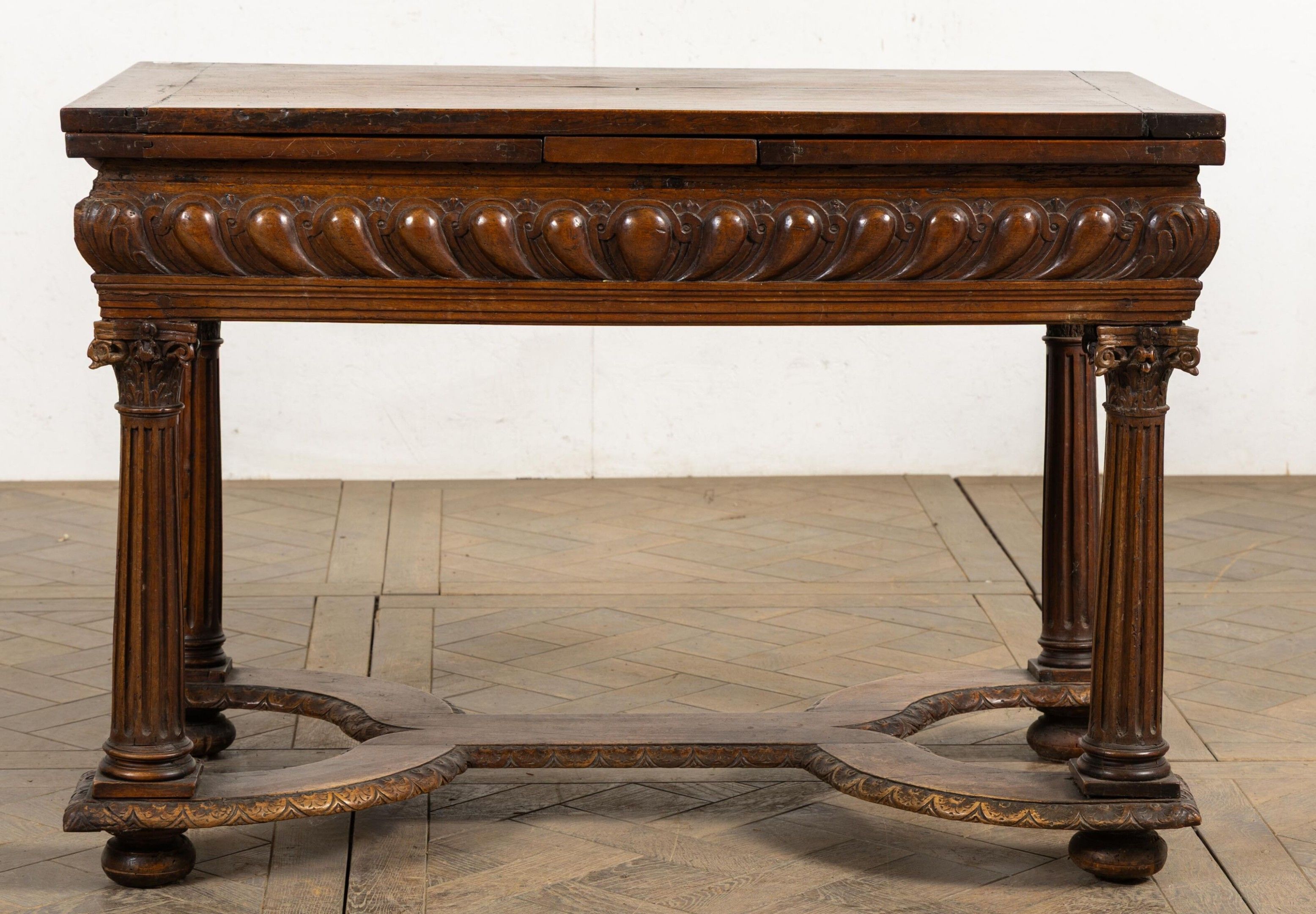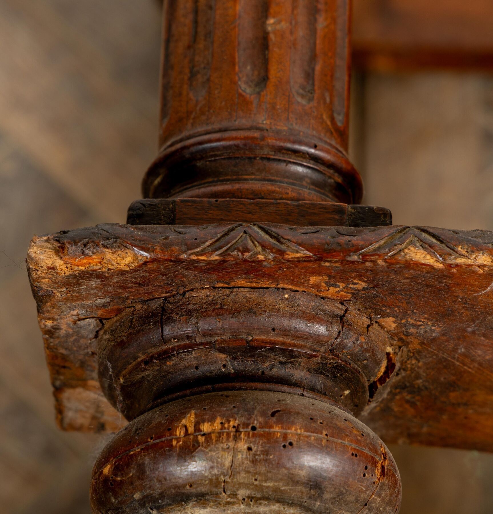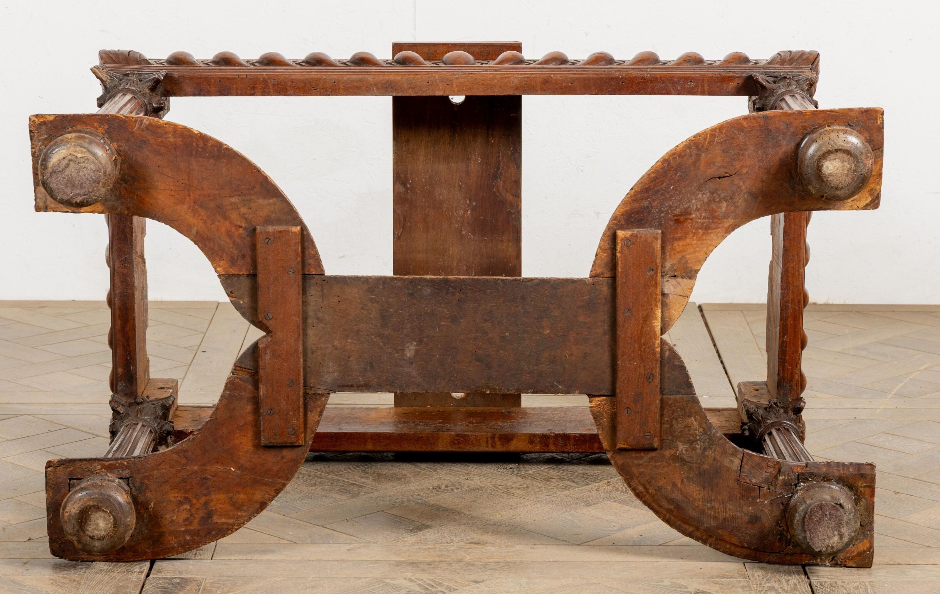 A moulded and carved walnut Italian-style extending table with colonnaded uprights linked by a brace.