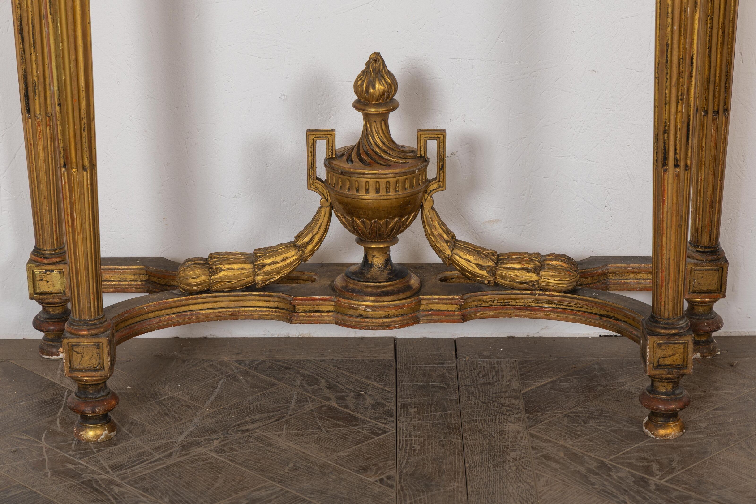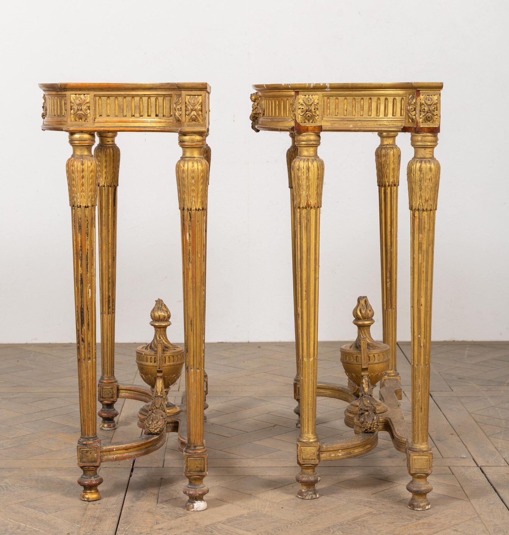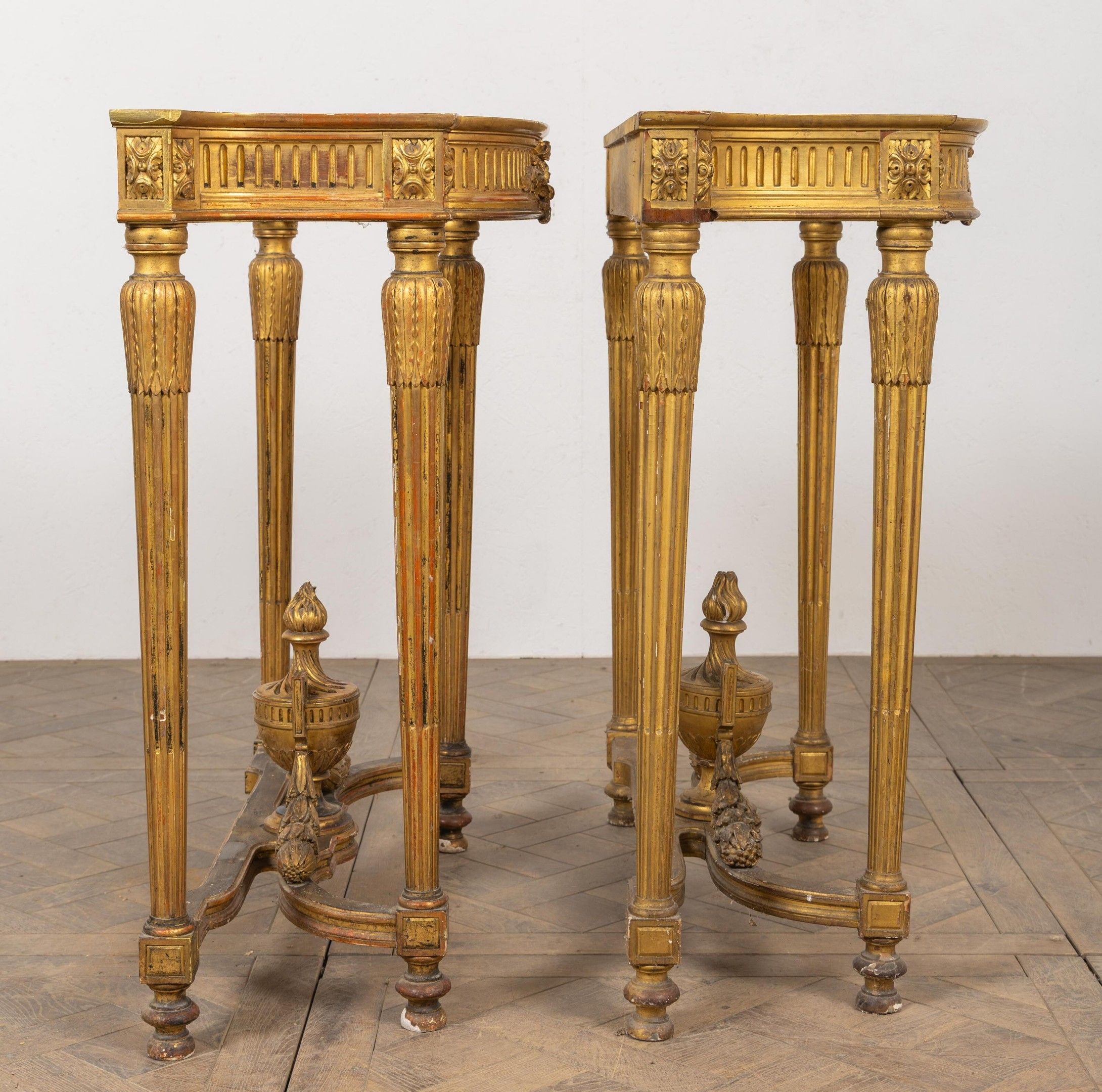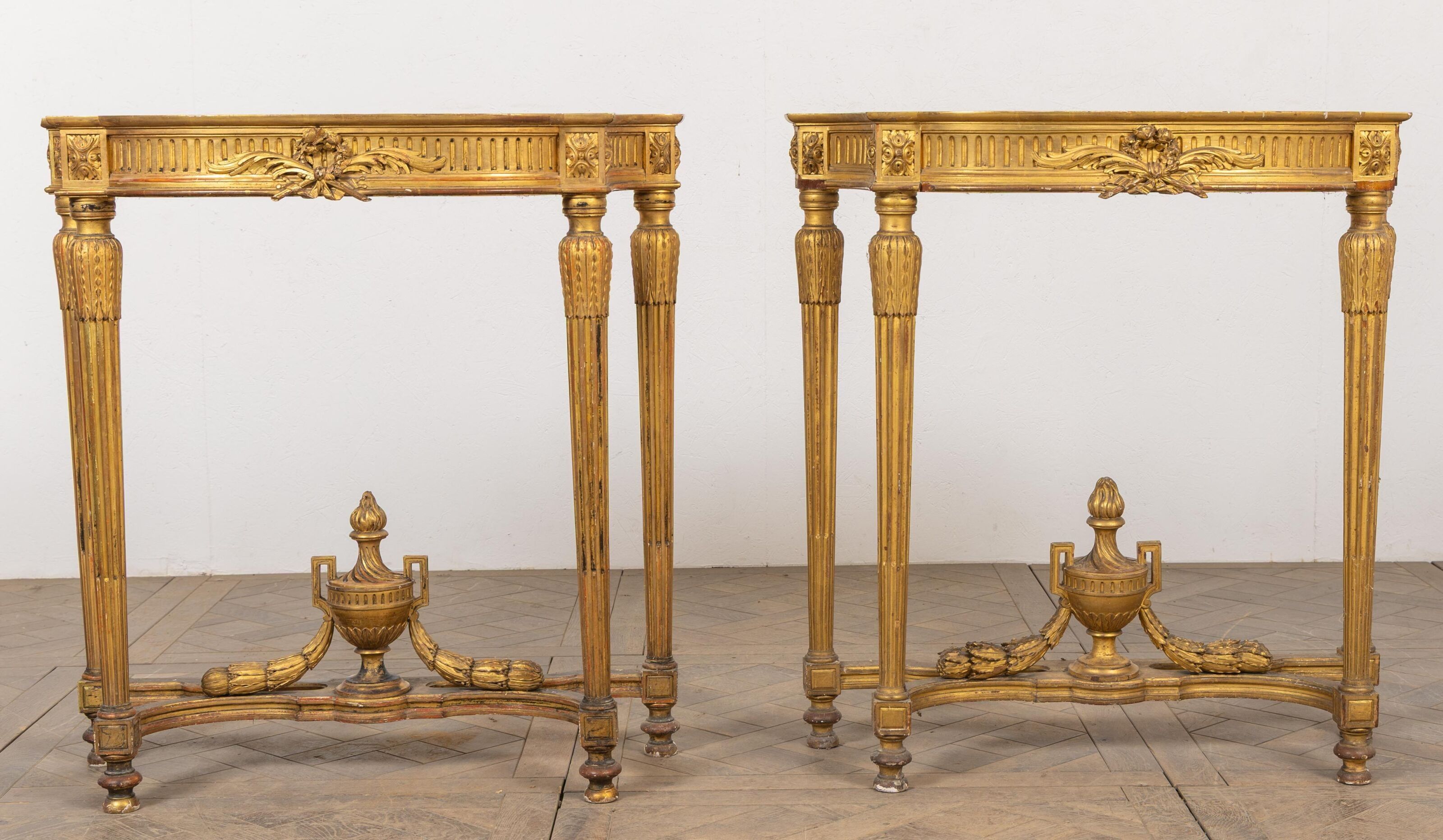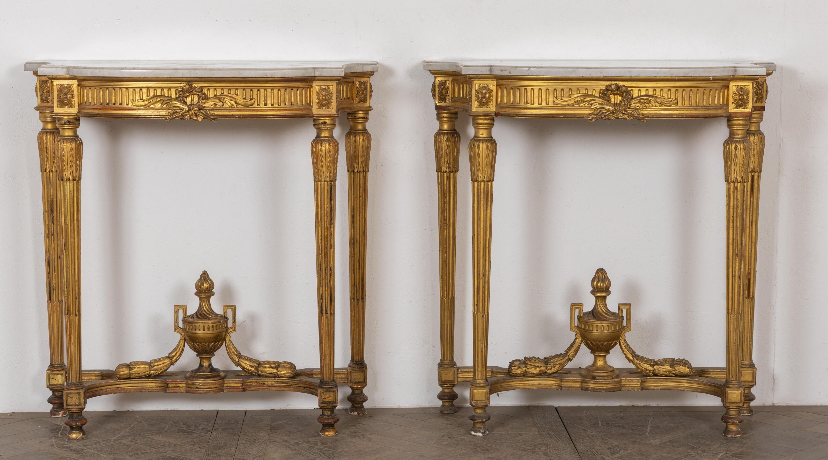 Pair of carved and gilded wood consoles, the fluted legs linked by a brace surmounted by a vase with Greek handles, from which emanate garlands of laurels.