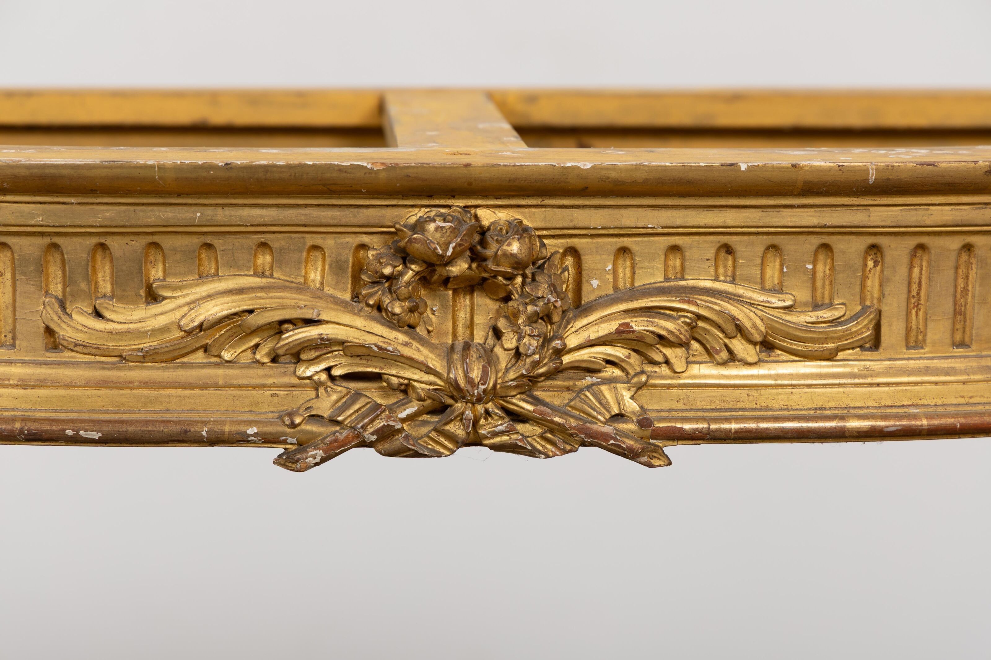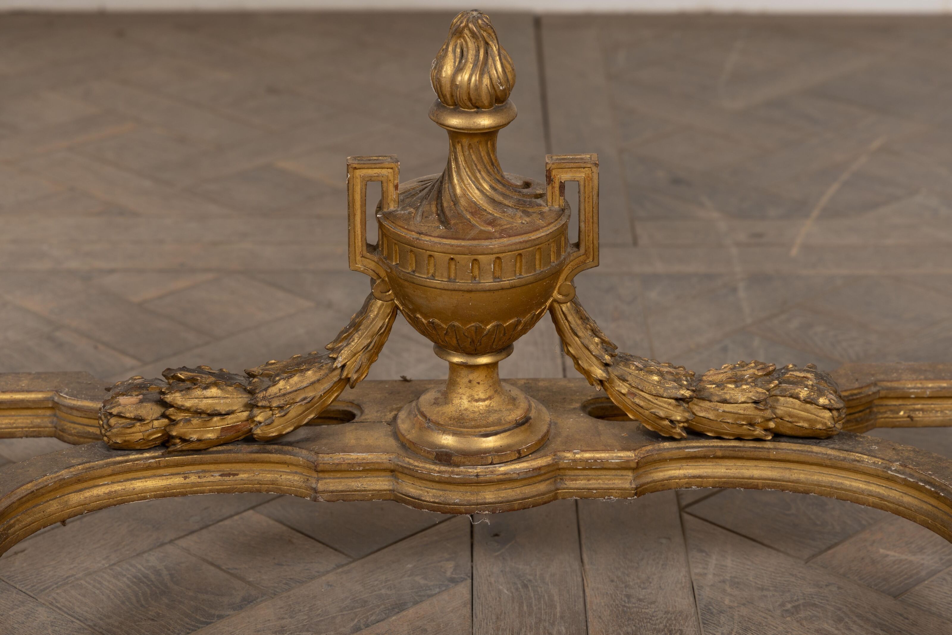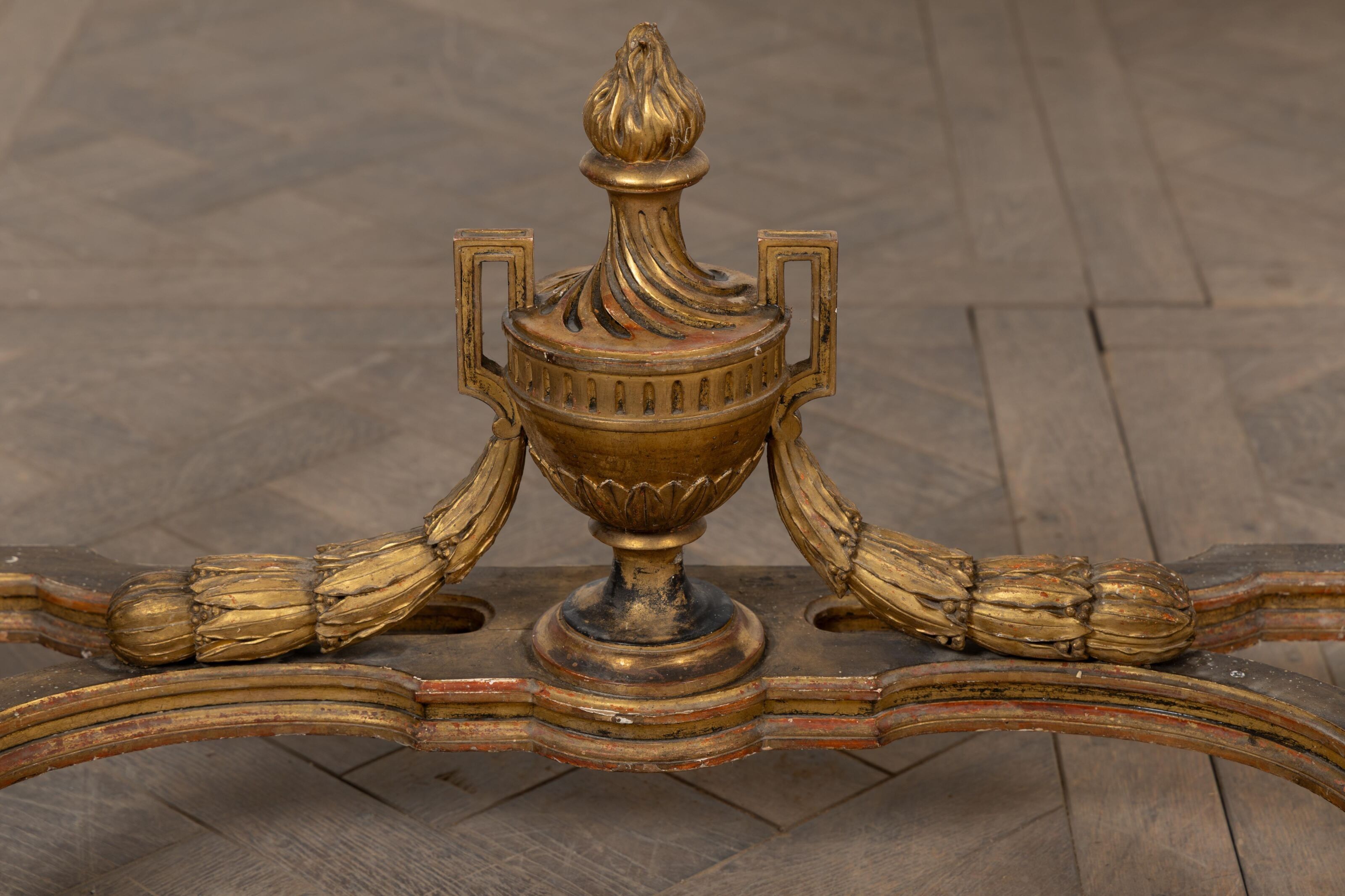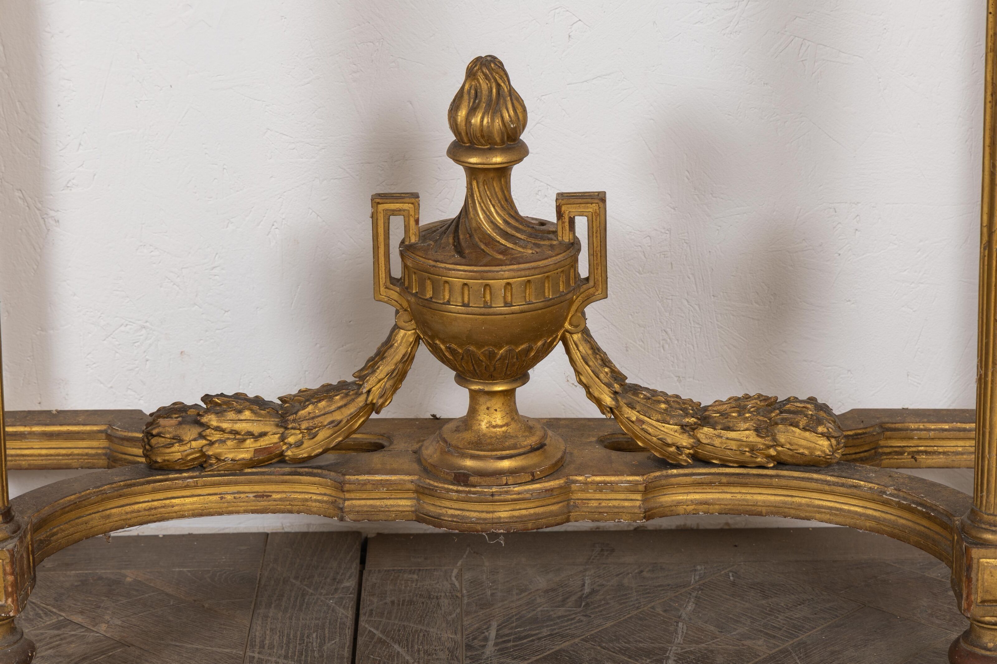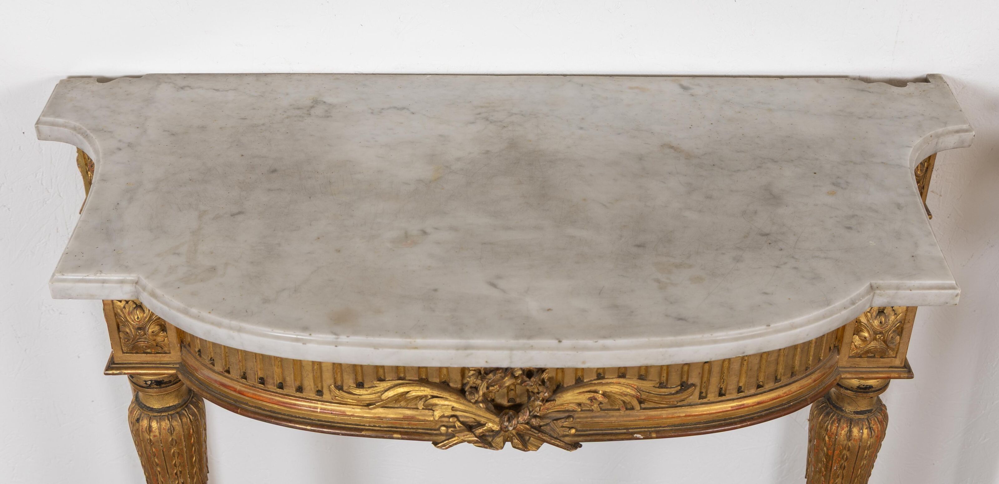 Pair of carved and gilded wood consoles, the fluted legs linked by a brace surmounted by a vase with Greek handles, from which emanate garlands of laurels.