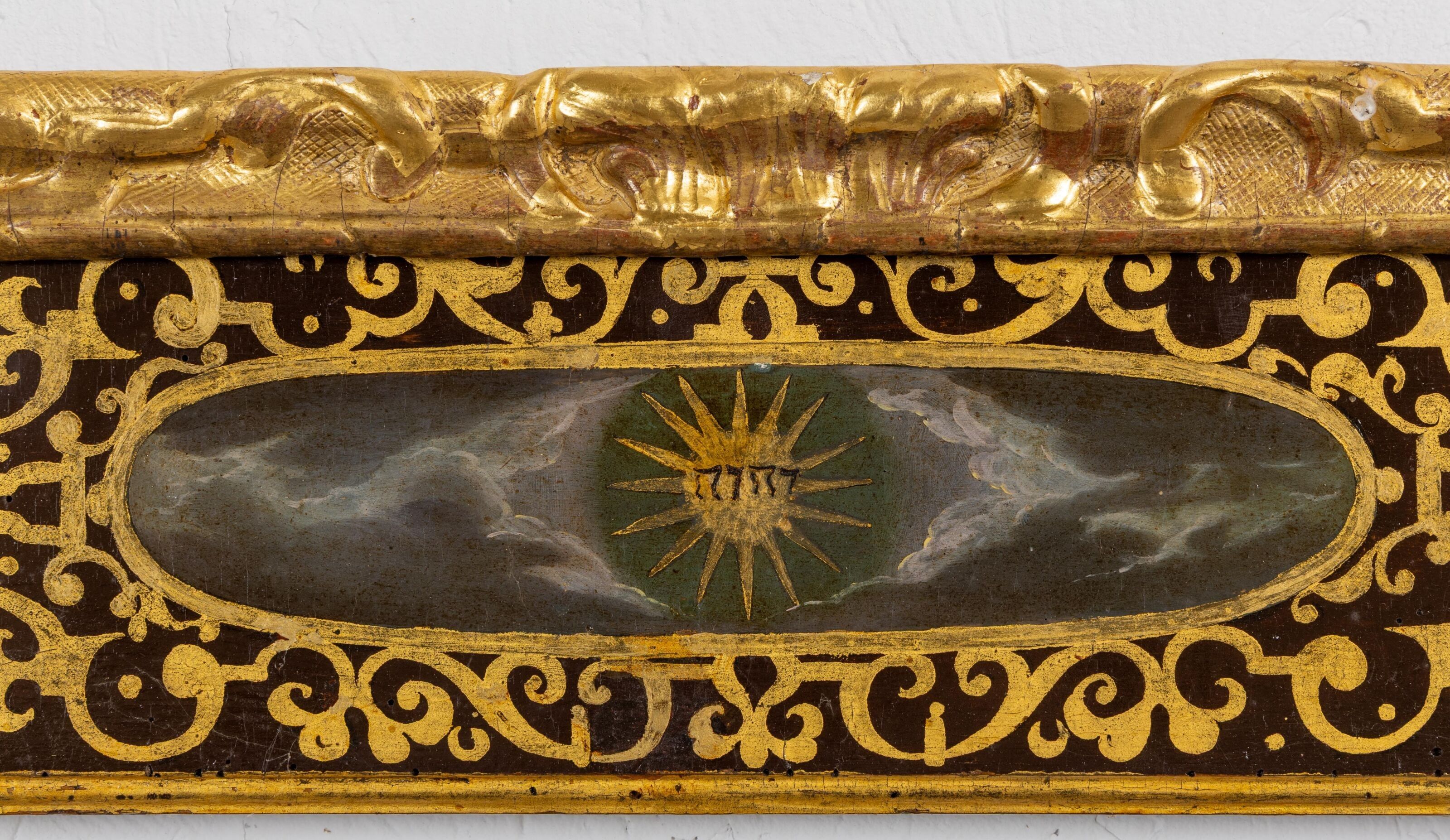 Carved and gilded wood moulding around the edge.