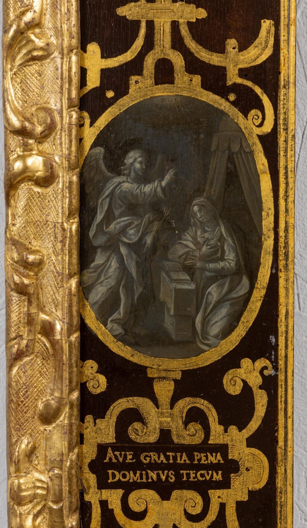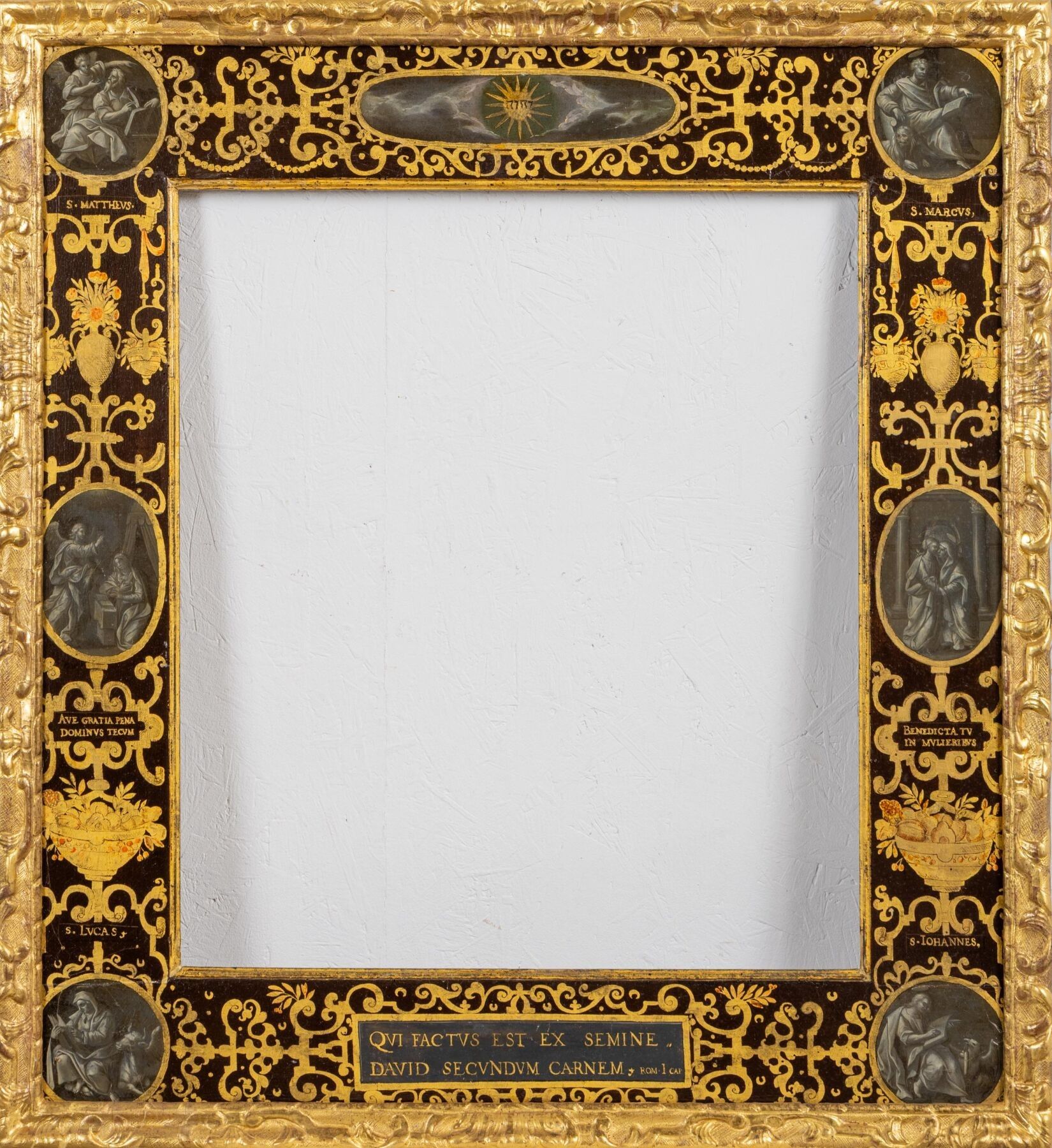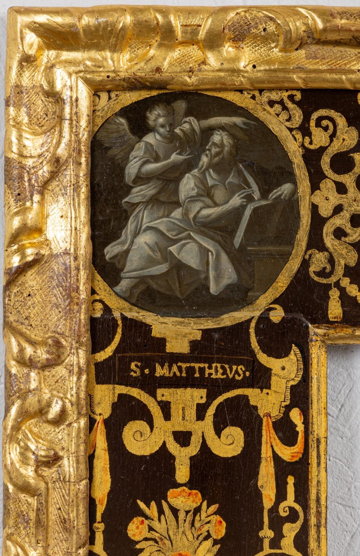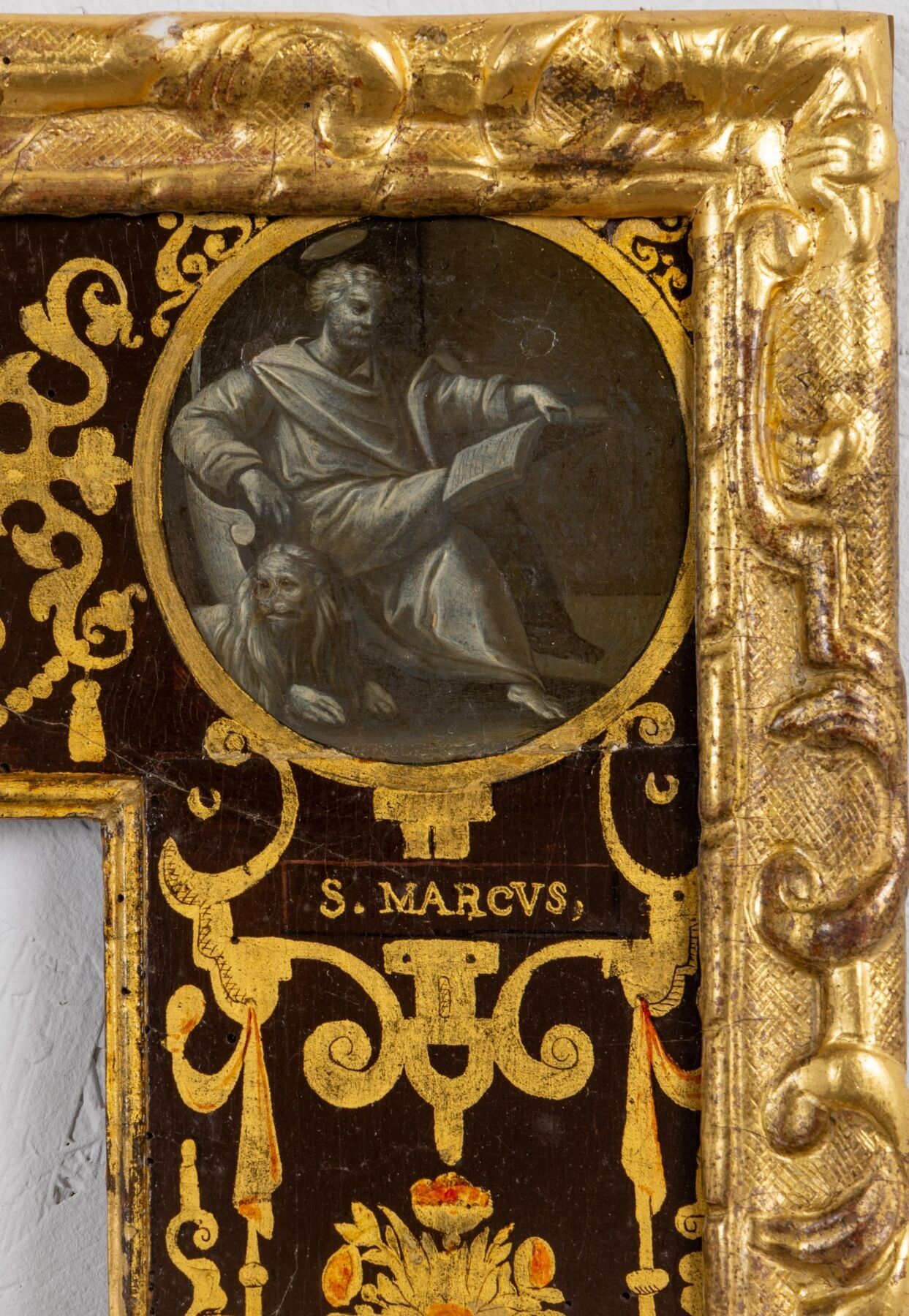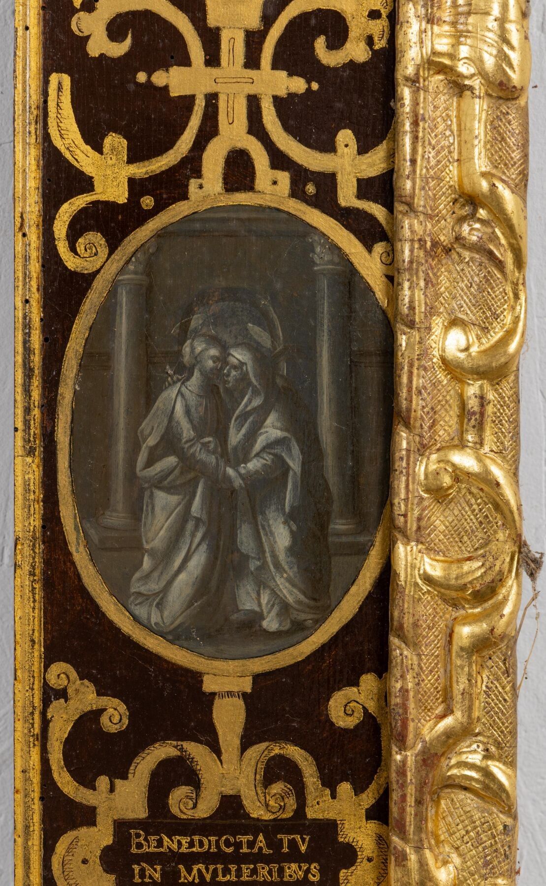 Painted flat profile wooden frame with grey monochrome decoration of the four Evangelists in the corners, the Annunciation and the Visitation on the sides.