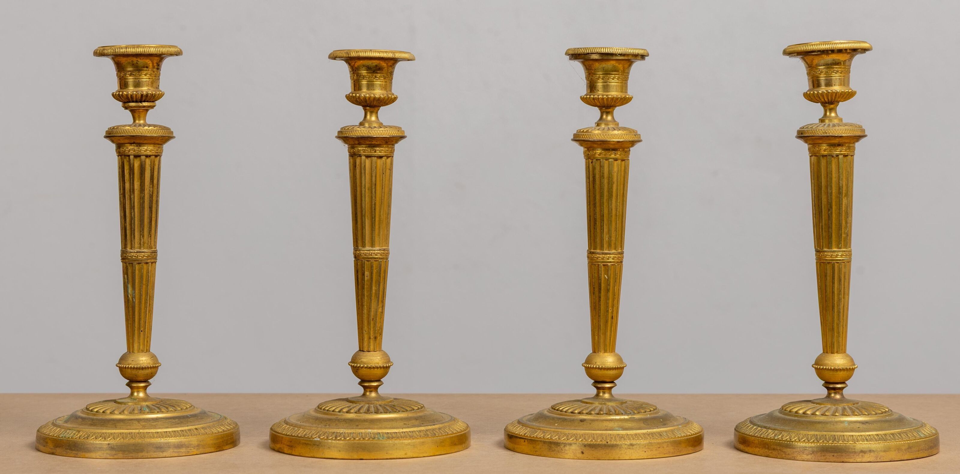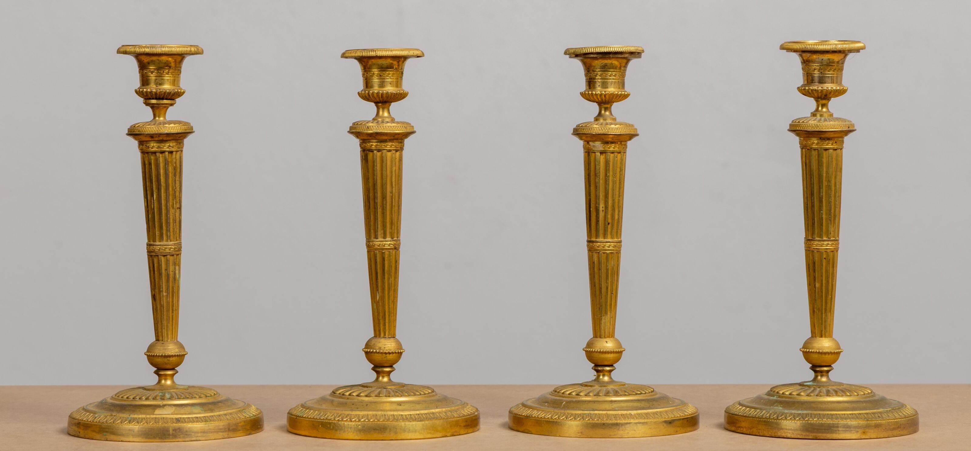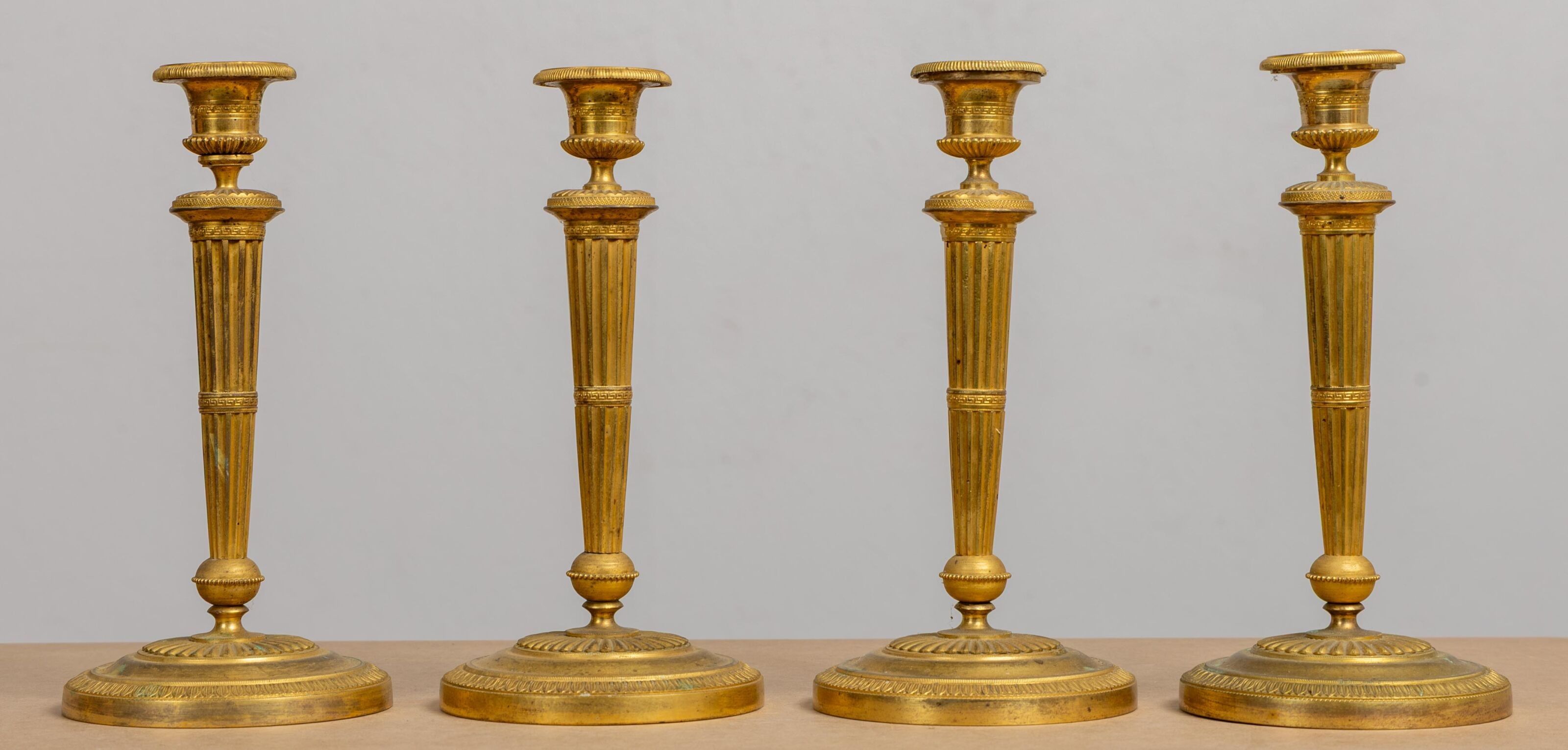 A suite of four ormolu candlesticks, the shafts fluted and a…