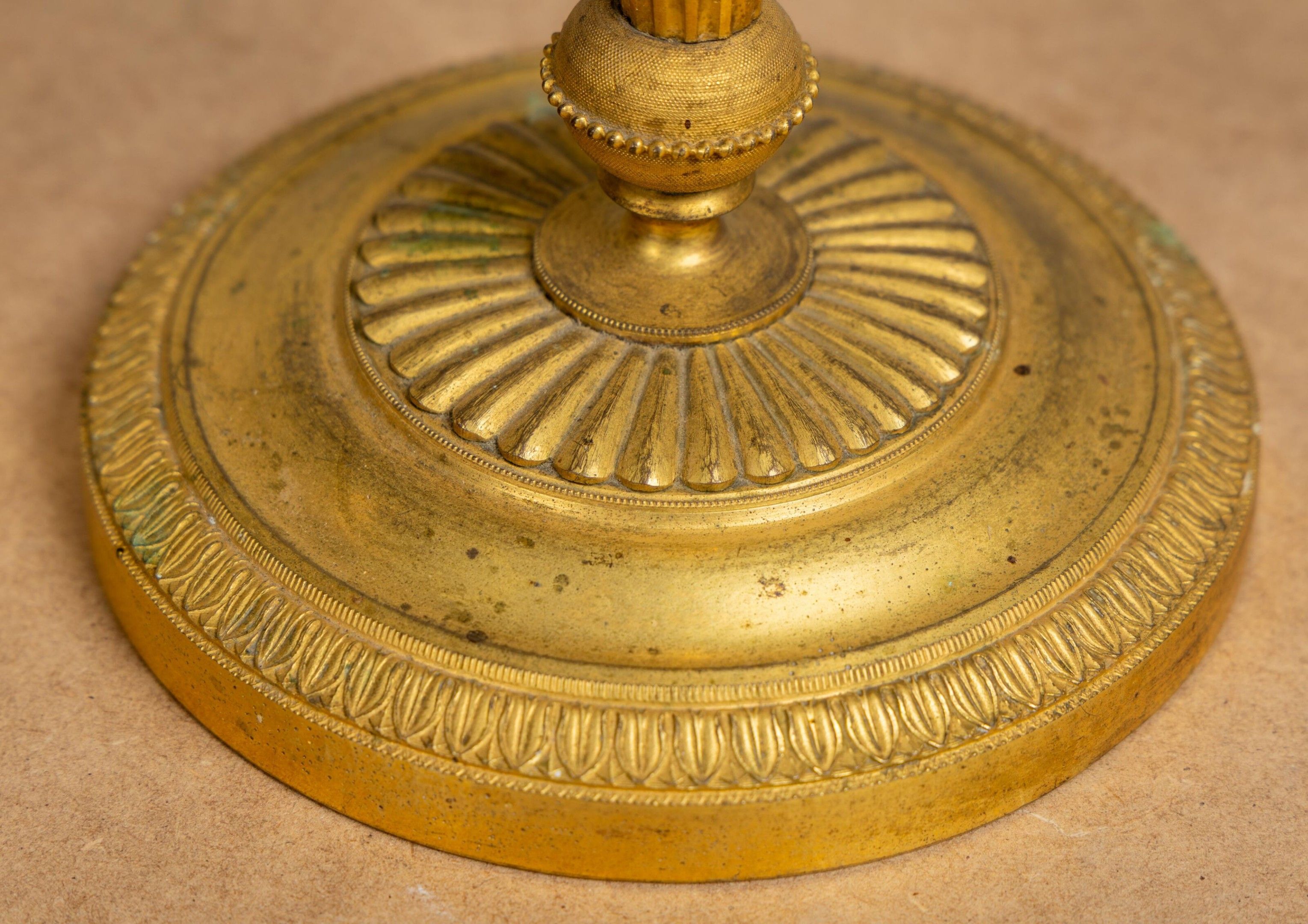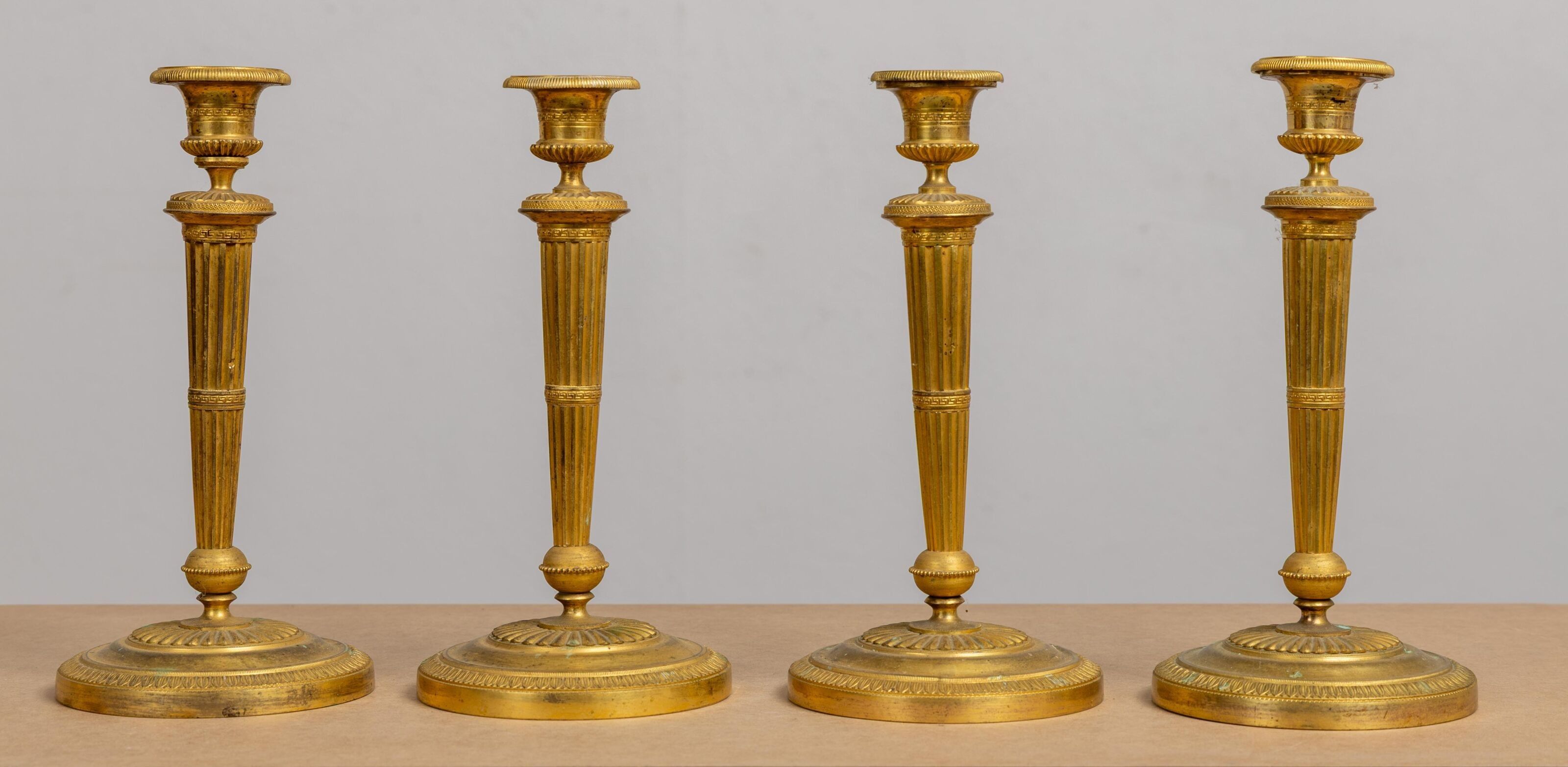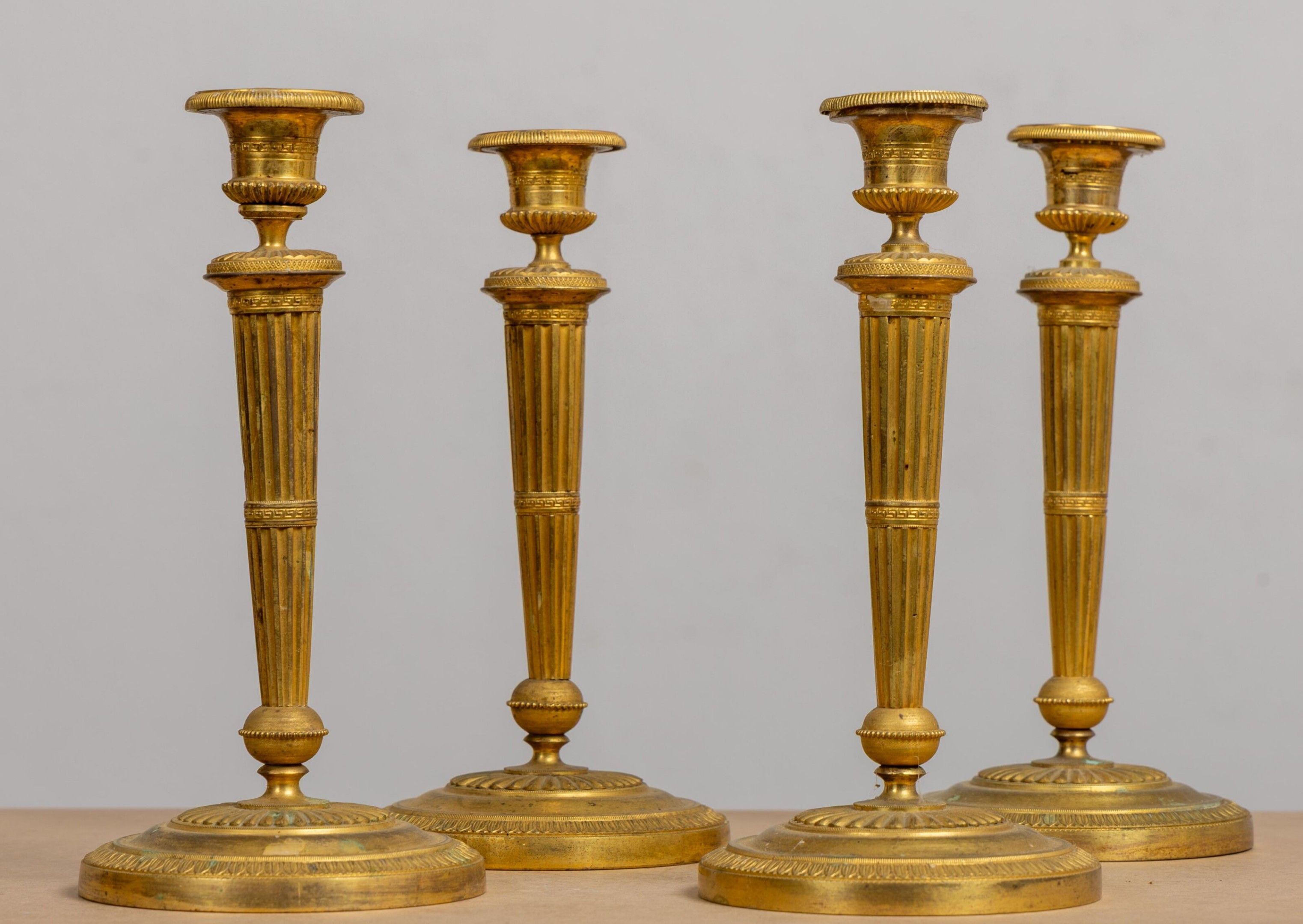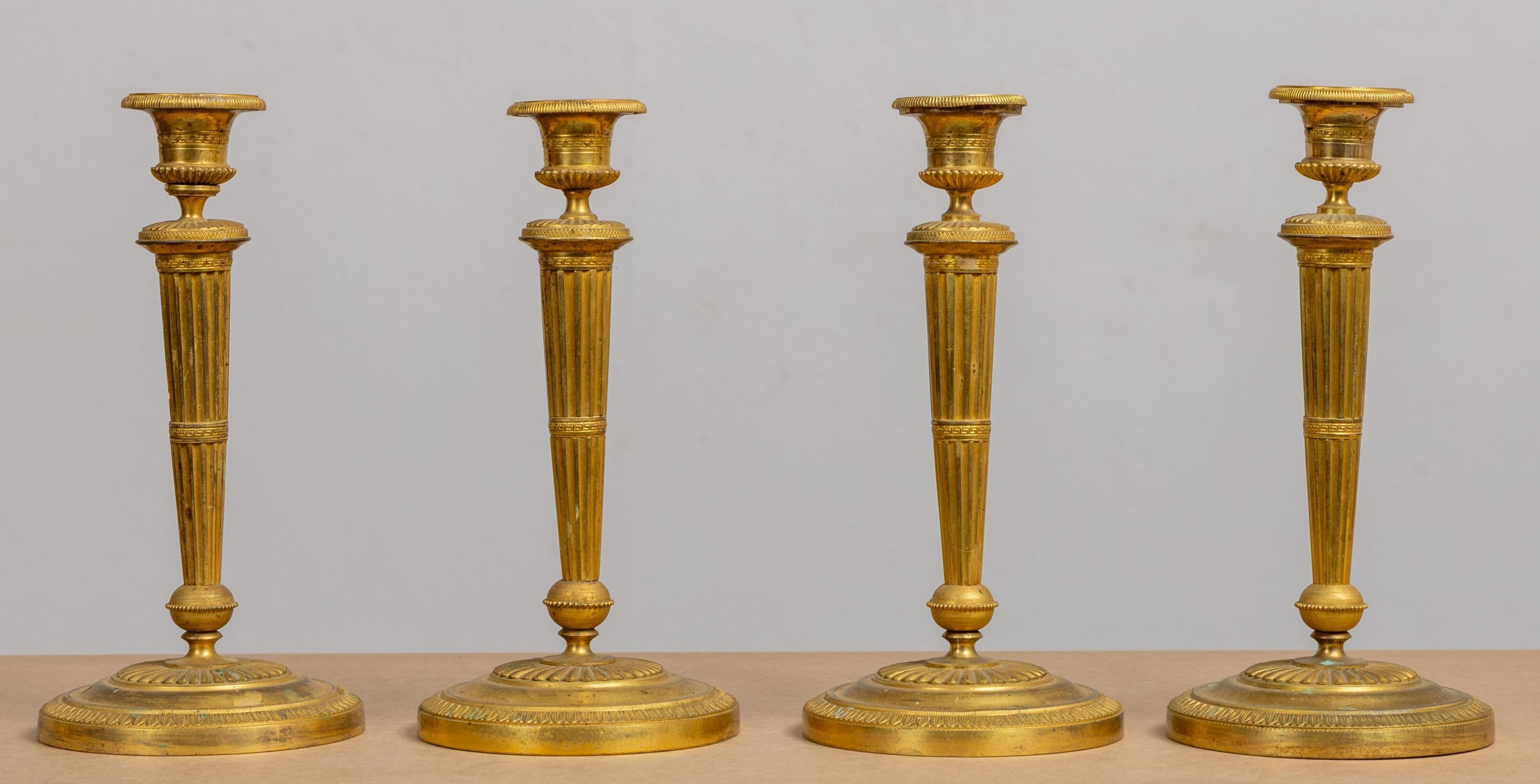 A suite of four ormolu candlesticks, the shafts fluted and a…