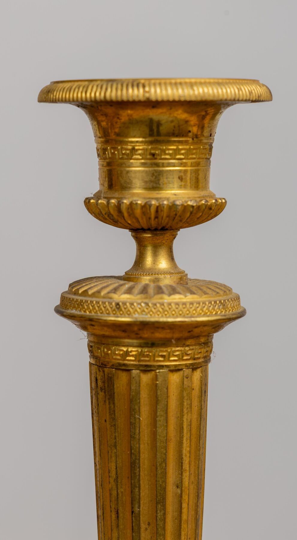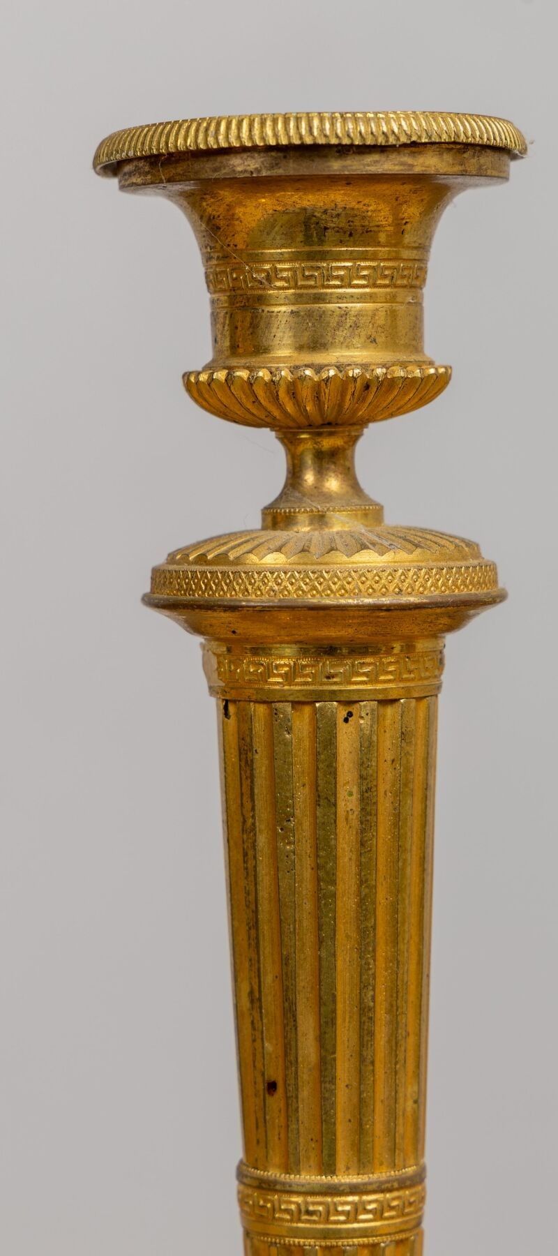 A suite of four ormolu candlesticks, the shafts fluted and alternating with friezes of Greek figures, the bases in Medici vases.