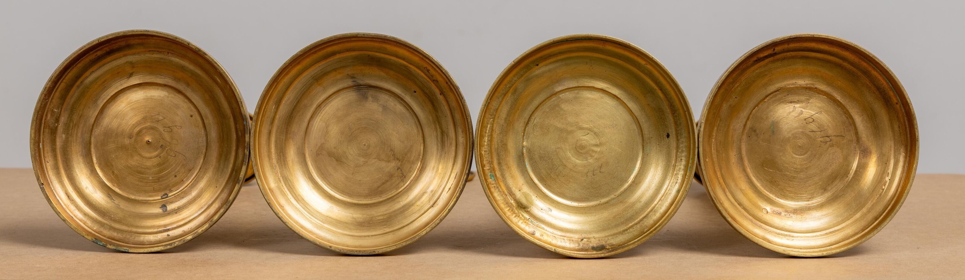 Premium A suite of four ormolu candlesticks, the shafts fluted and a…