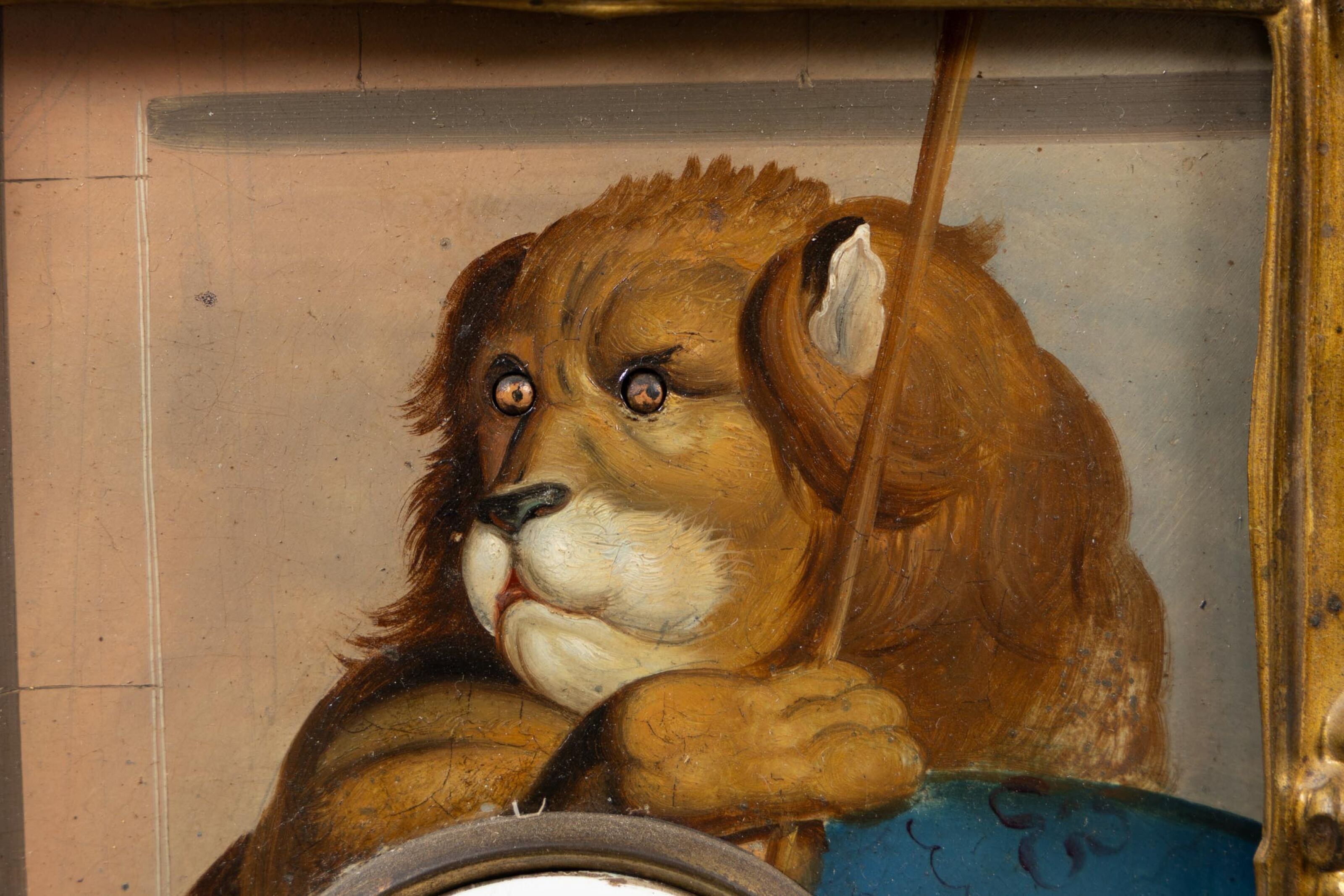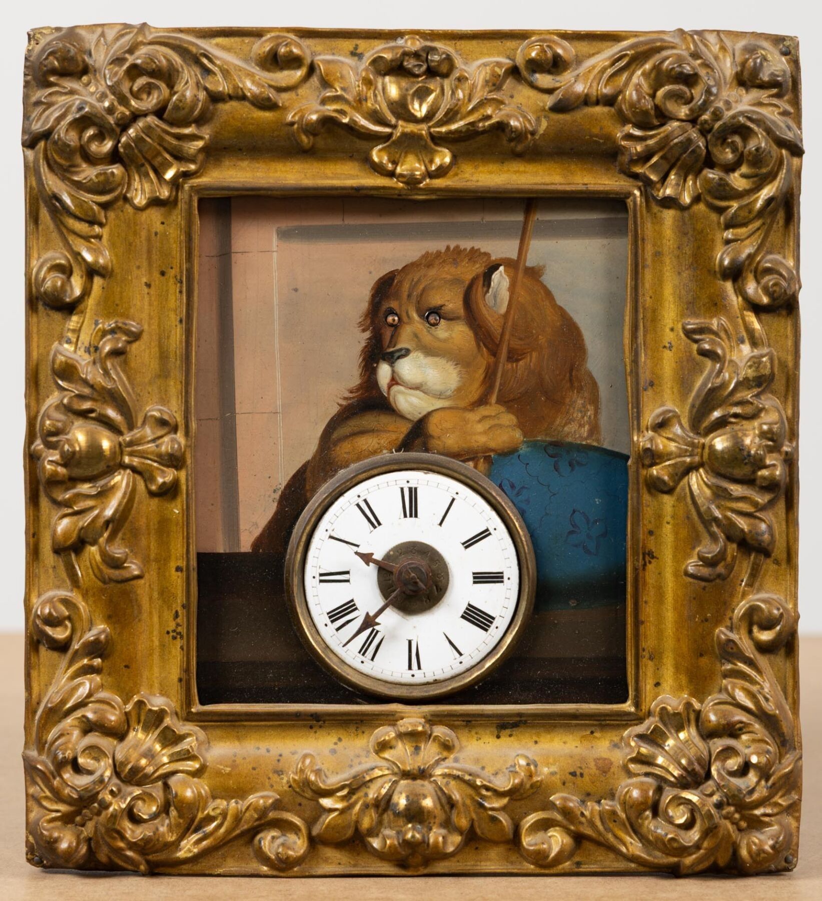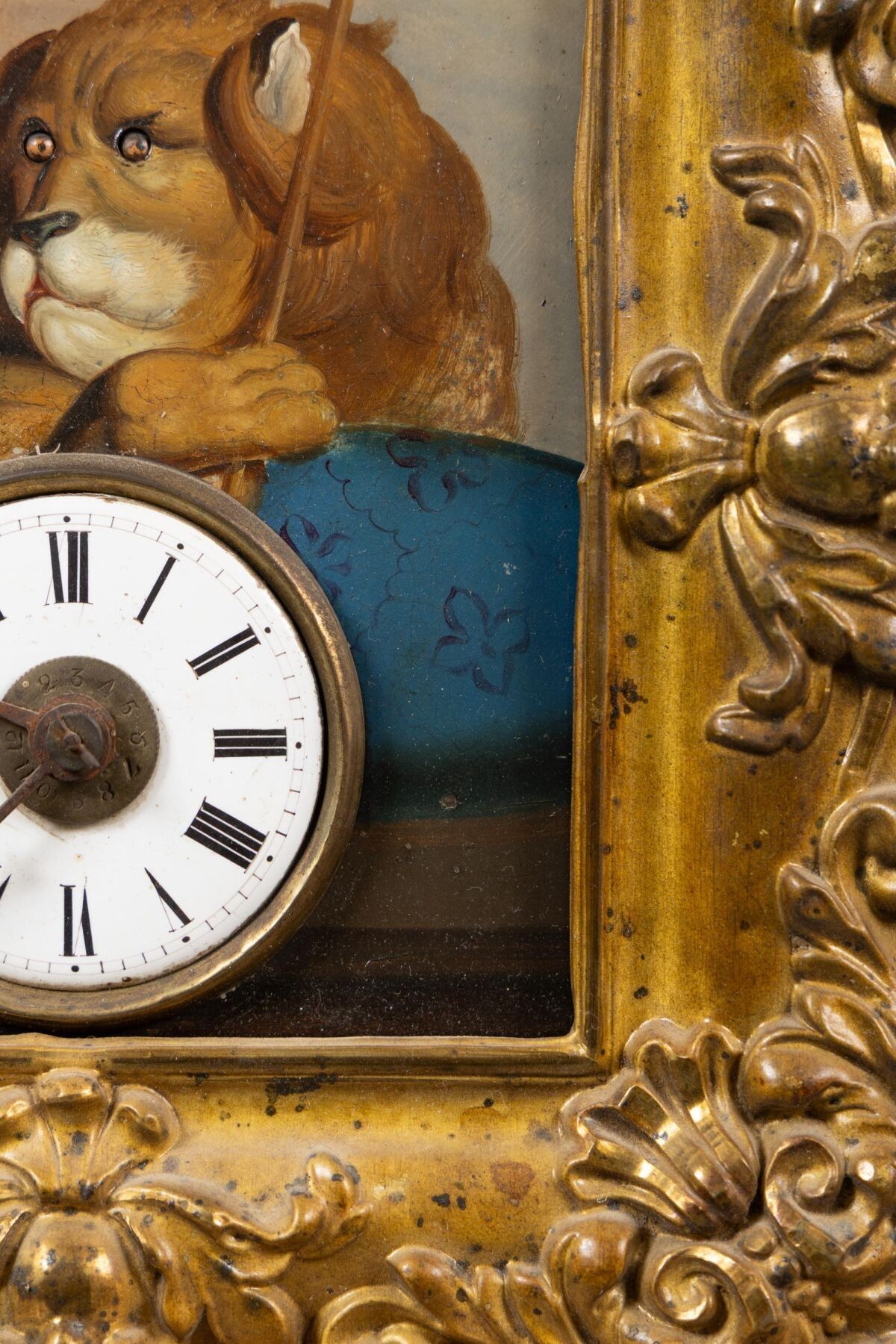Wall clock decorated with a lion painted on sheet metal.