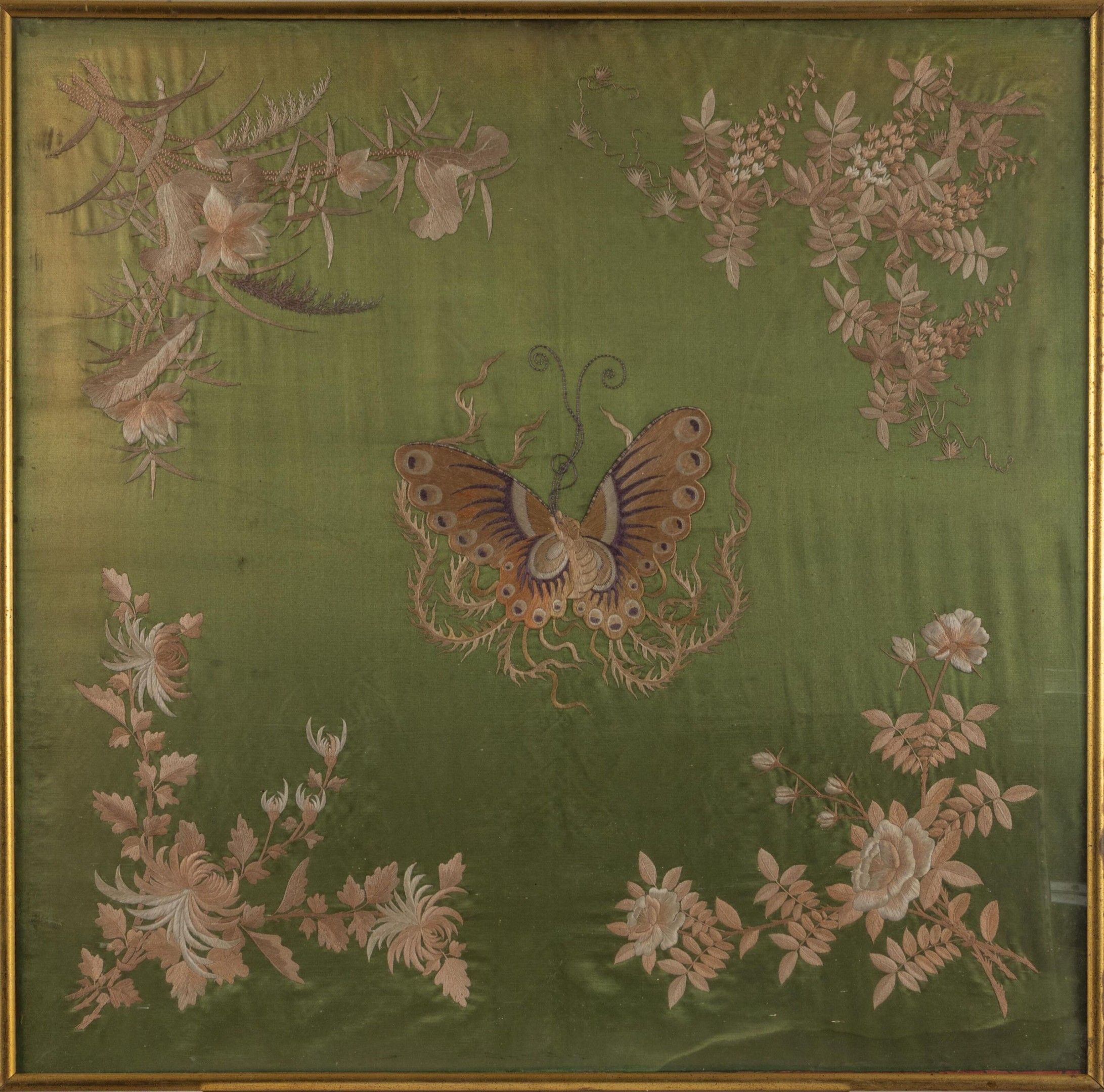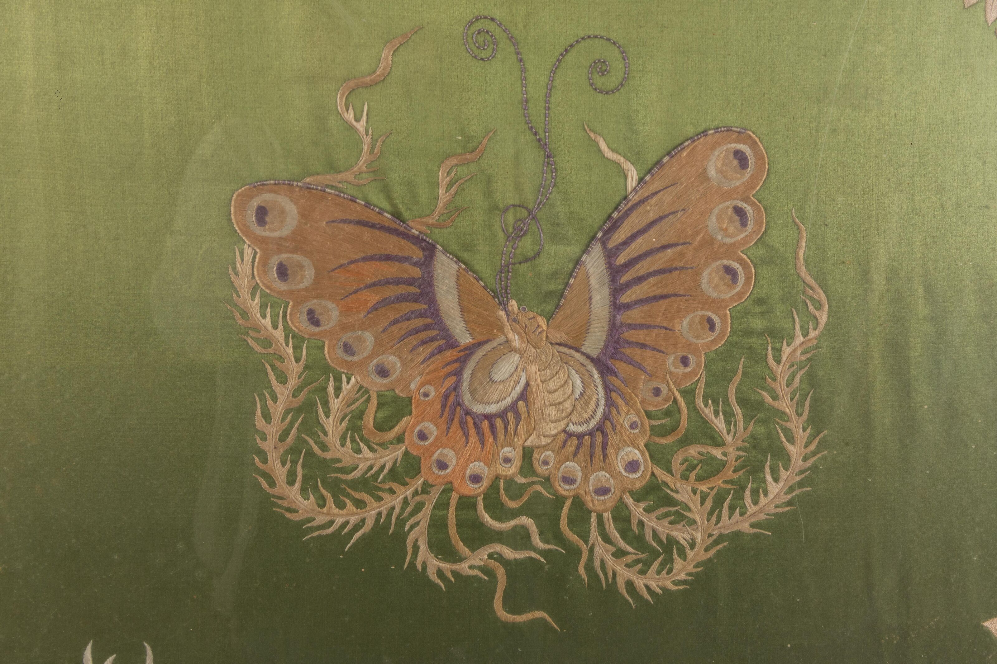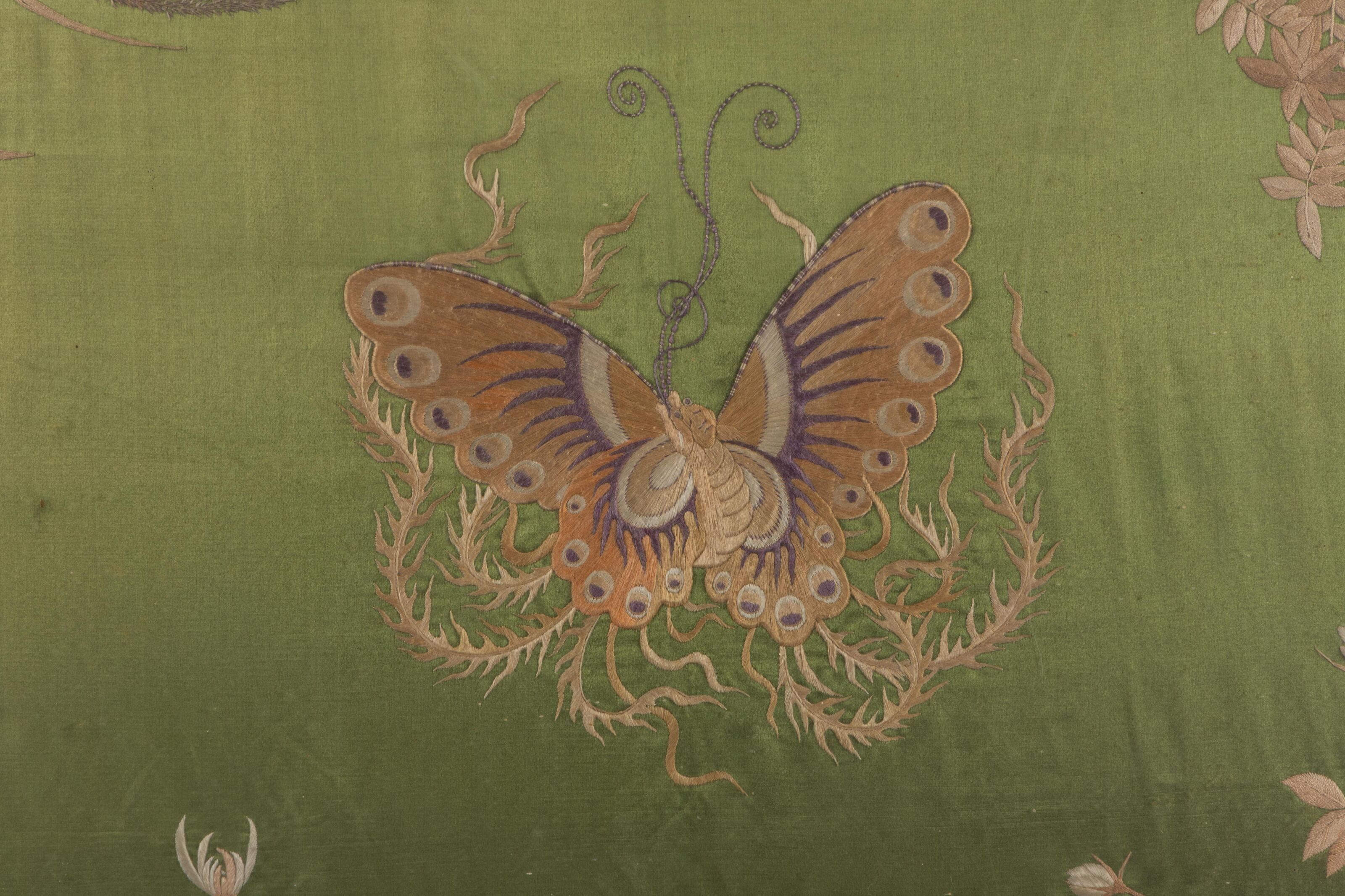 Two embroidered fabrics, one decorated with dragons on a red background, the other with a butterfly and flowers.