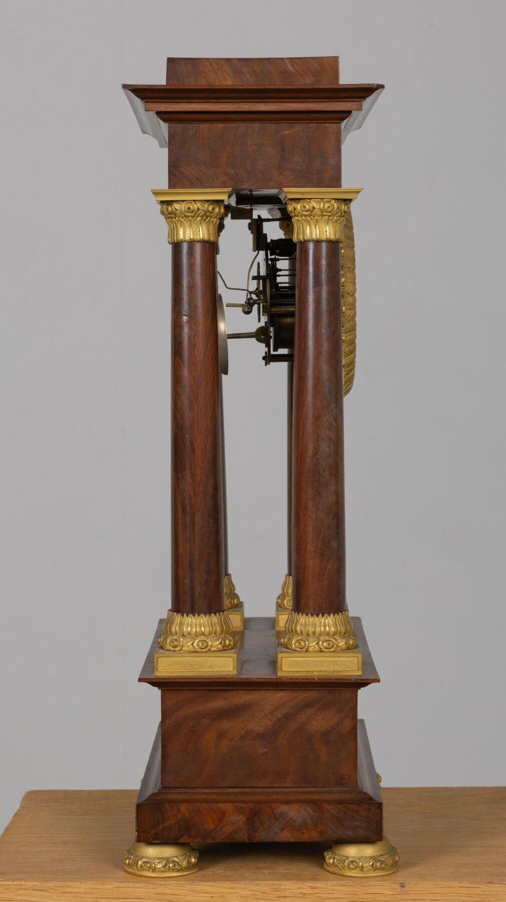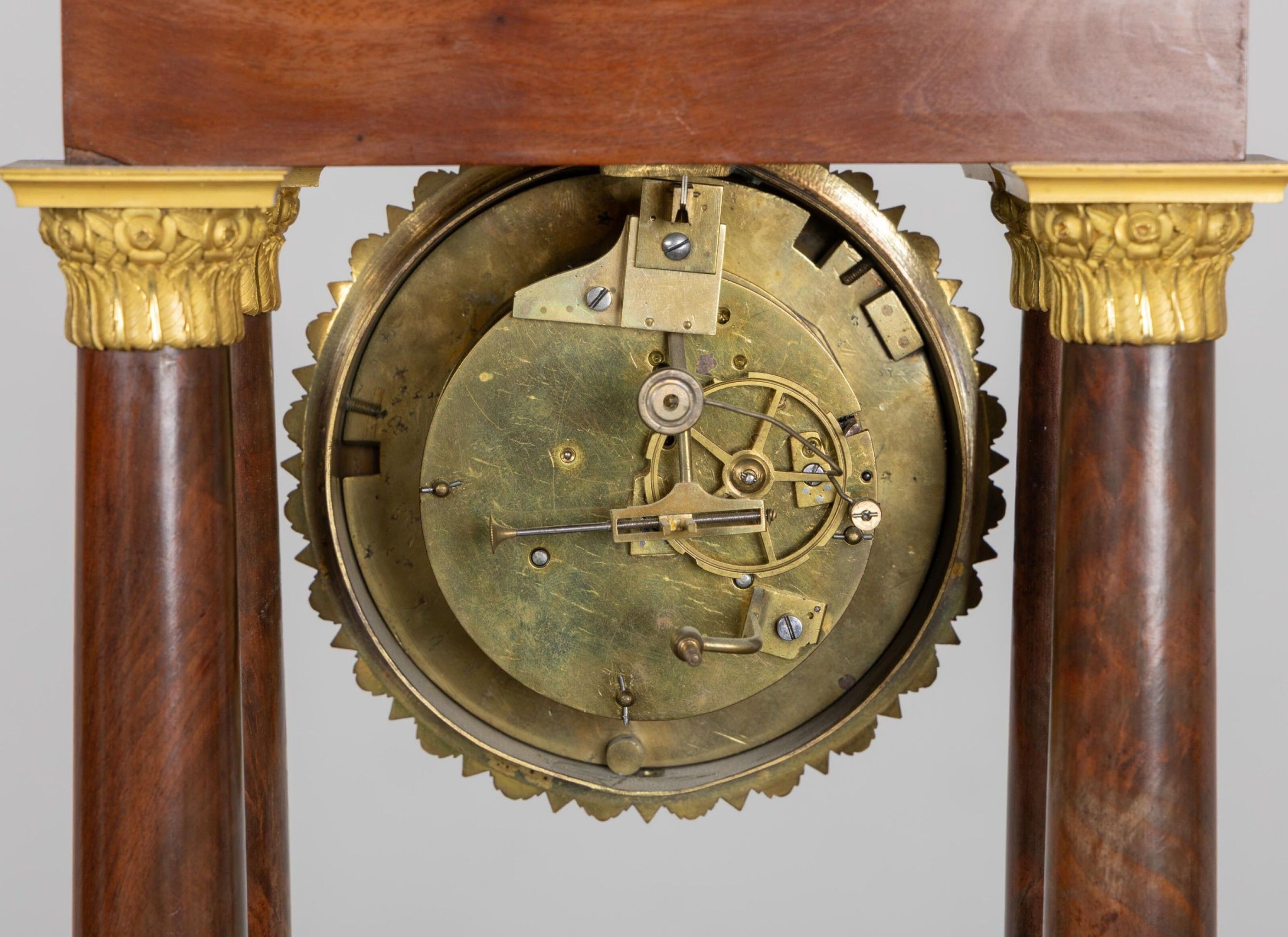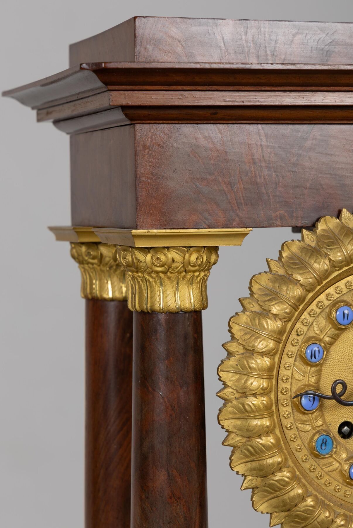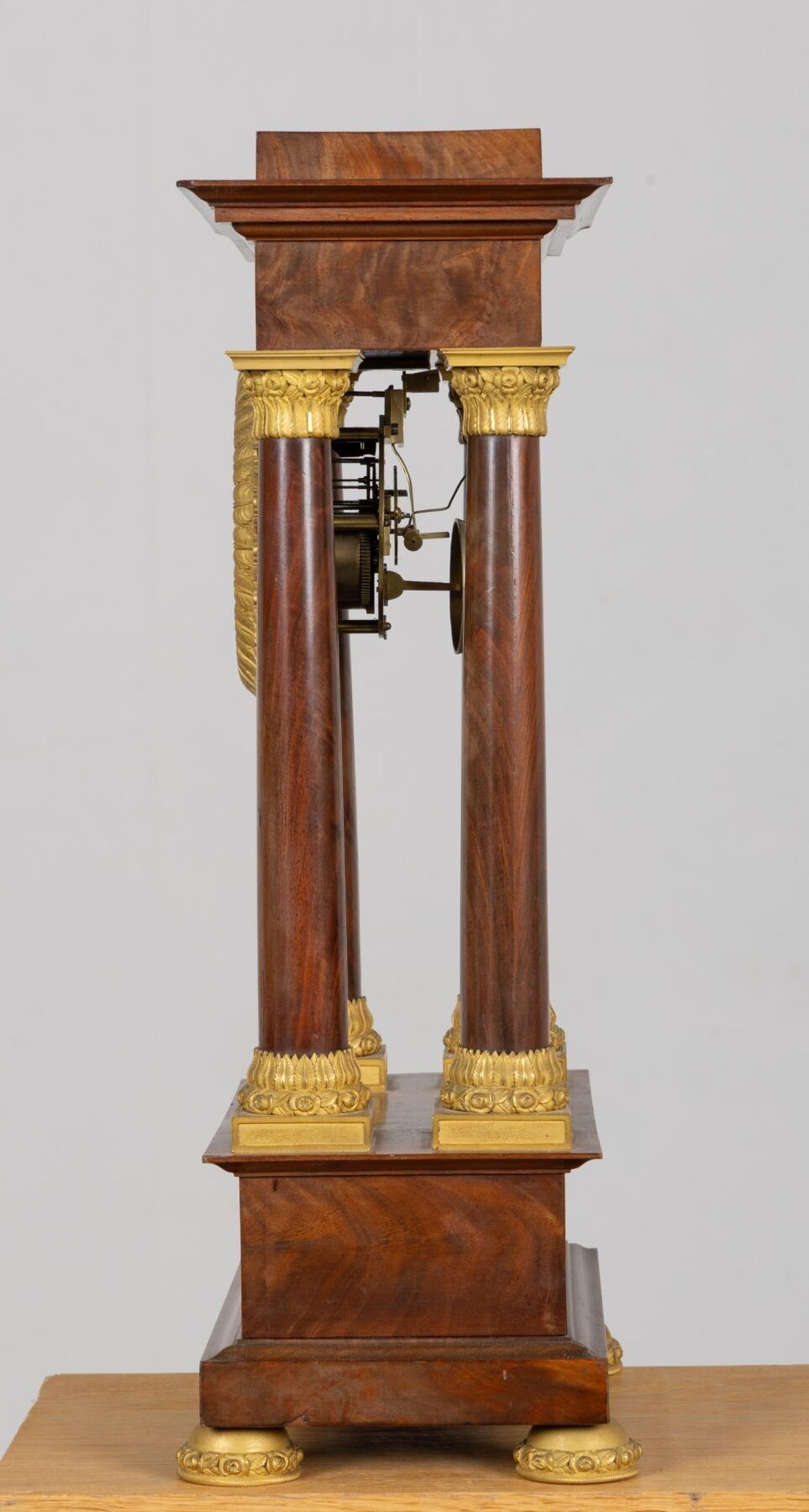 Portico clock in mahogany and mahogany veneer, the uprights in antique style columns with ormolu decoration of palmettes and garlands of flowers.