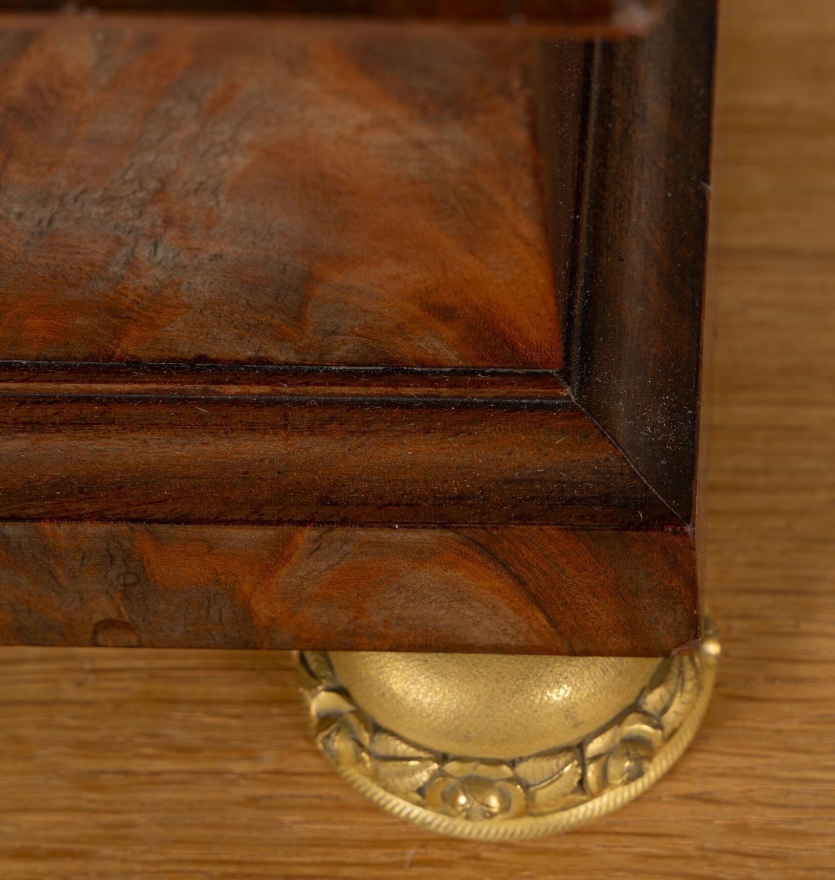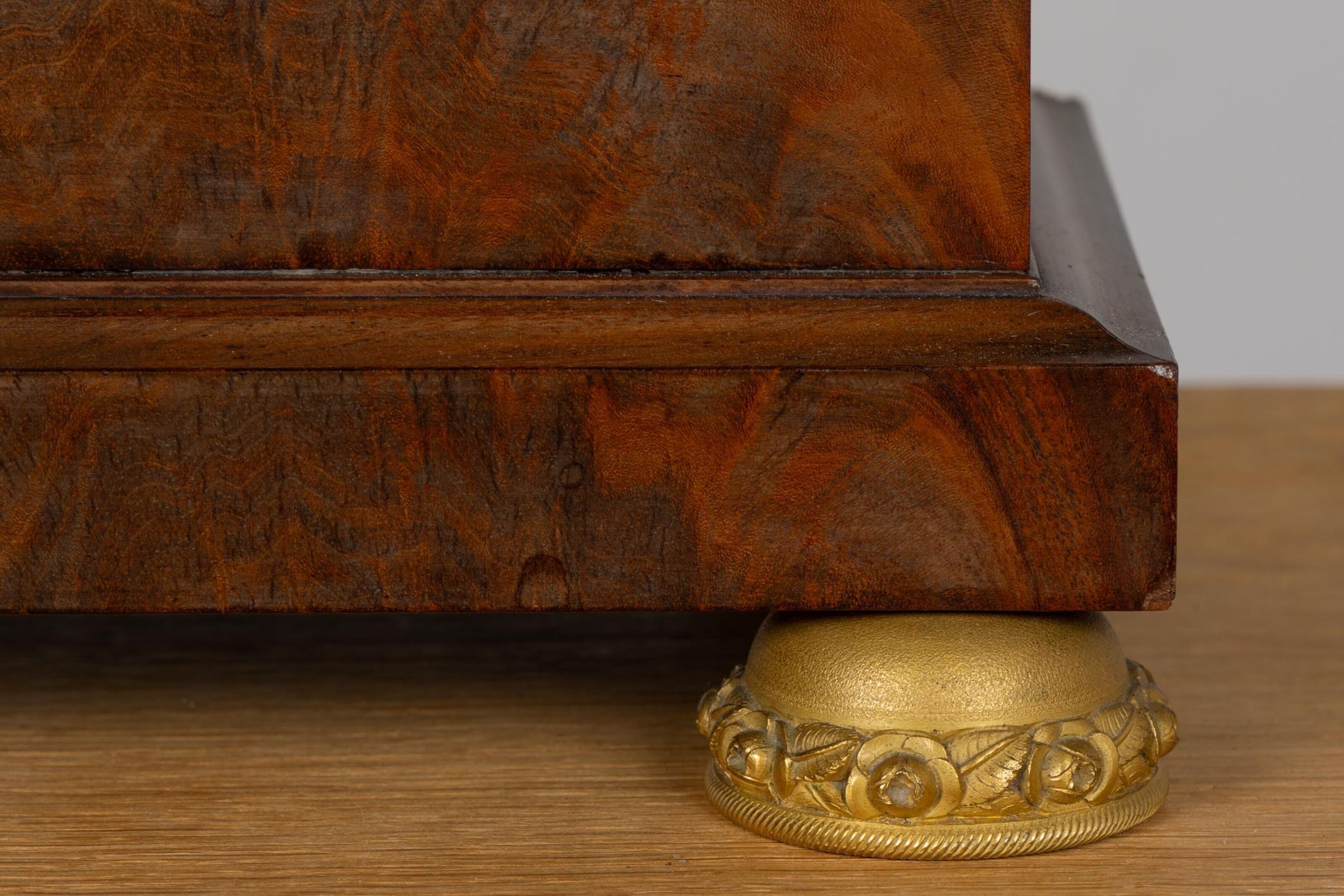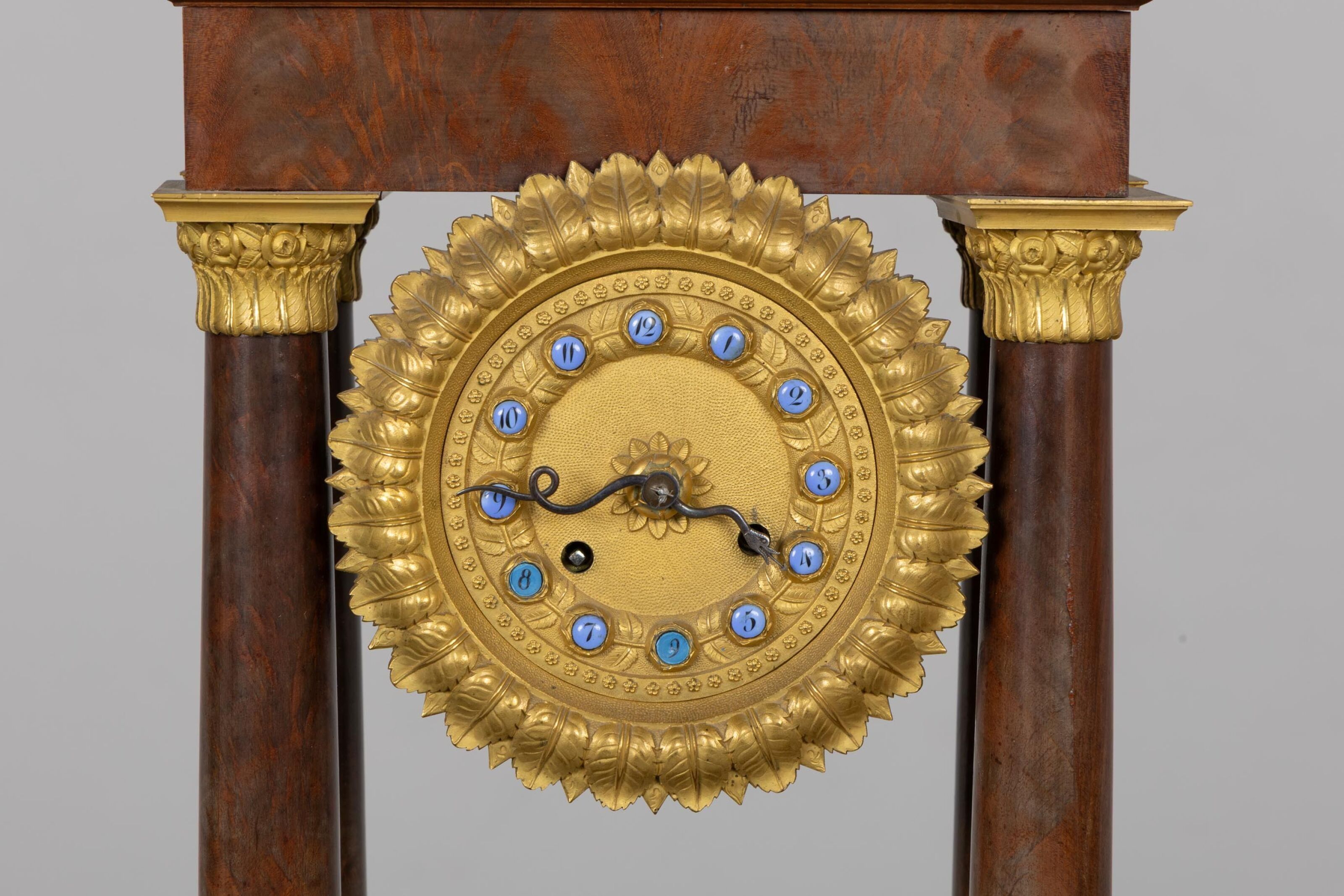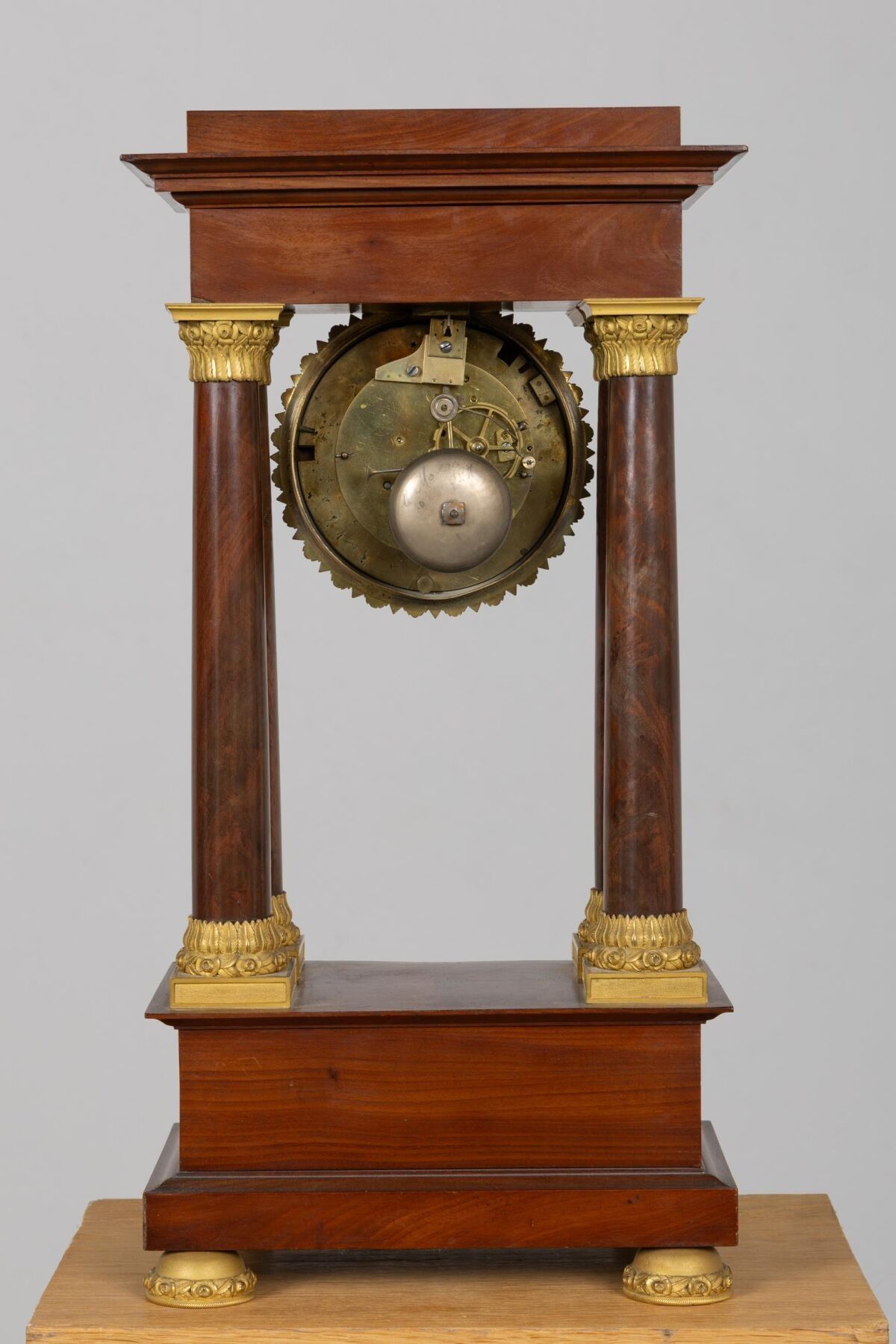 Portico clock in mahogany and mahogany veneer, the uprights in antique style columns with ormolu decoration of palmettes and garlands of flowers.