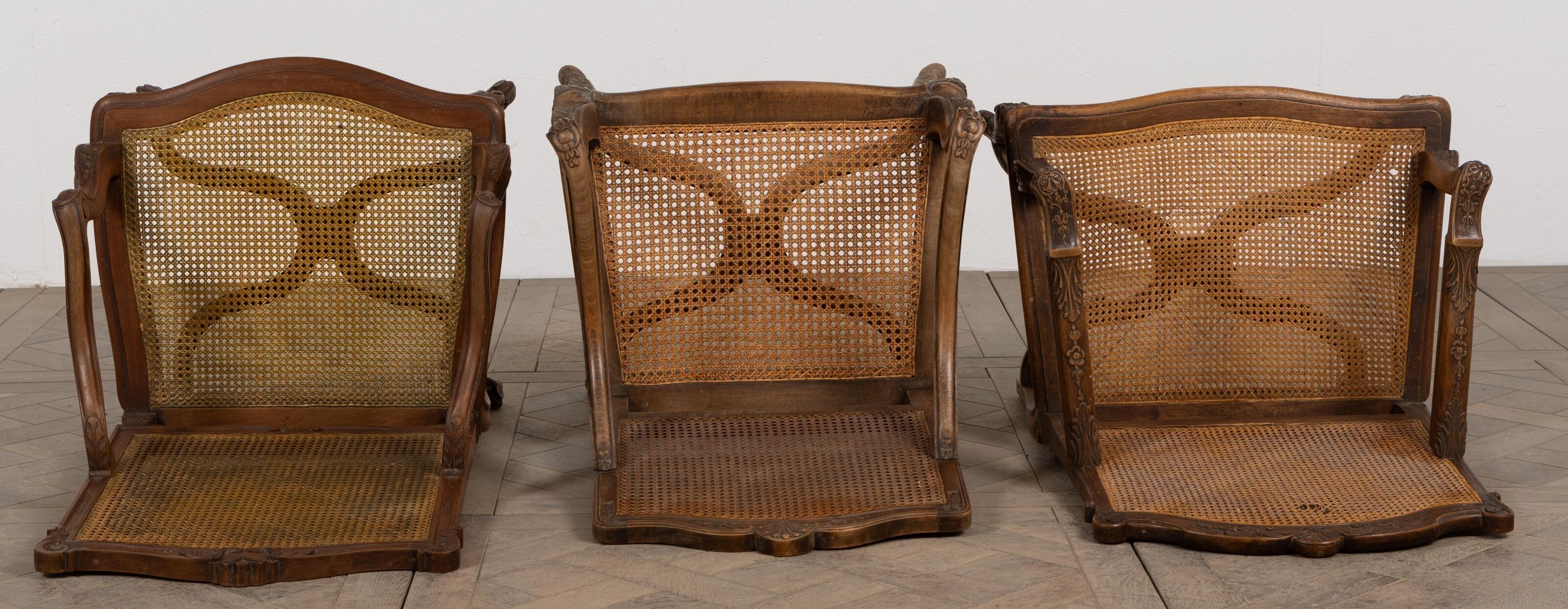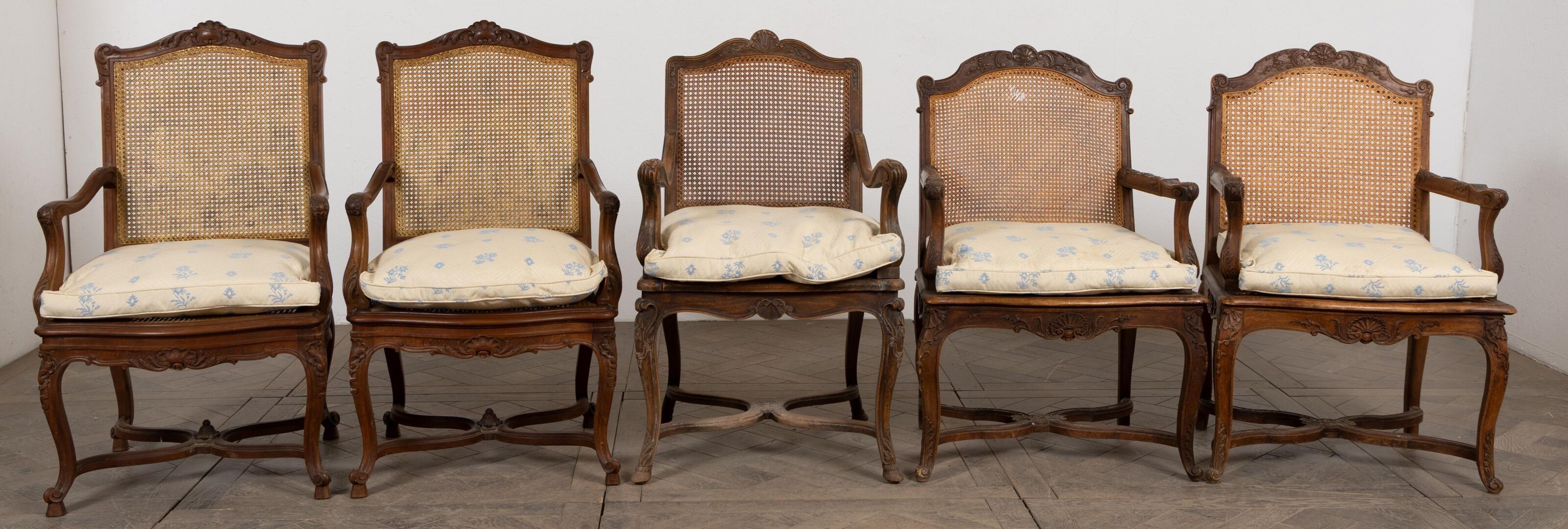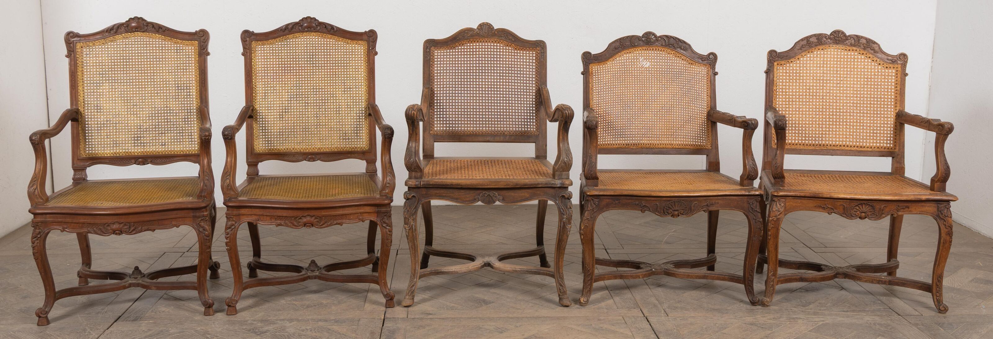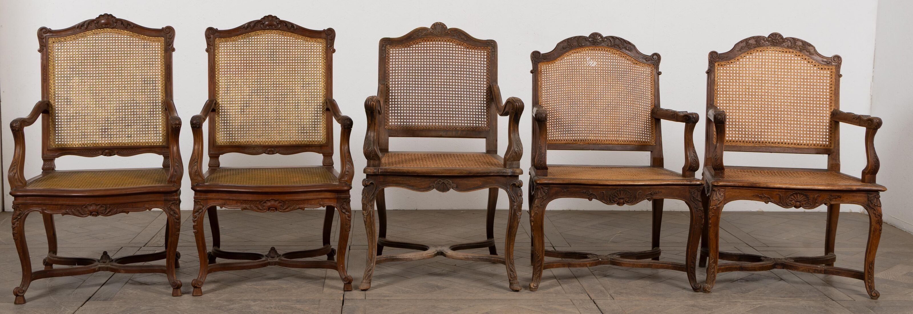 Set of five moulded and carved wooden caned armchairs, comprising two pairs and a single armchair.