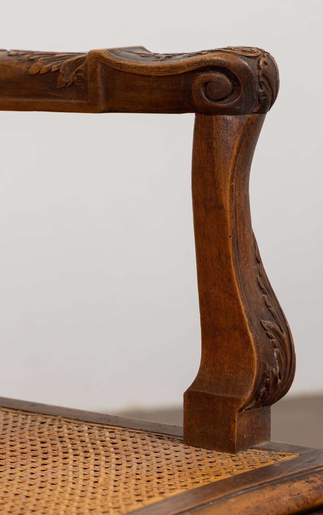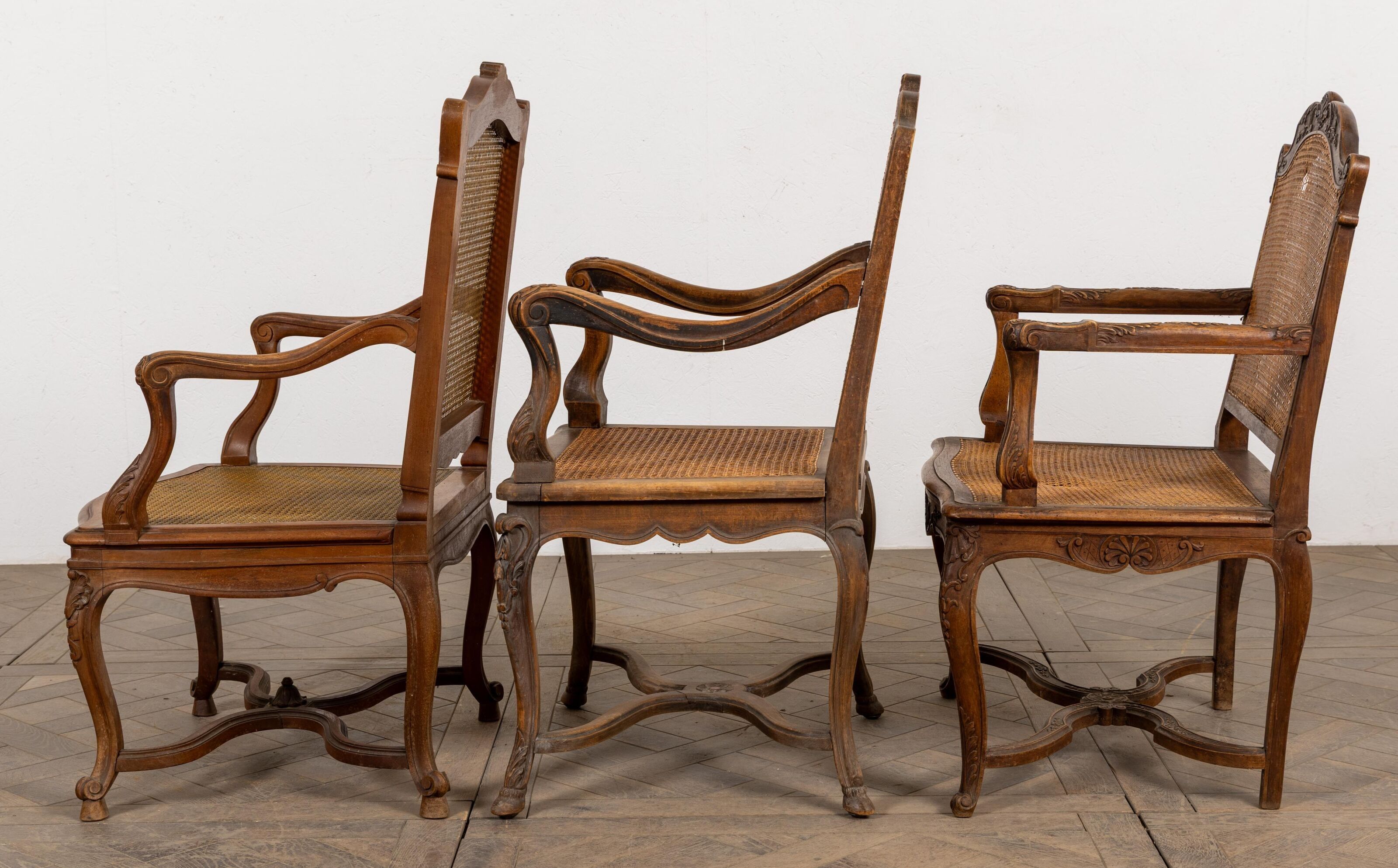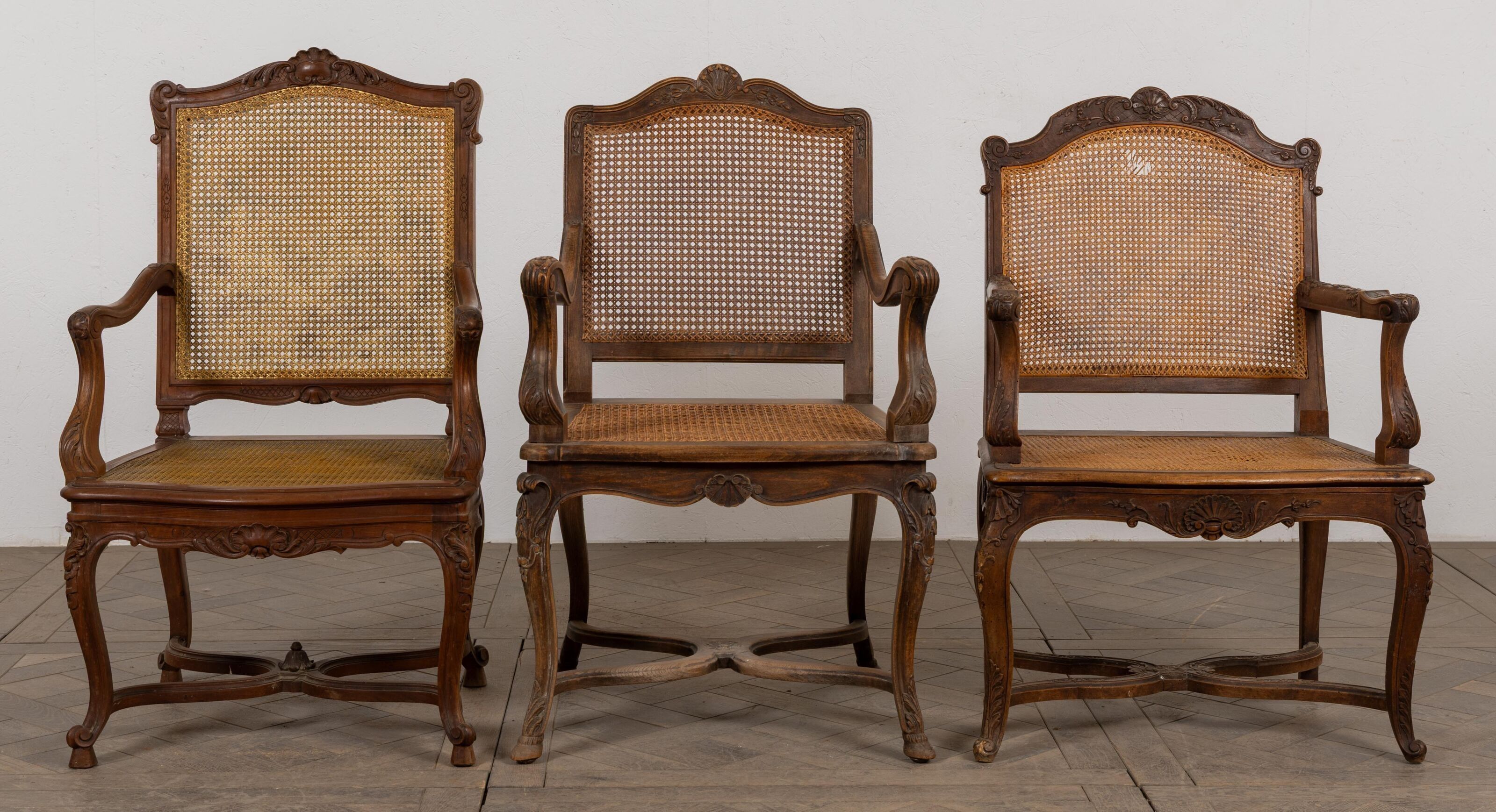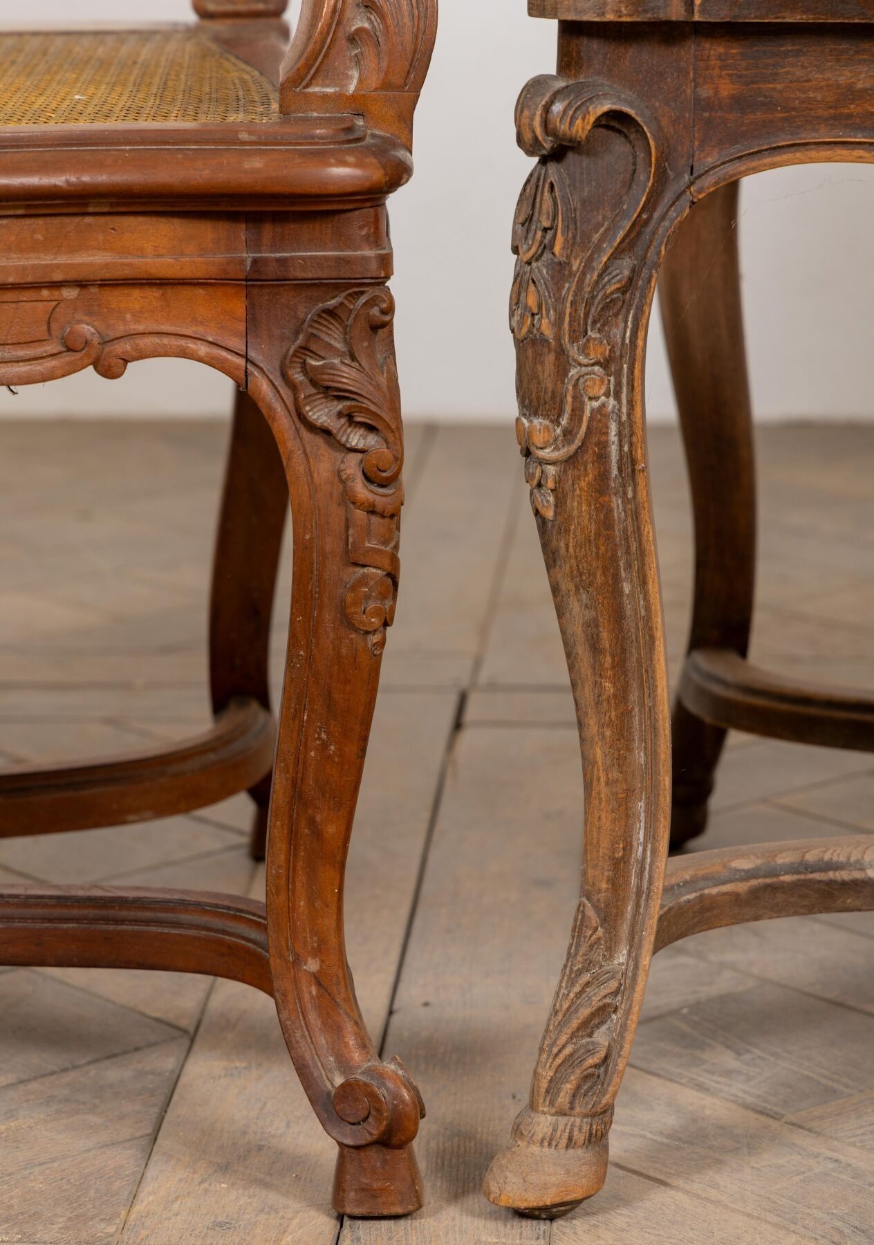 Set of five moulded and carved wooden caned armchairs, comprising two pairs and a single armchair.