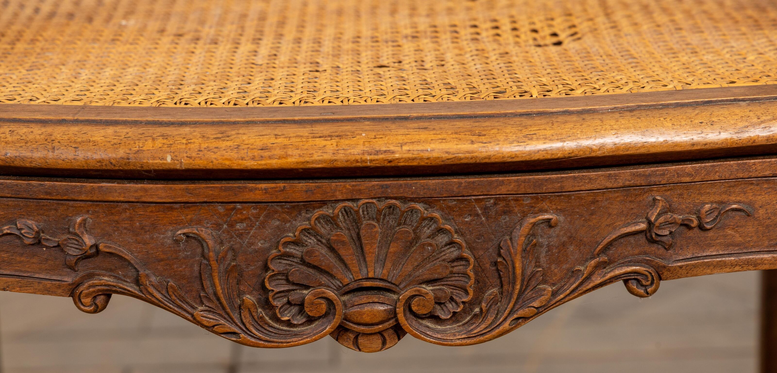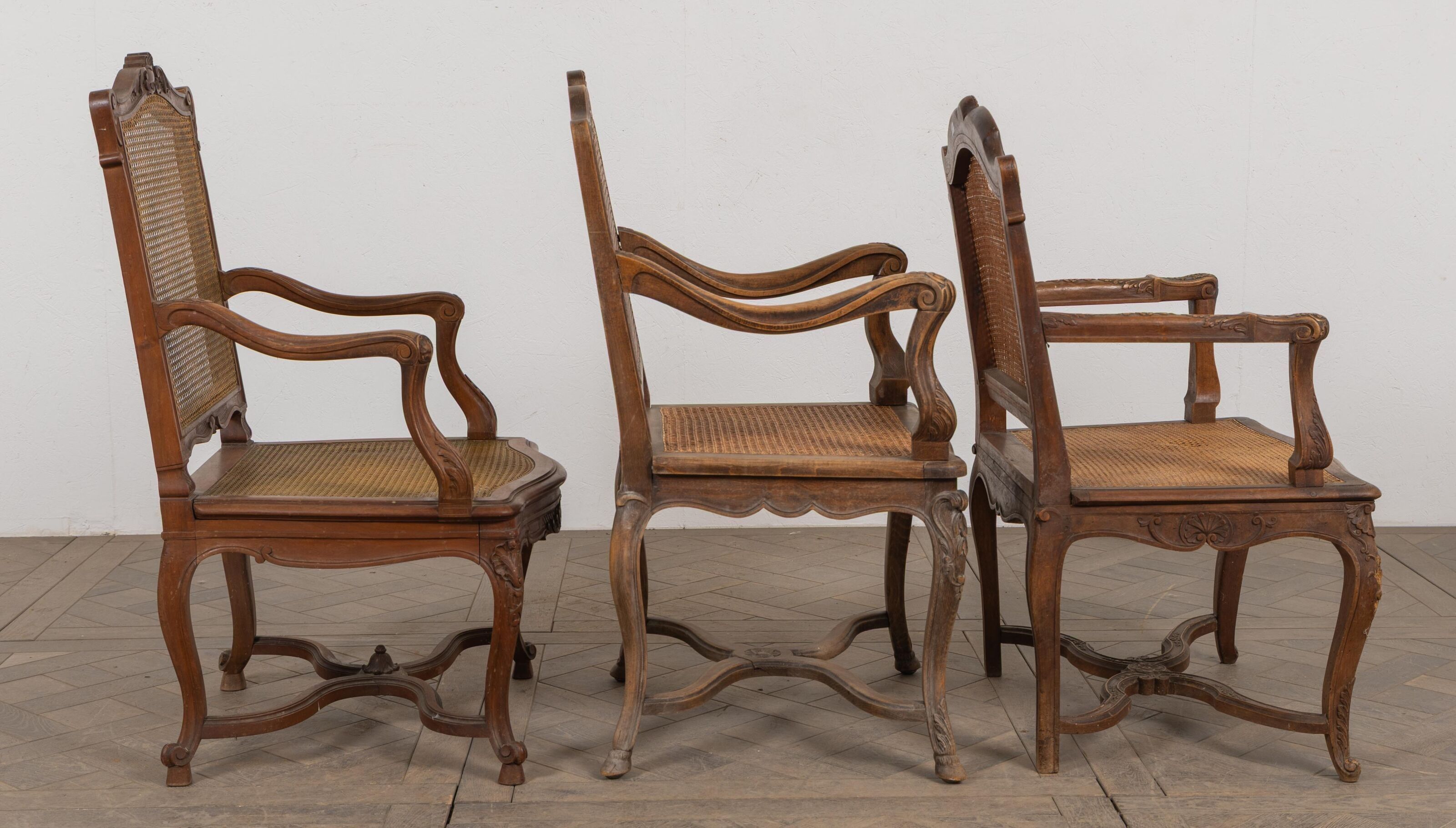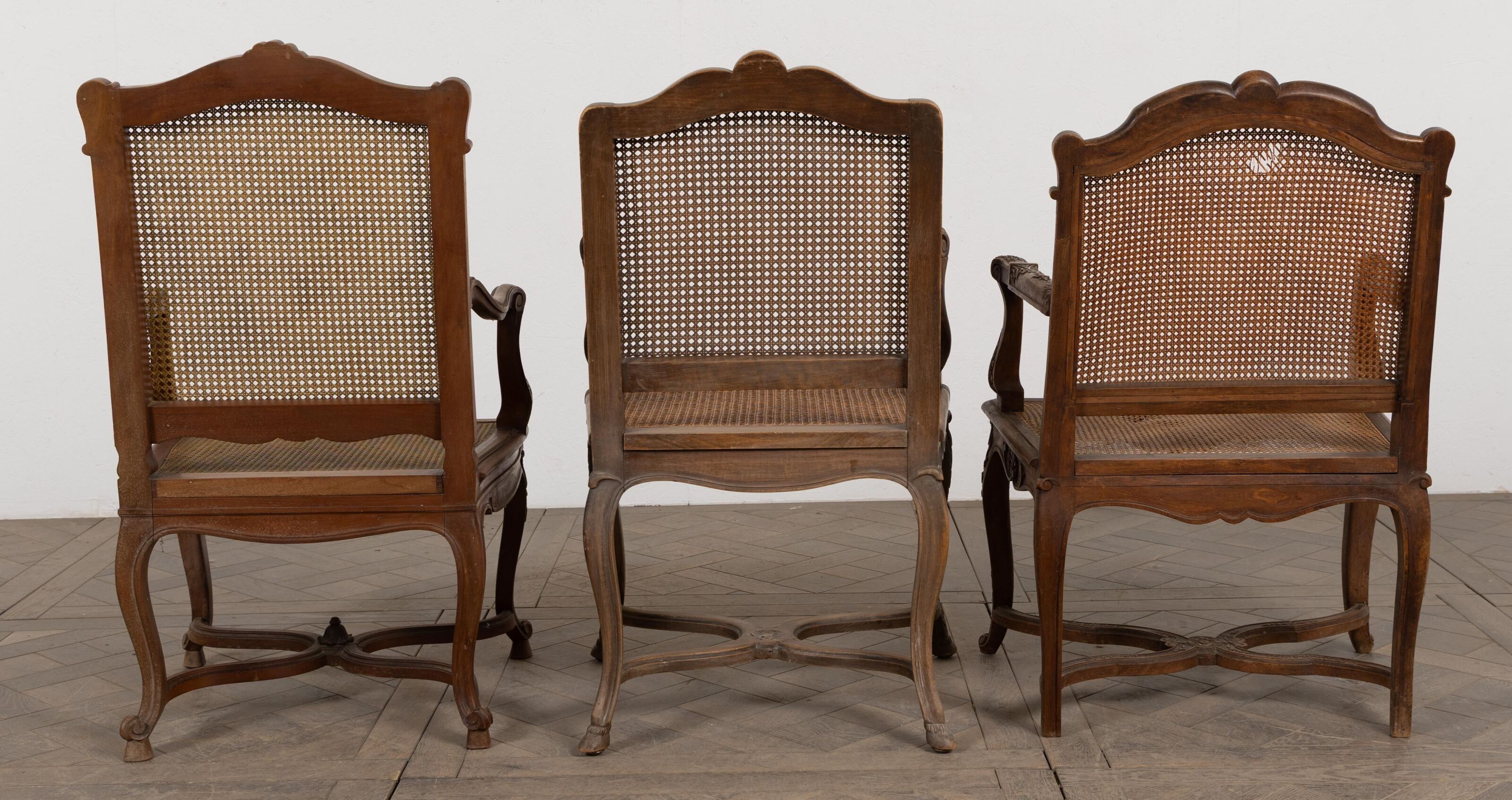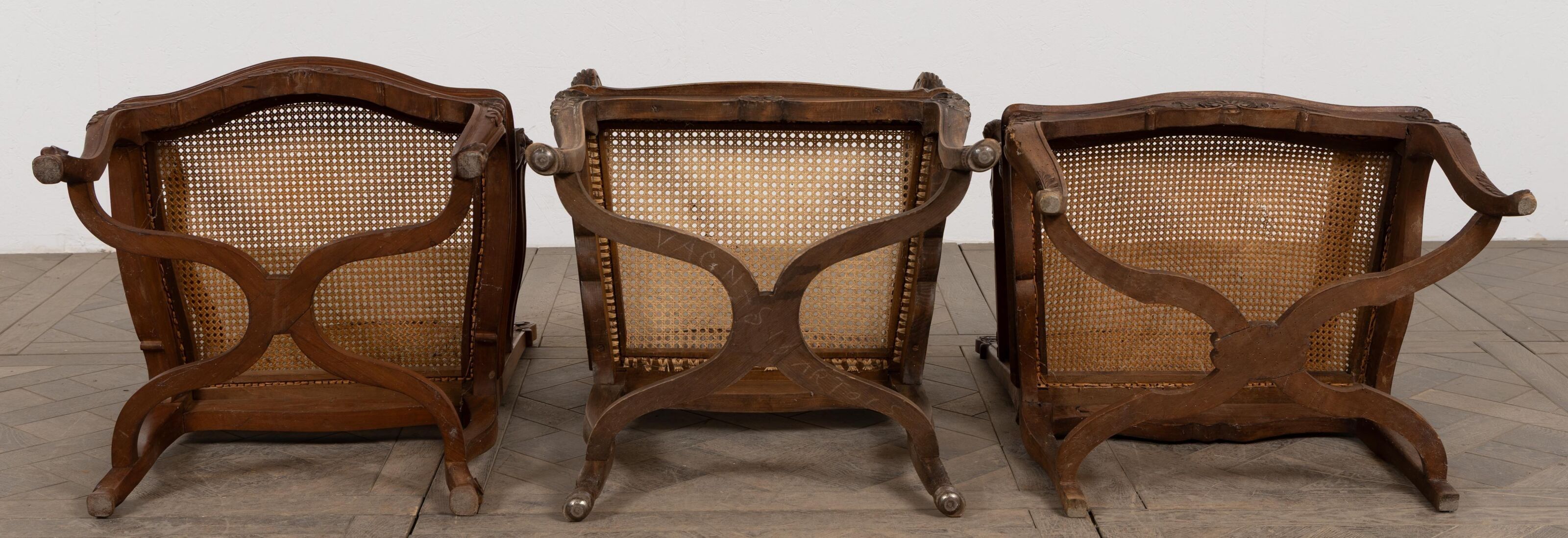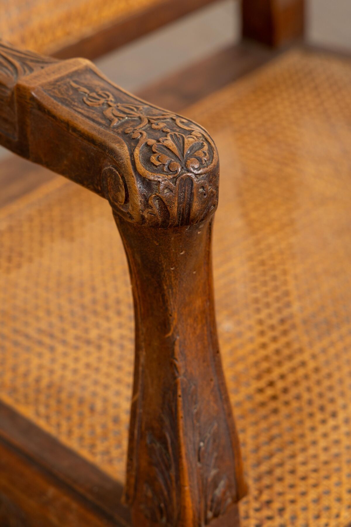 Set of five moulded and carved wooden caned armchairs, comprising two pairs and a single armchair.