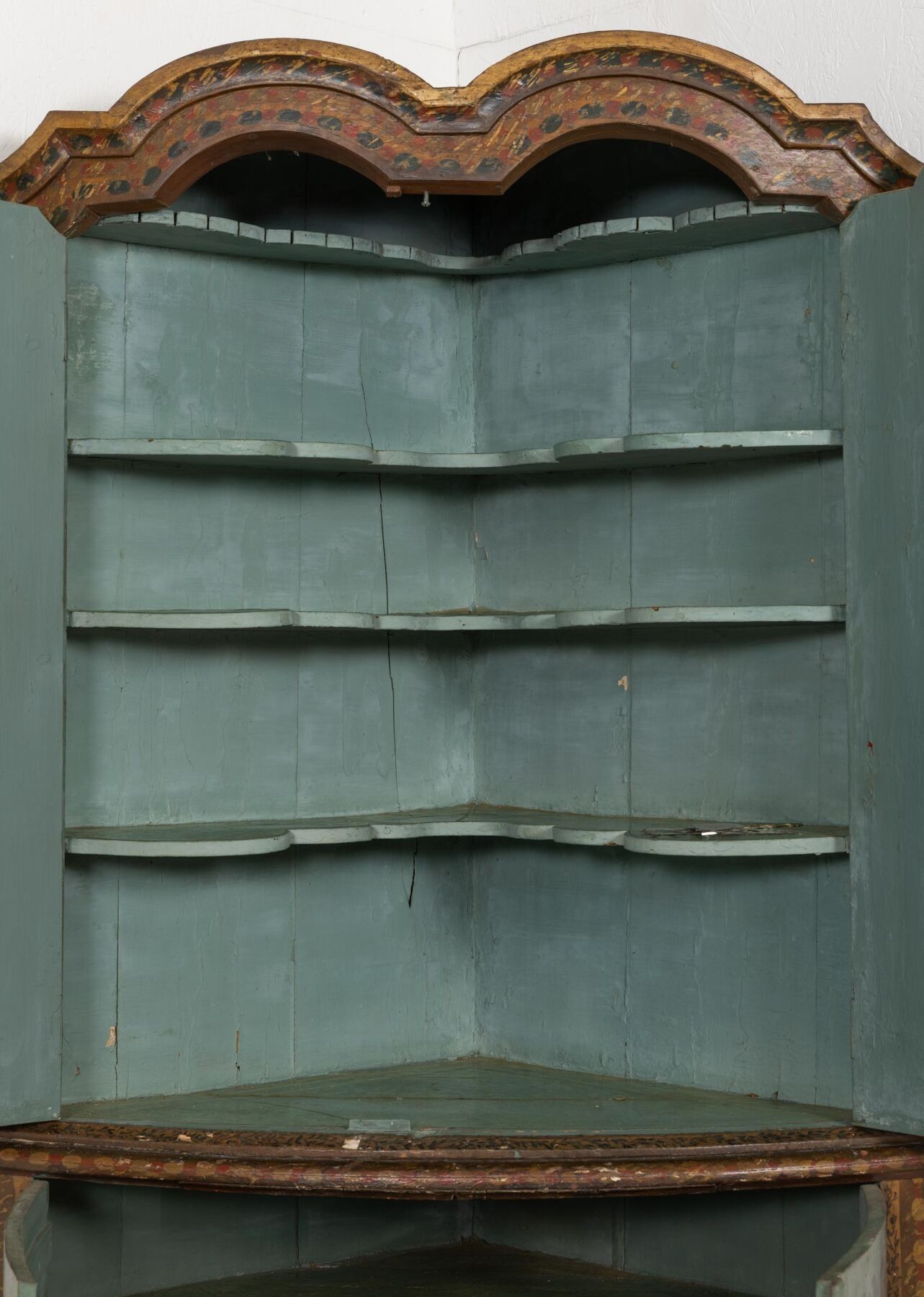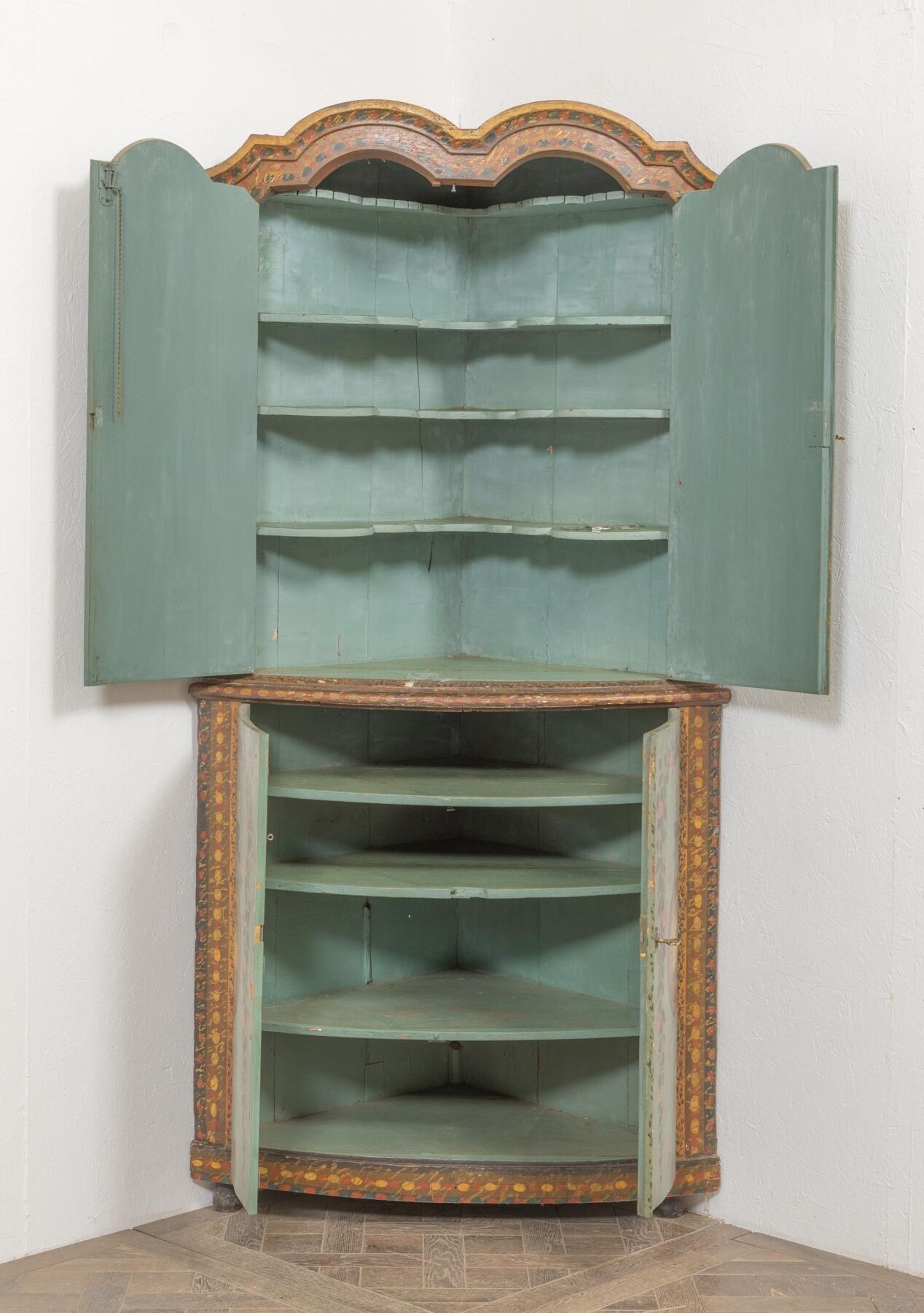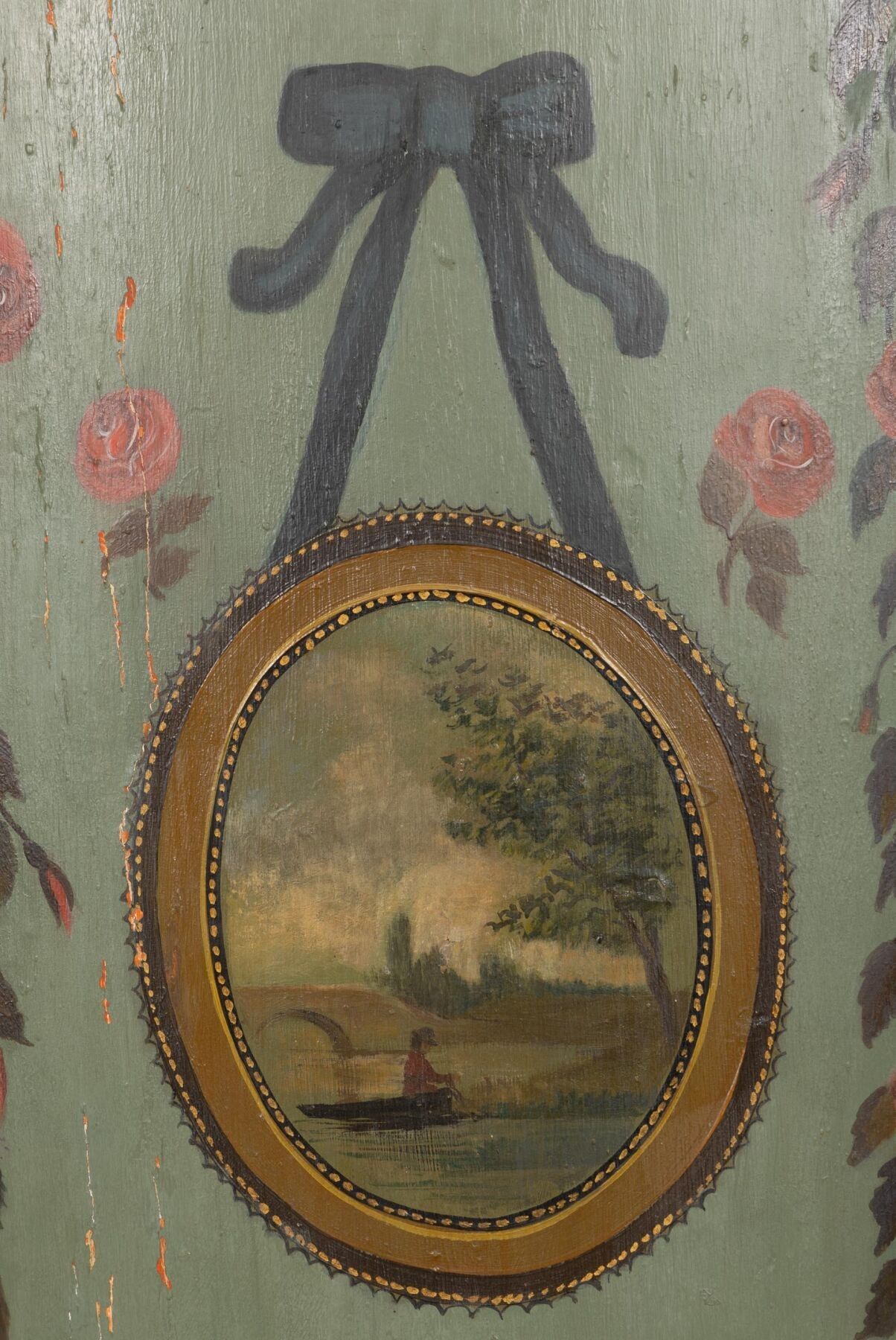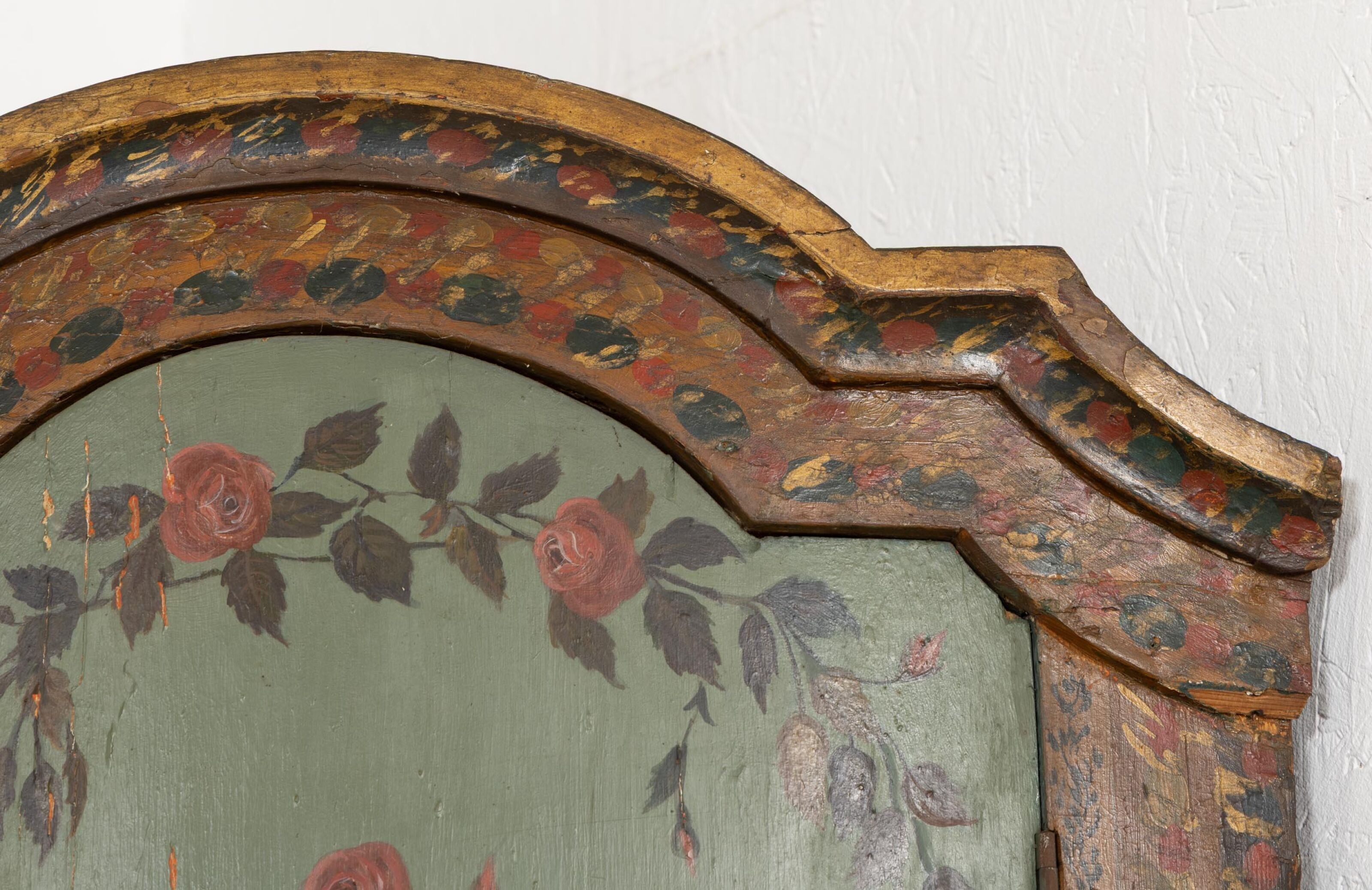 A two-part moulded wooden cove with painted decoration of landscapes in medallions and garlands of flowers. 18th or early 19th century H_228 cm W_112 cm D_68 cm
