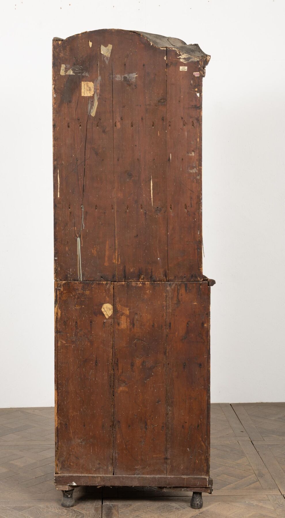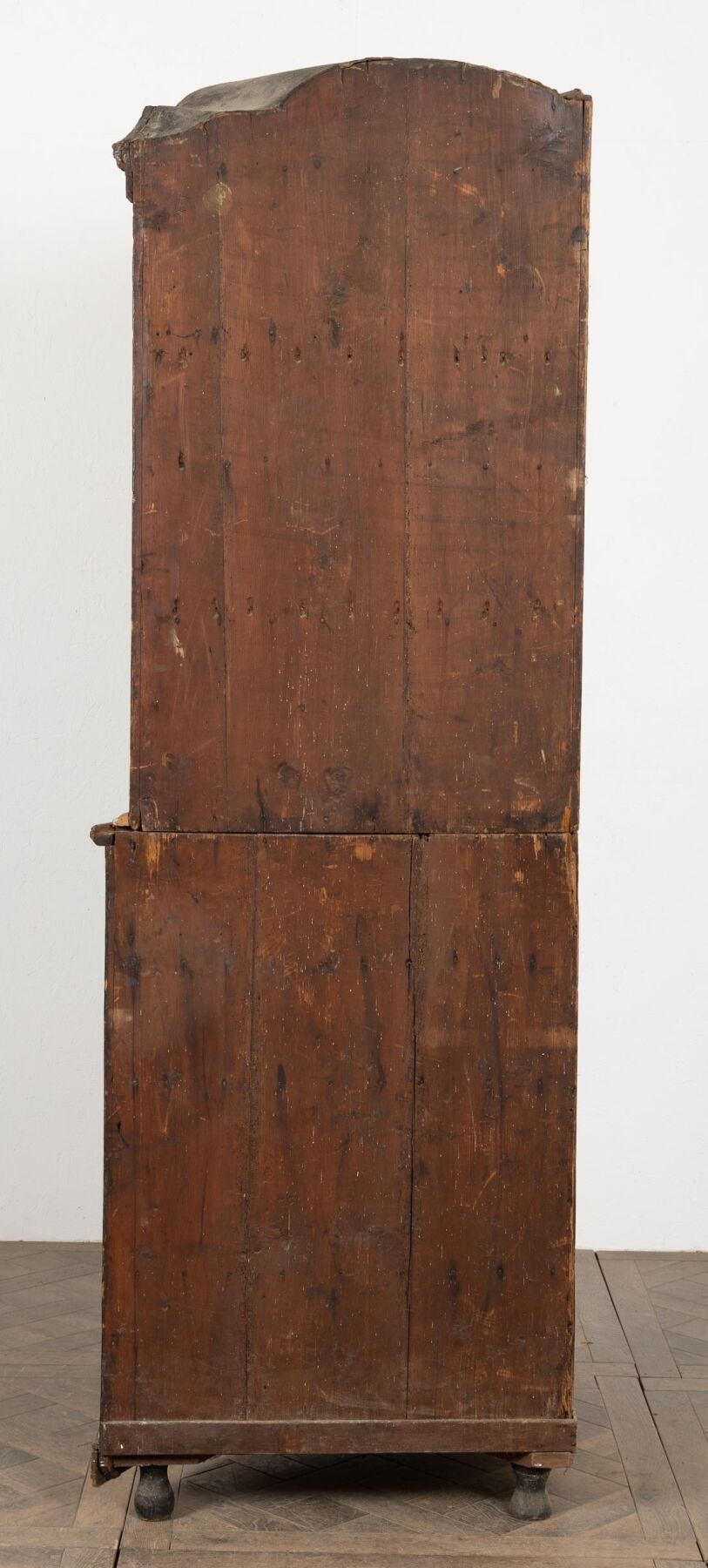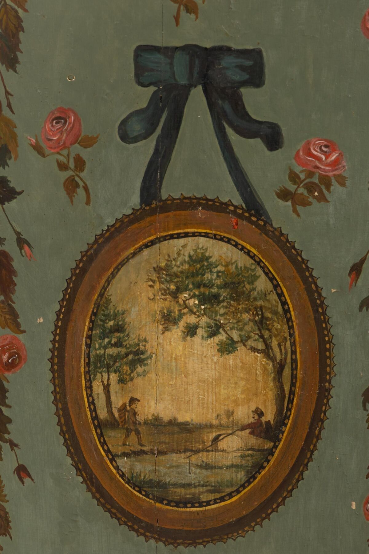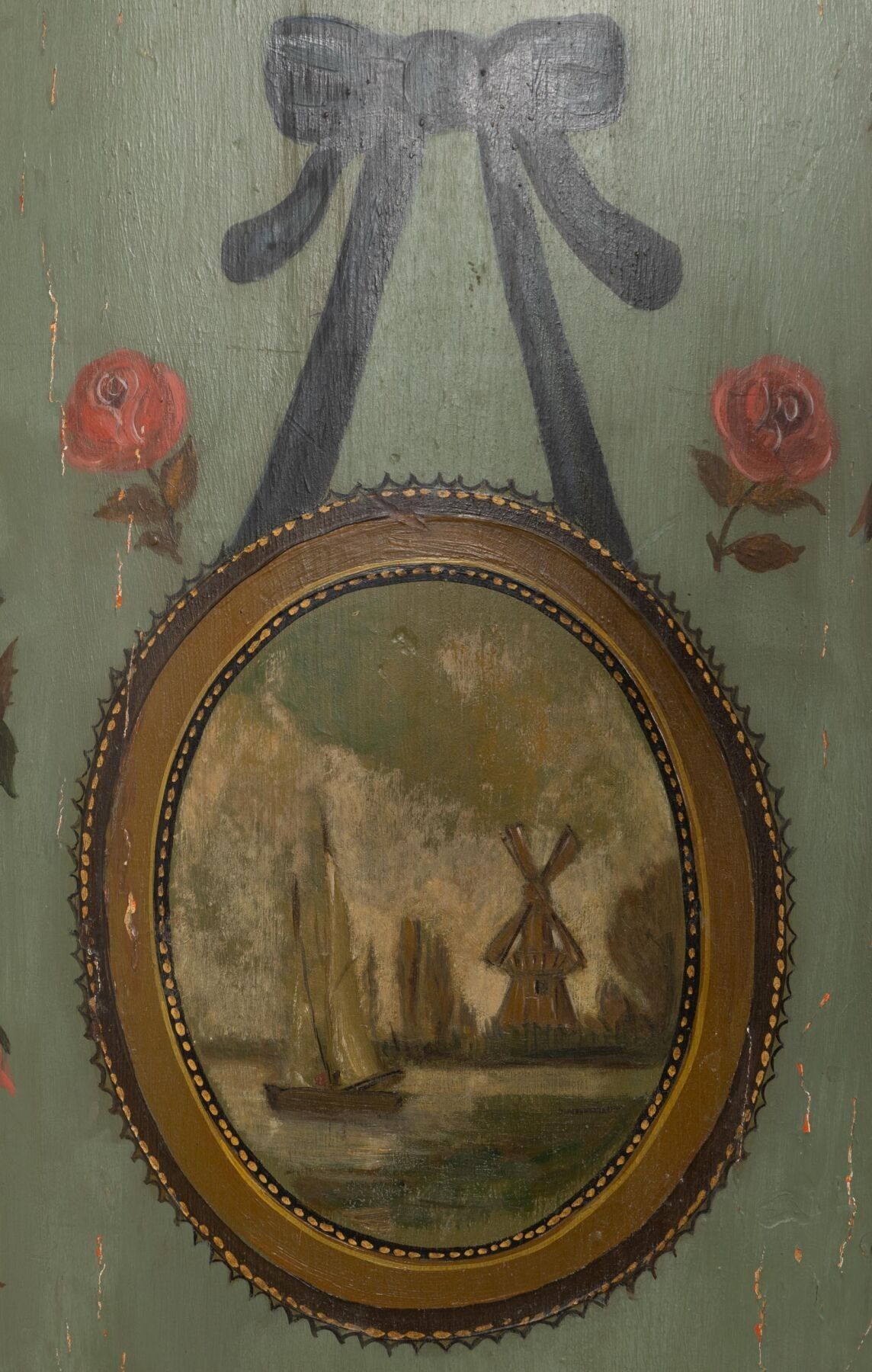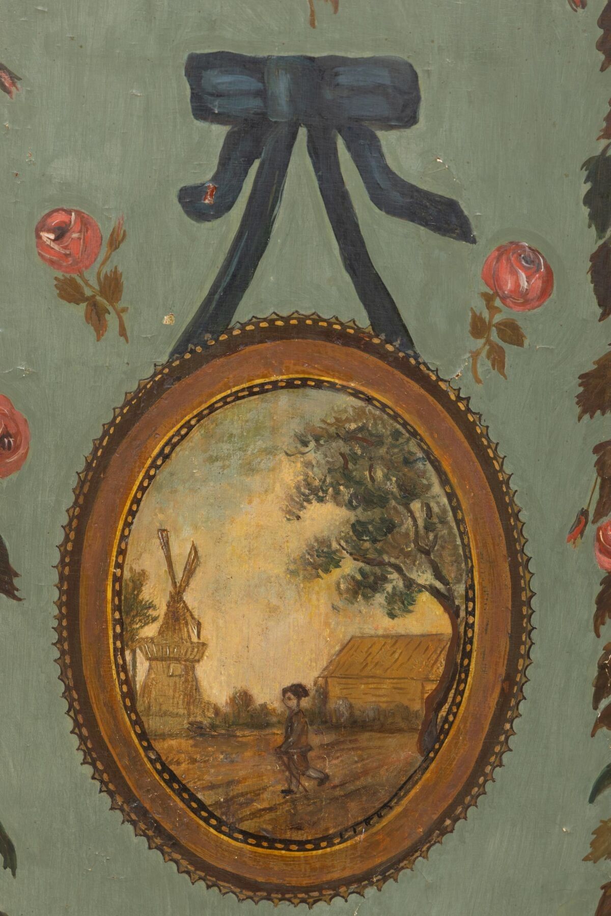 A two-part moulded wooden cove with painted decoration of landscapes in medallions and garlands of flowers. 18th or early 19th century H_228 cm W_112 cm D_68 cm