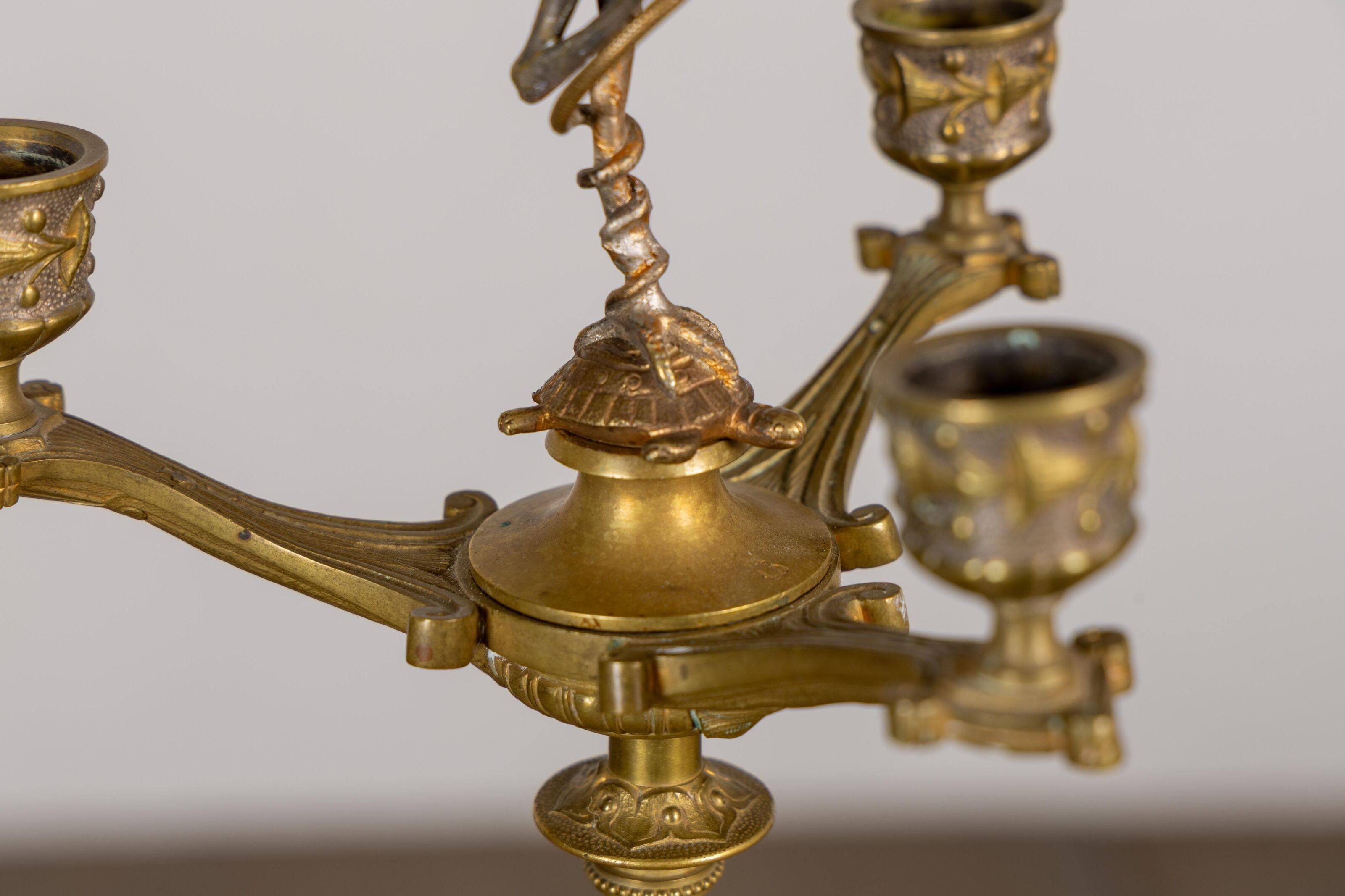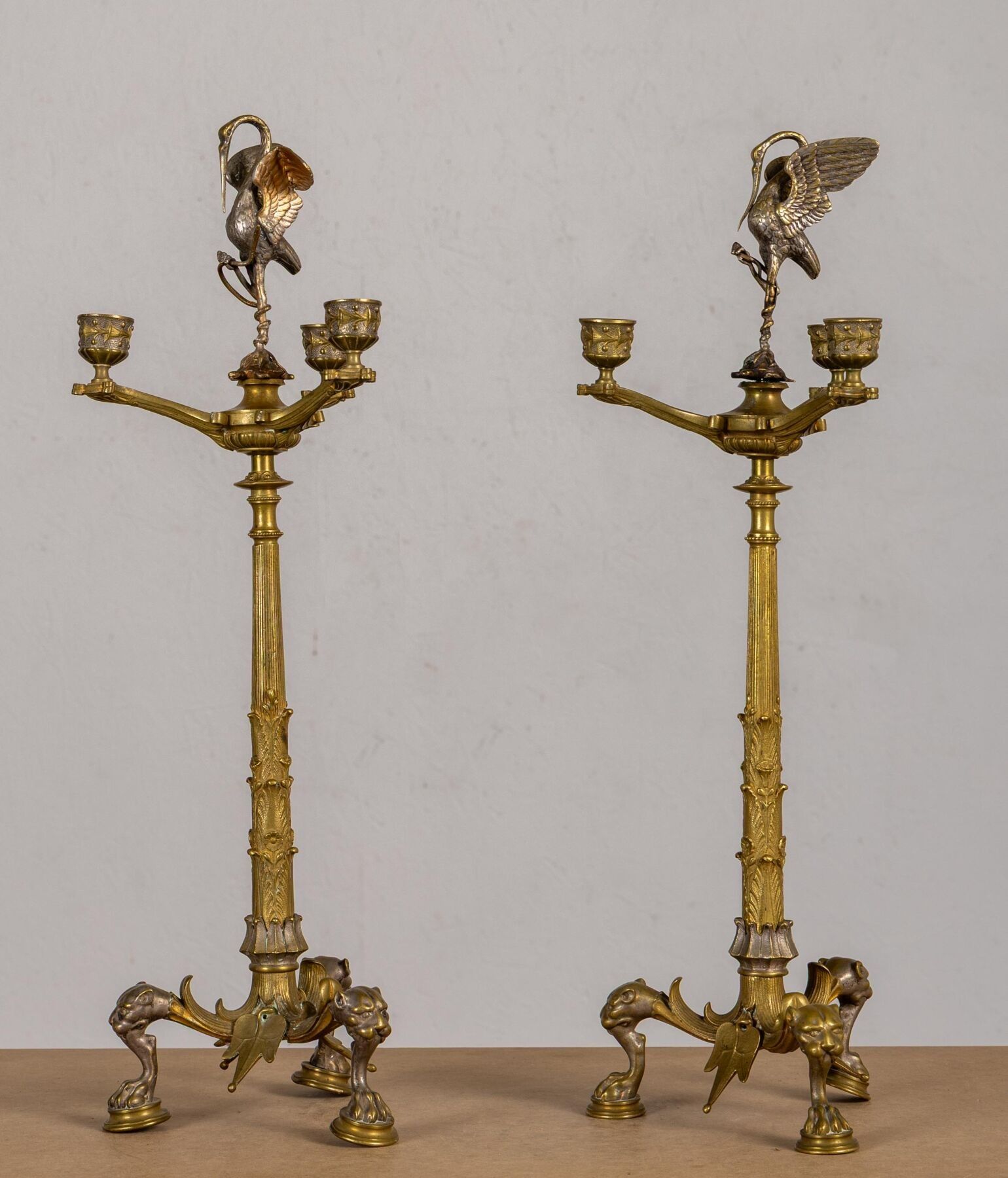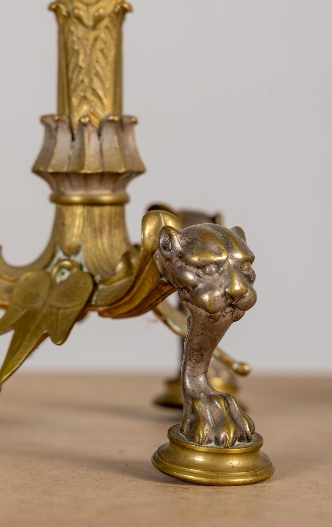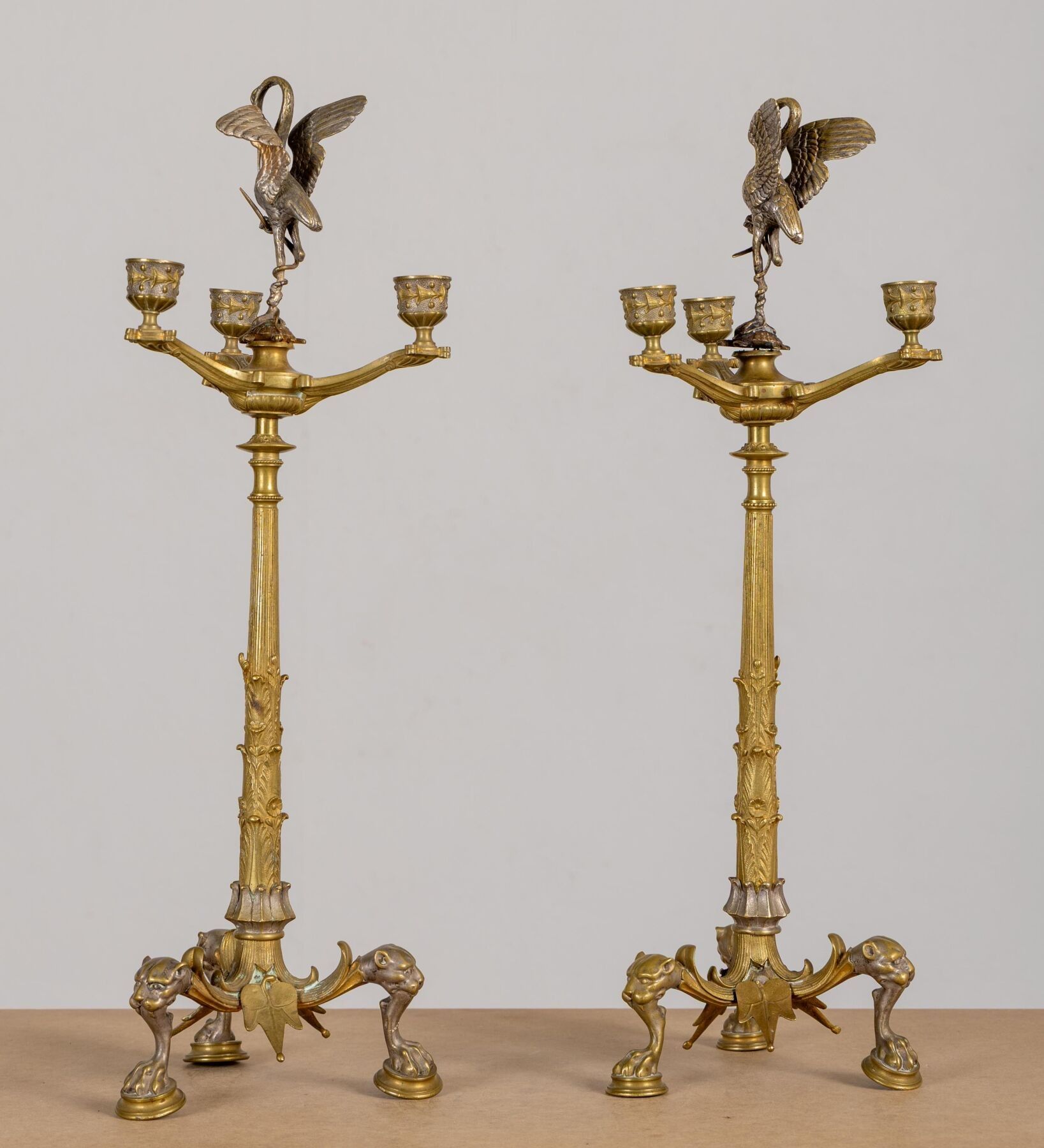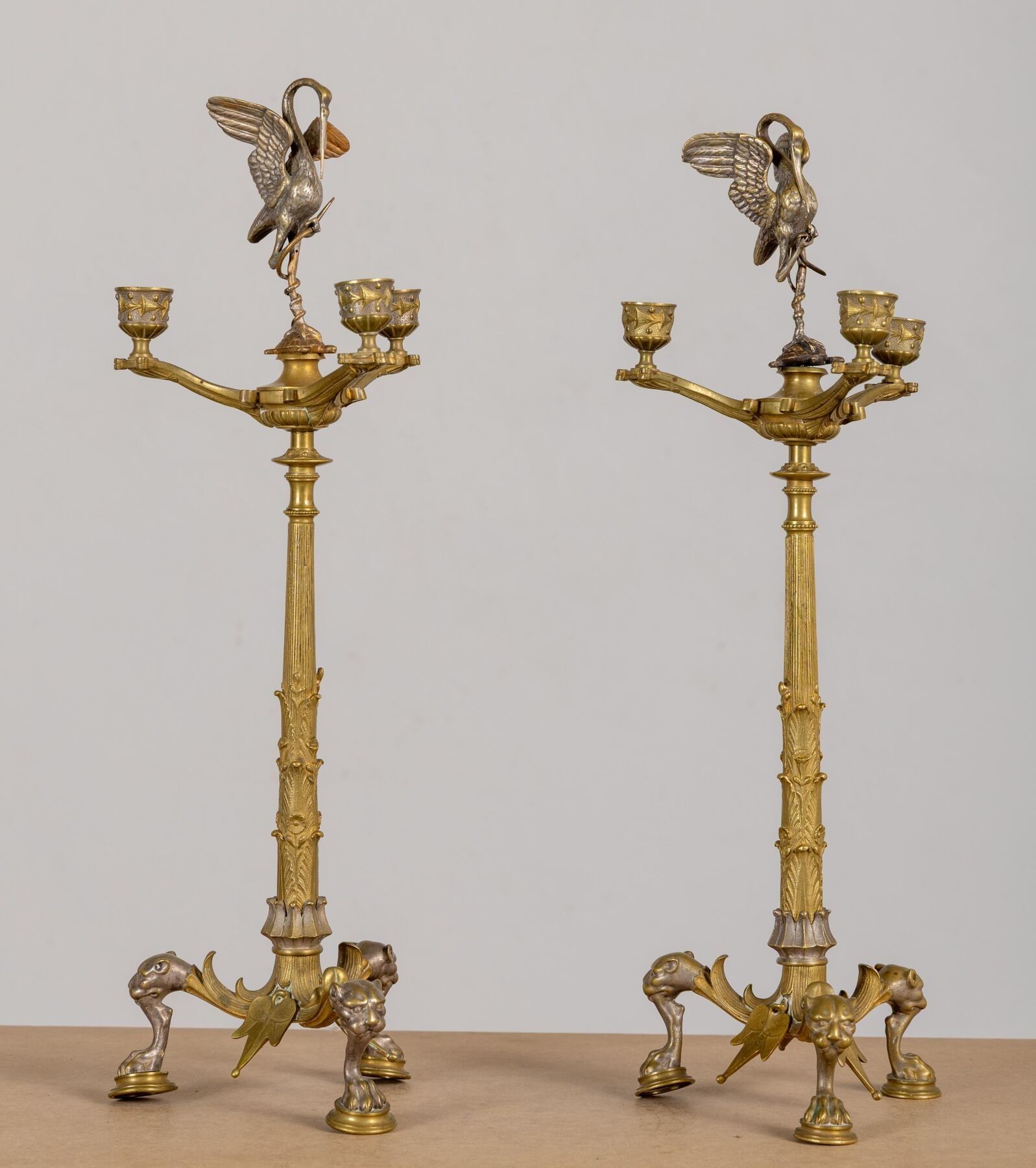 Pair of three-light gilt bronze candelabras, the bases of the shafts silvered.