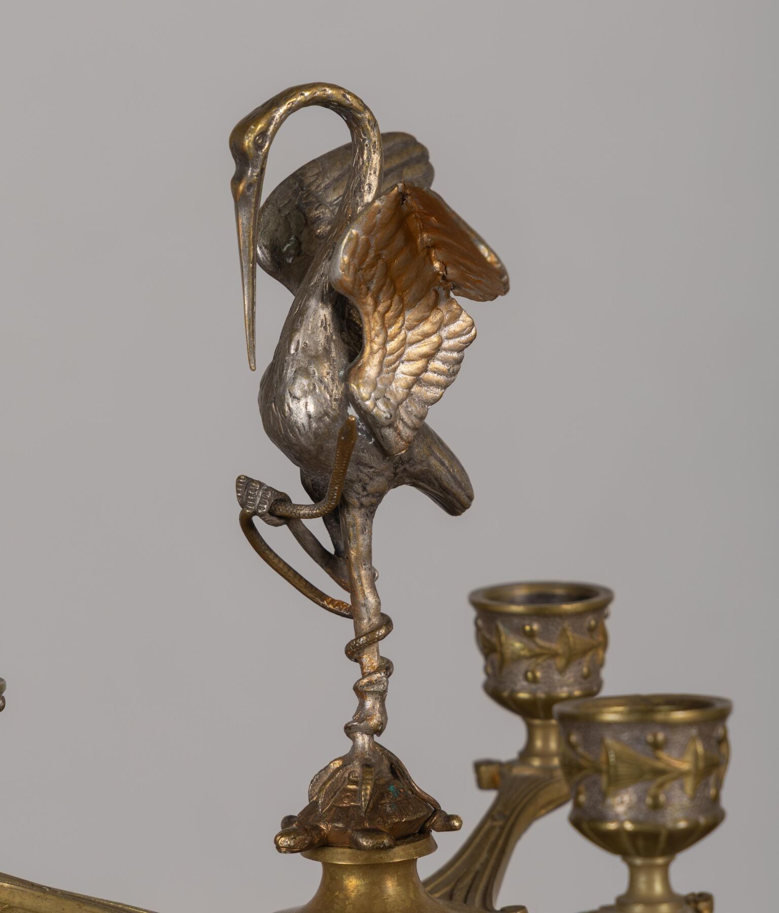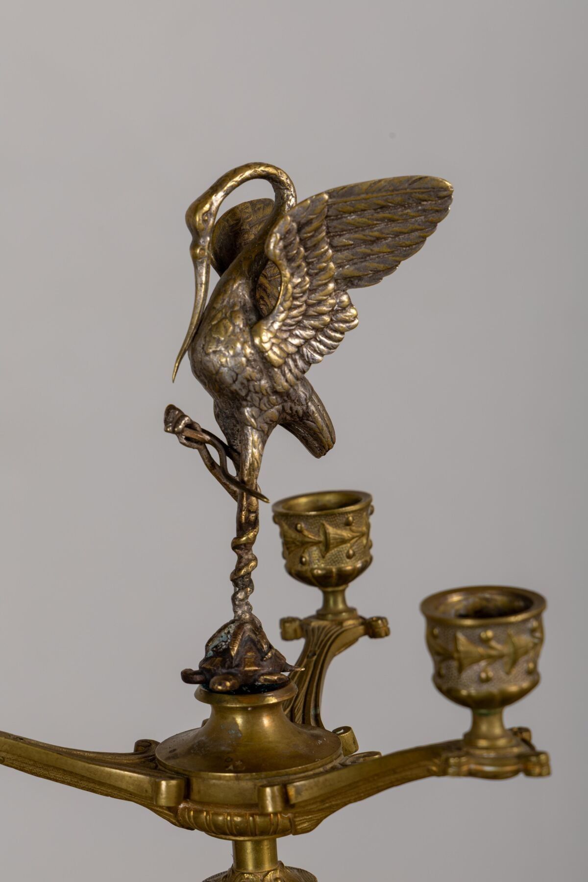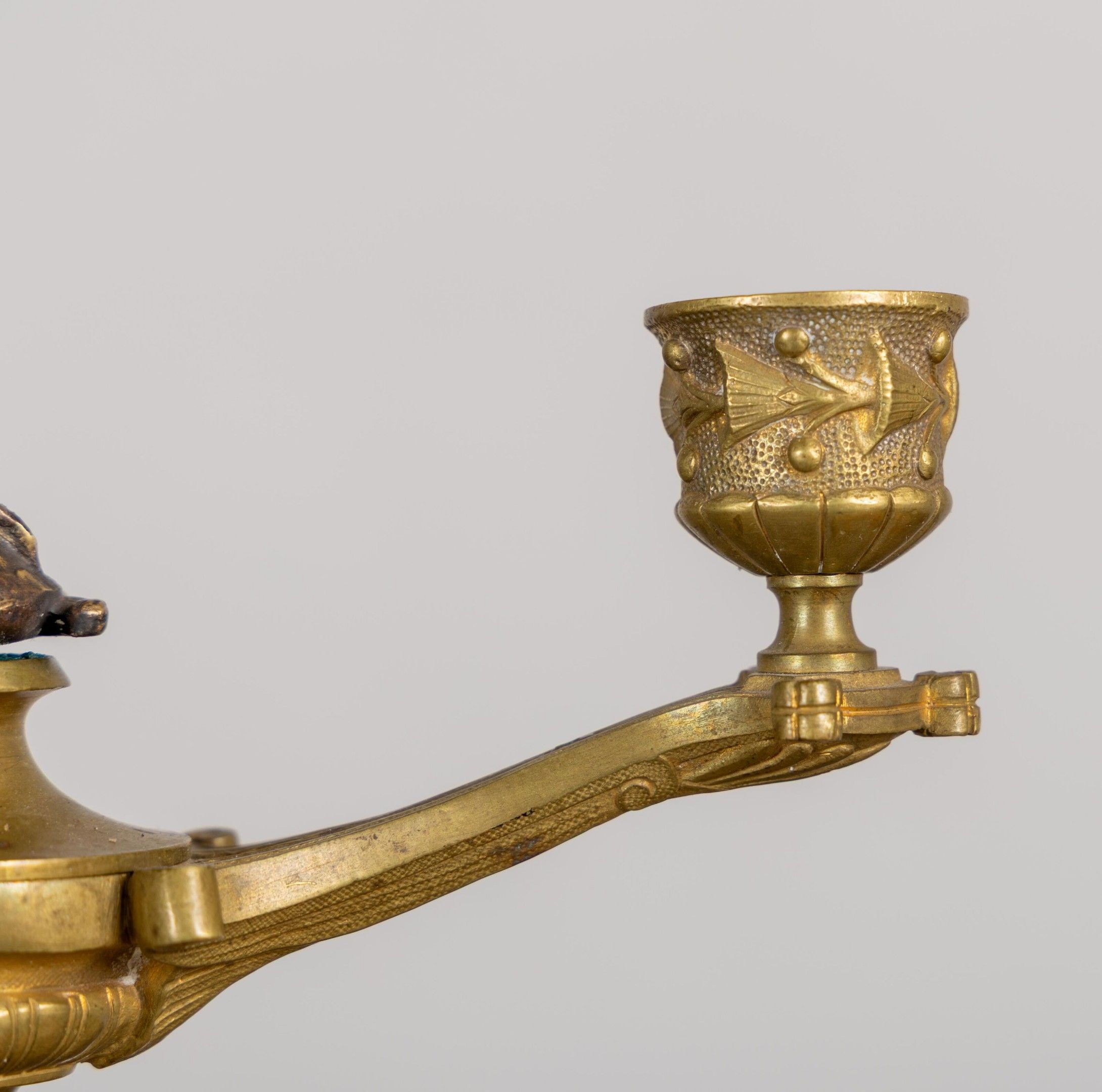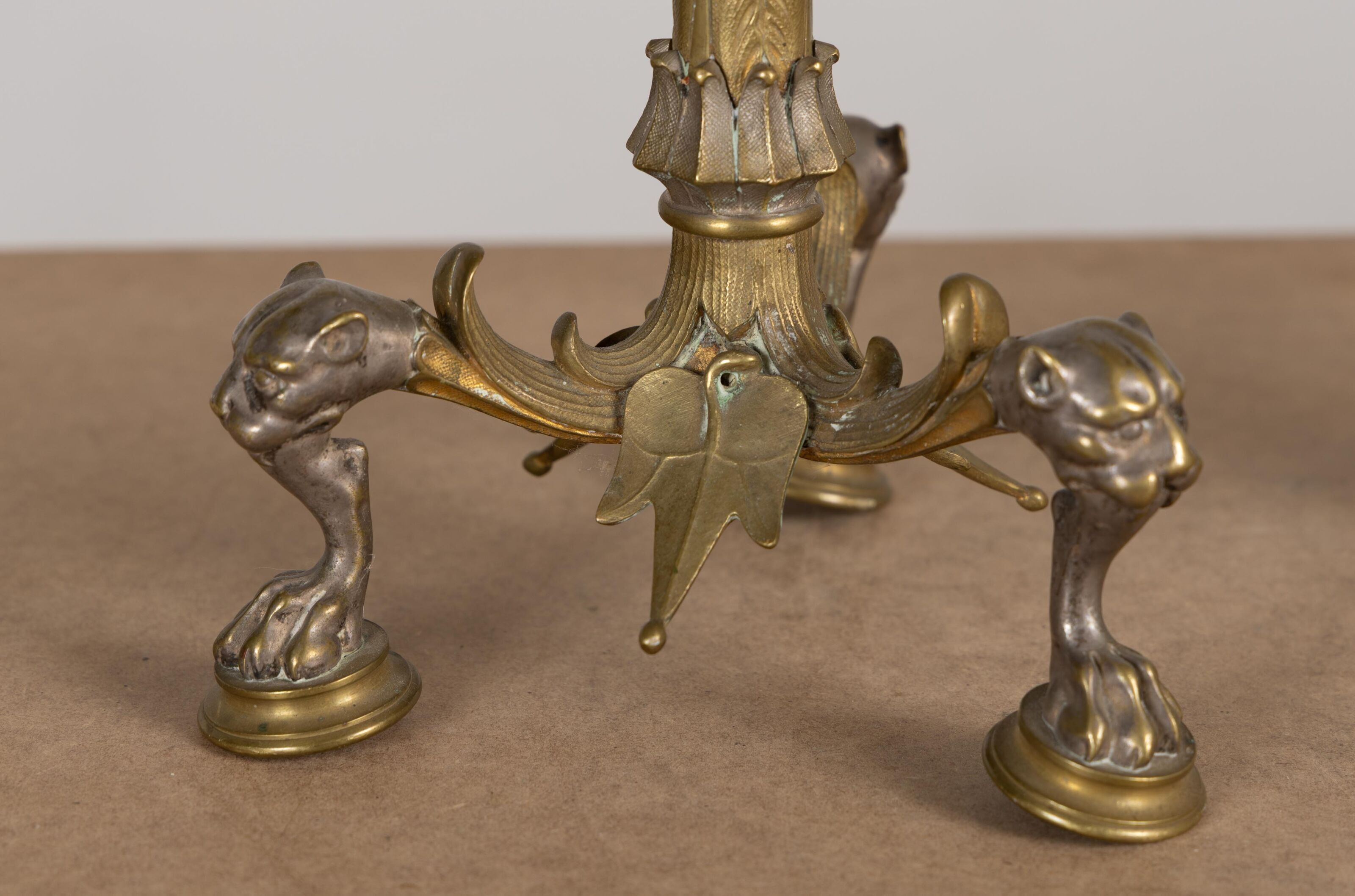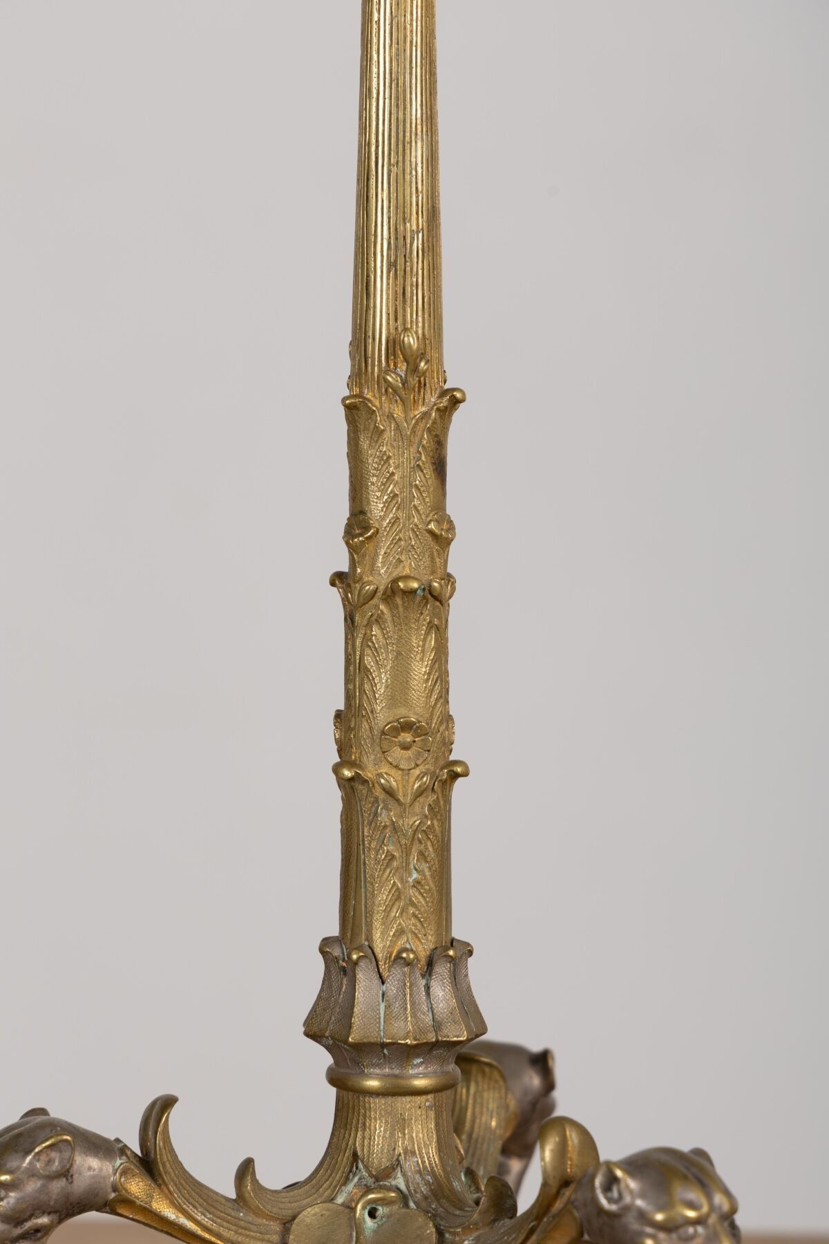 Pair of three-light gilt bronze candelabras, the bases of the shafts silvered.
