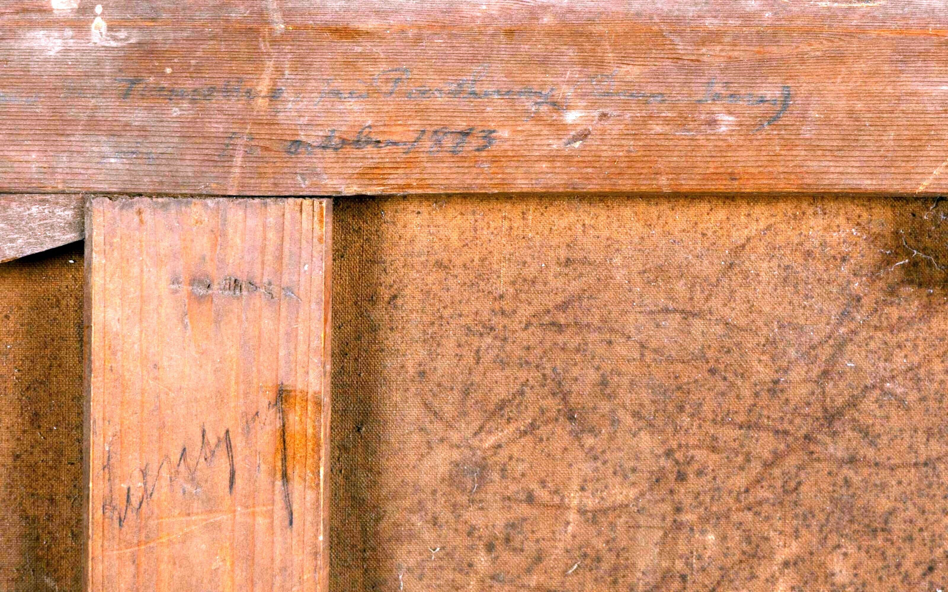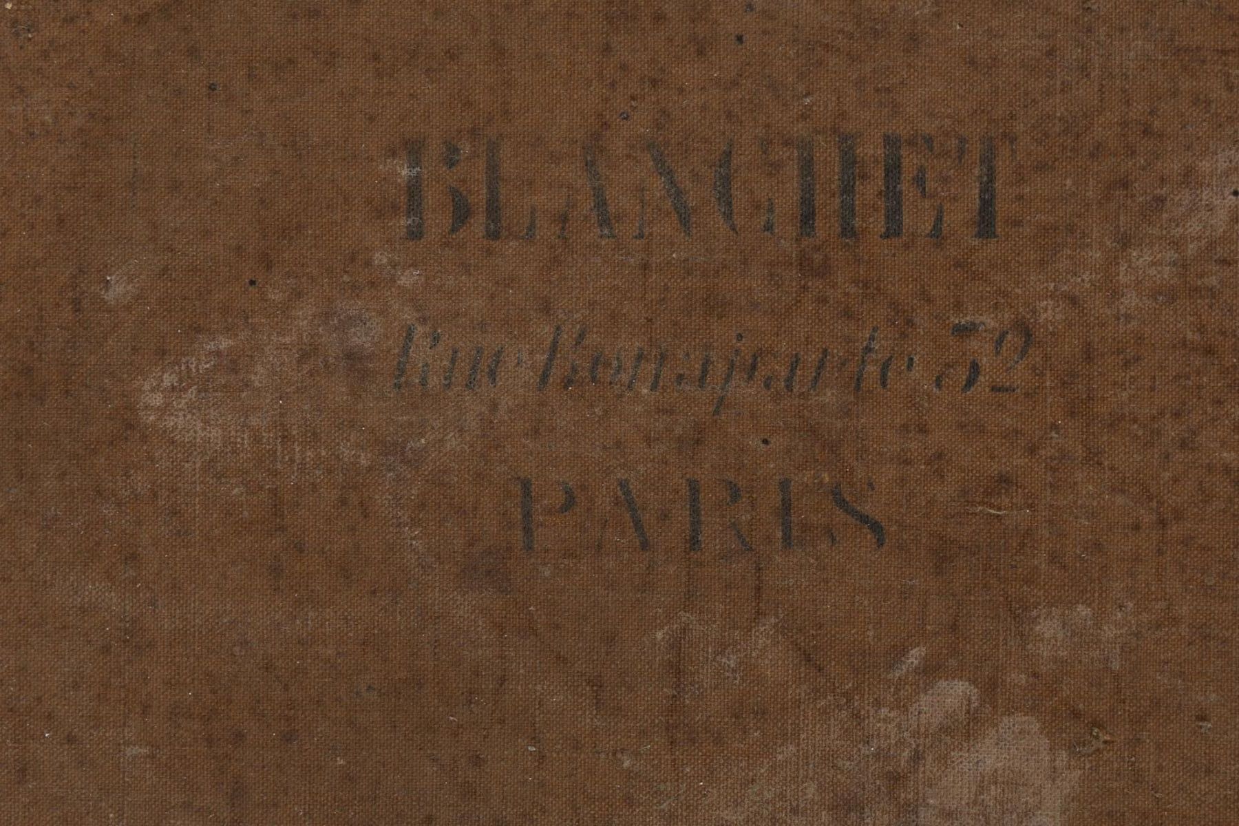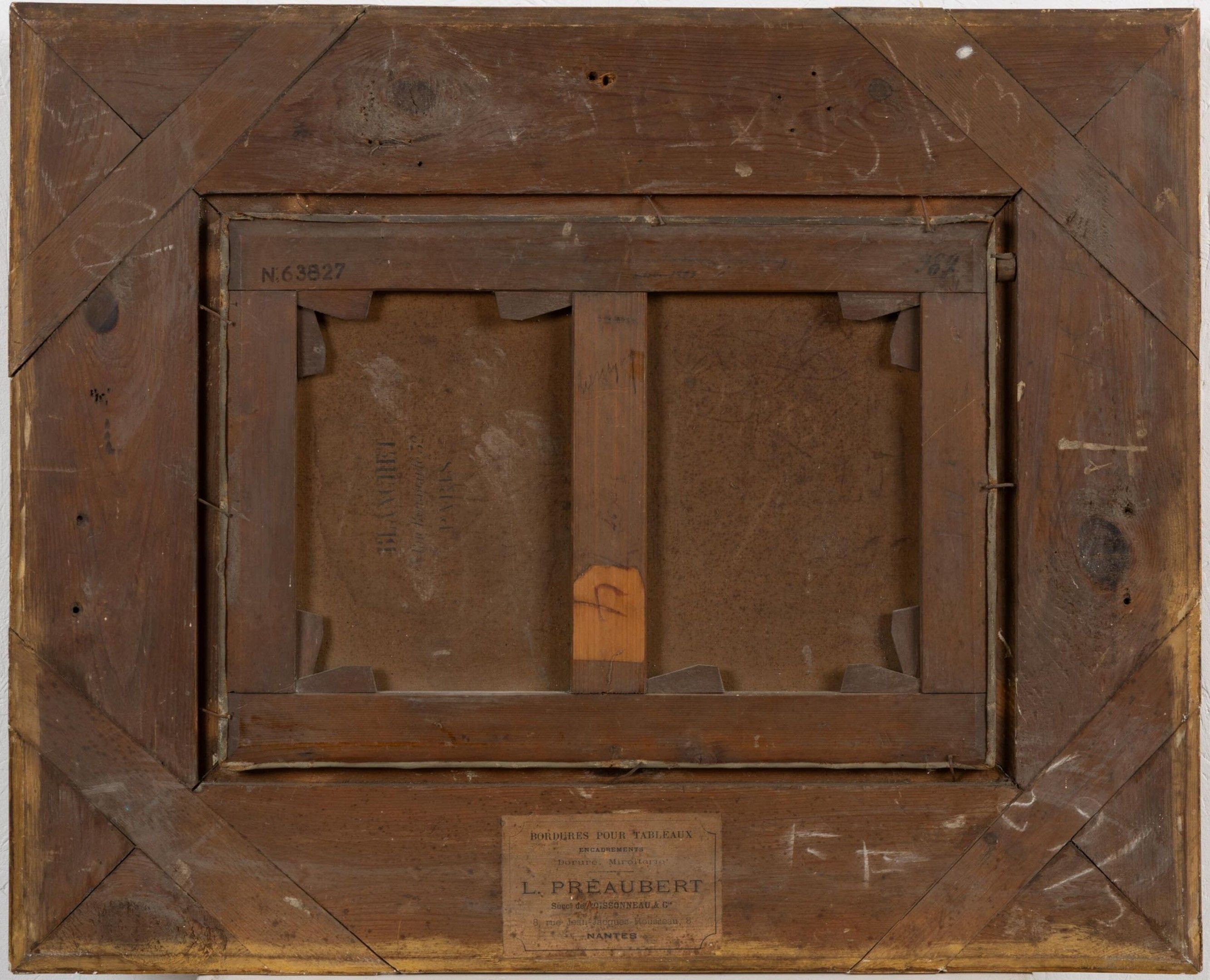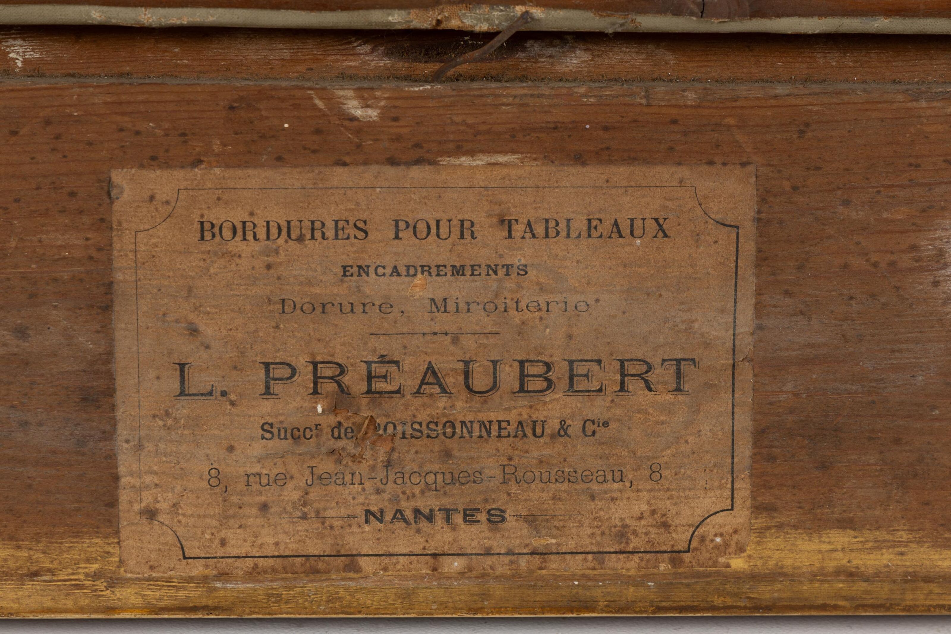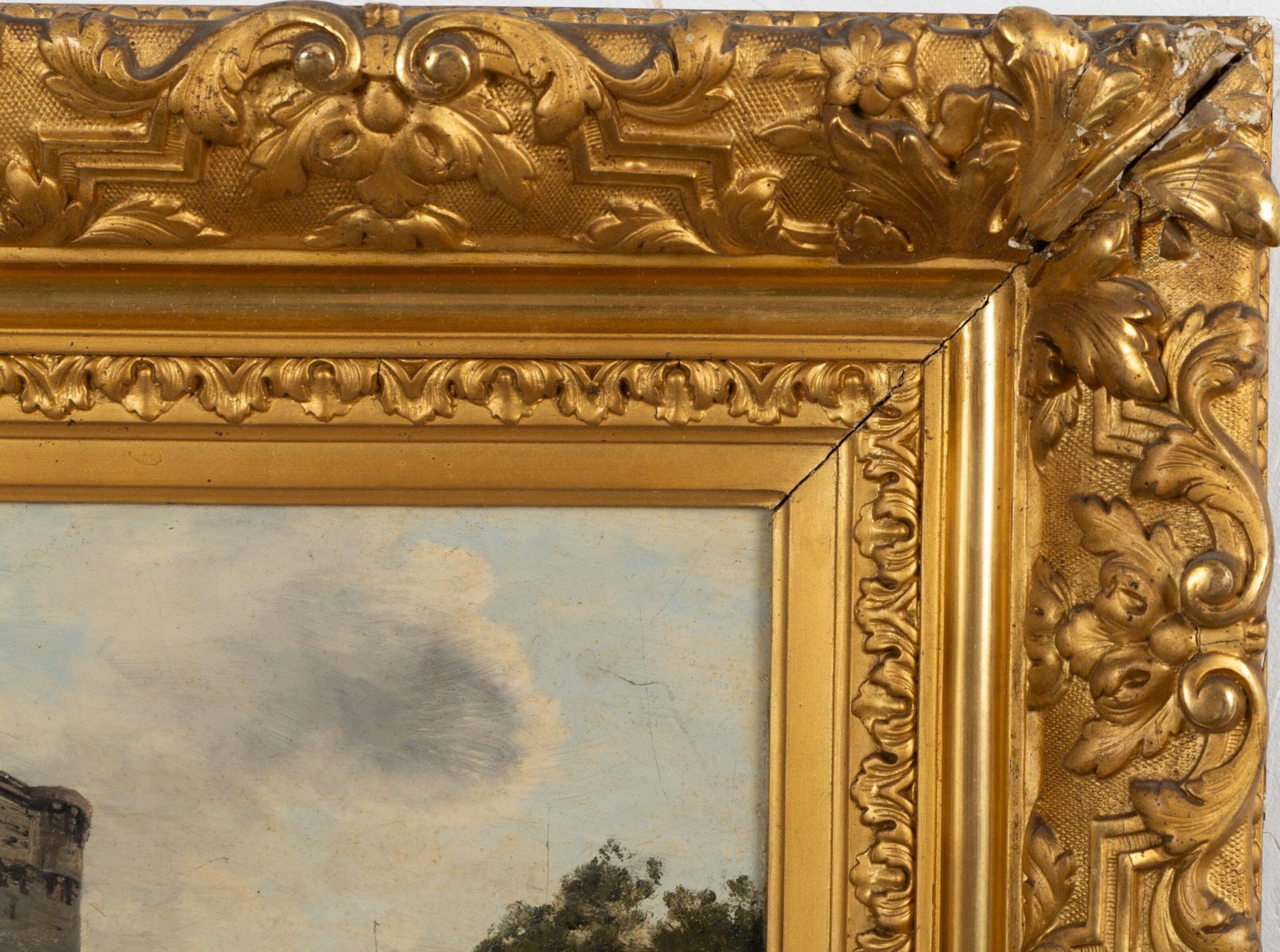 In a fine wood and gilded stucco frame with brass cartouche.