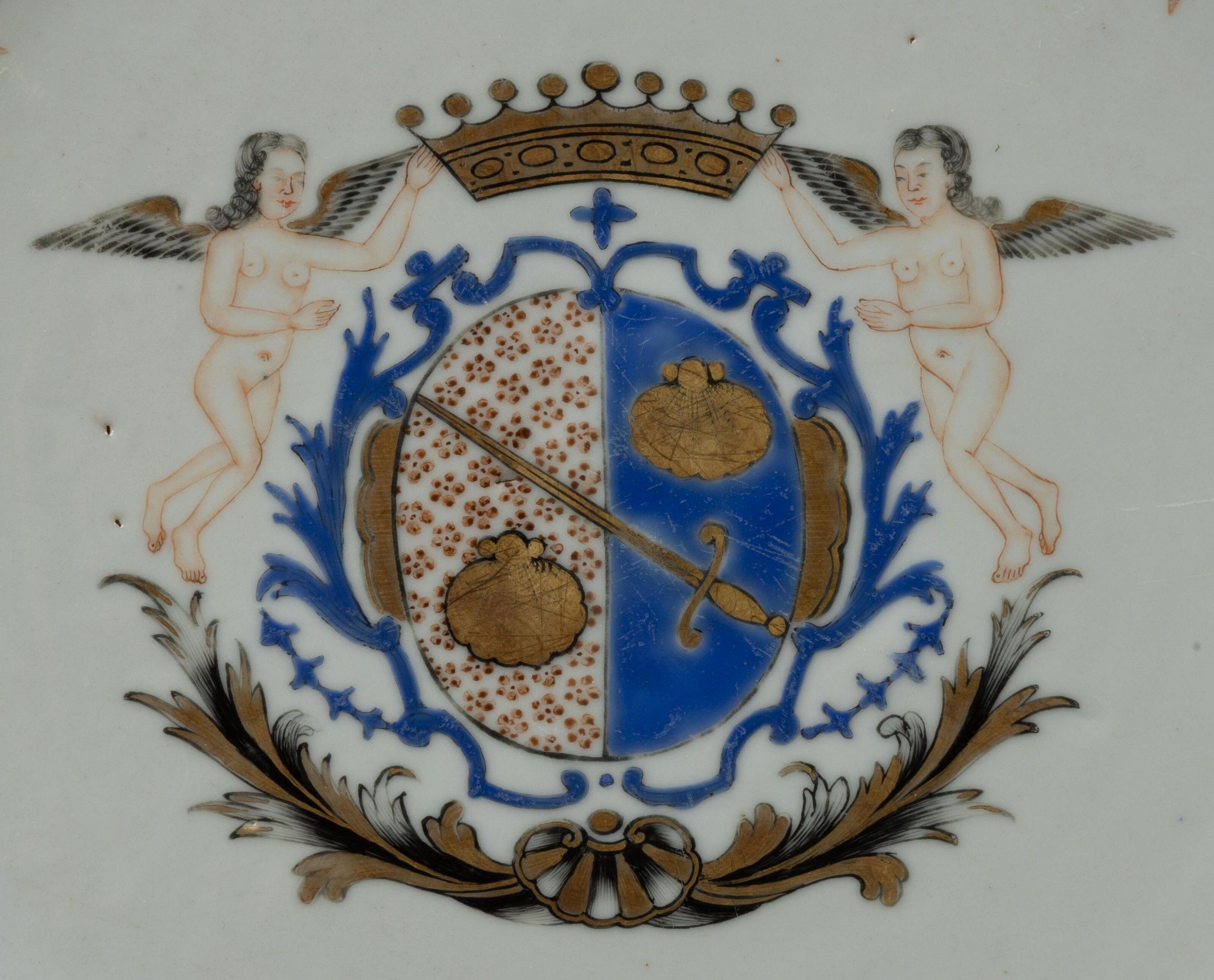 Porcelain dish with polychrome decoration of the coat of arms of the GARNIER du FOUGERAY family, formerly known in Cancale and Saint-Malo.