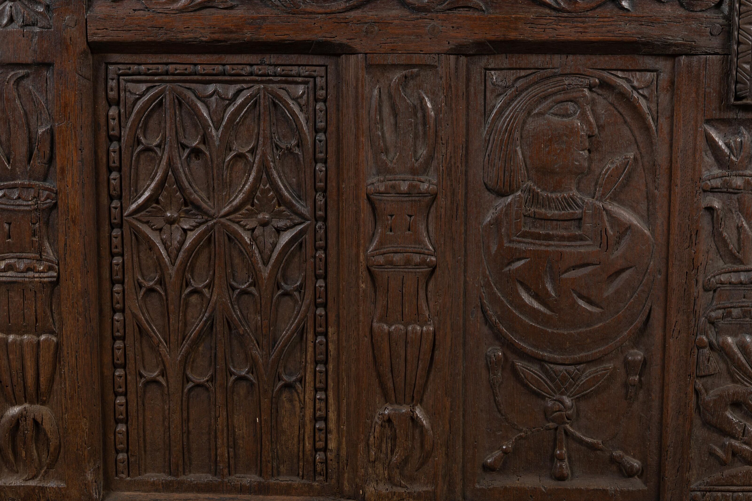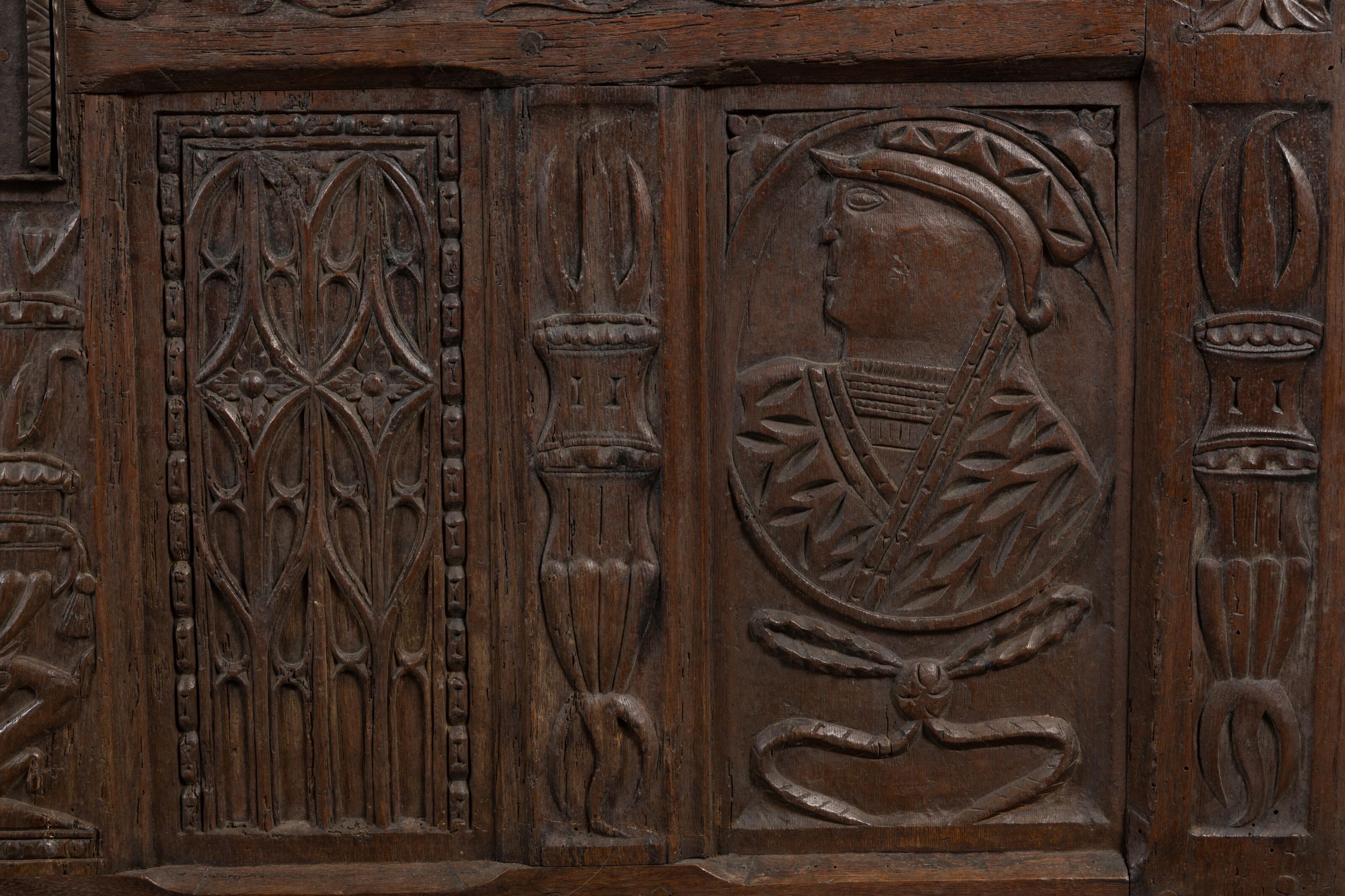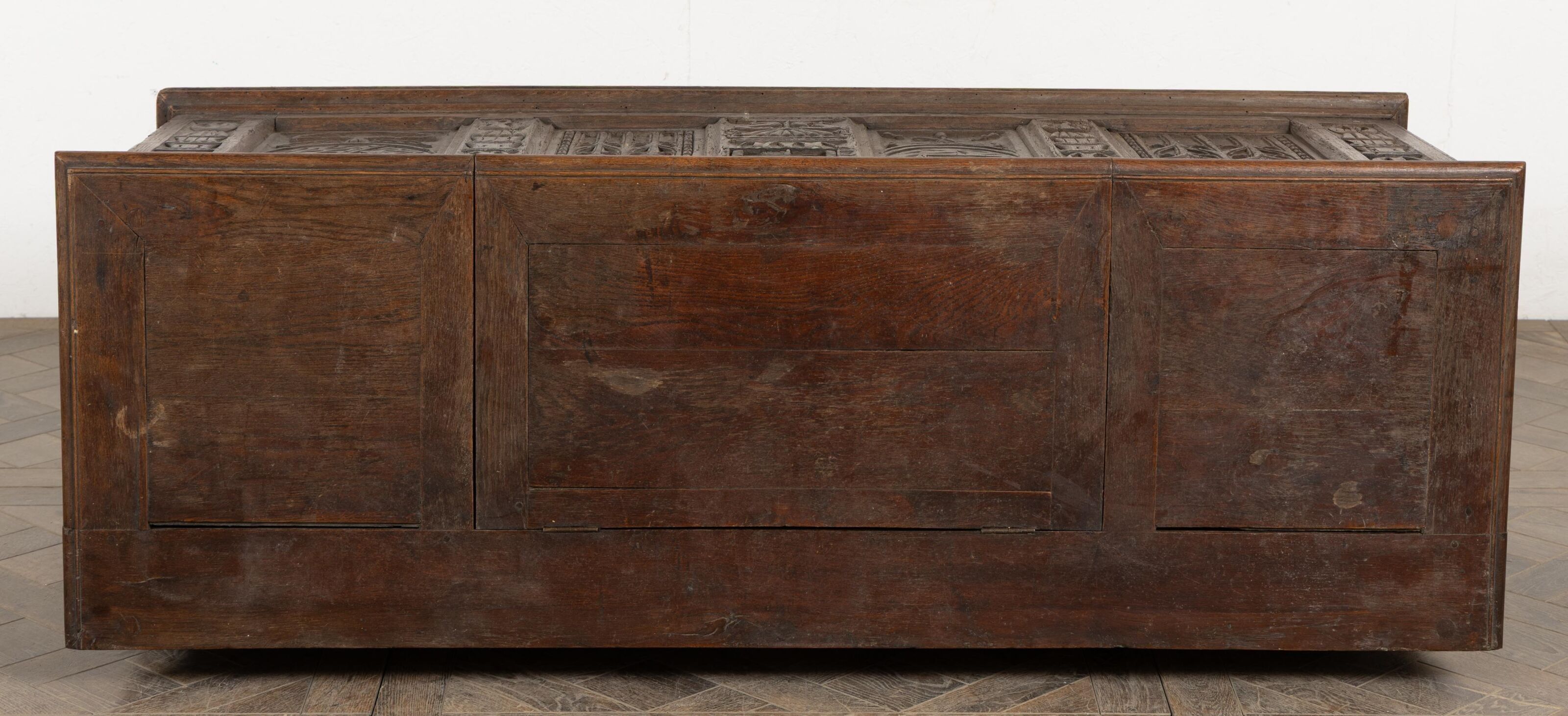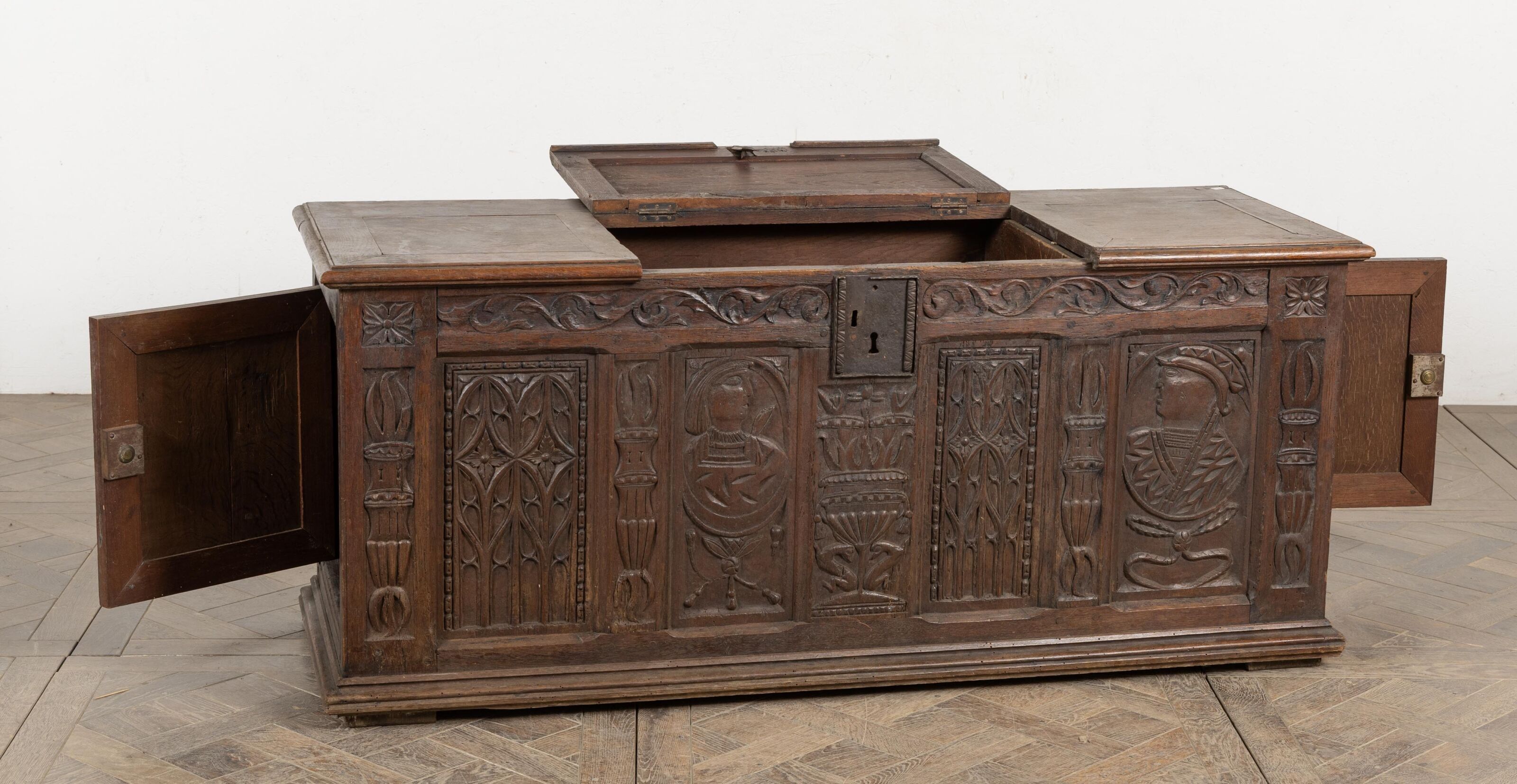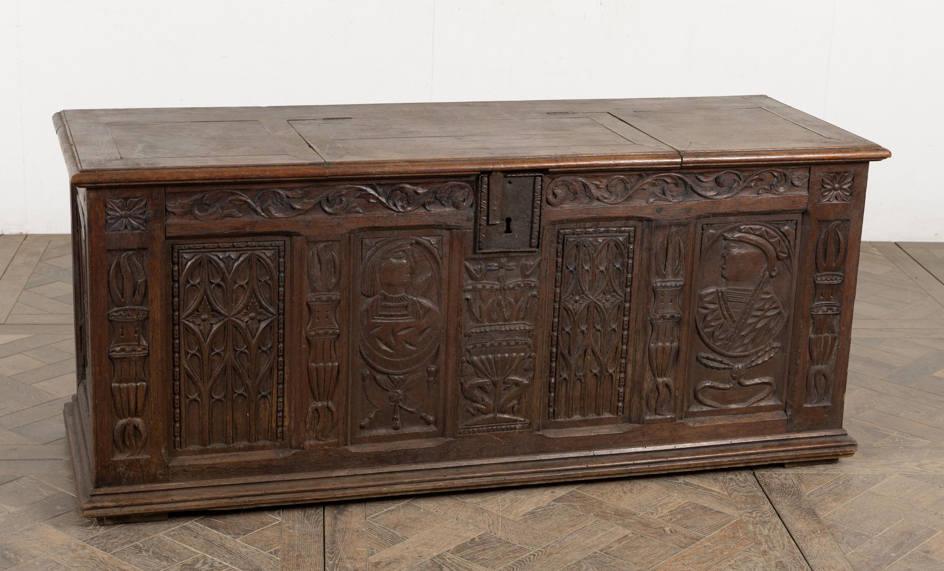 Moulded and carved oak chest, the front decorated with Gothic figures and arcatures.
