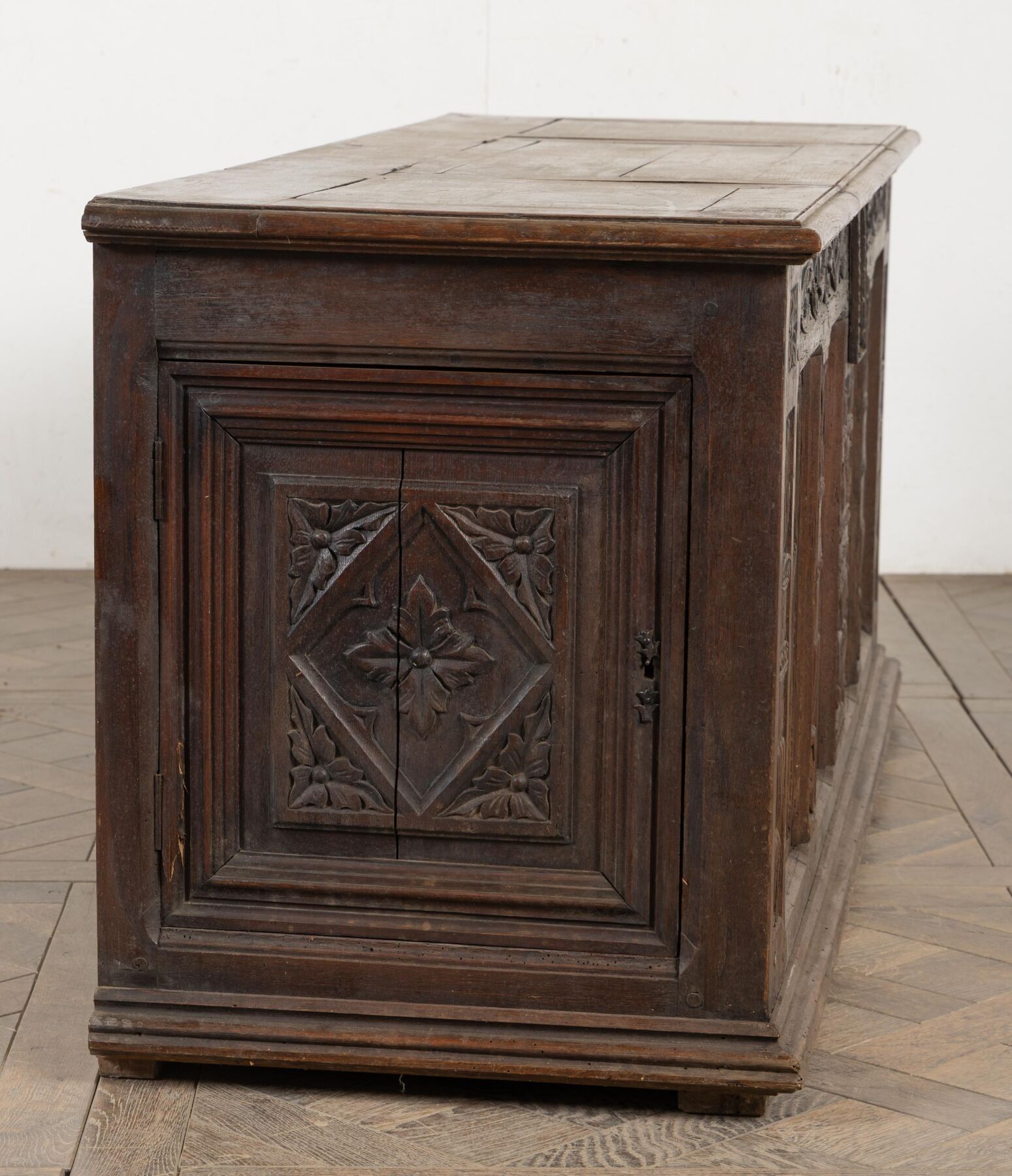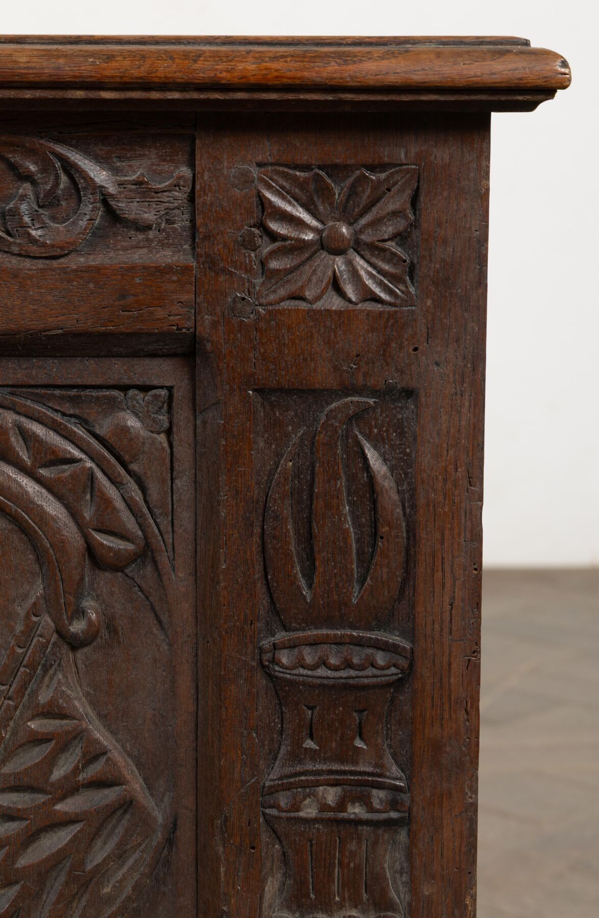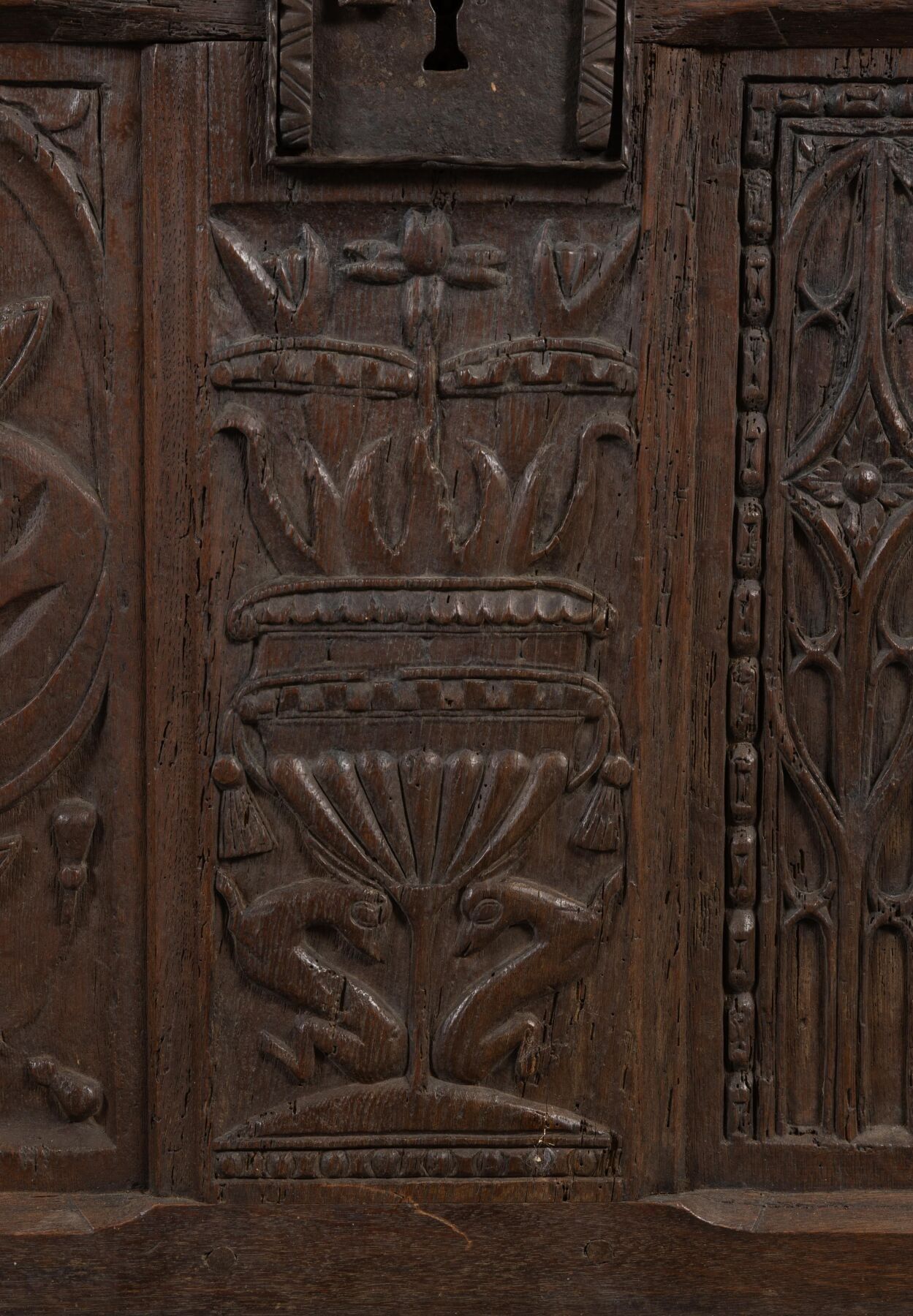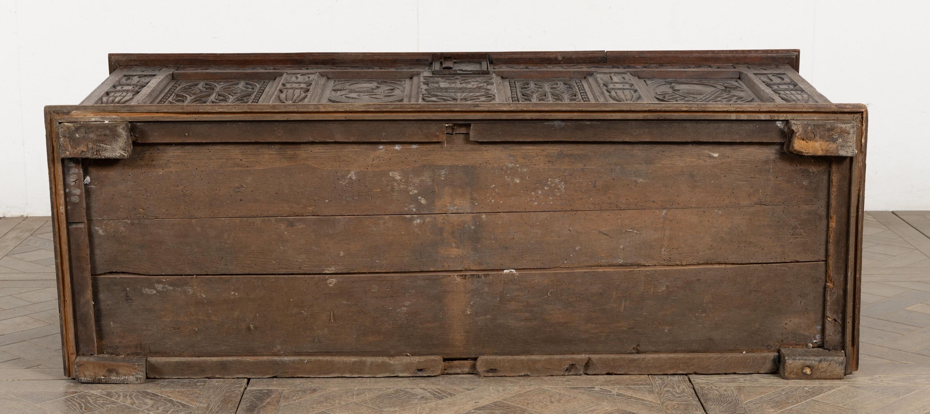 Moulded and carved oak chest, the front decorated with Gothic figures and arcatures.