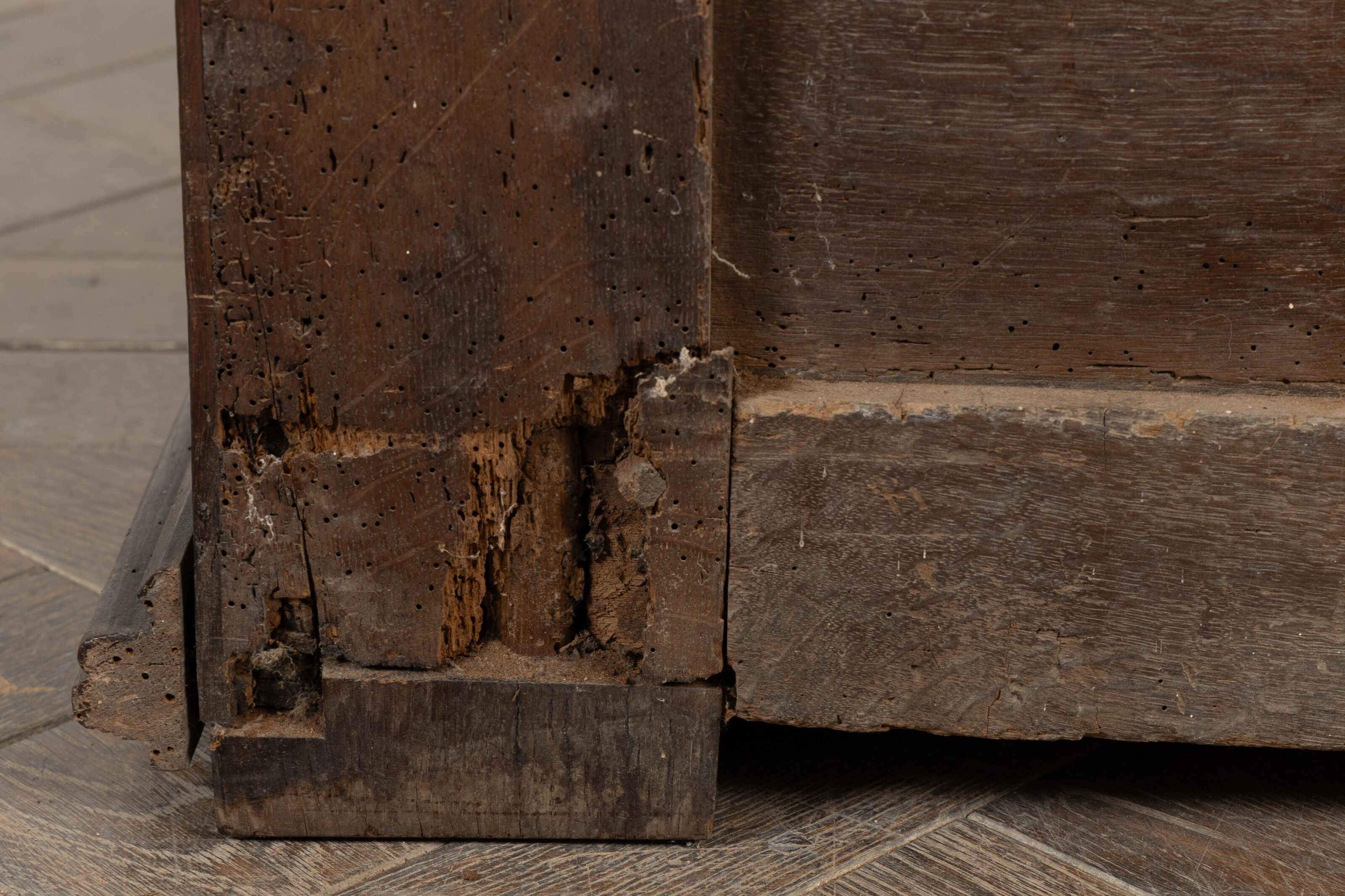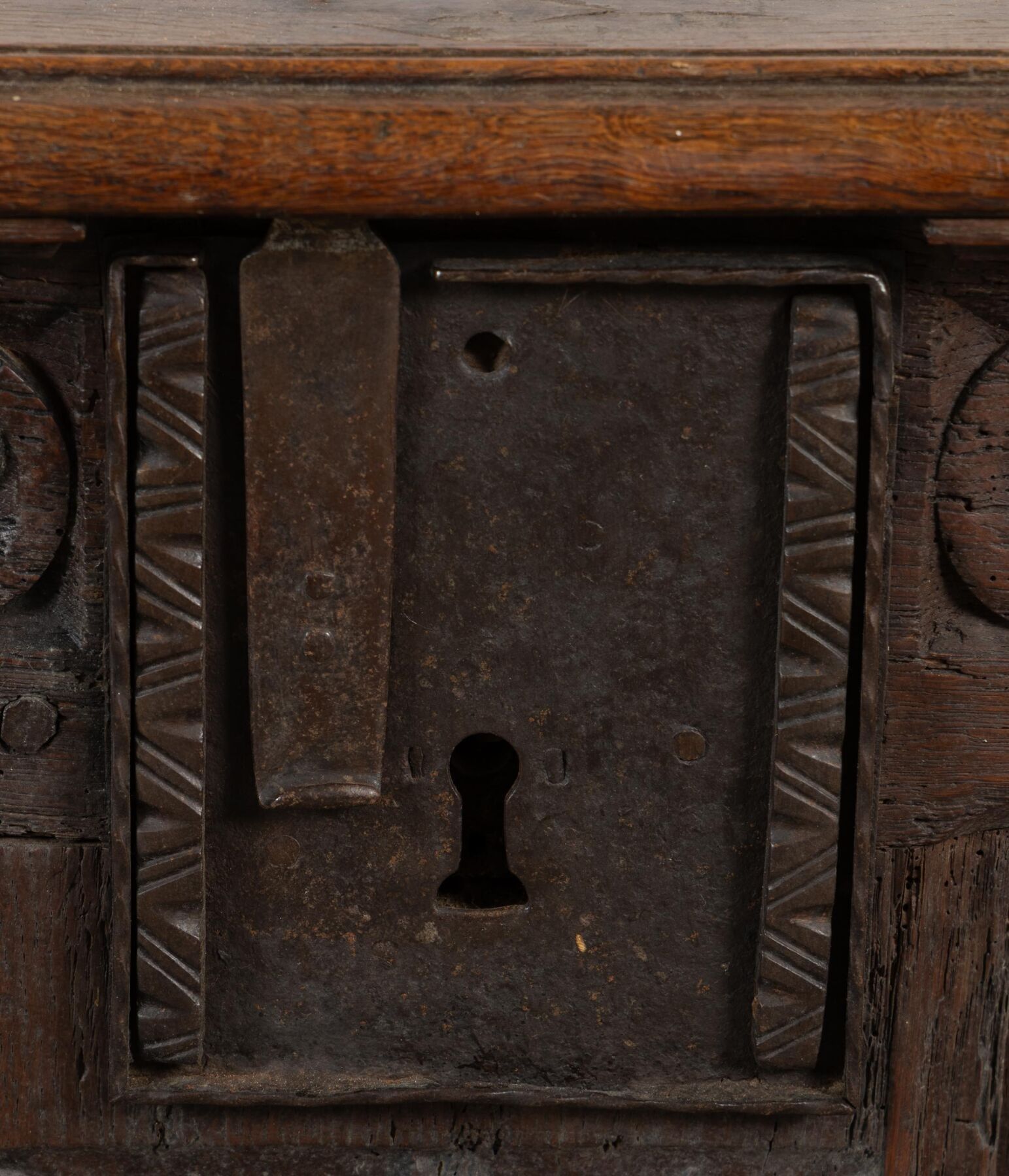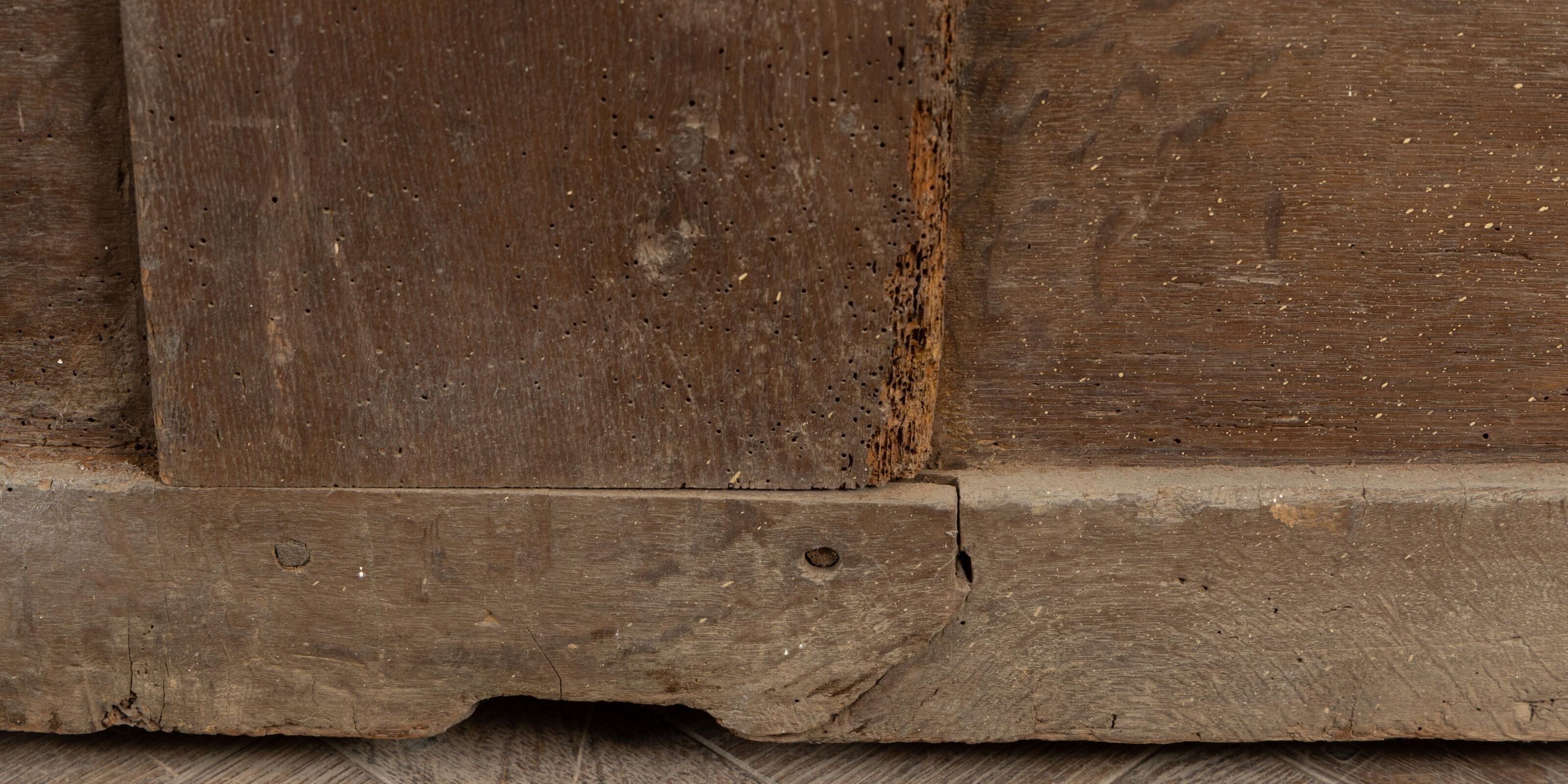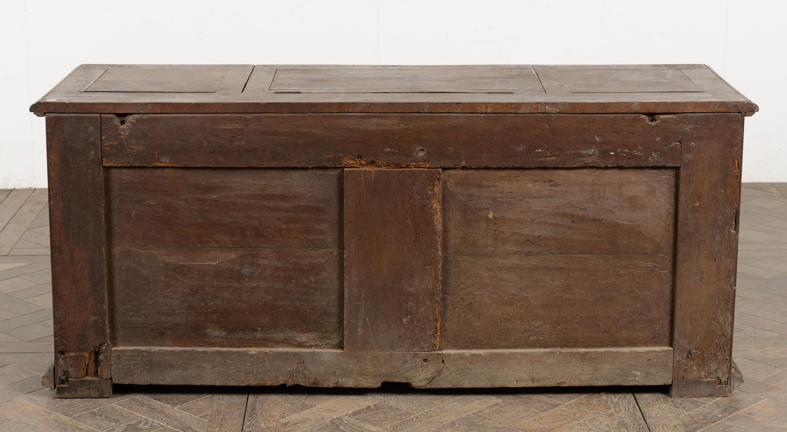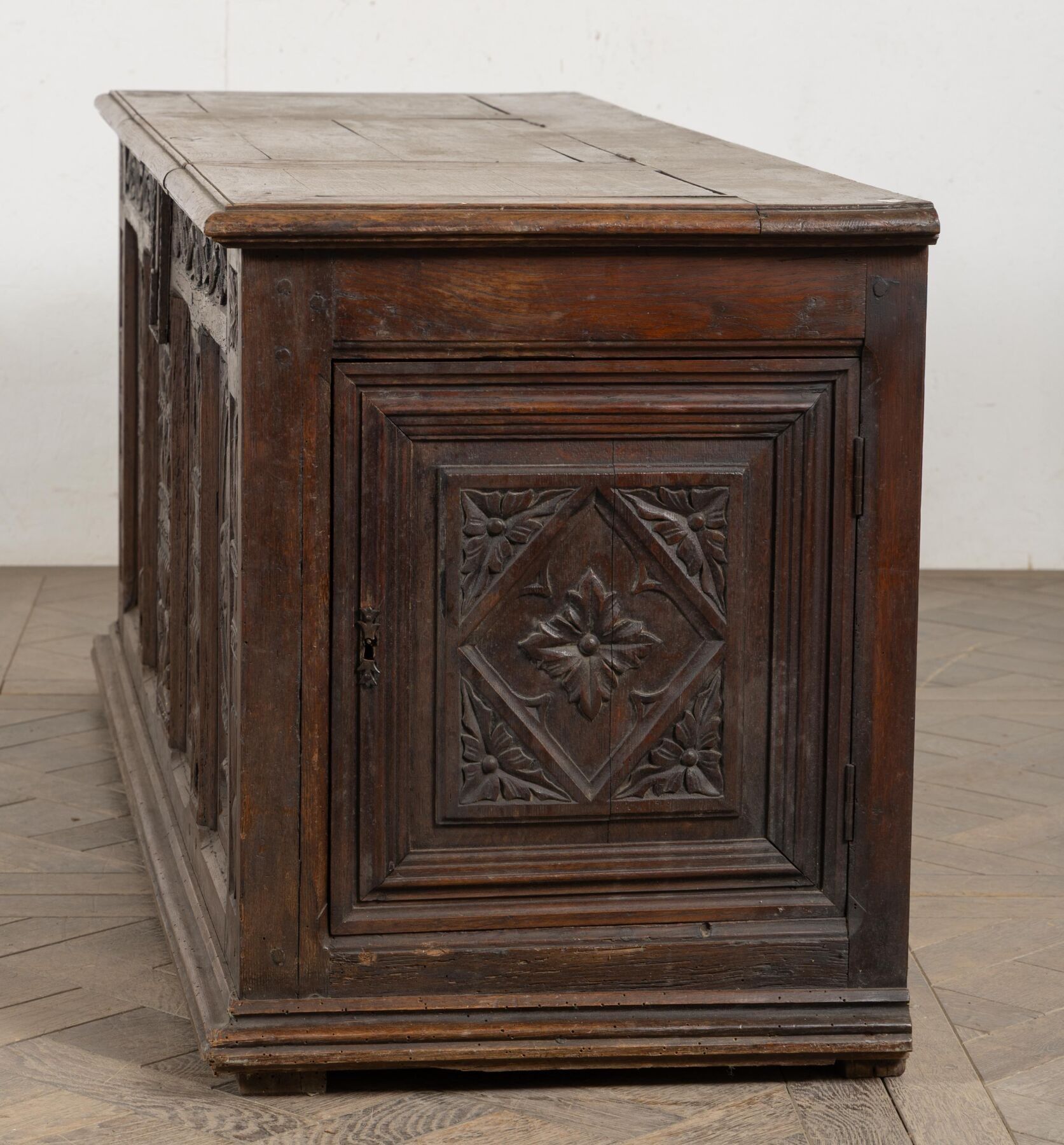 Moulded and carved oak chest, the front decorated with Gothic figures and arcatures.