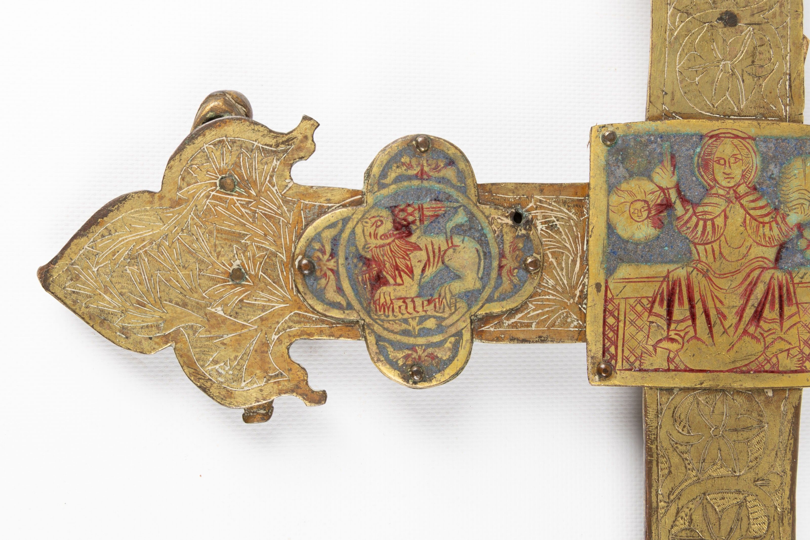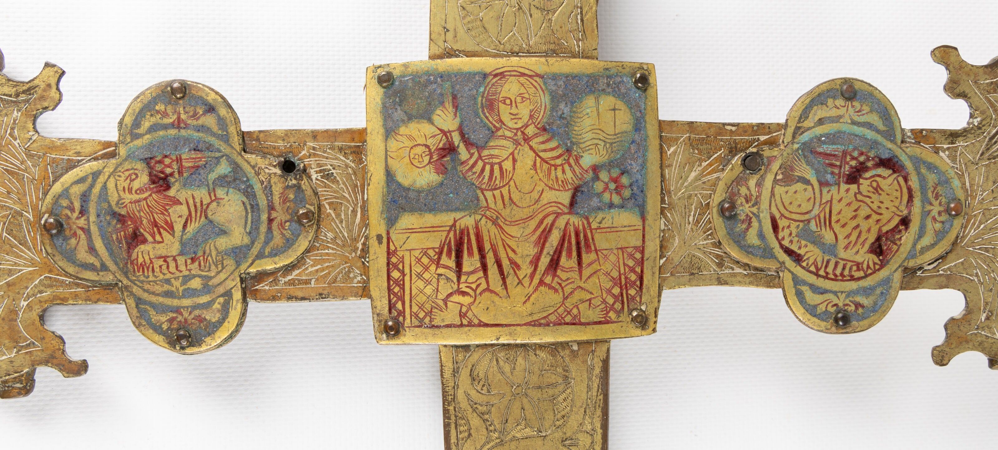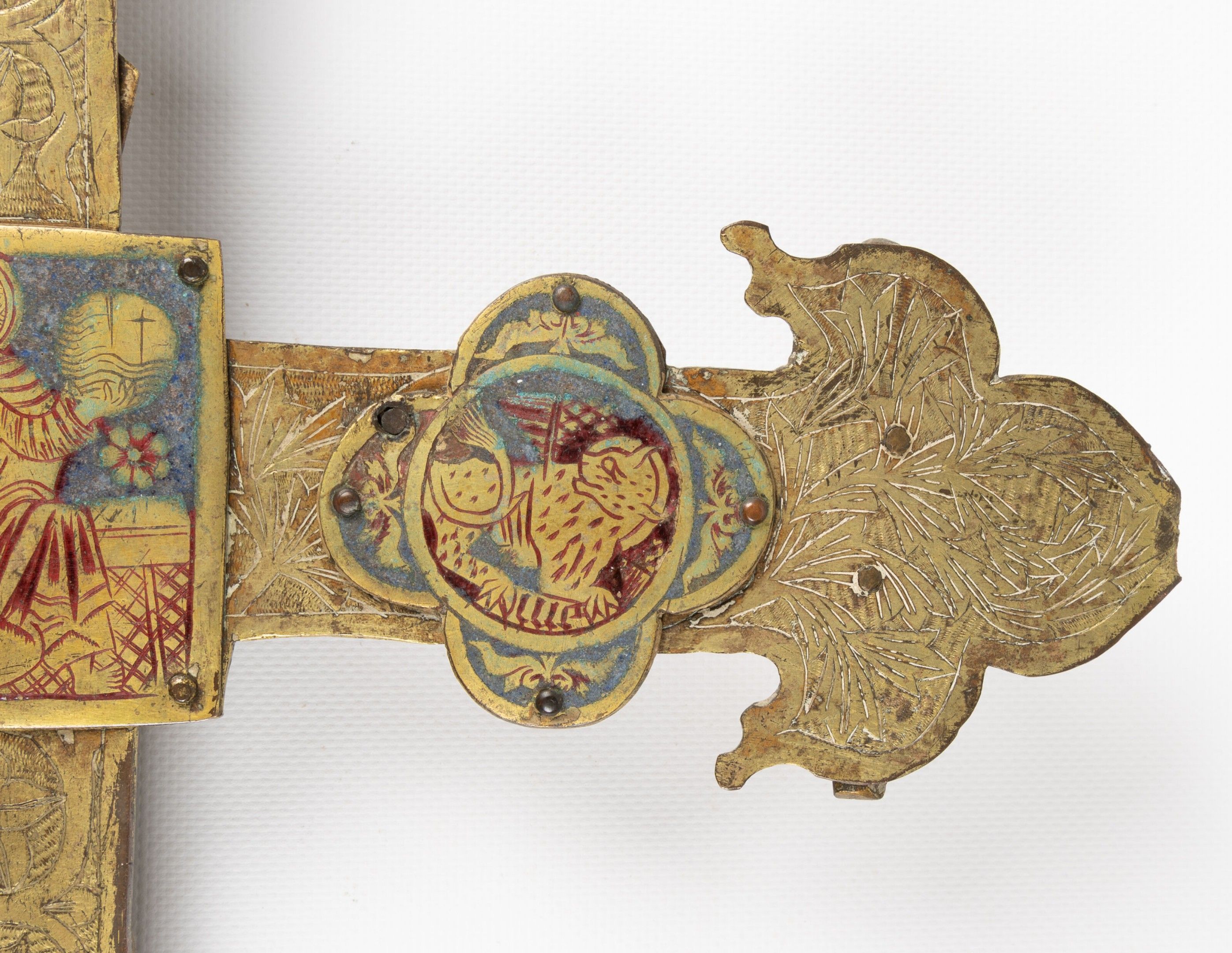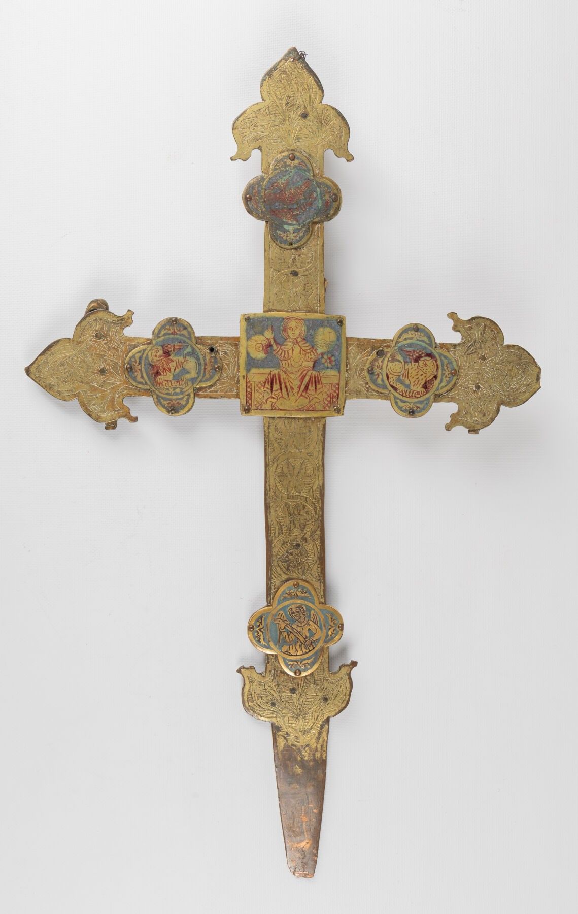 Processional or altar cross in gilded, cast, engraved copper and champlevé enamel.
