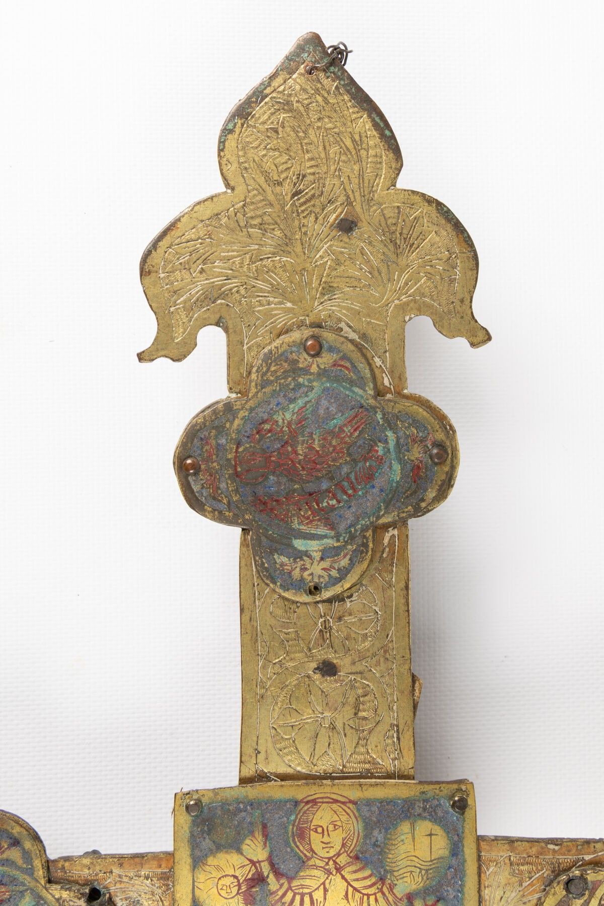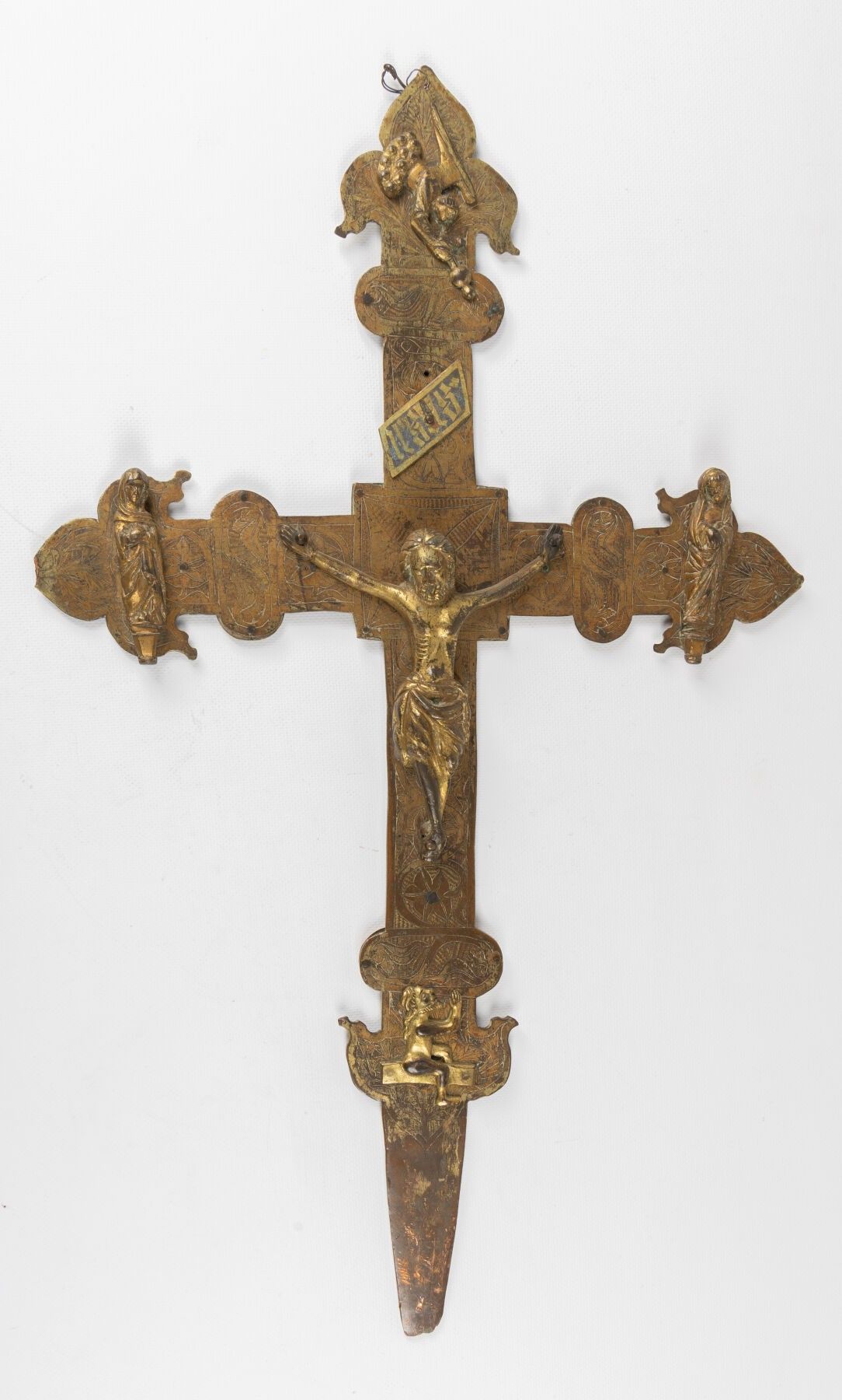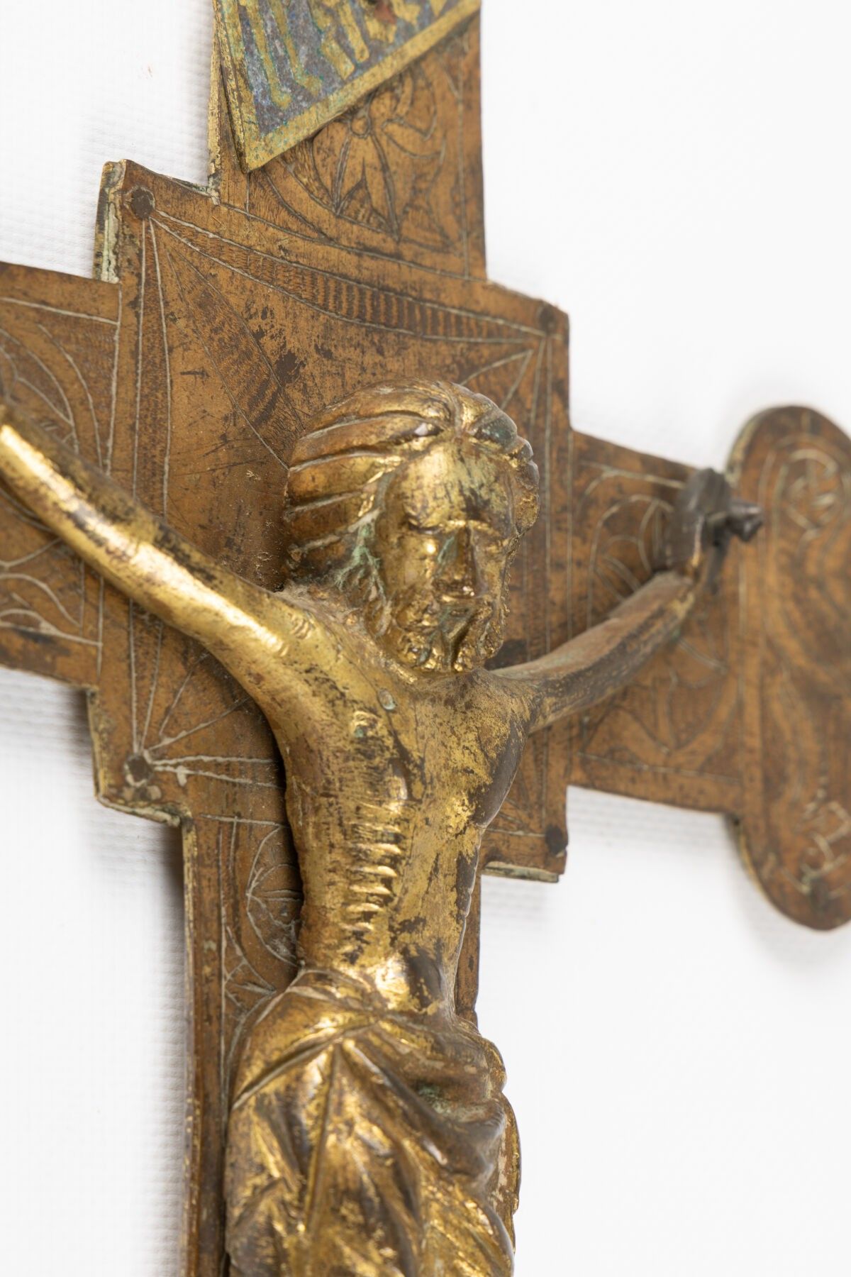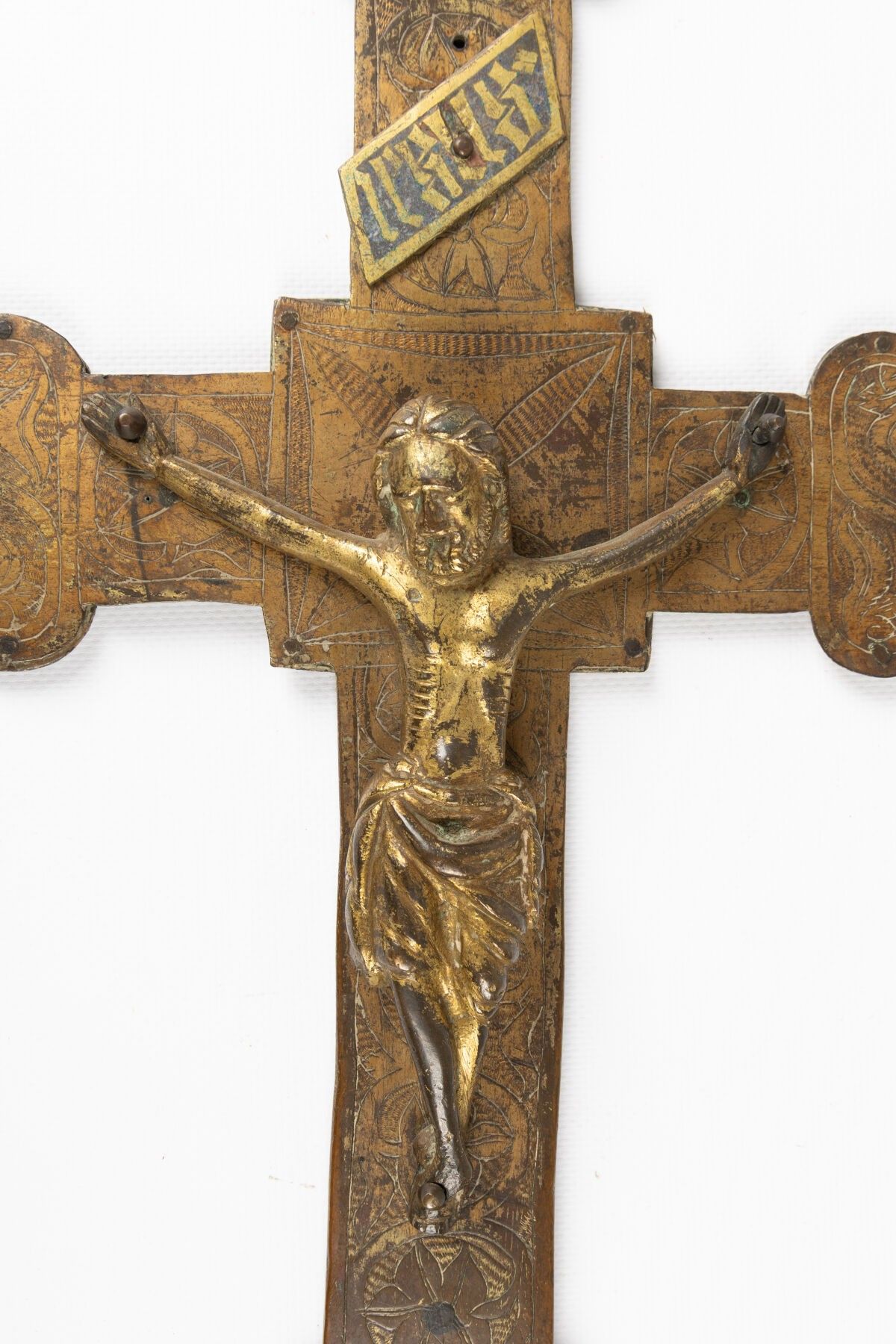 Processional or altar cross in gilded, cast, engraved copper and champlevé enamel.